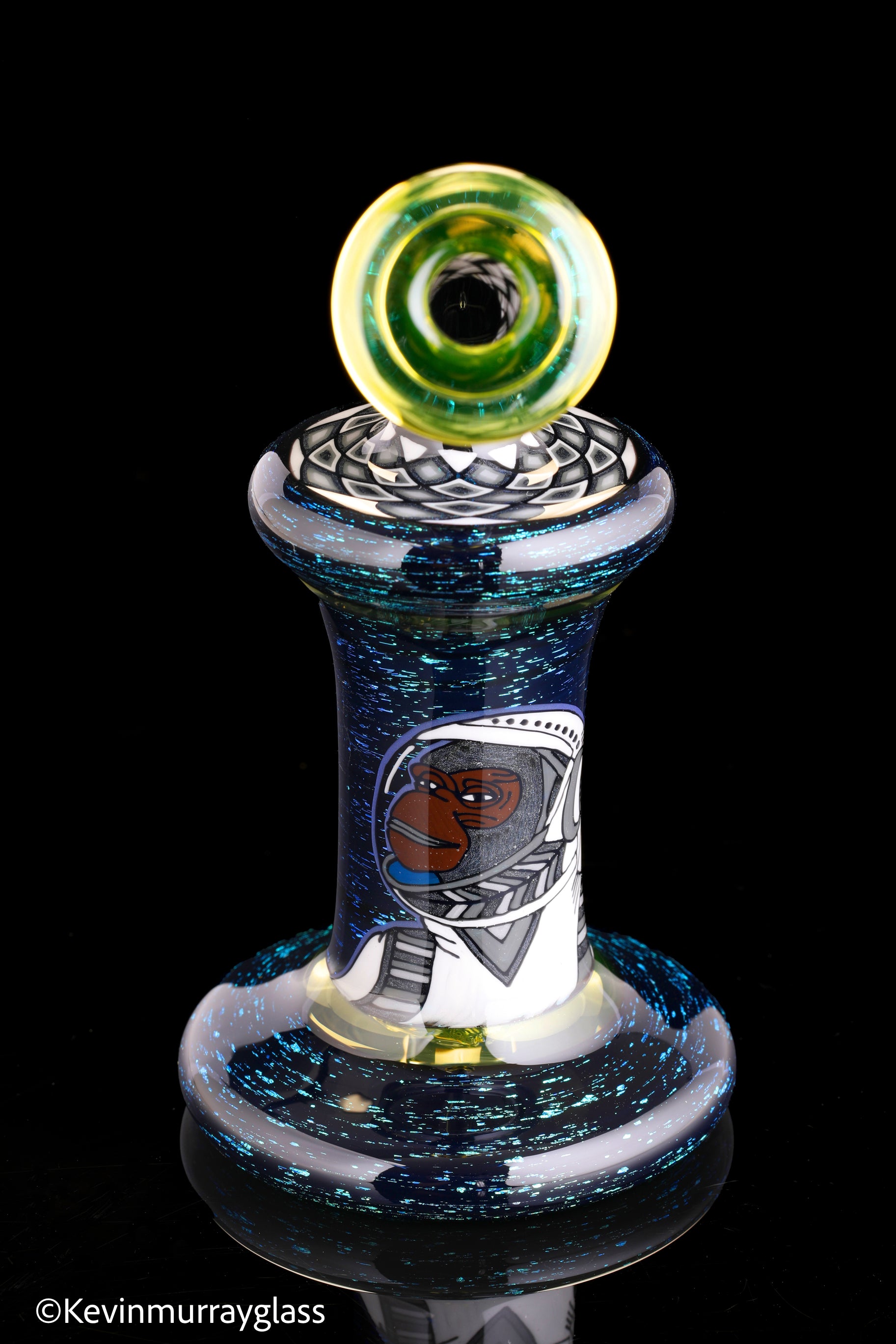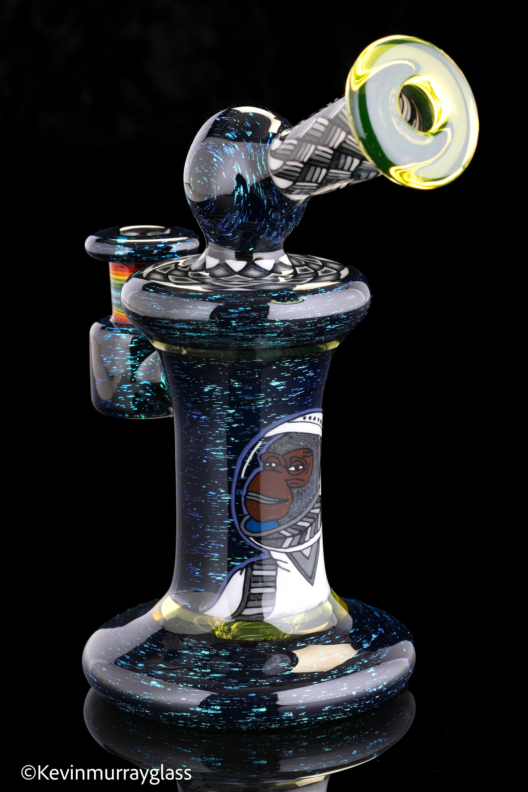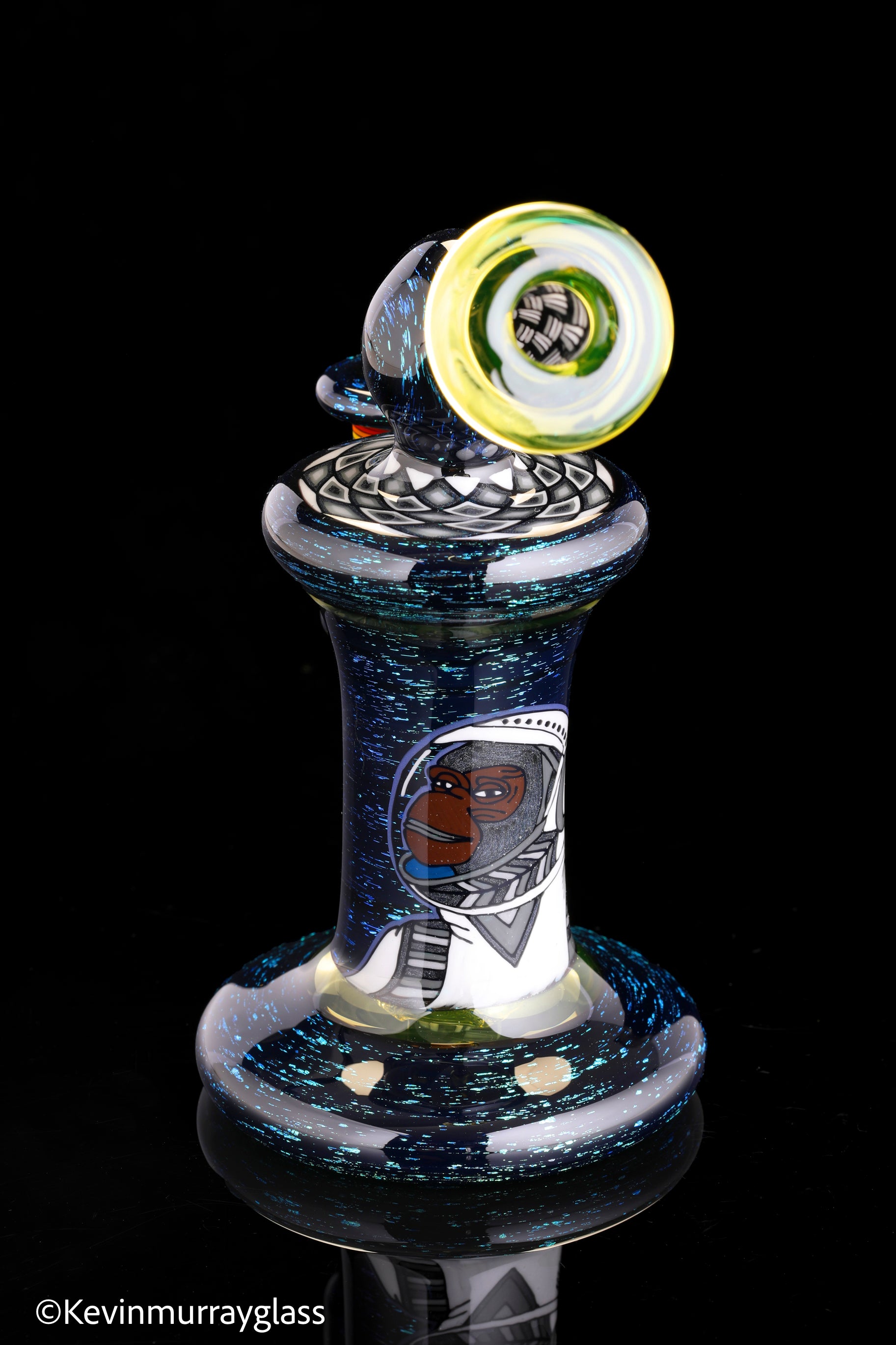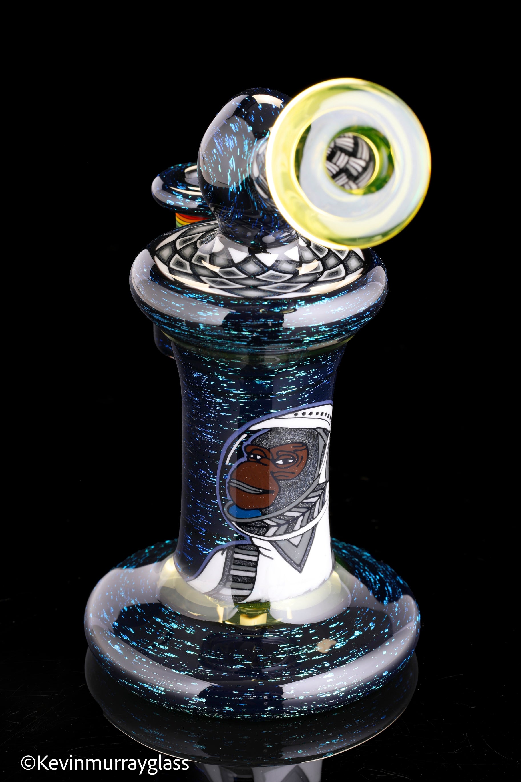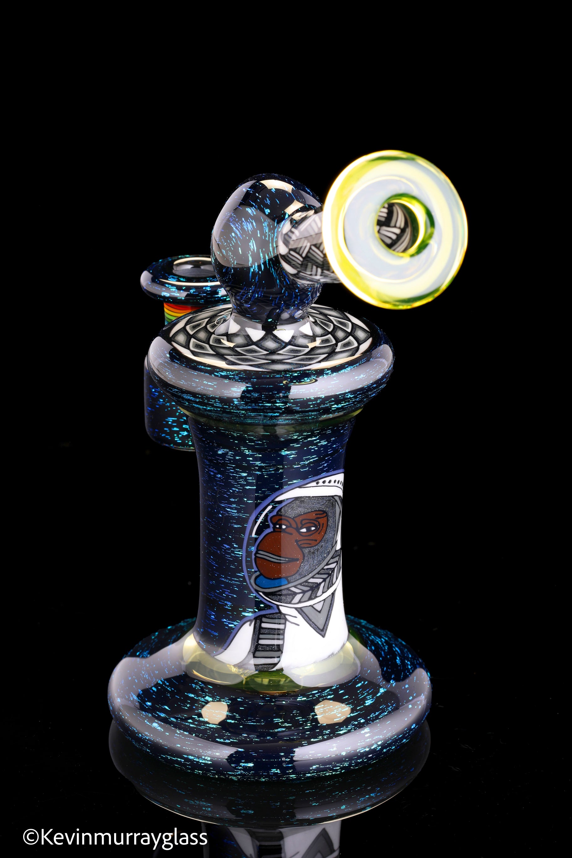 The astro-chimp rig inspired by "Ham" the chimpanzee launched into space by nasa in 1961. Blue/teal dichro for the stars in the background. Hand ground 10mm 90 degree joint with a 4 hole perk. Signed with the signature/year murrine. Includes pelican 1150 hard case.