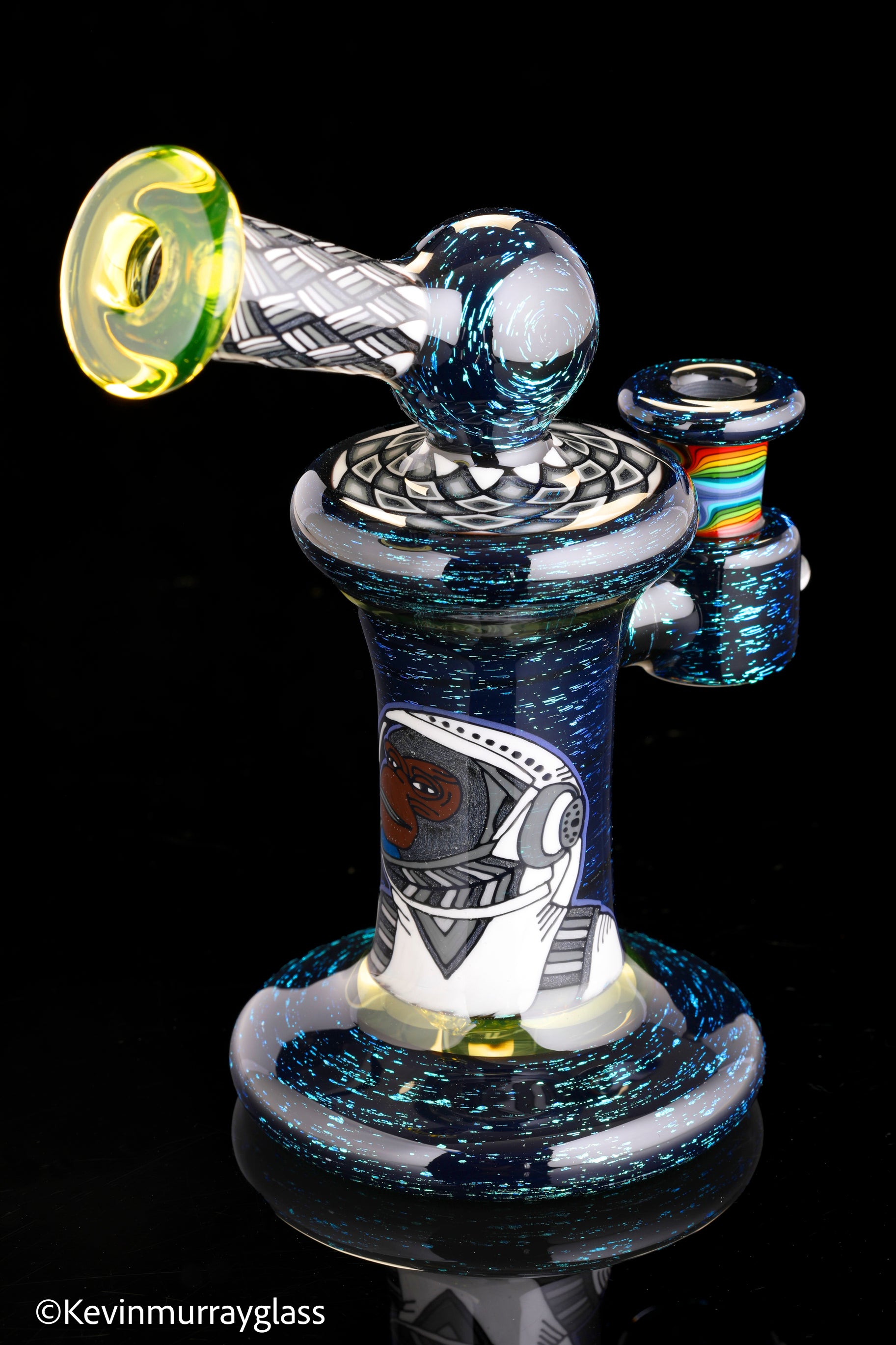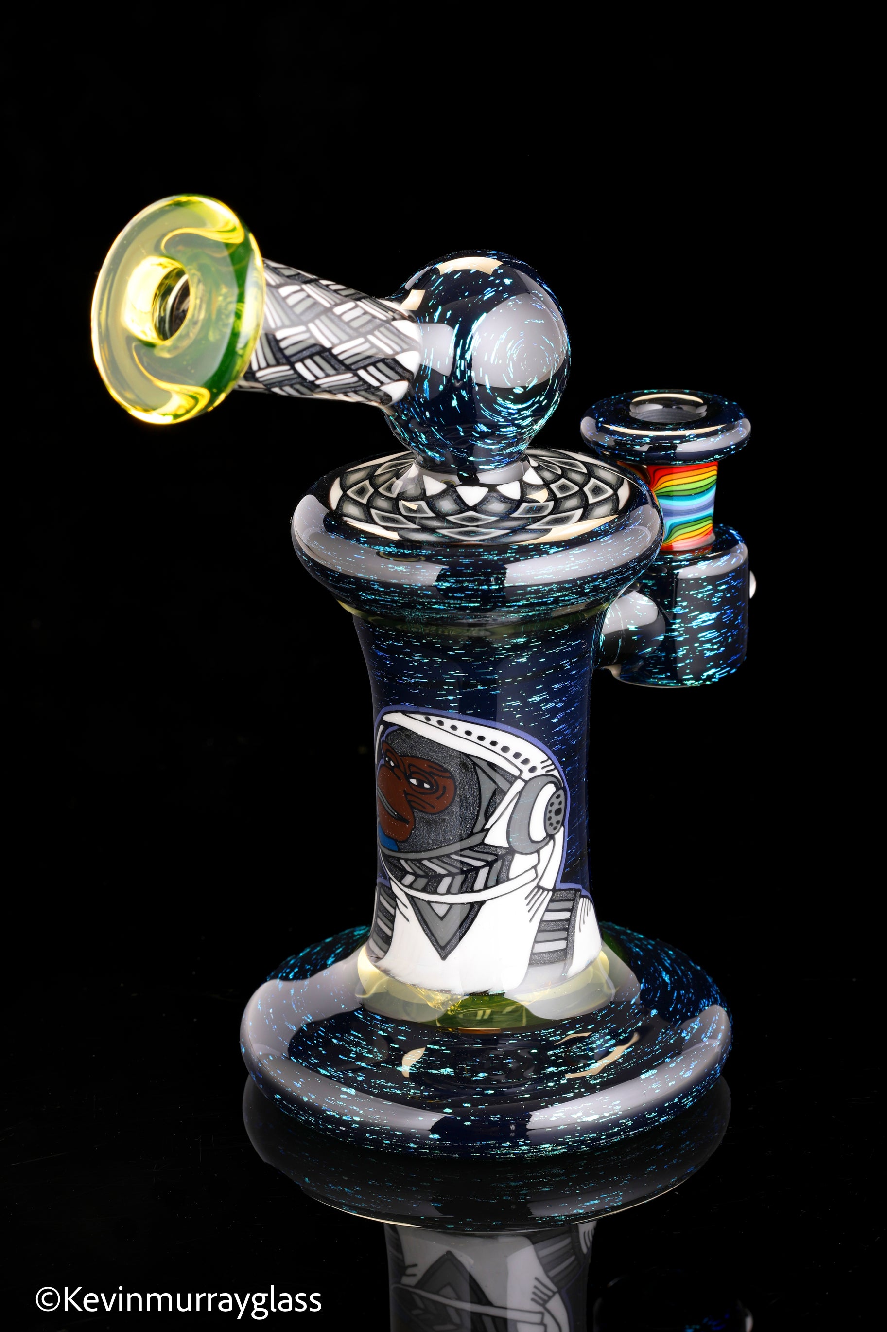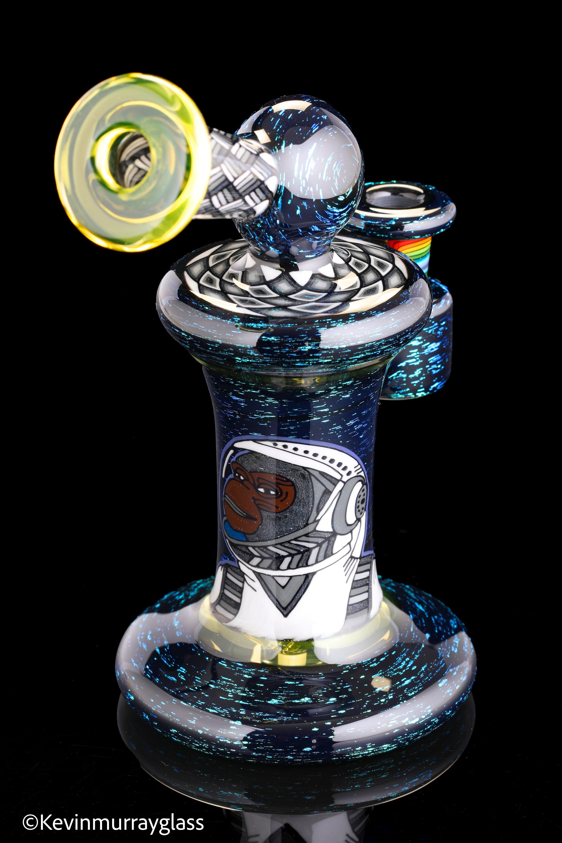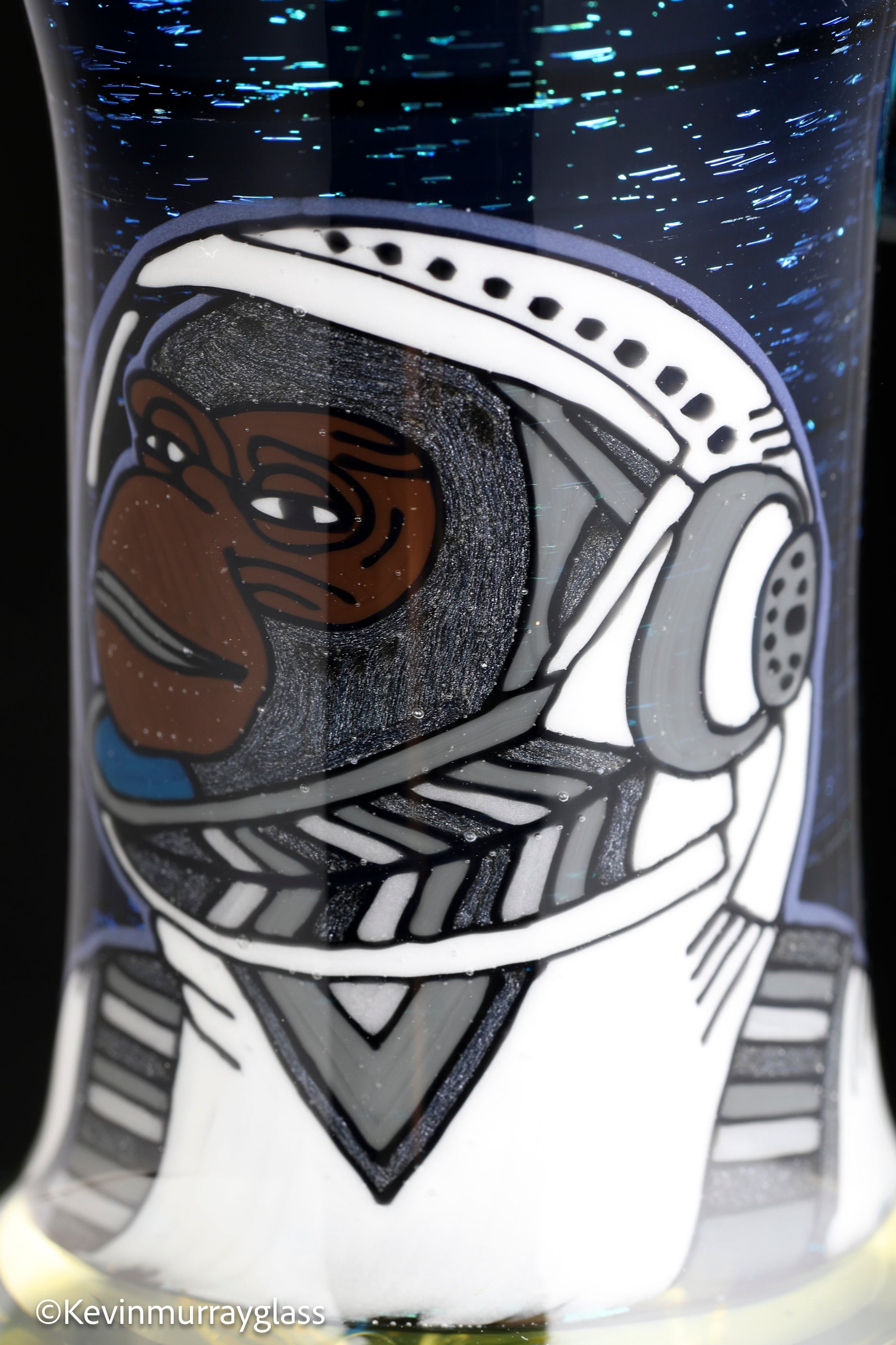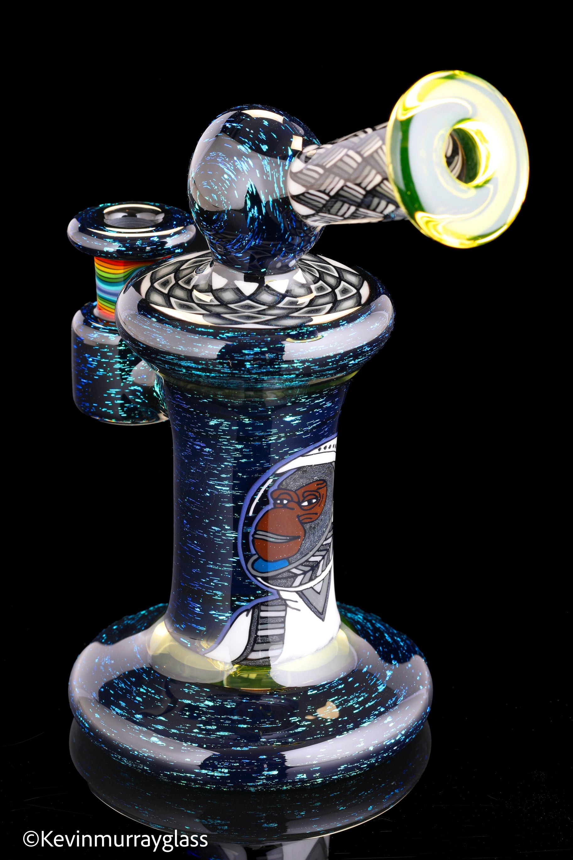The astro-chimp rig inspired by "Ham" the chimpanzee launched into space by nasa in 1961. Blue/teal dichro for the stars in the background. Hand ground 10mm 90 degree joint with a 4 hole perk. Signed with the signature/year murrine. Includes pelican 1150 hard case.