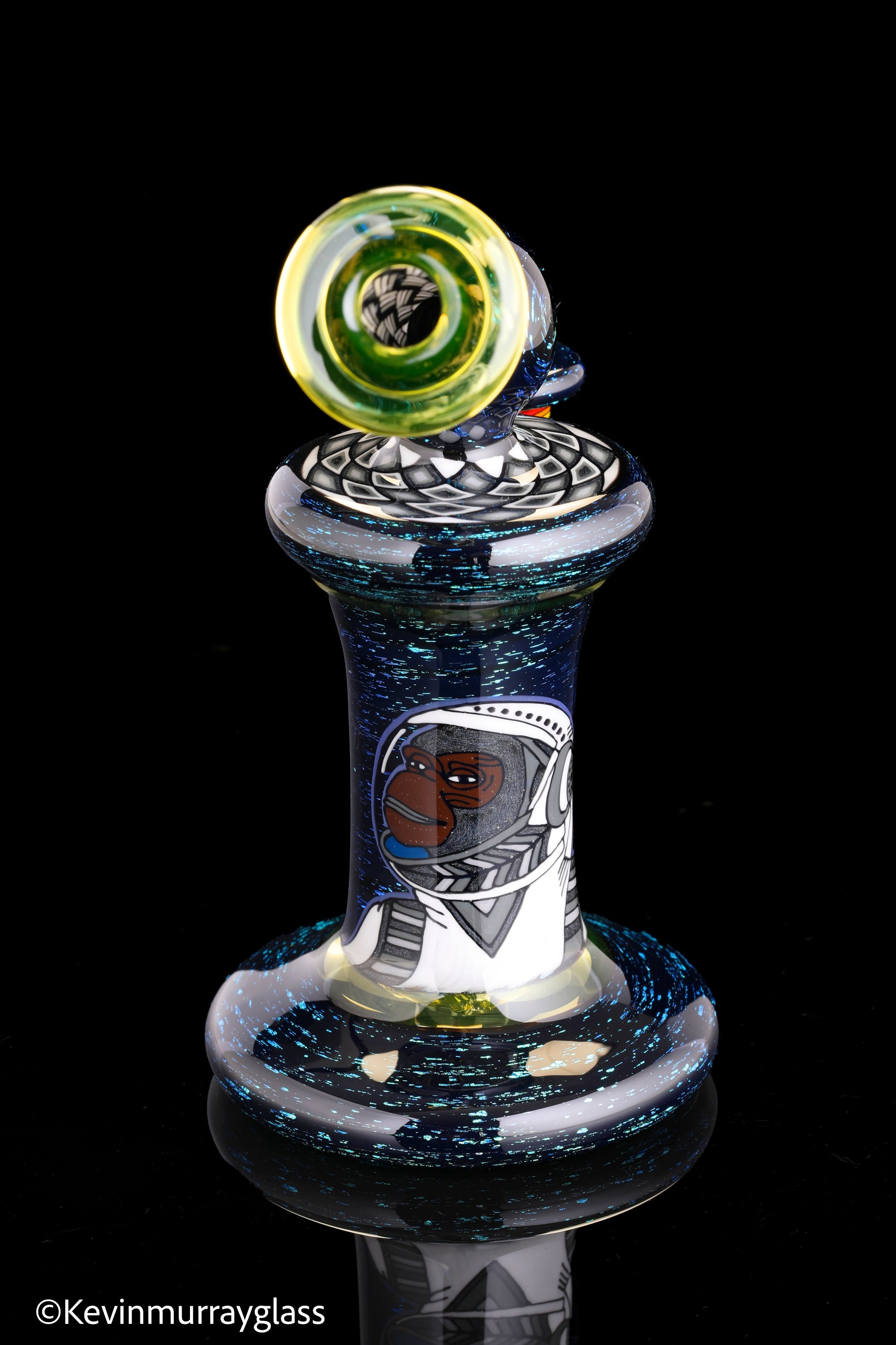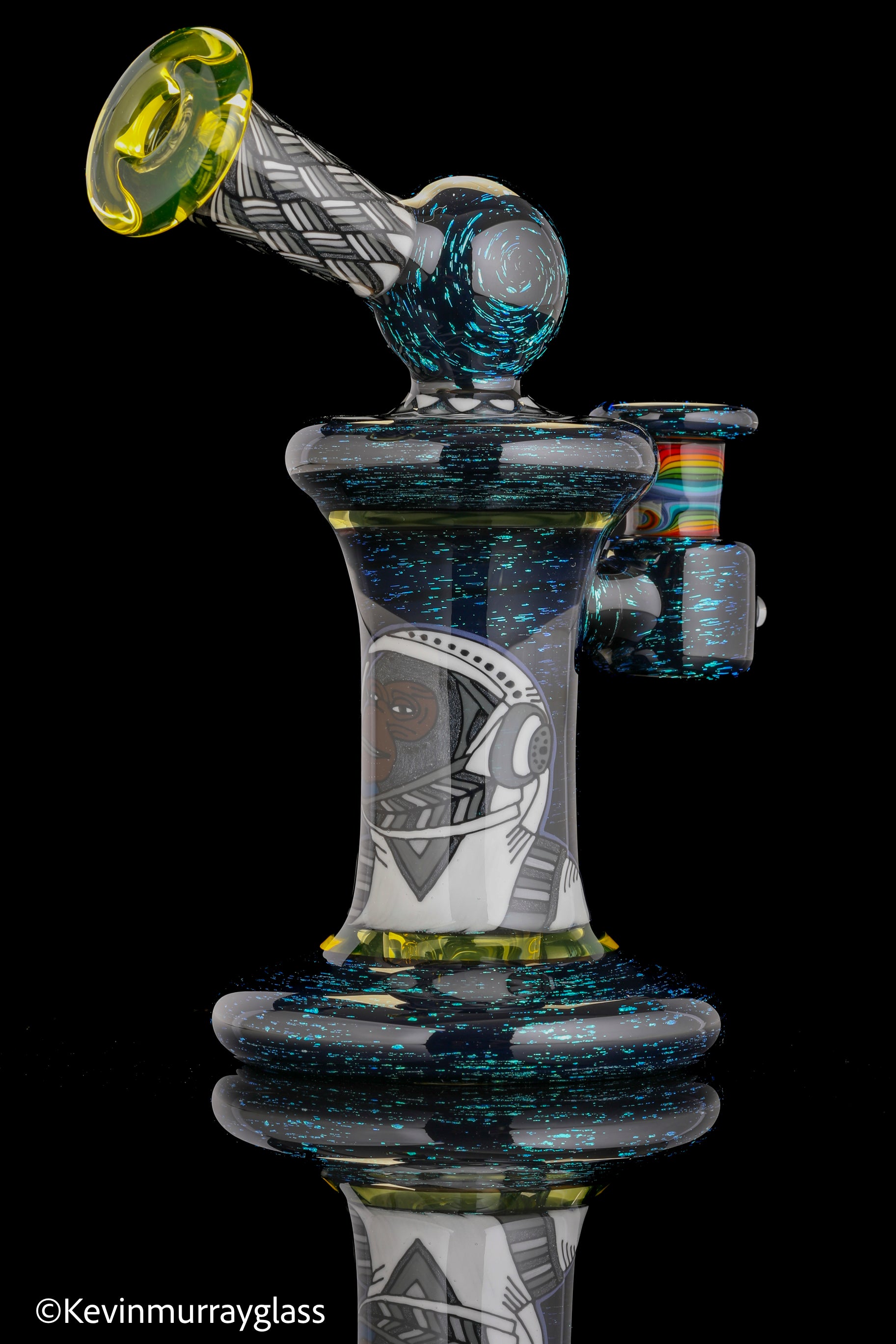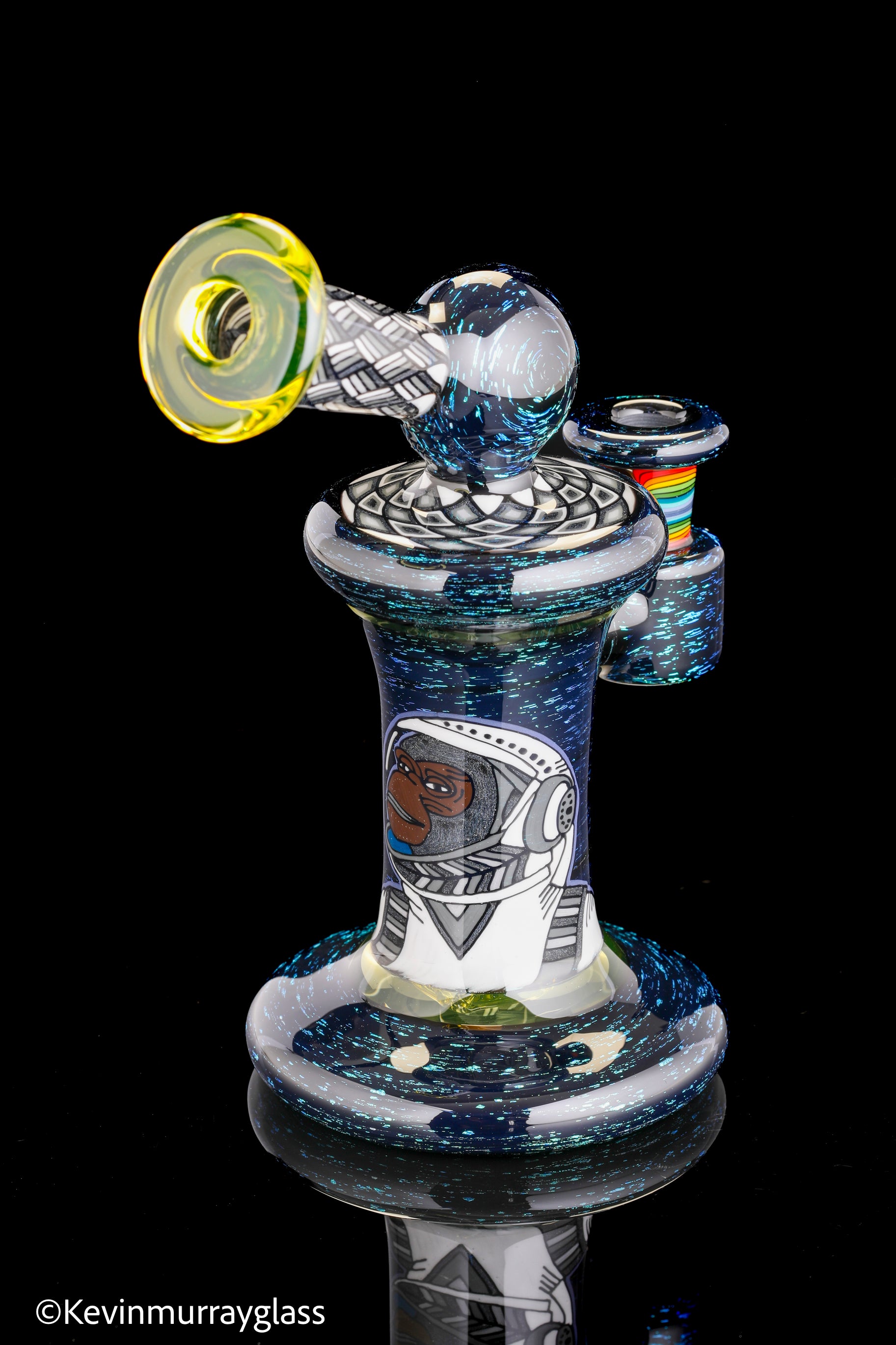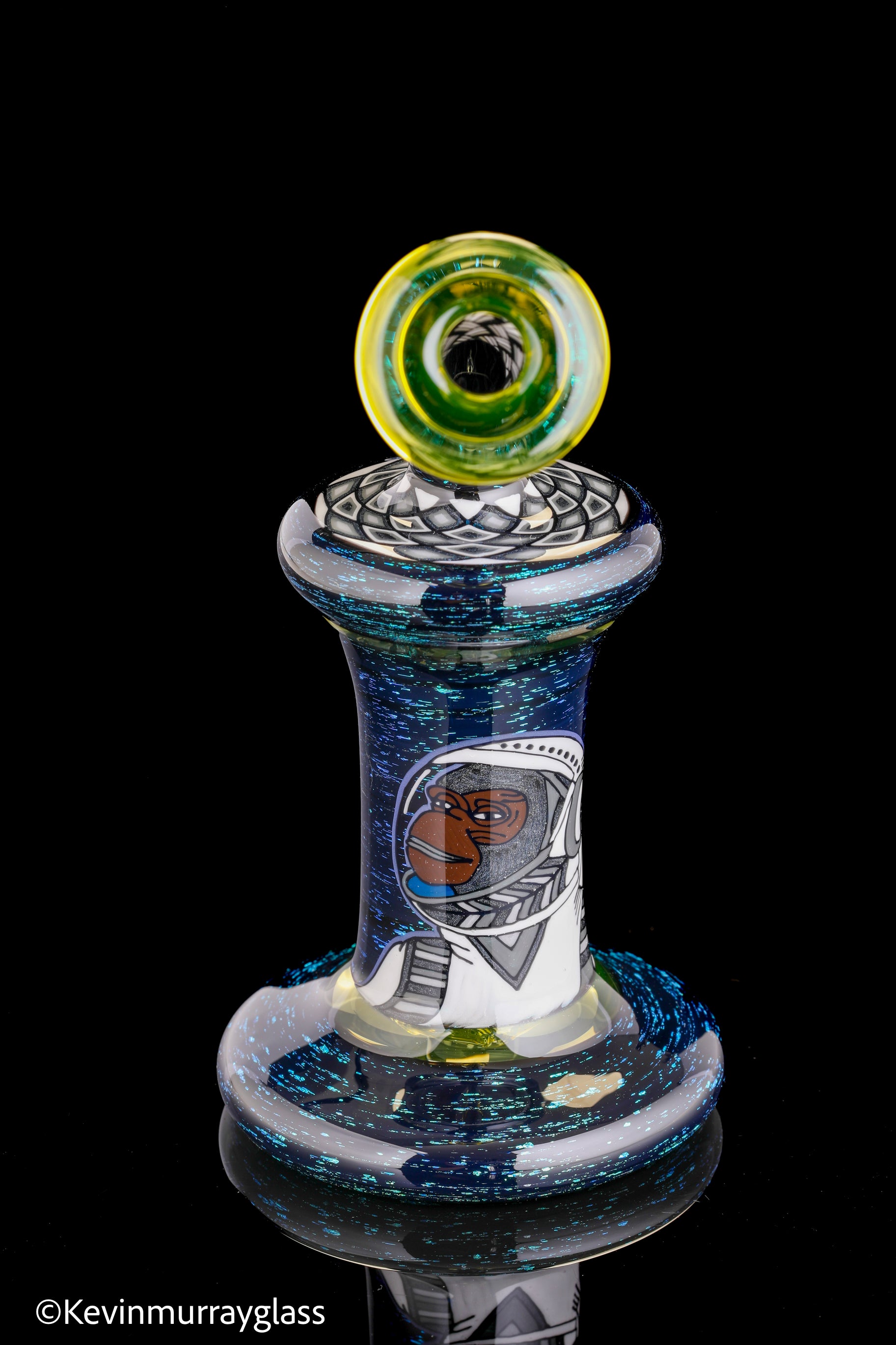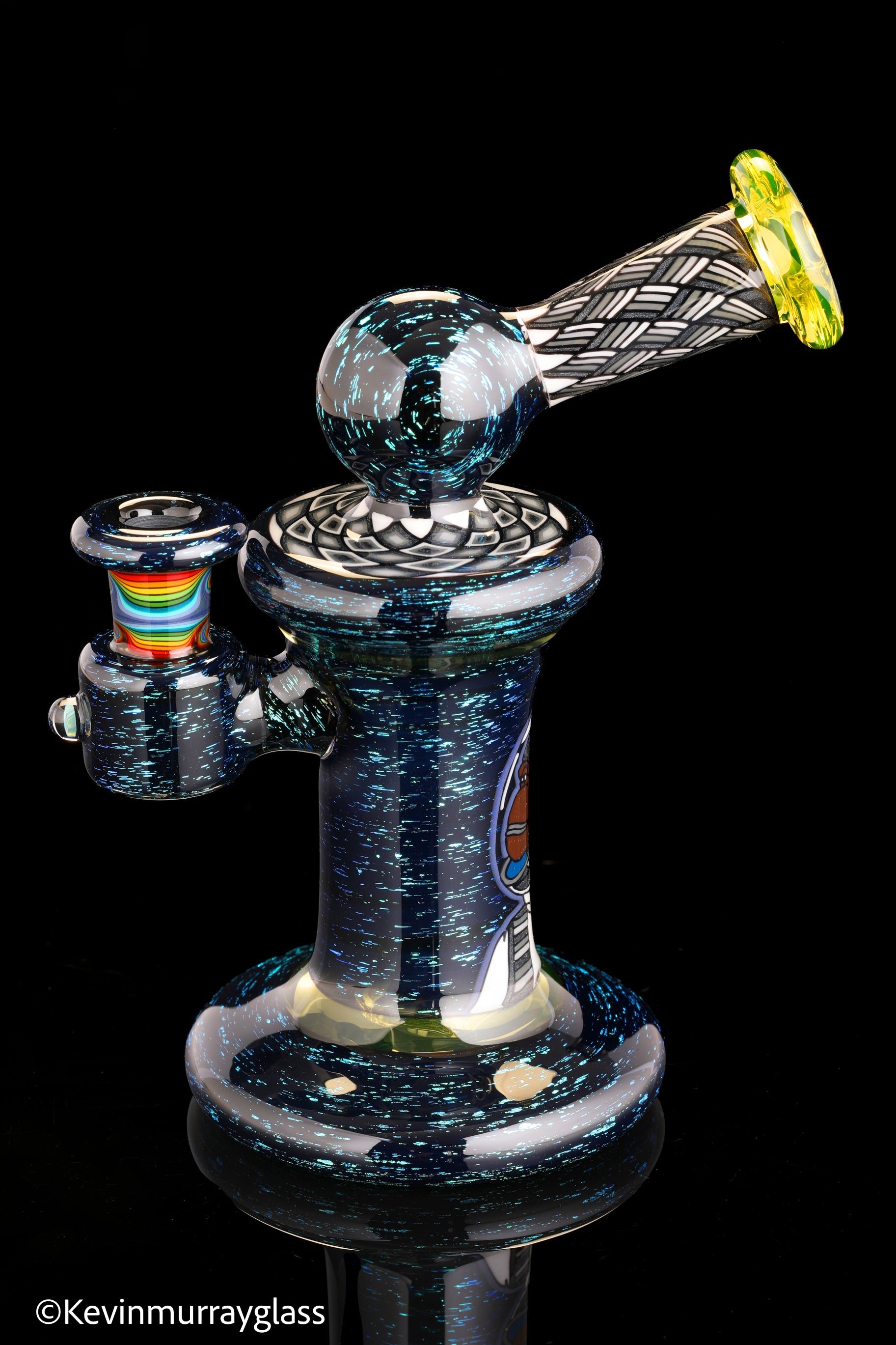 The astro-chimp rig inspired by "Ham" the chimpanzee launched into space by nasa in 1961. Blue/teal dichro for the stars in the background. Hand ground 10mm 90 degree joint with a 4 hole perk. Signed with the signature/year murrine. Includes pelican 1150 hard case.