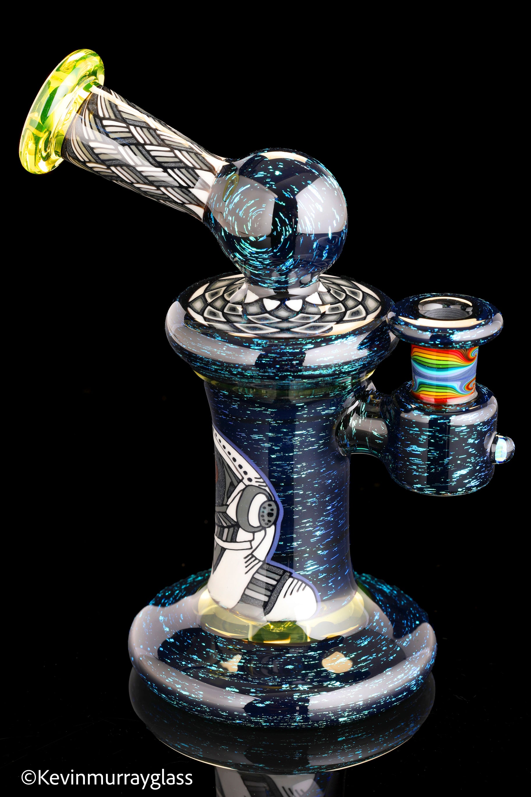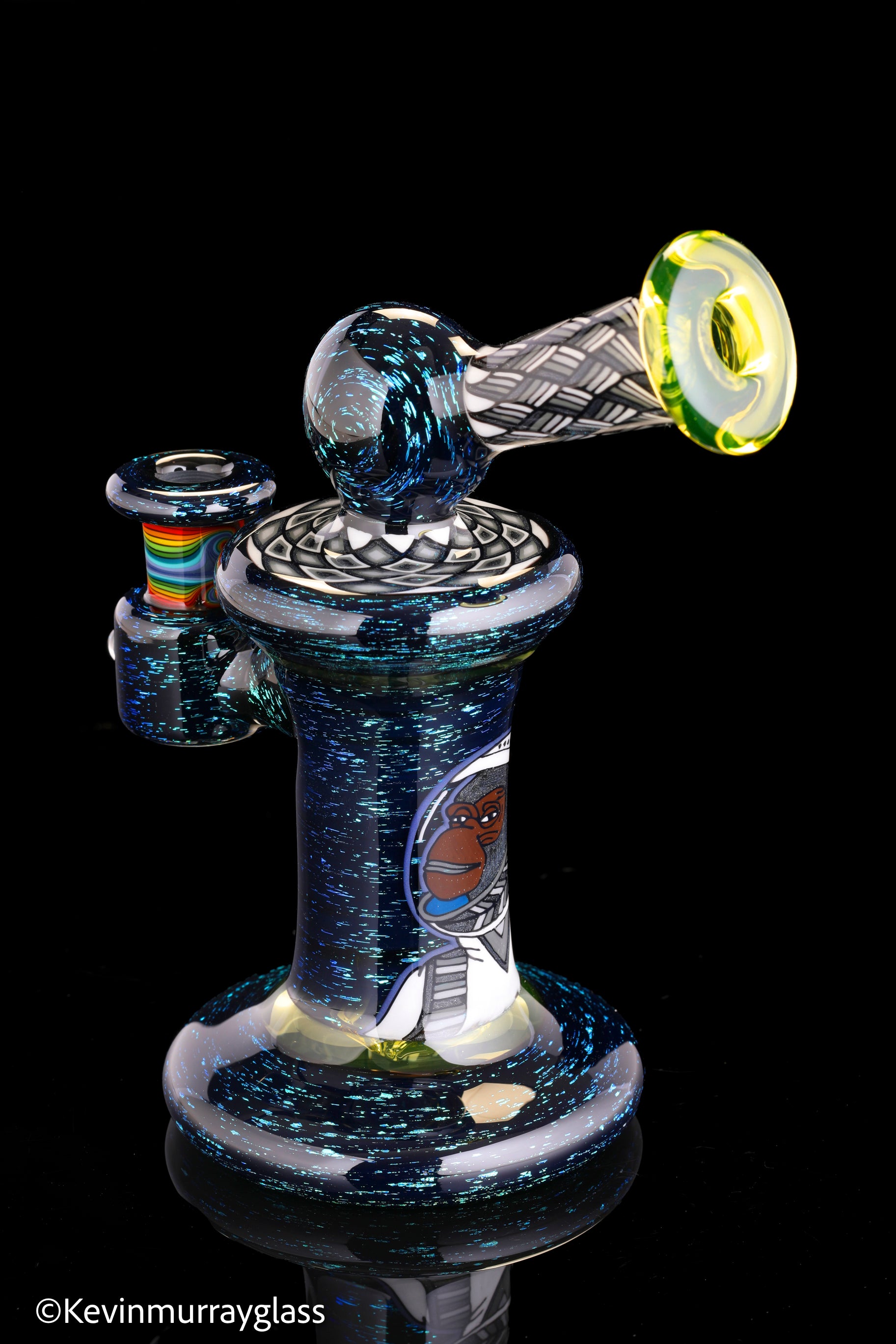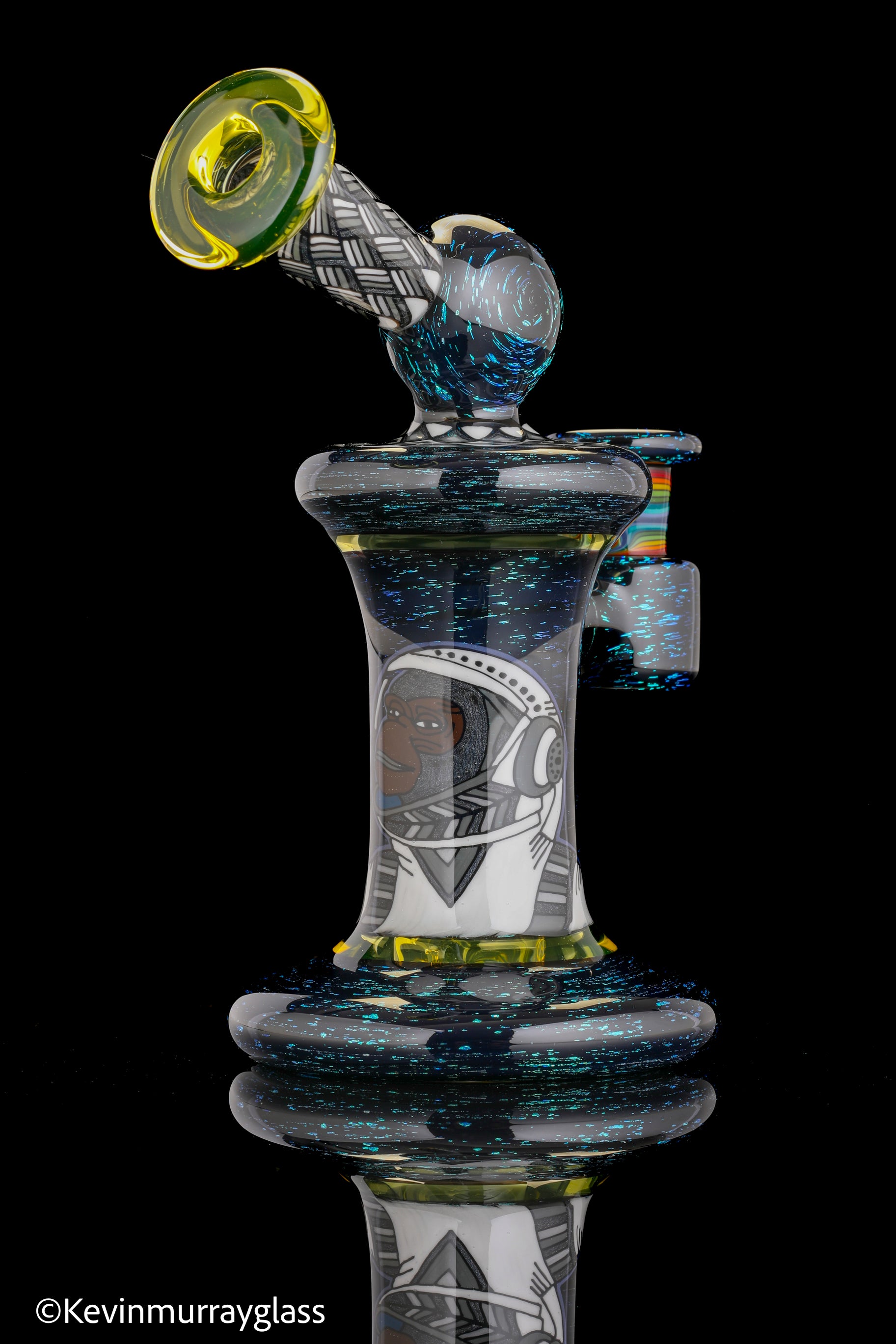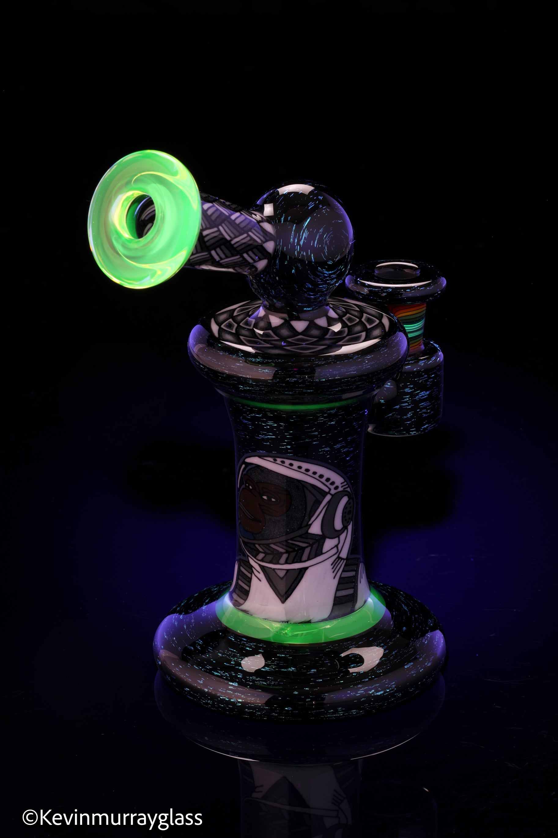 The astro-chimp rig inspired by "Ham" the chimpanzee launched into space by nasa in 1961. Blue/teal dichro for the stars in the background. Hand ground 10mm 90 degree joint with a 4 hole perk. Signed with the signature/year murrine. Includes pelican 1150 hard case.