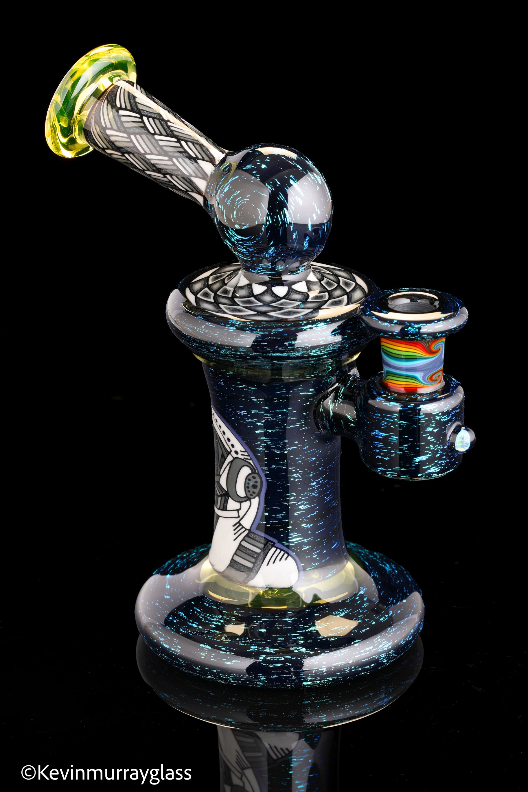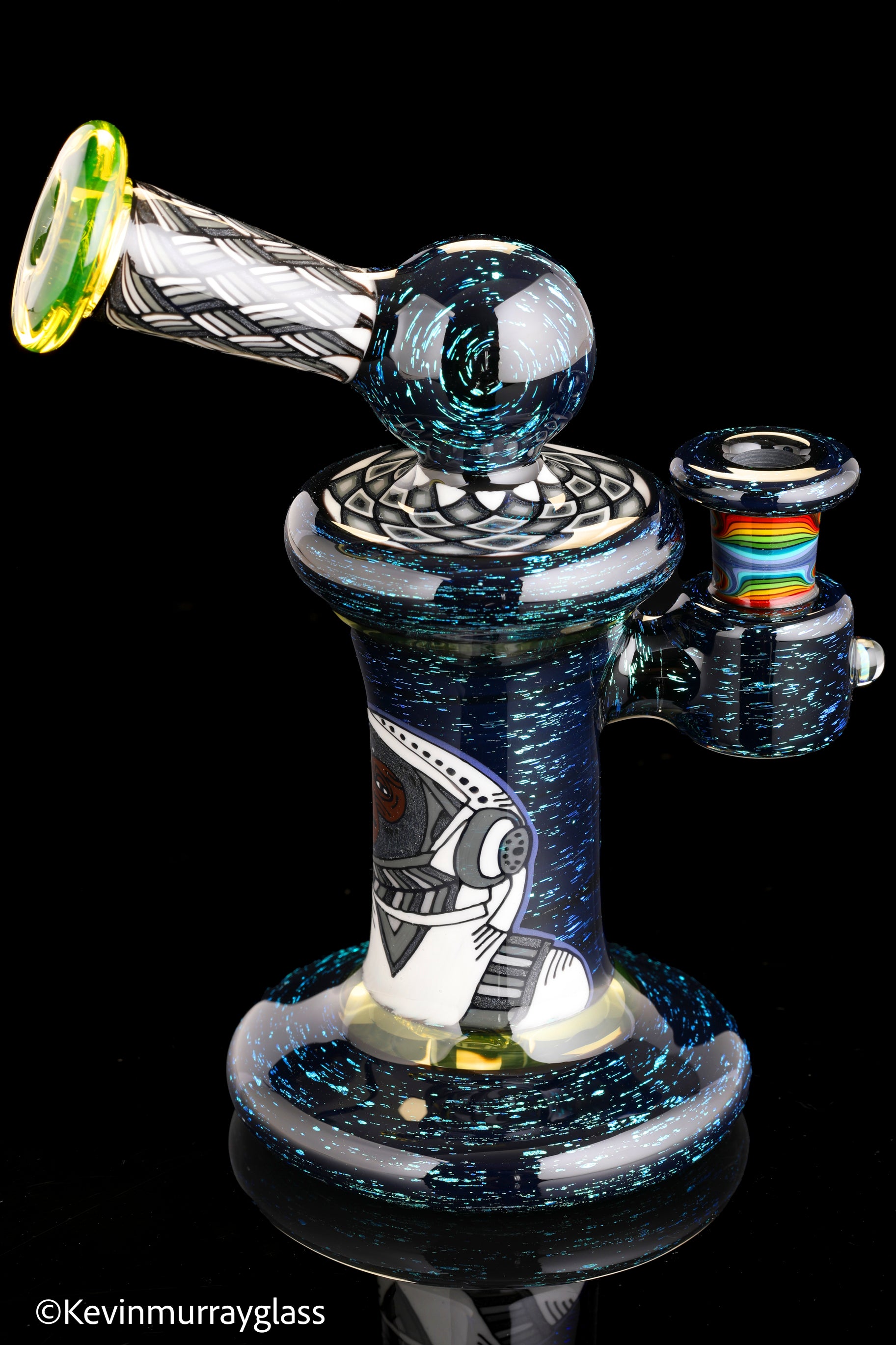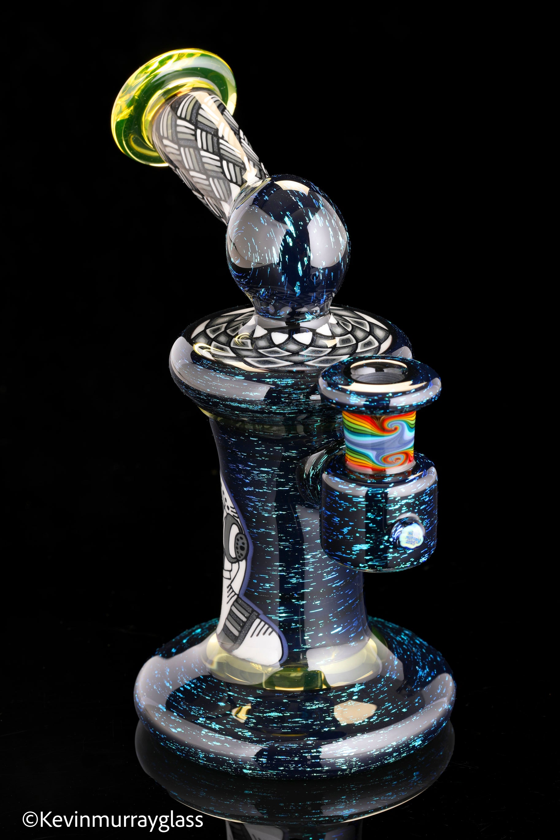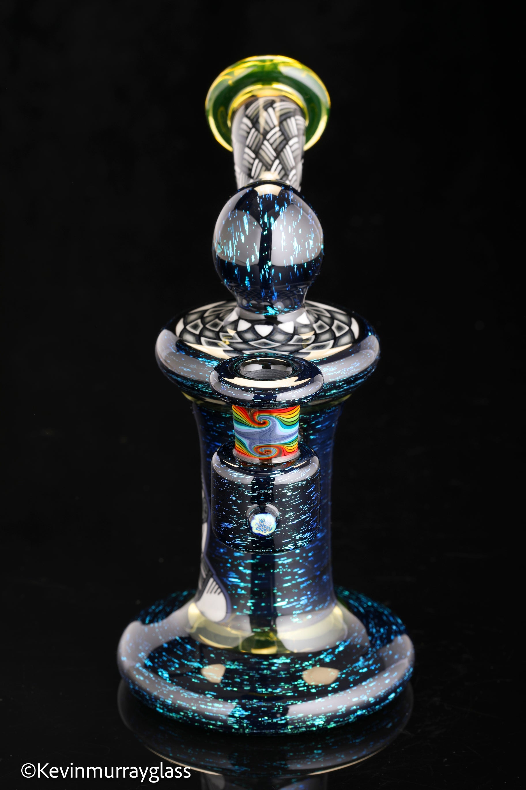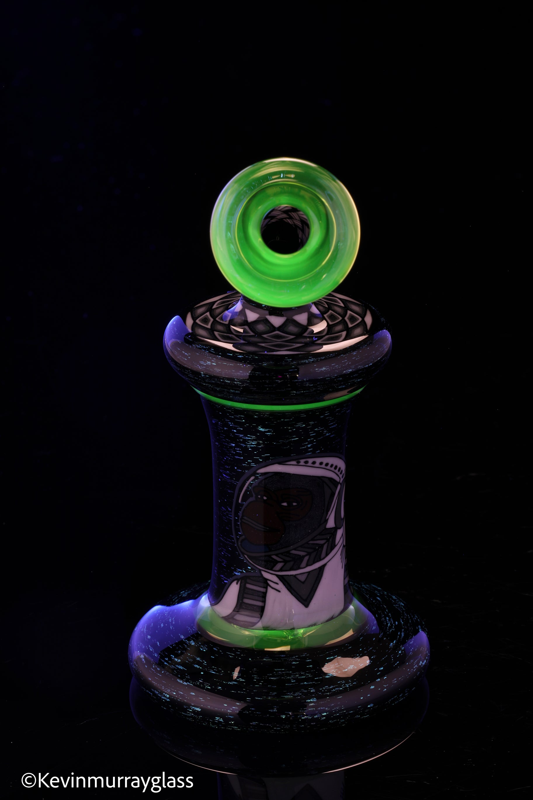 The astro-chimp rig inspired by "Ham" the chimpanzee launched into space by nasa in 1961. Blue/teal dichro for the stars in the background. Hand ground 10mm 90 degree joint with a 4 hole perk. Signed with the signature/year murrine. Includes pelican 1150 hard case.
