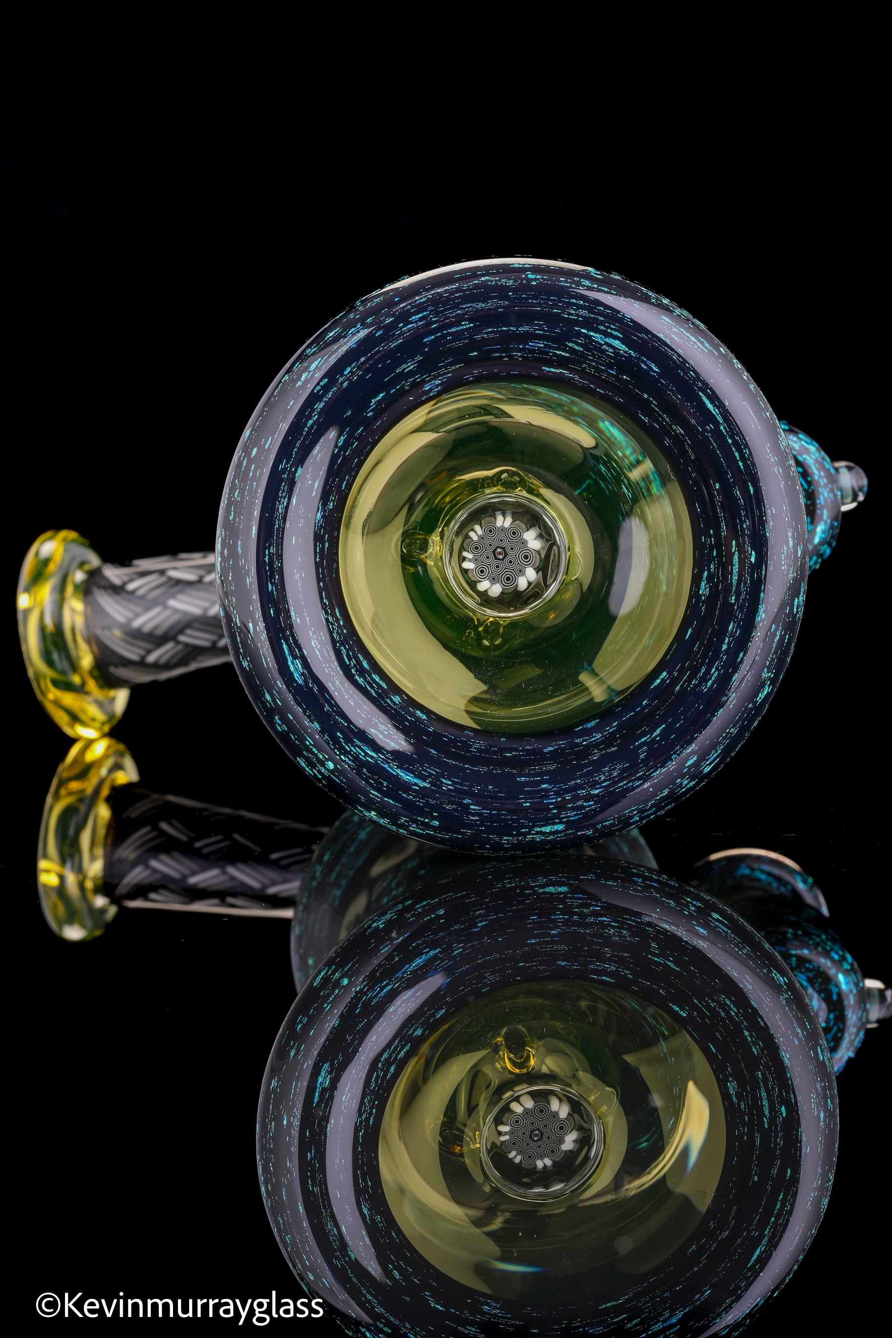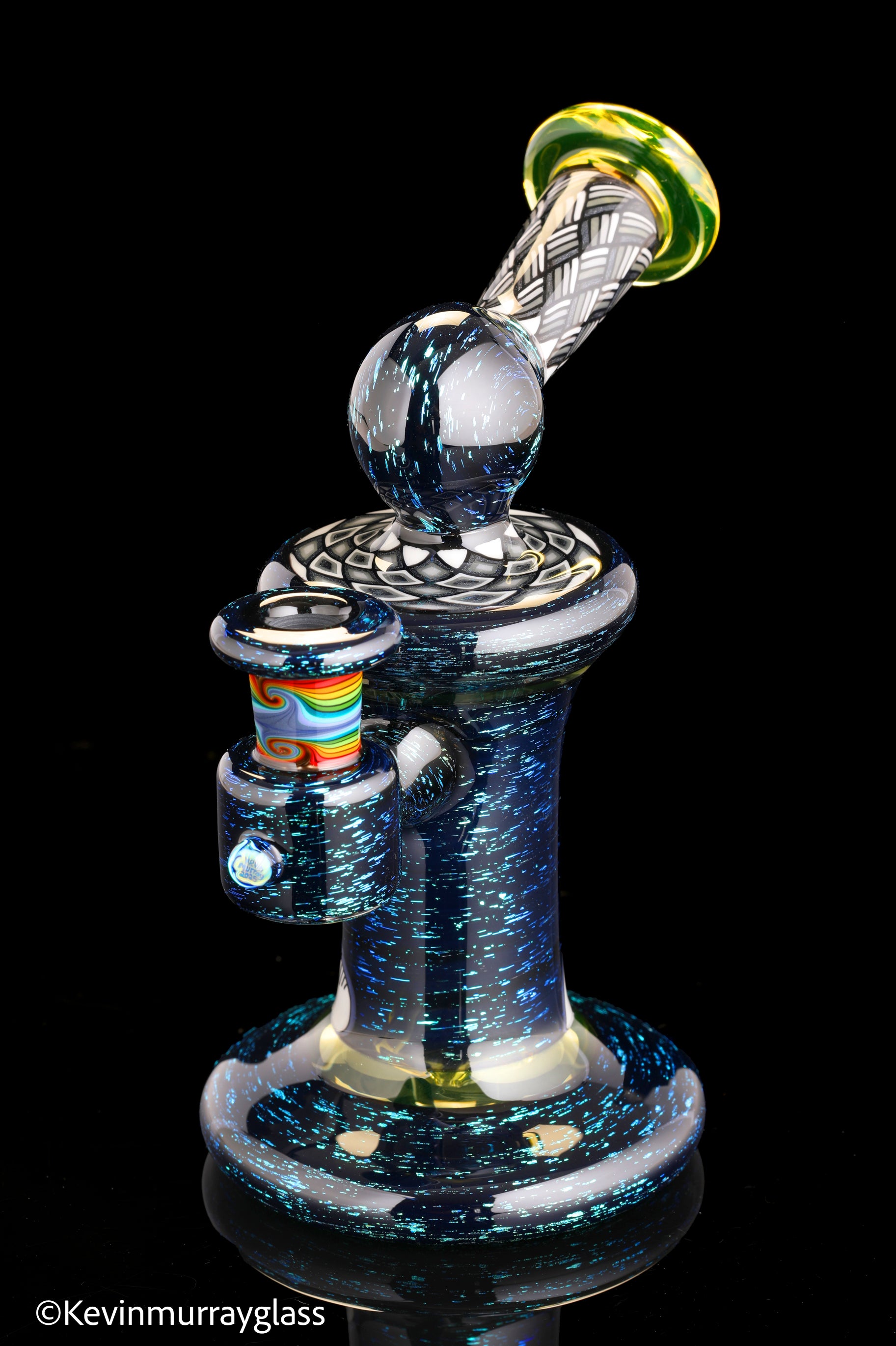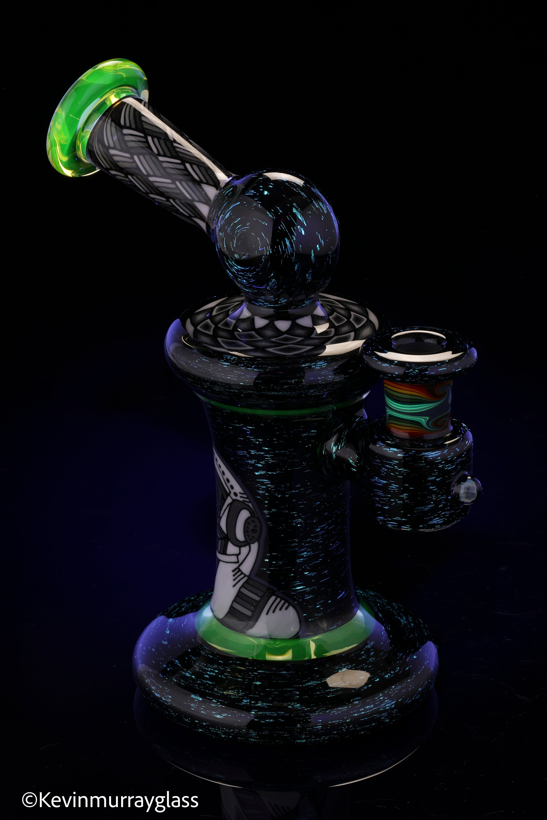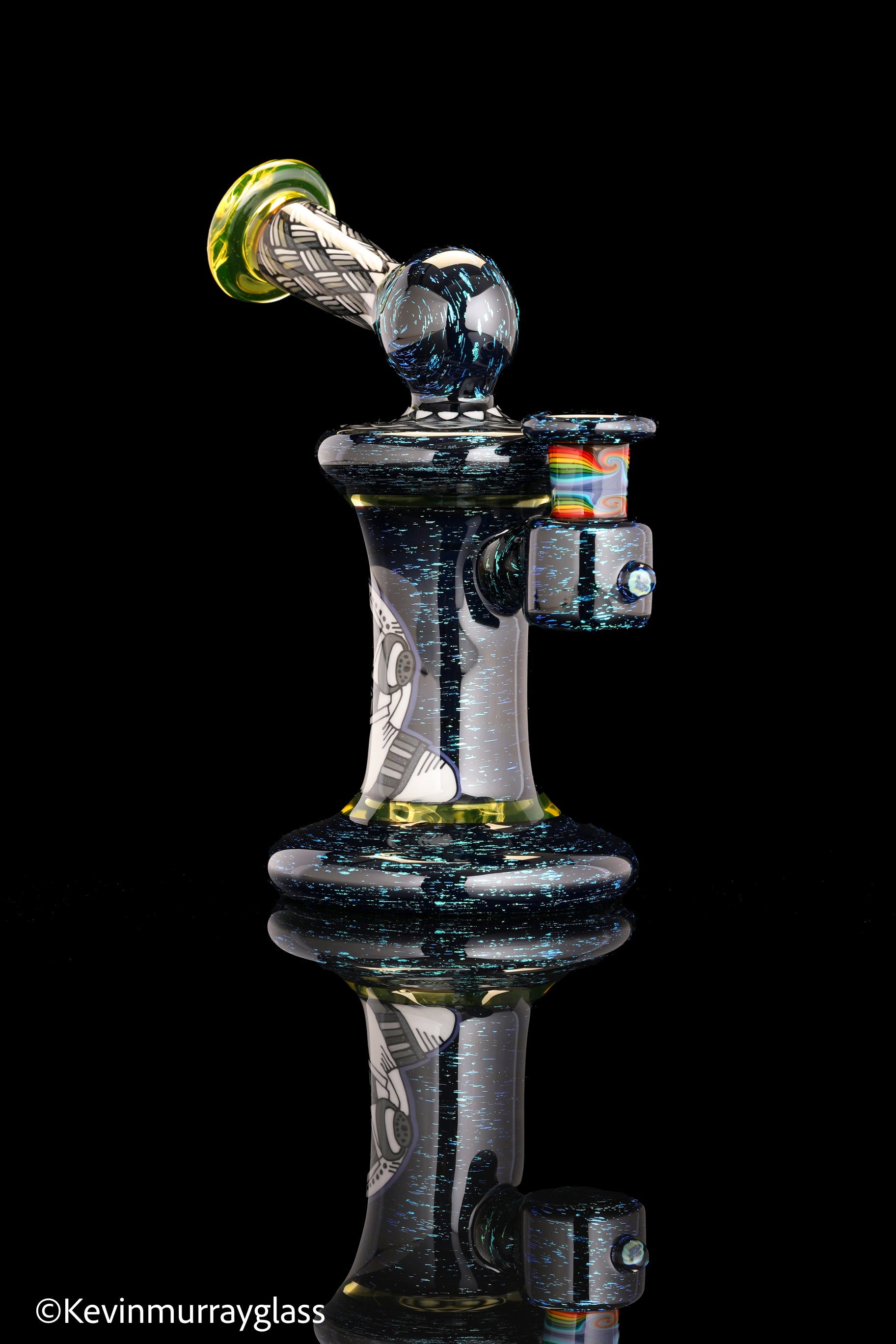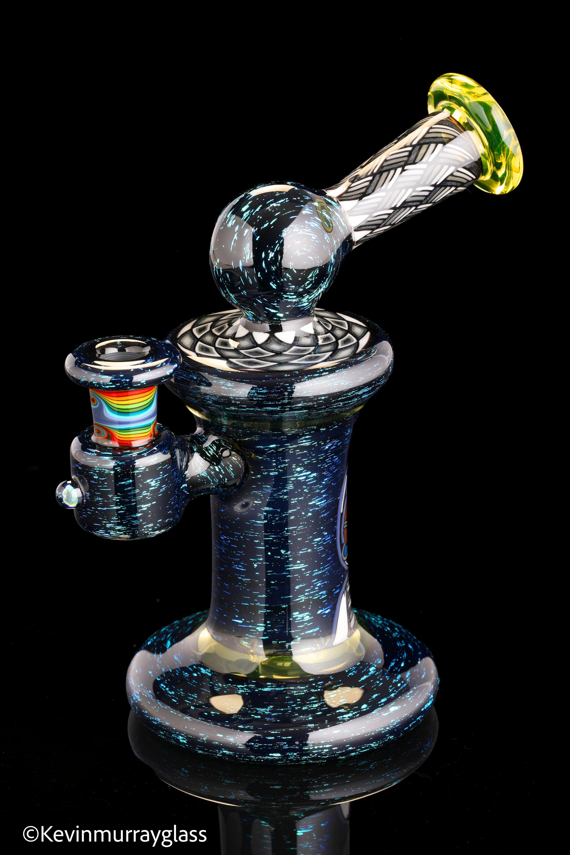 The astro-chimp rig inspired by "Ham" the chimpanzee launched into space by nasa in 1961. Blue/teal dichro for the stars in the background. Hand ground 10mm 90 degree joint with a 4 hole perk. Signed with the signature/year murrine. Includes pelican 1150 hard case.