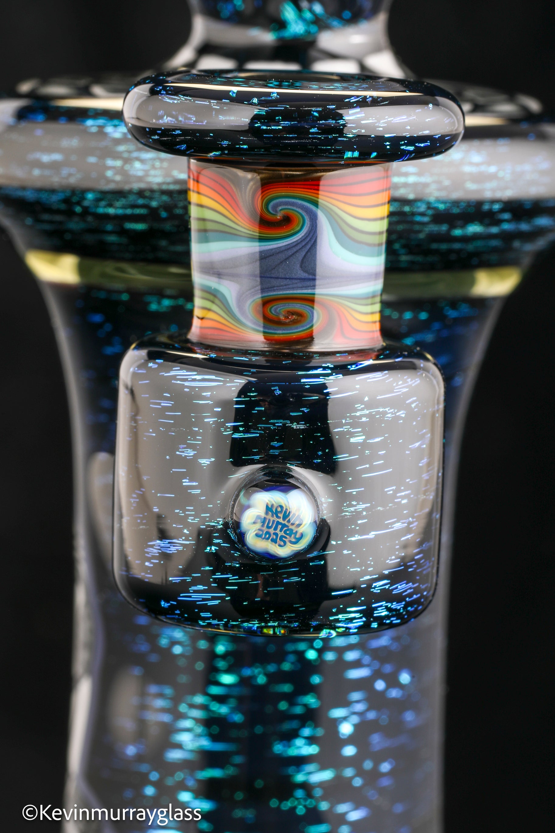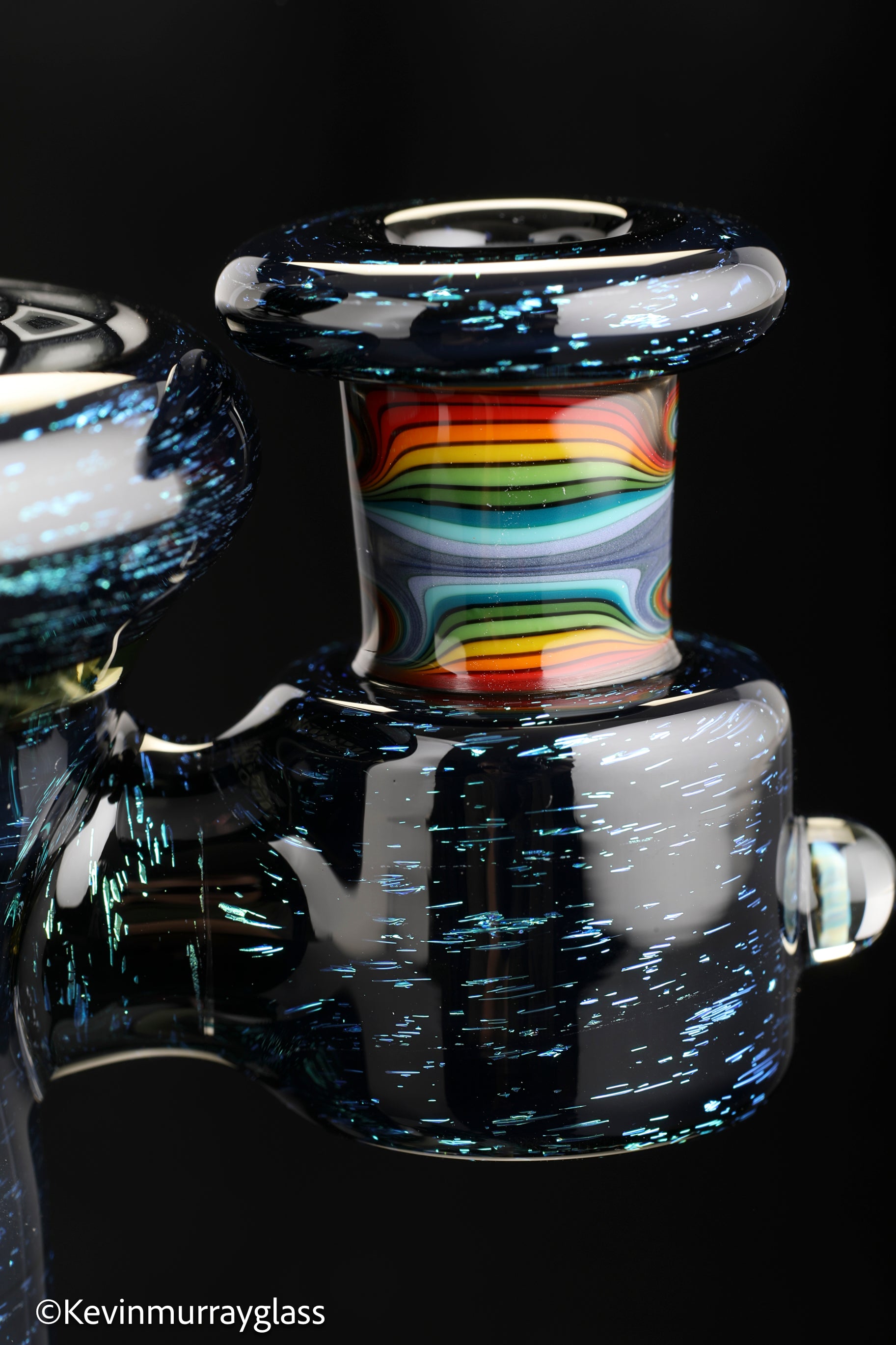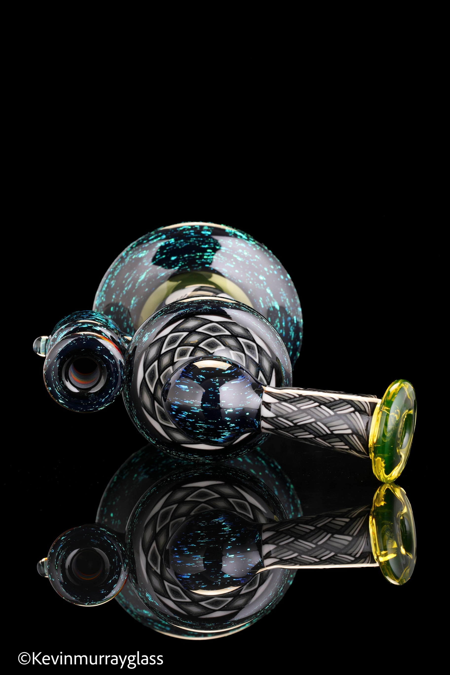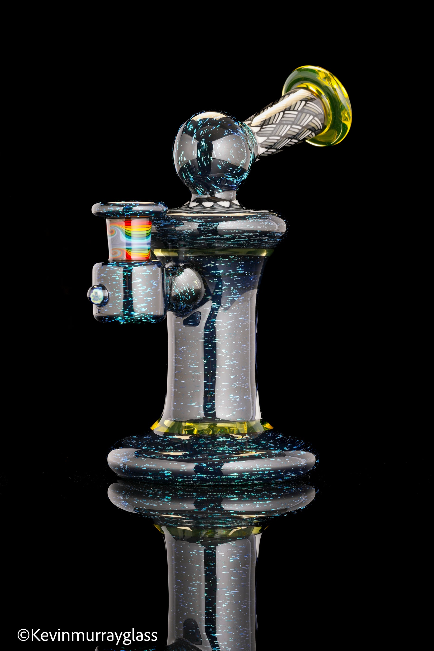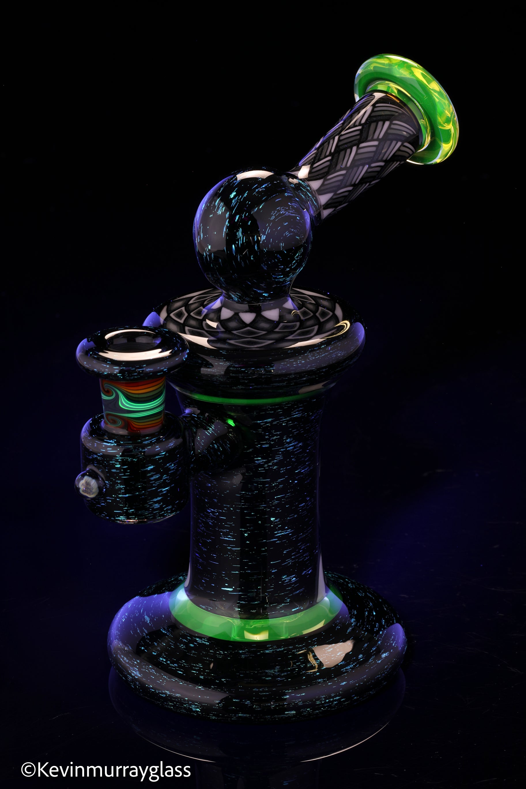 The astro-chimp rig inspired by "Ham" the chimpanzee launched into space by nasa in 1961. Blue/teal dichro for the stars in the background. Hand ground 10mm 90 degree joint with a 4 hole perk. Signed with the signature/year murrine. Includes pelican 1150 hard case.