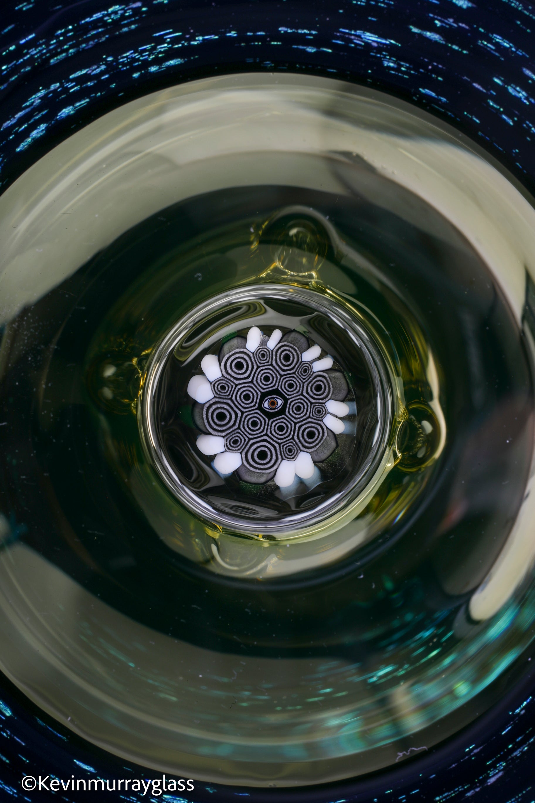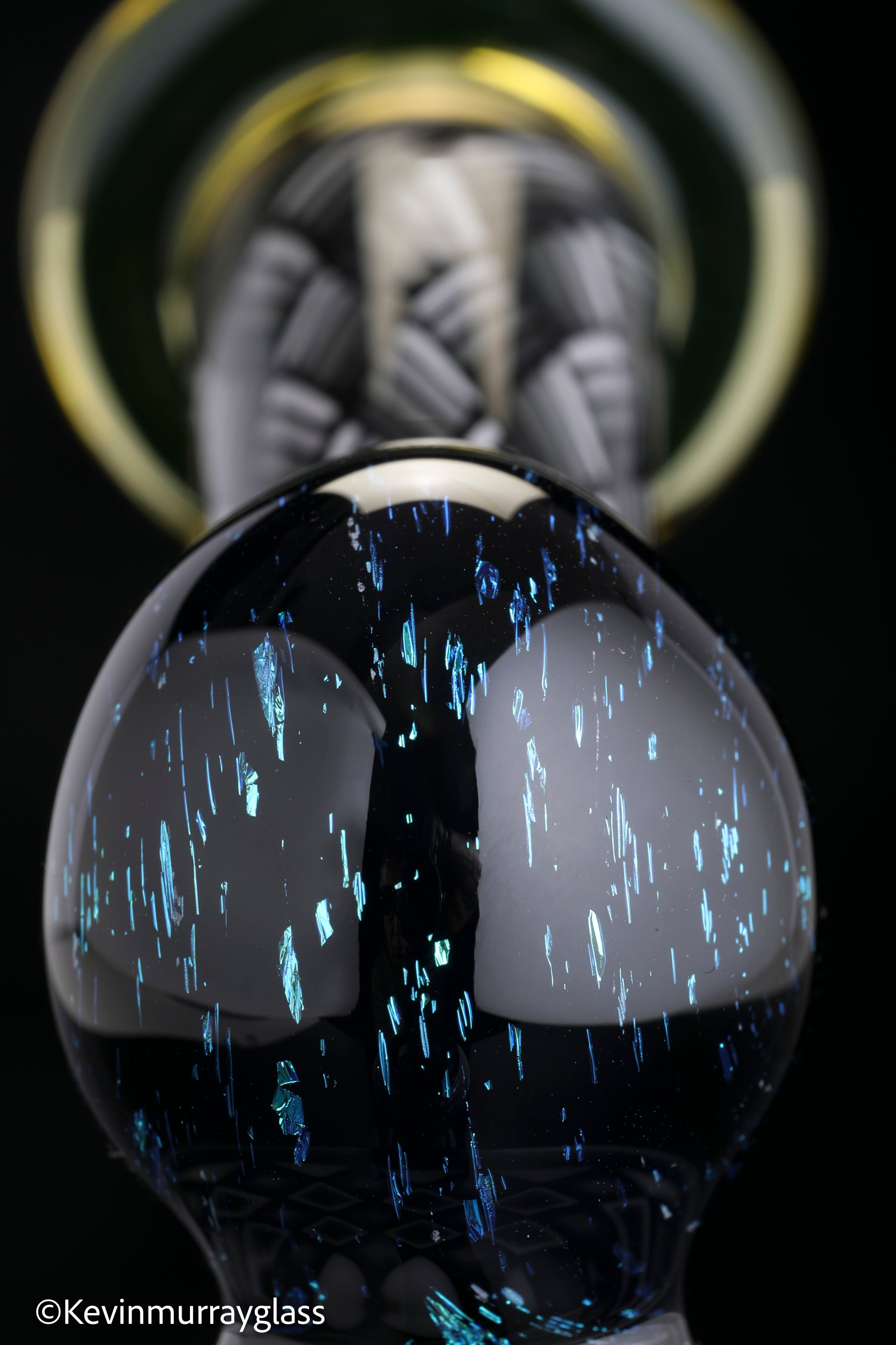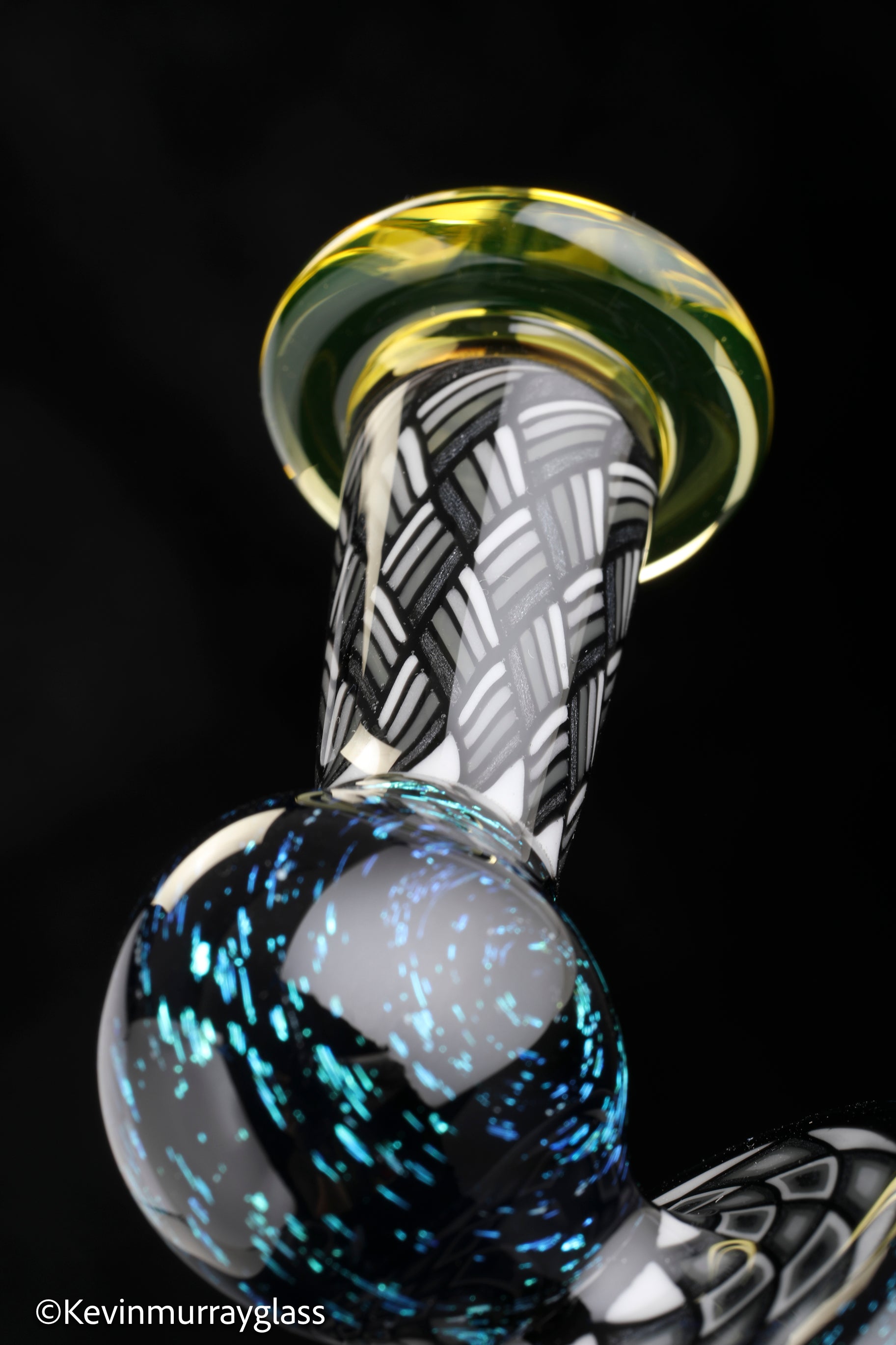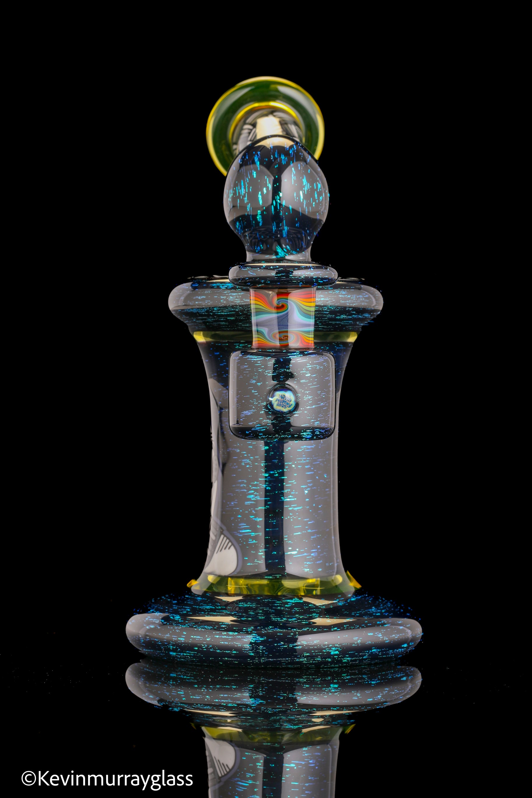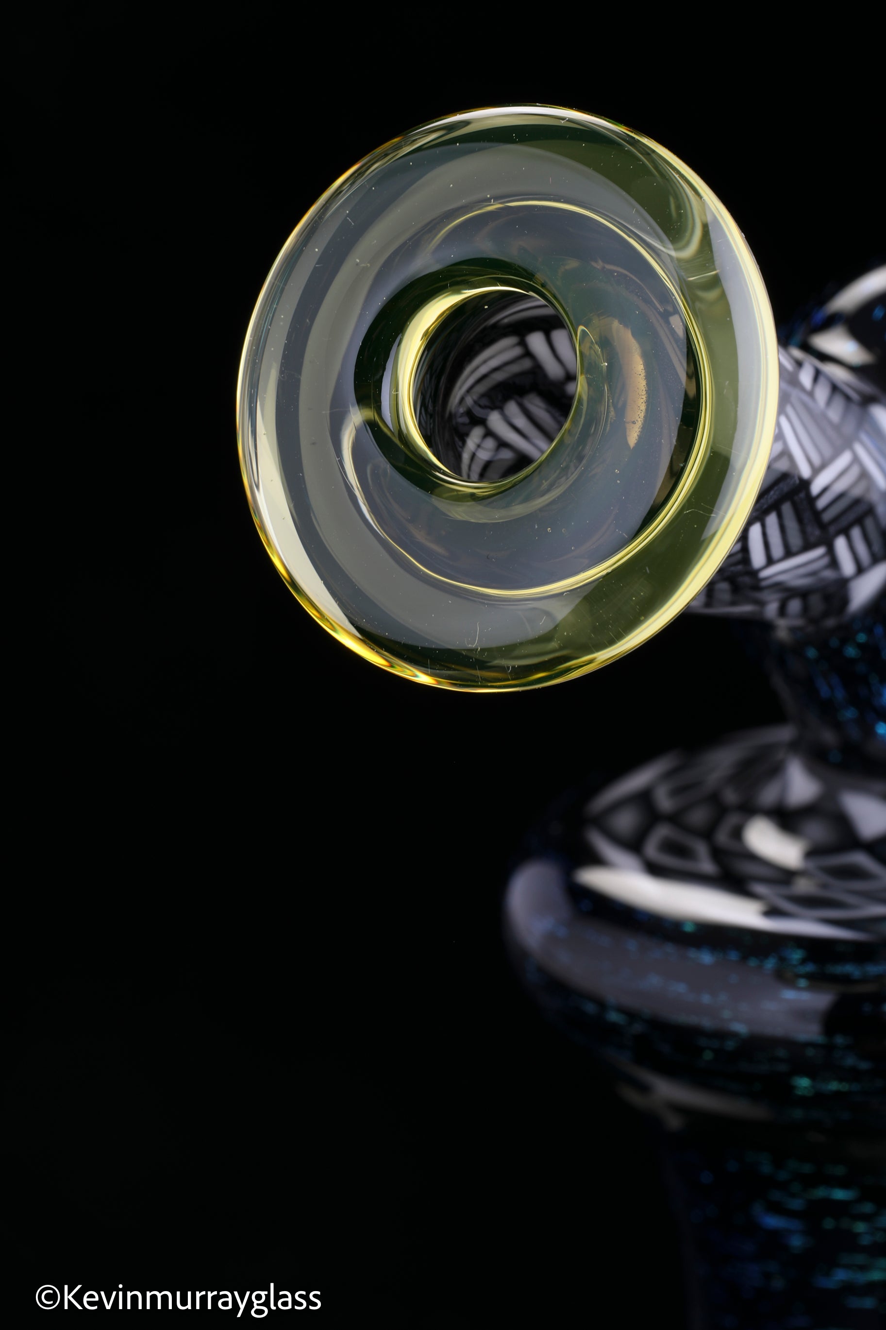 The astro-chimp rig inspired by "Ham" the chimpanzee launched into space by nasa in 1961. Blue/teal dichro for the stars in the background. Hand ground 10mm 90 degree joint with a 4 hole perk. Signed with the signature/year murrine. Includes pelican 1150 hard case.