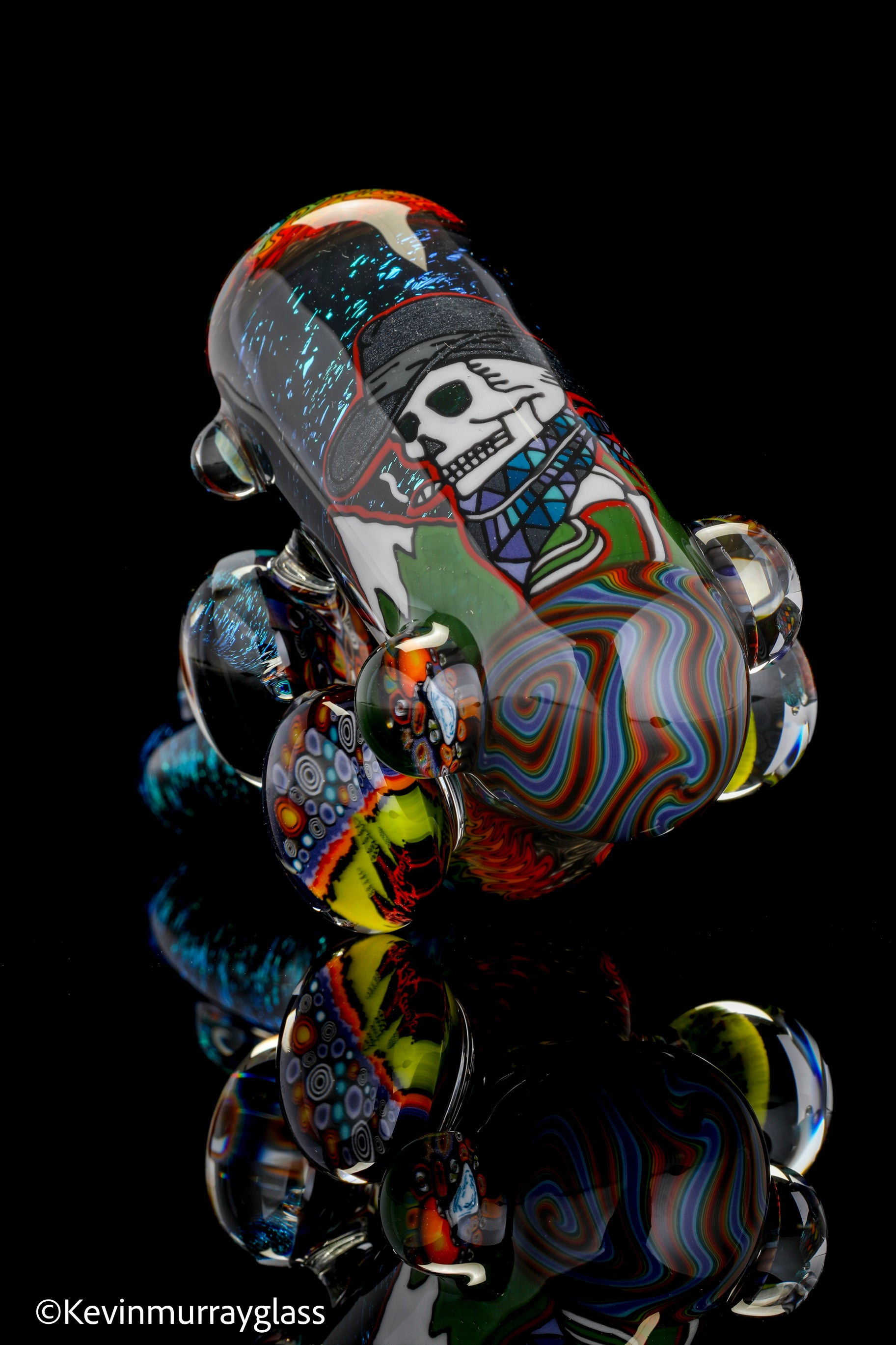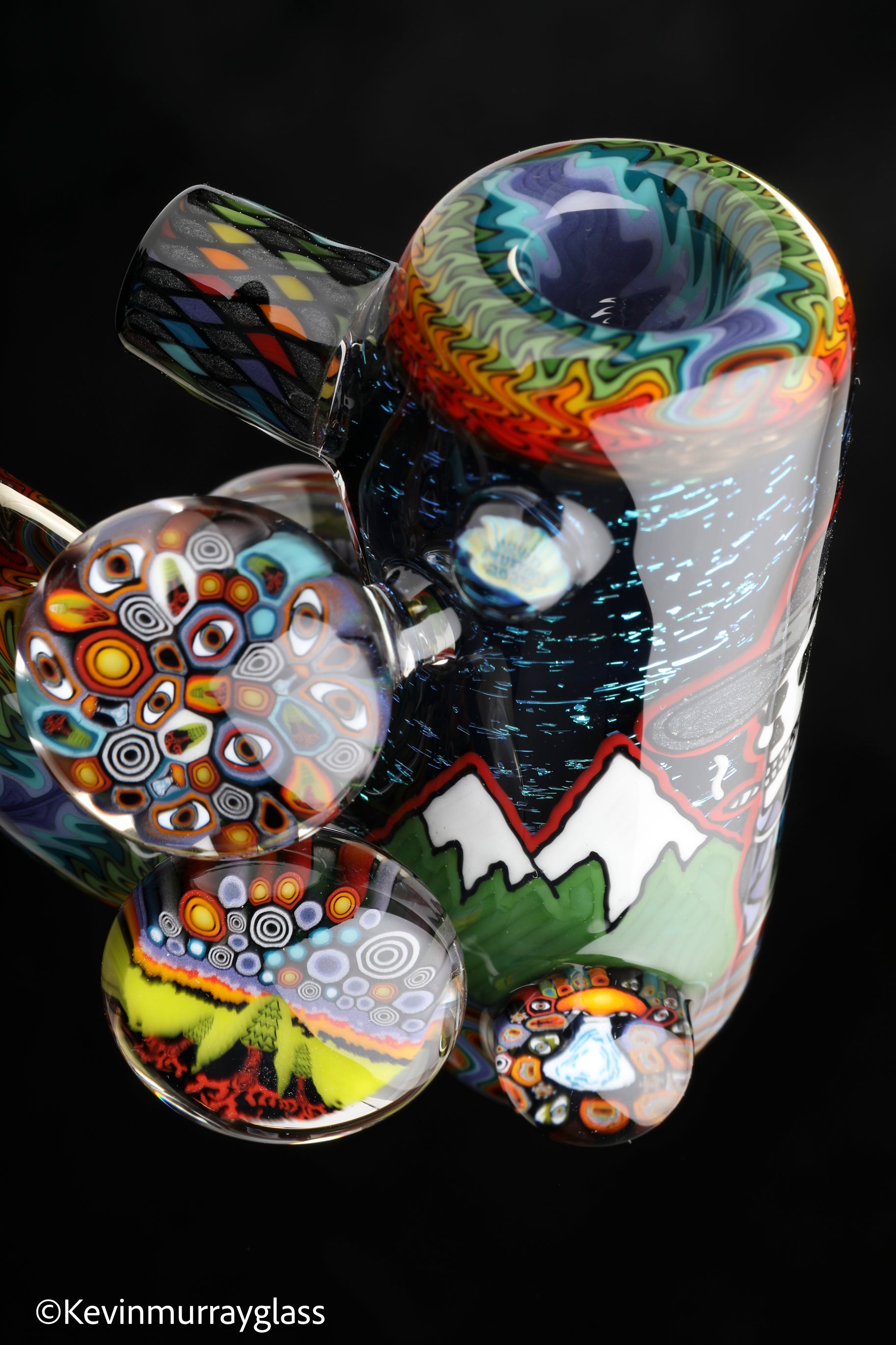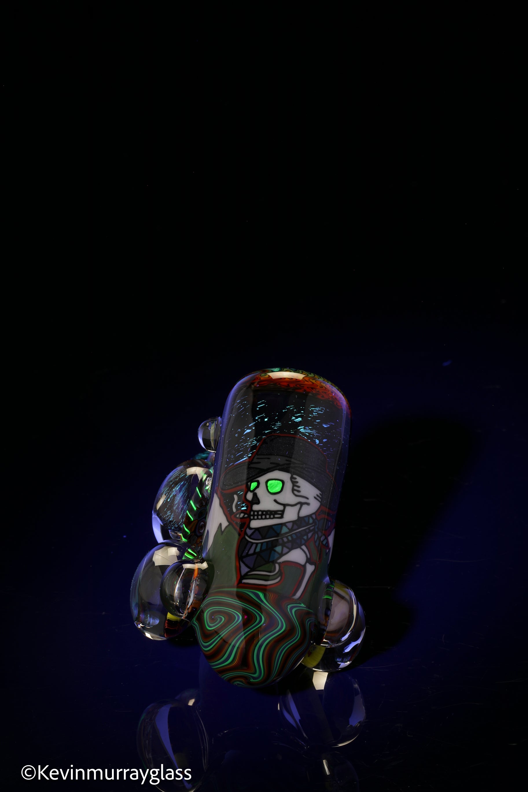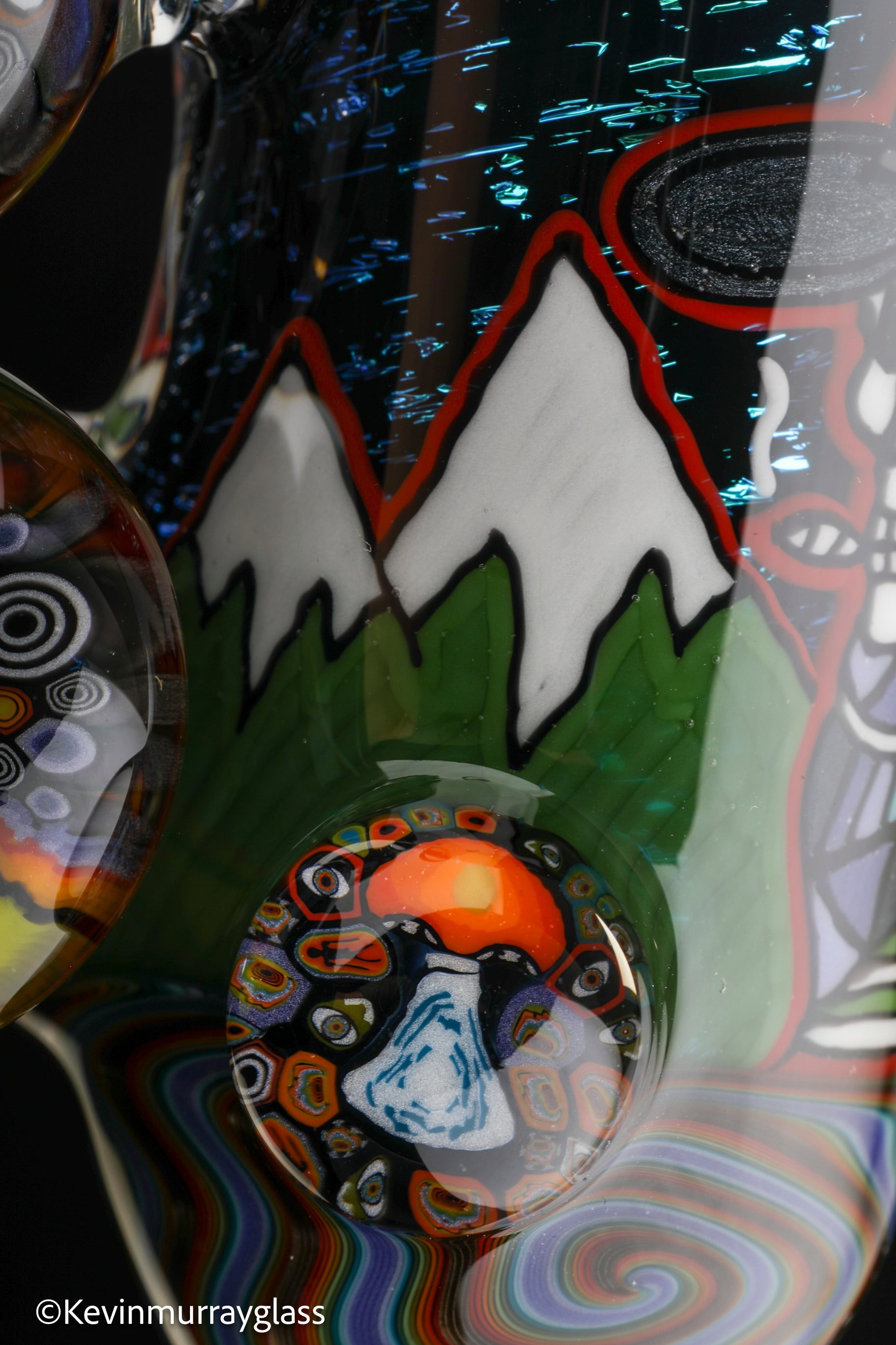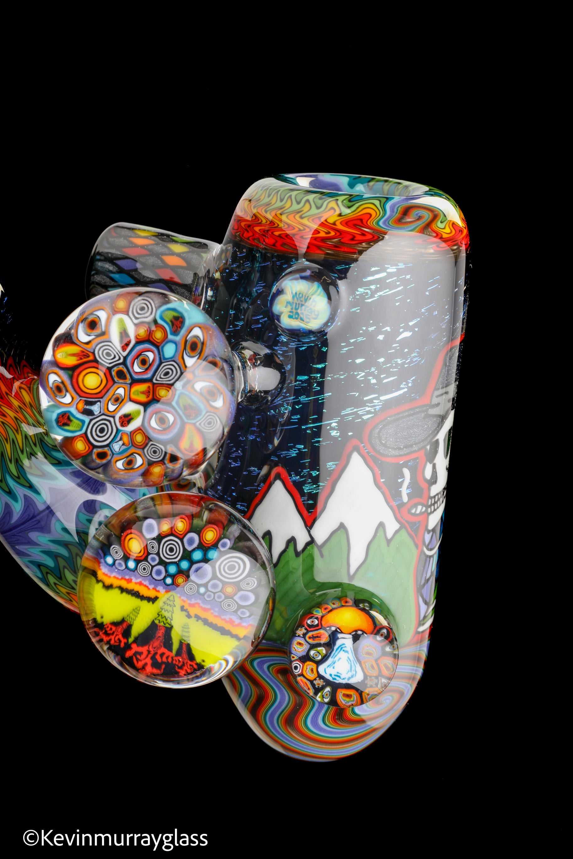 Hand drawn cowboy skull with mountains and dichro starry bacground. UV reactive wig wags, forest theme murrine attachments. Signed with the signature/year murrine.