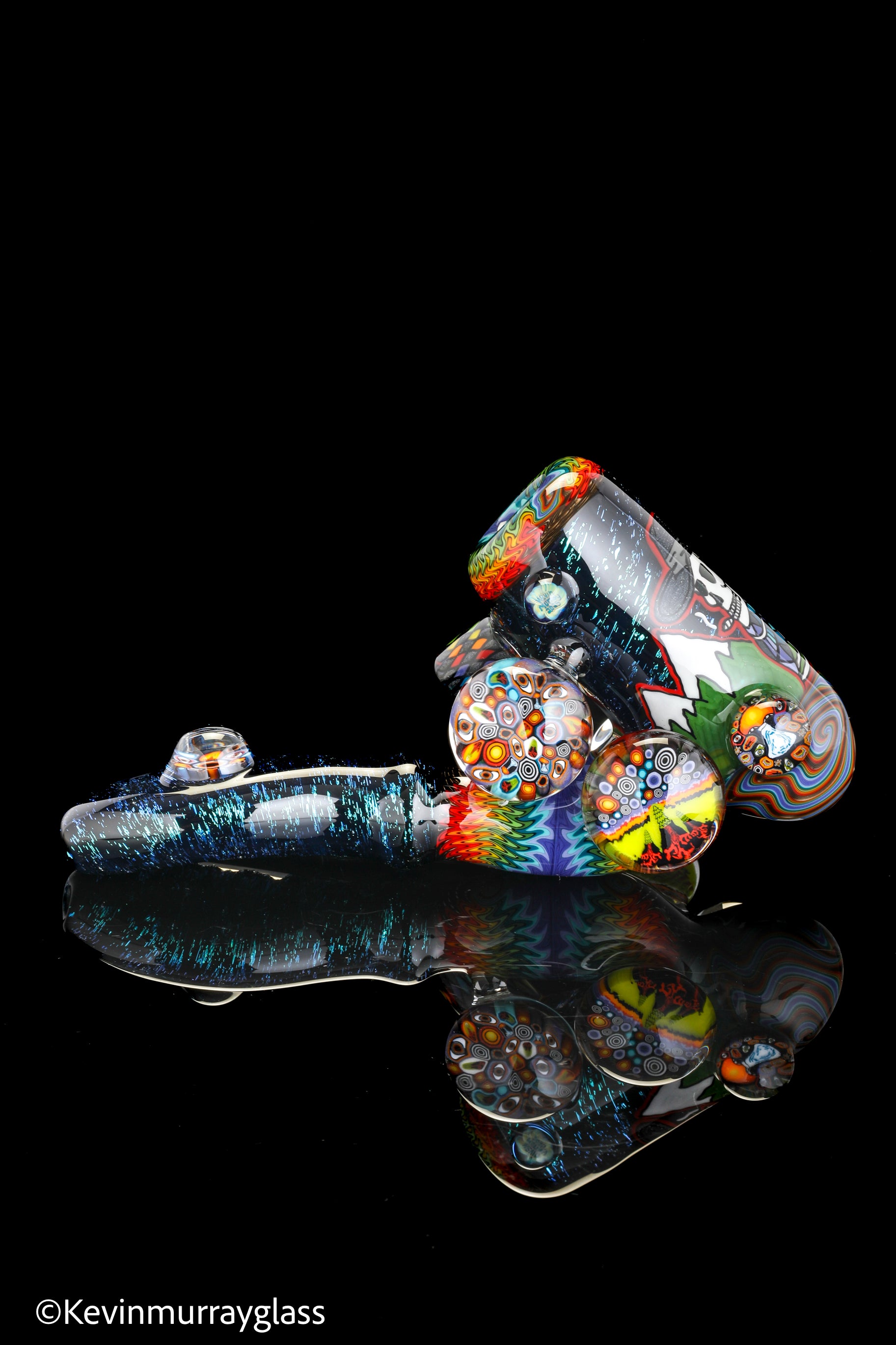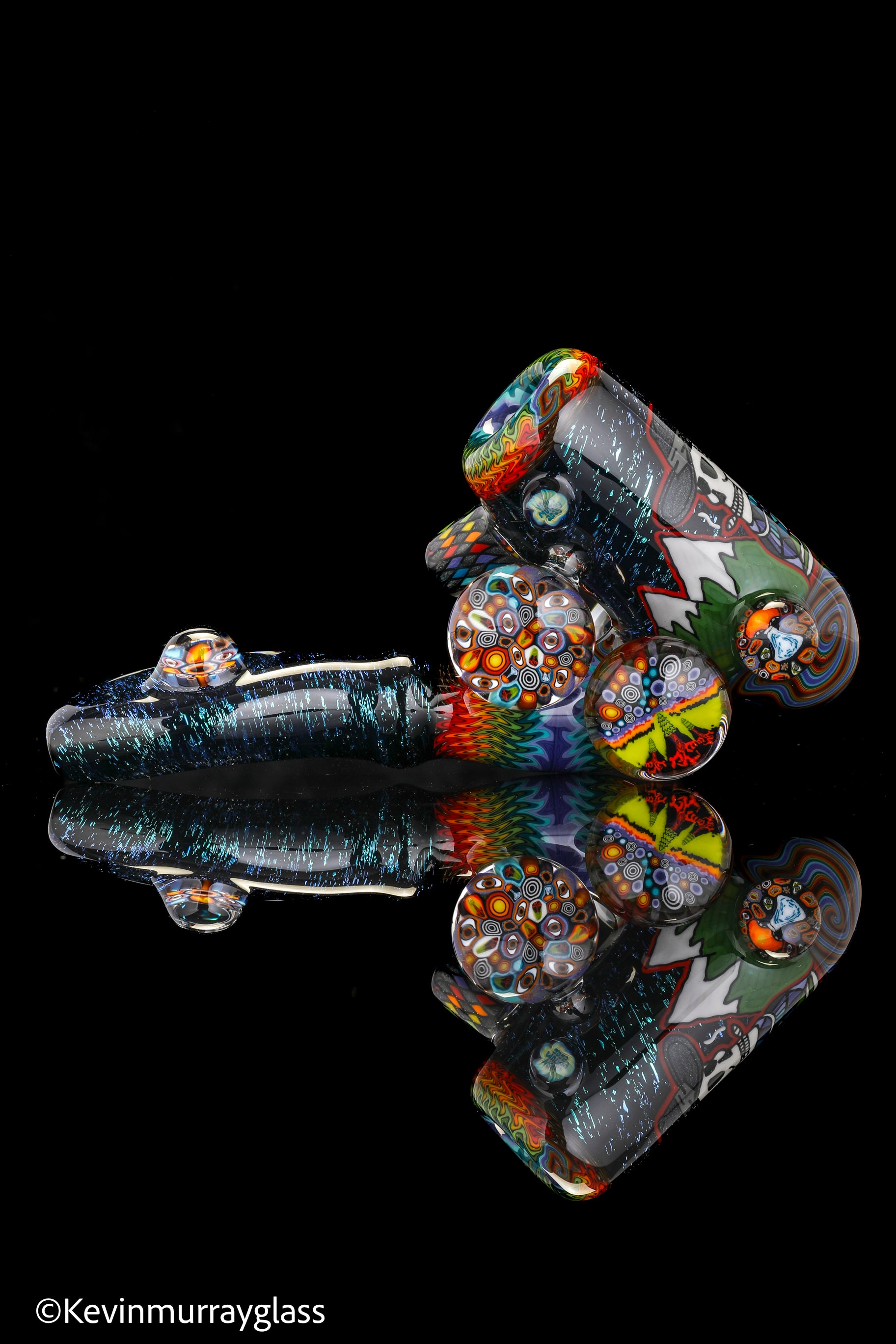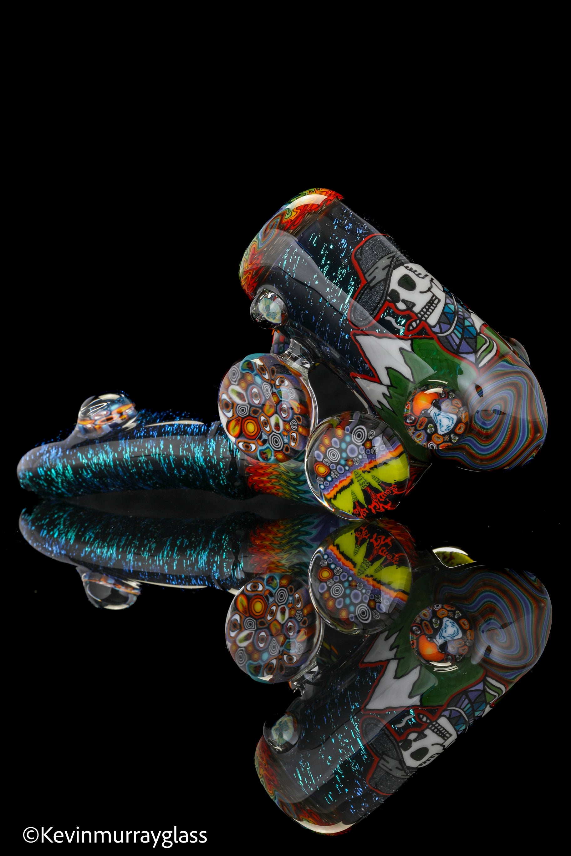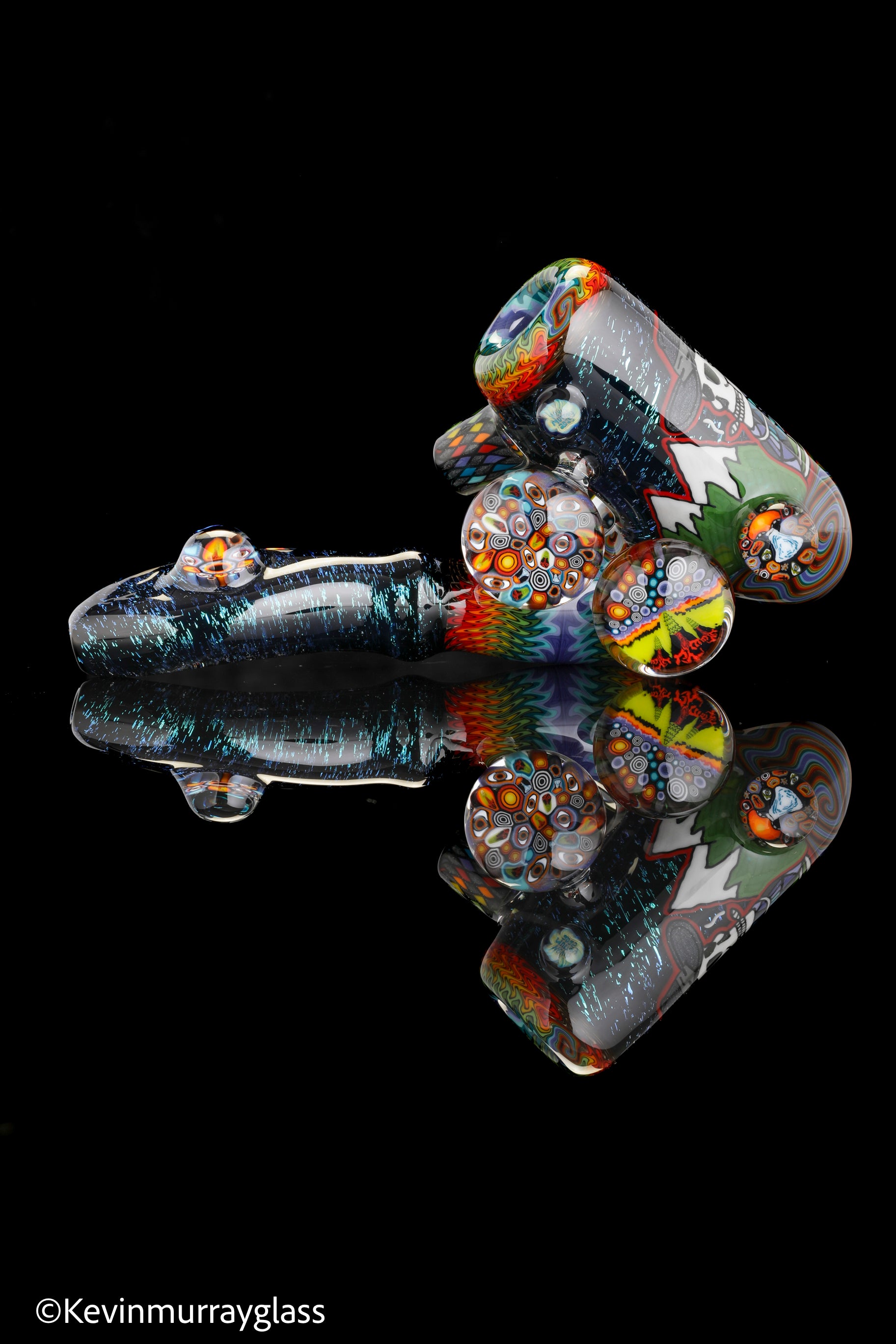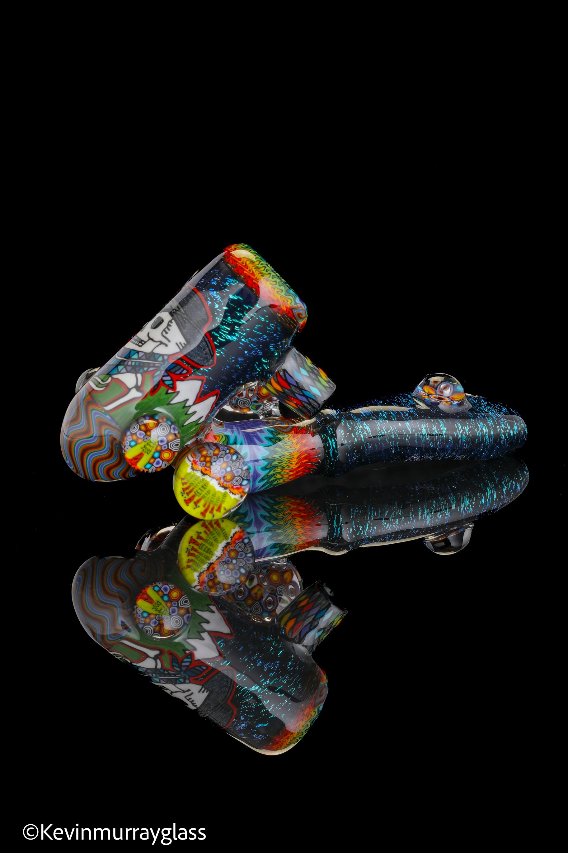 Hand drawn cowboy skull with mountains and dichro starry bacground. UV reactive wig wags, forest theme murrine attachments. Signed with the signature/year murrine.