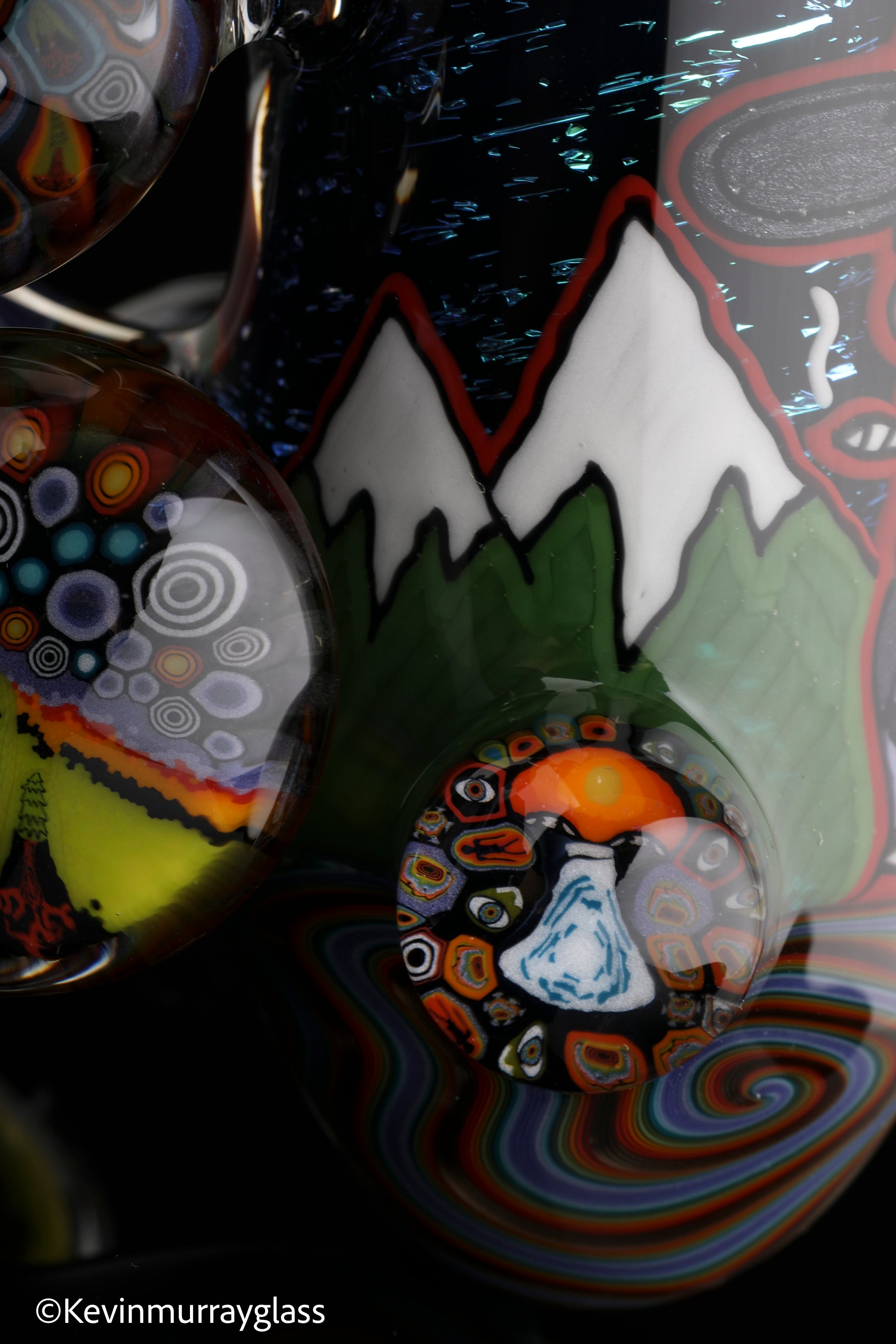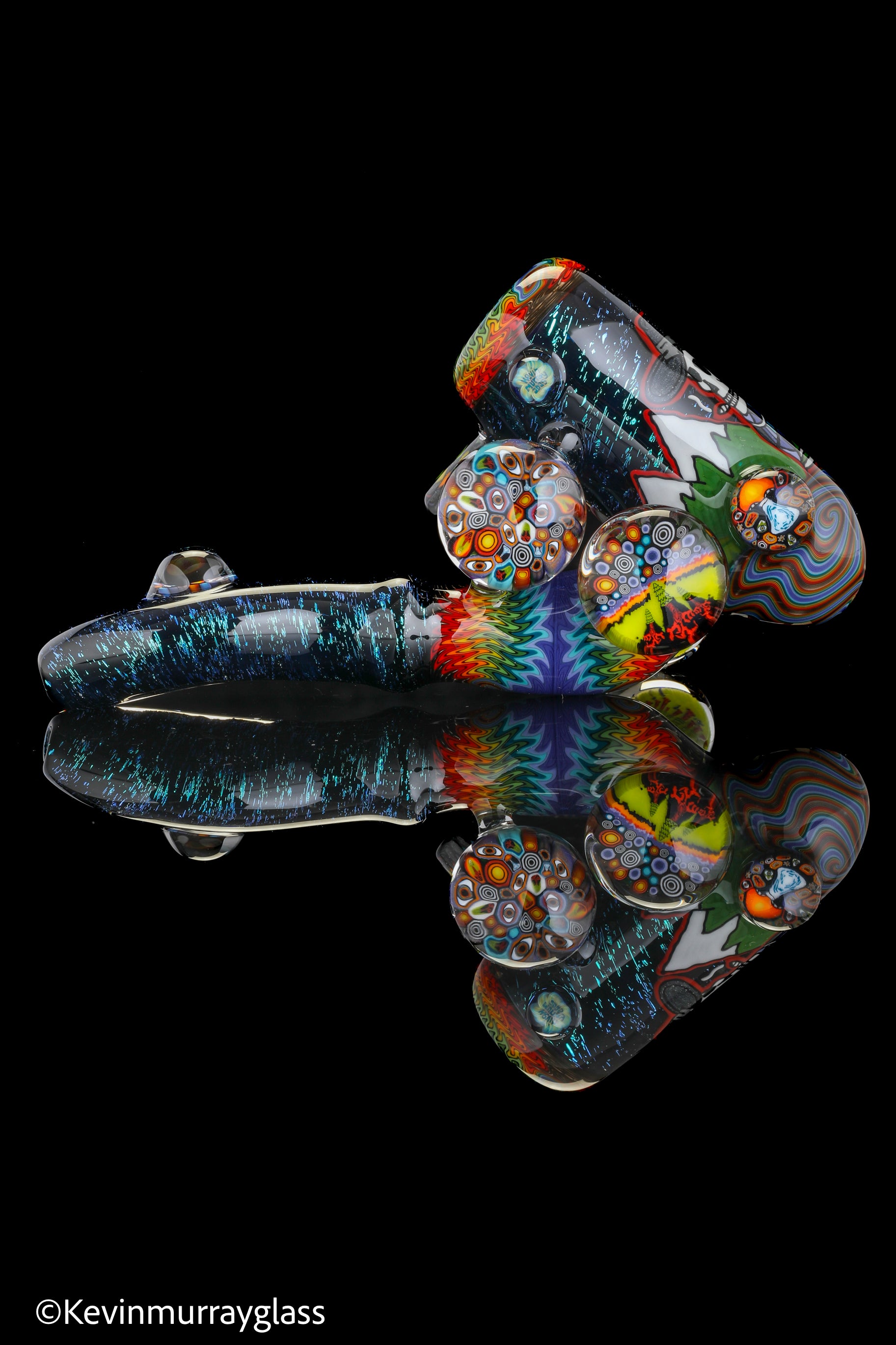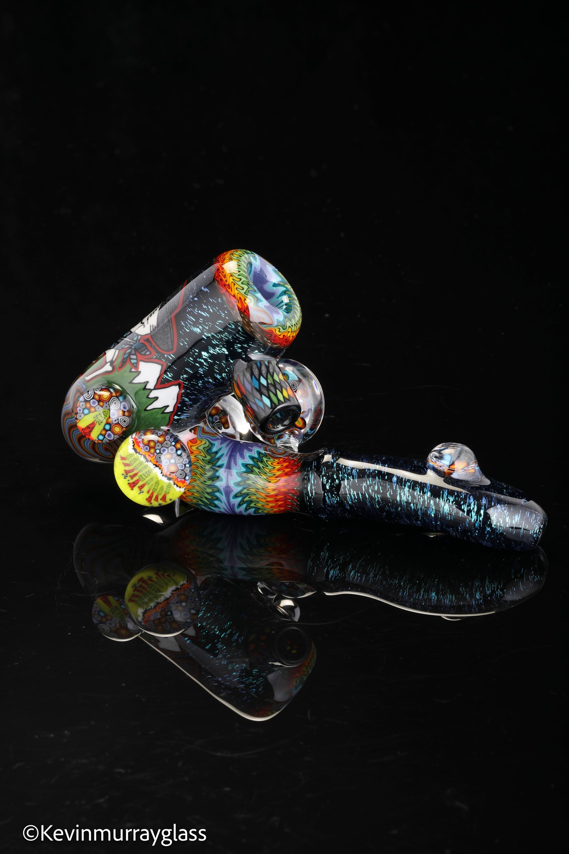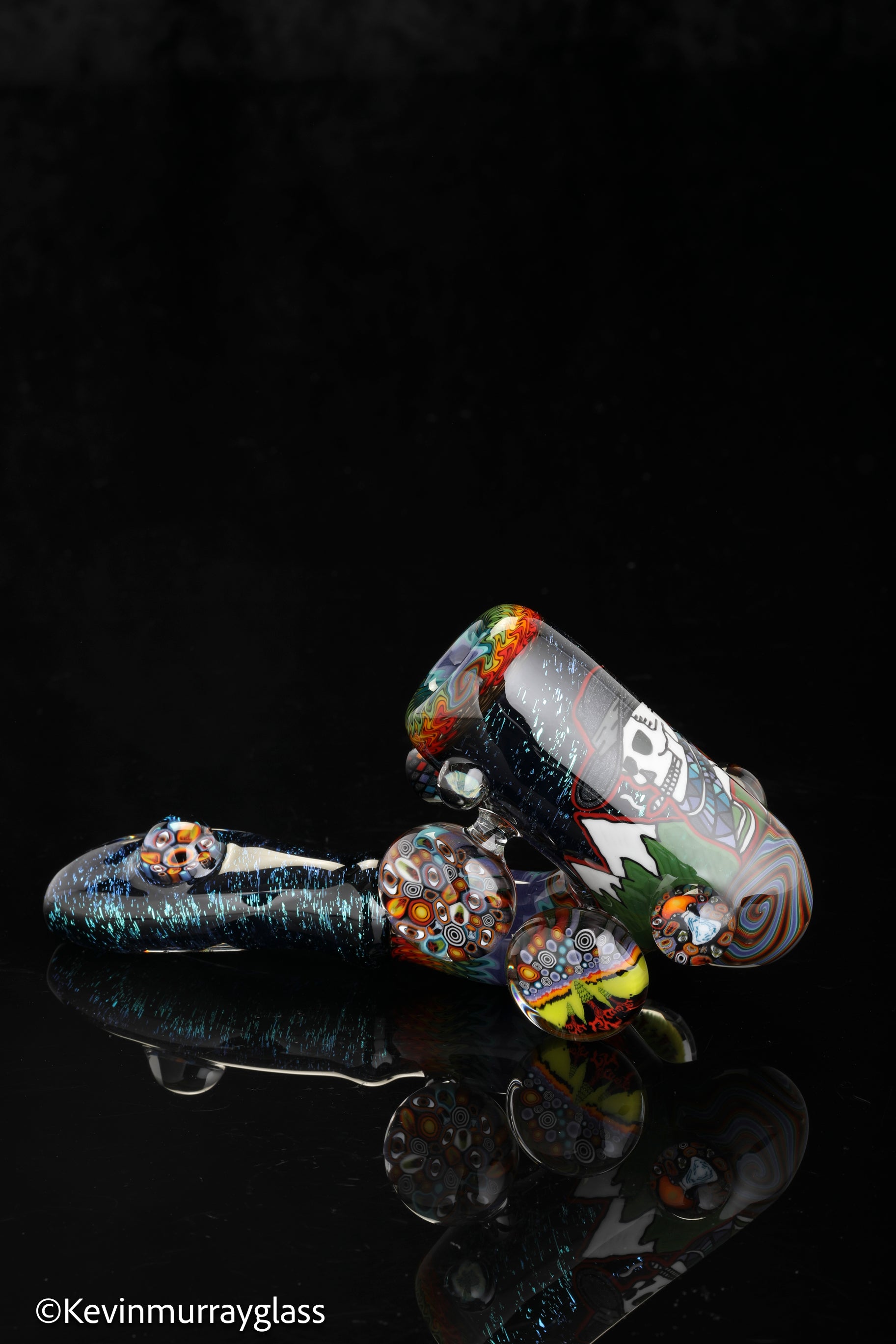 Hand drawn cowboy skull with mountains and dichro starry bacground. UV reactive wig wags, forest theme murrine attachments. Signed with the signature/year murrine.