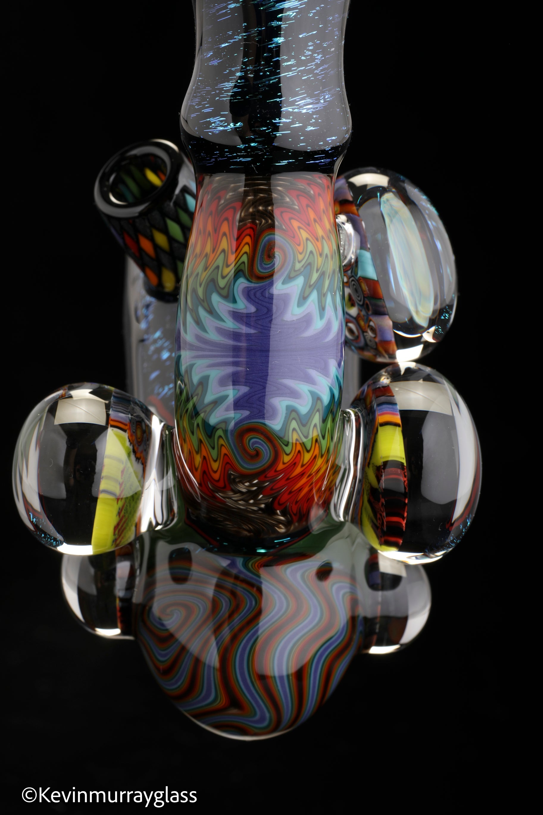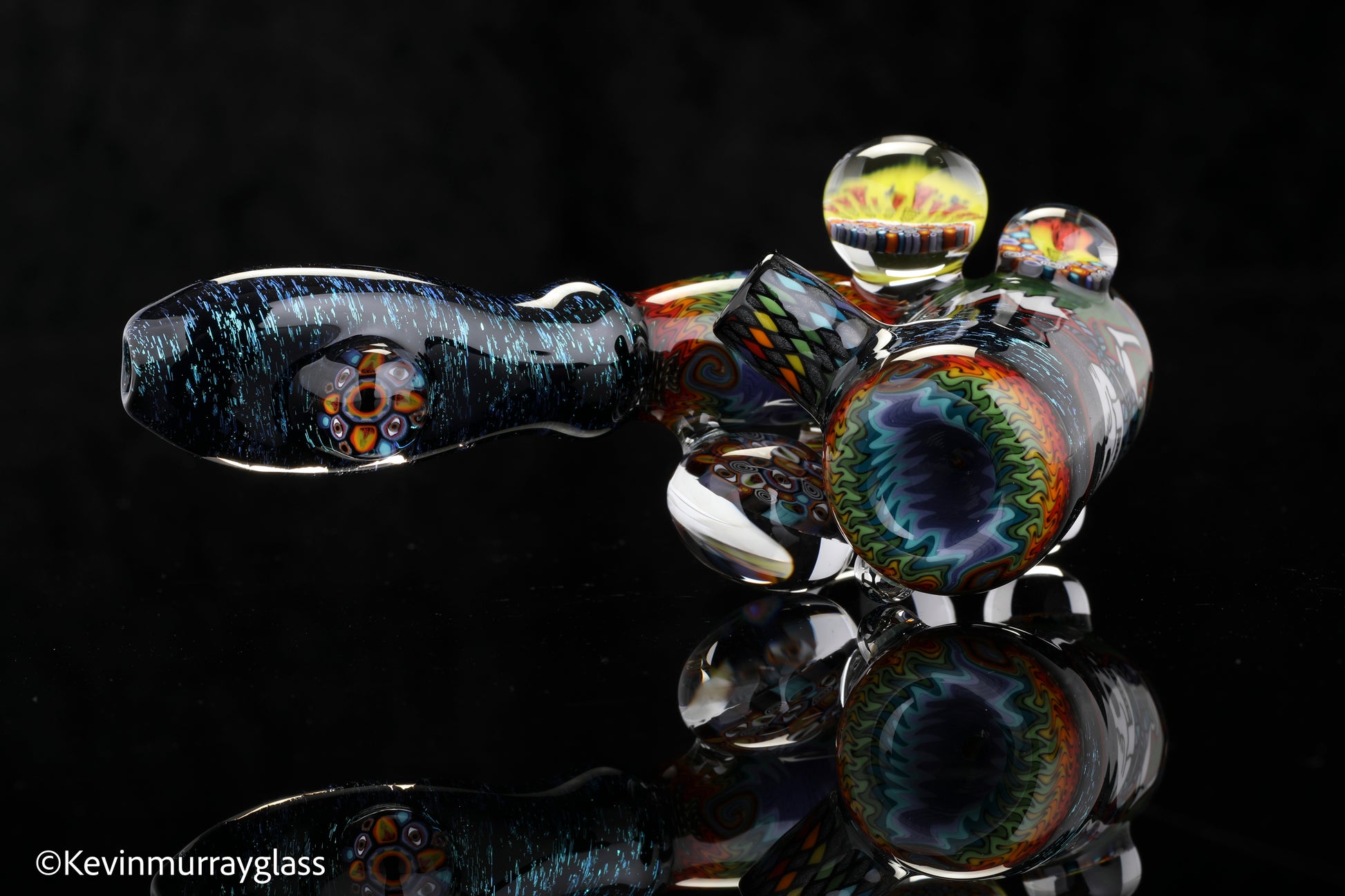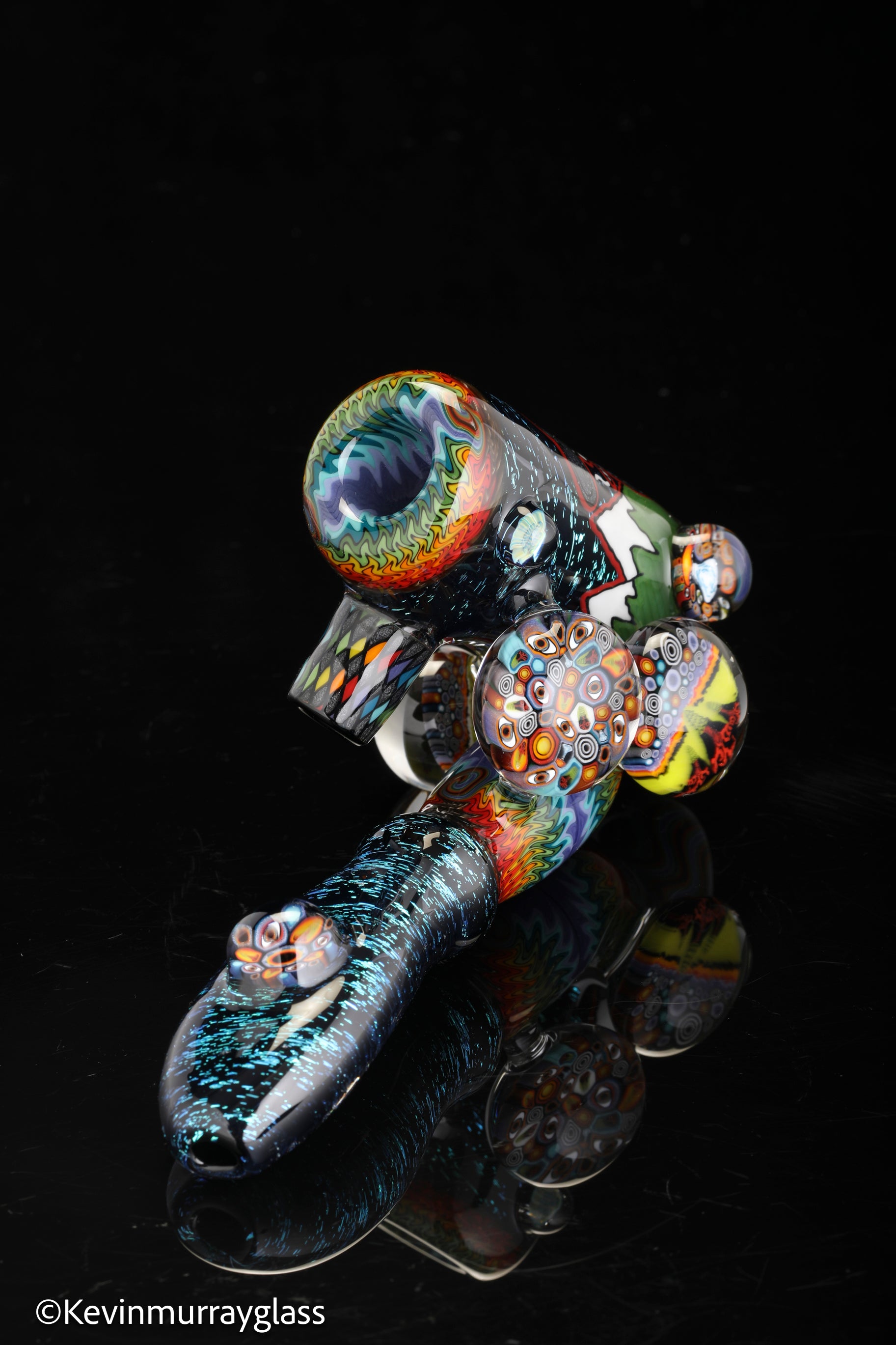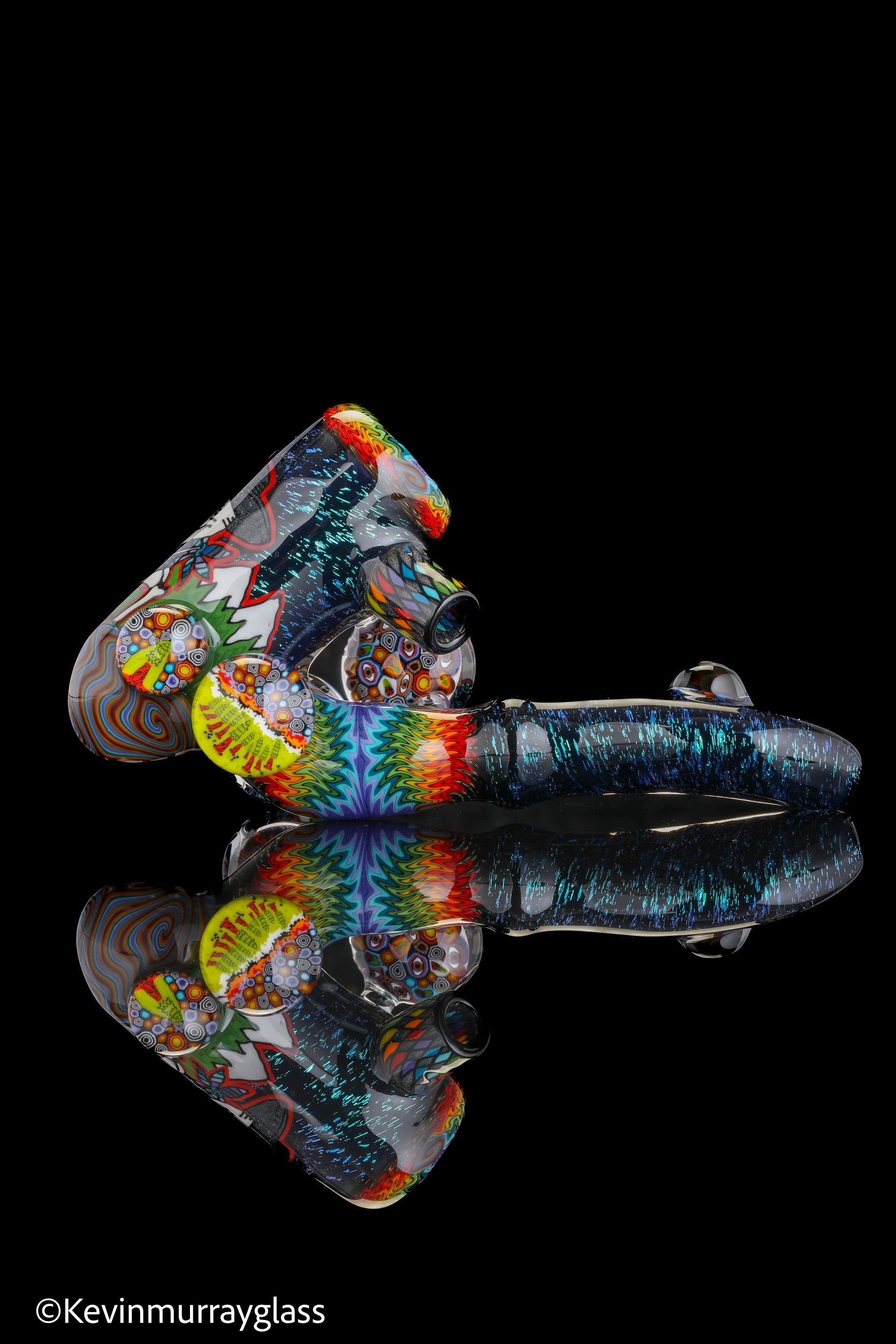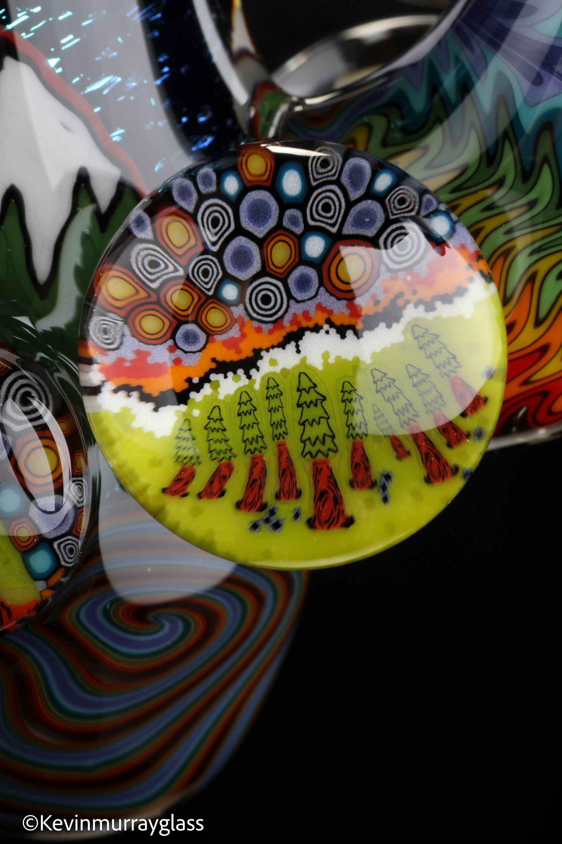 Hand drawn cowboy skull with mountains and dichro starry bacground. UV reactive wig wags, forest theme murrine attachments. Signed with the signature/year murrine.