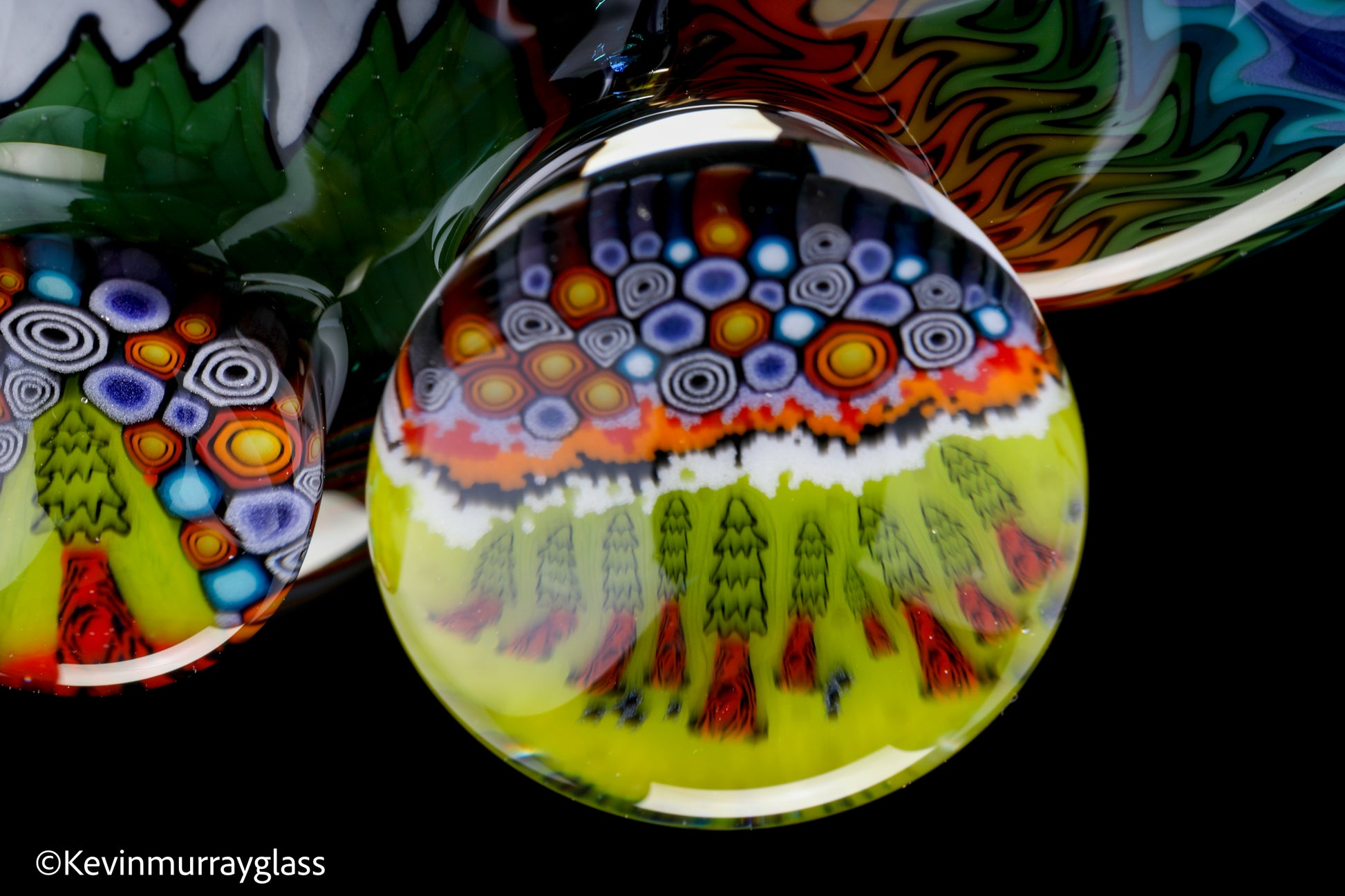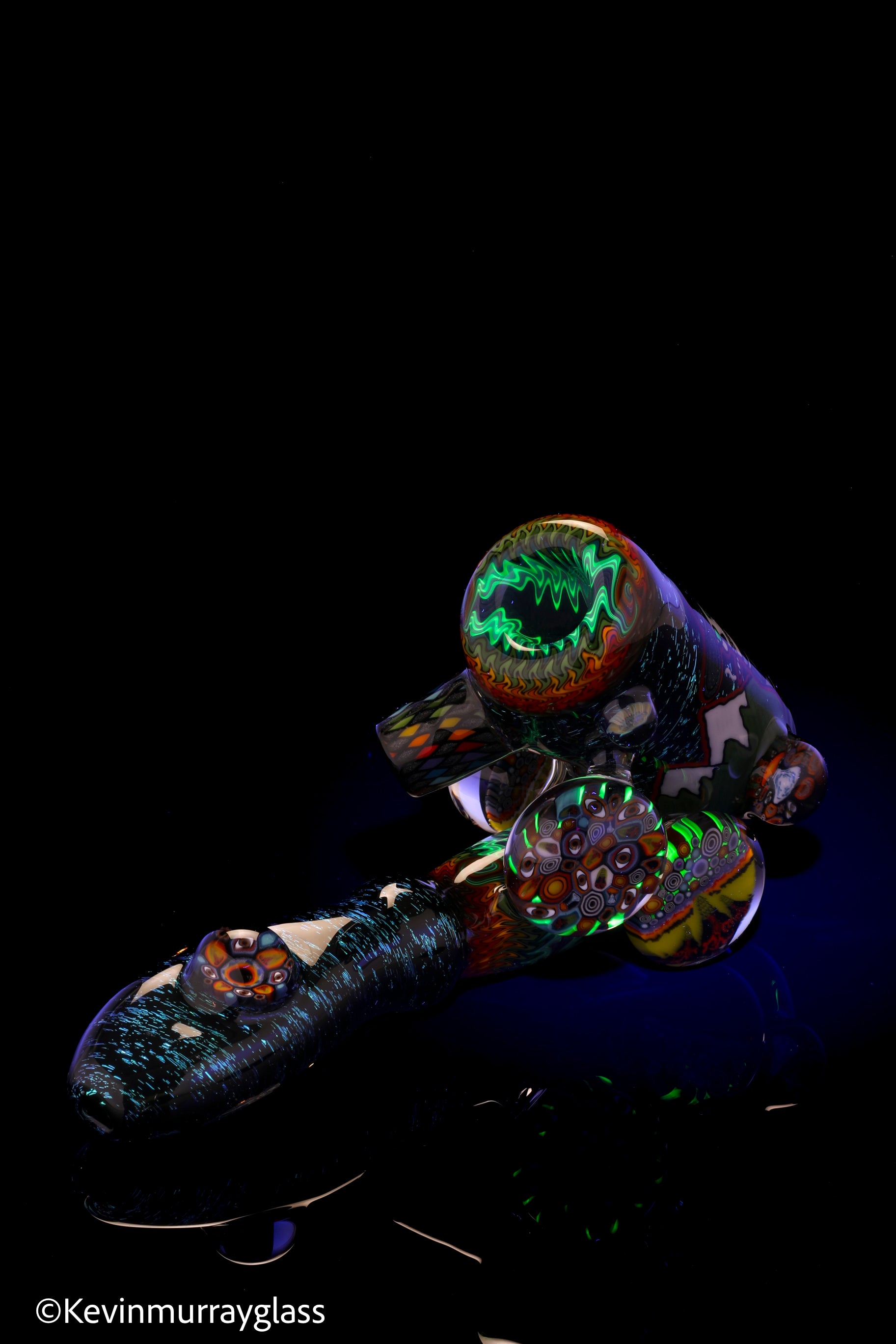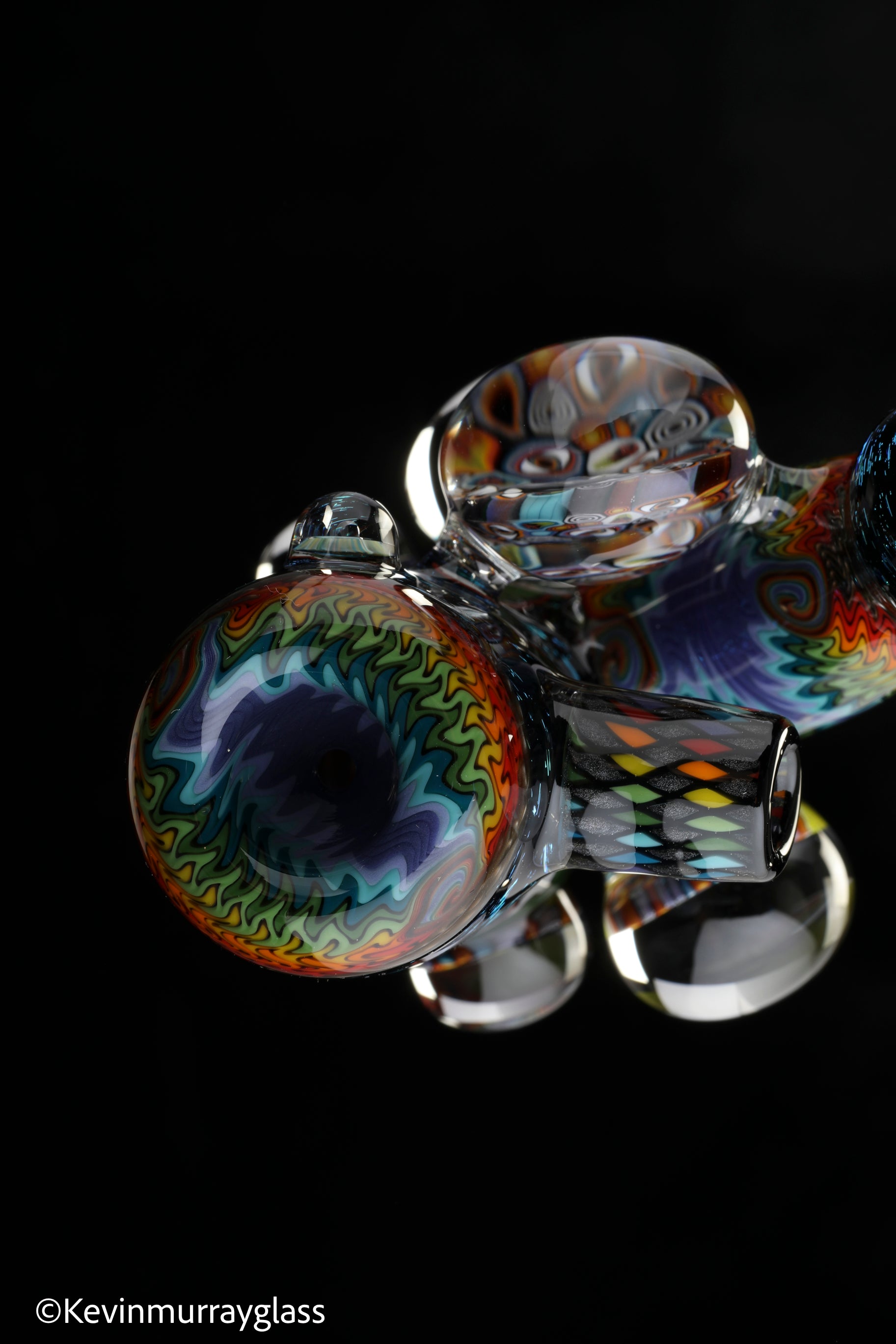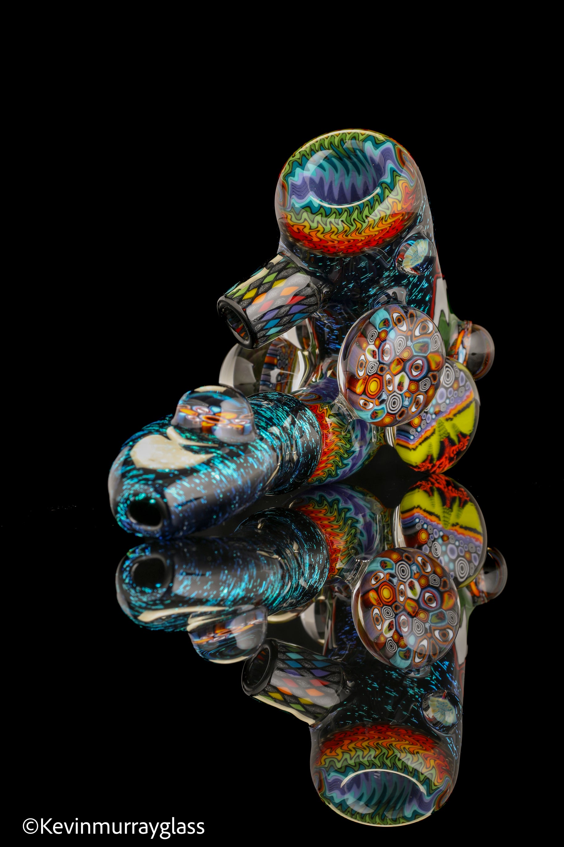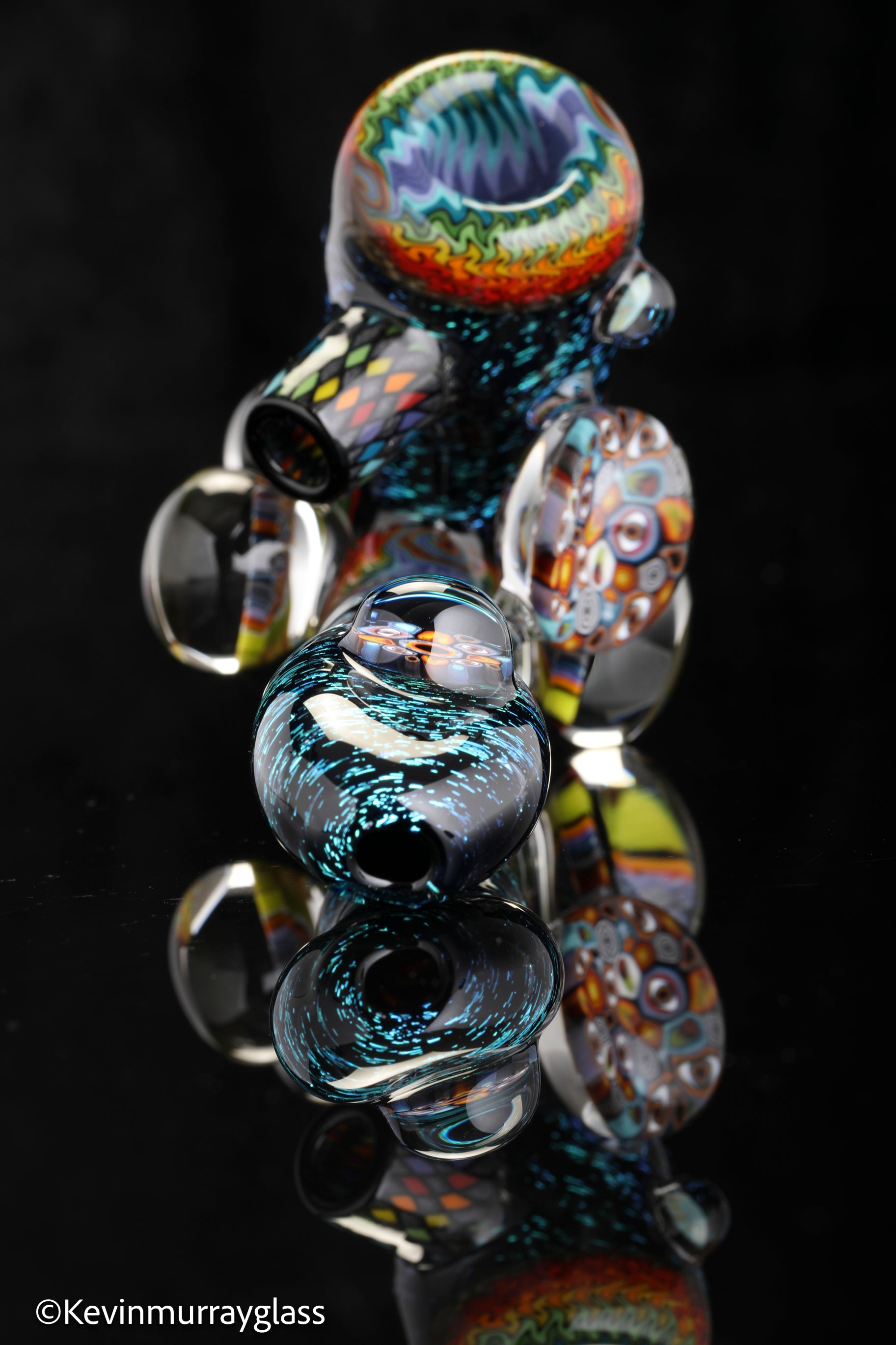 Hand drawn cowboy skull with mountains and dichro starry bacground. UV reactive wig wags, forest theme murrine attachments. Signed with the signature/year murrine.
