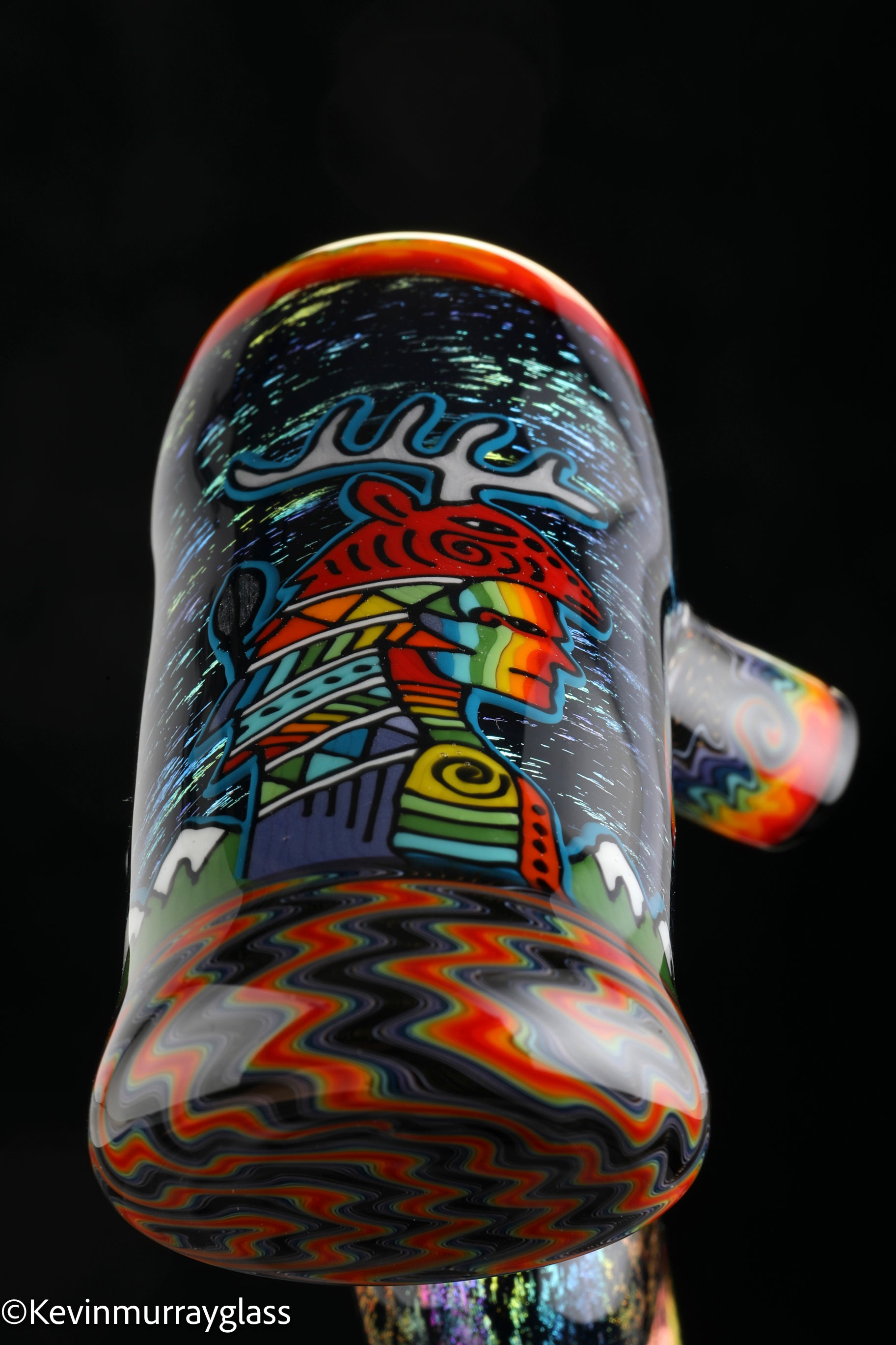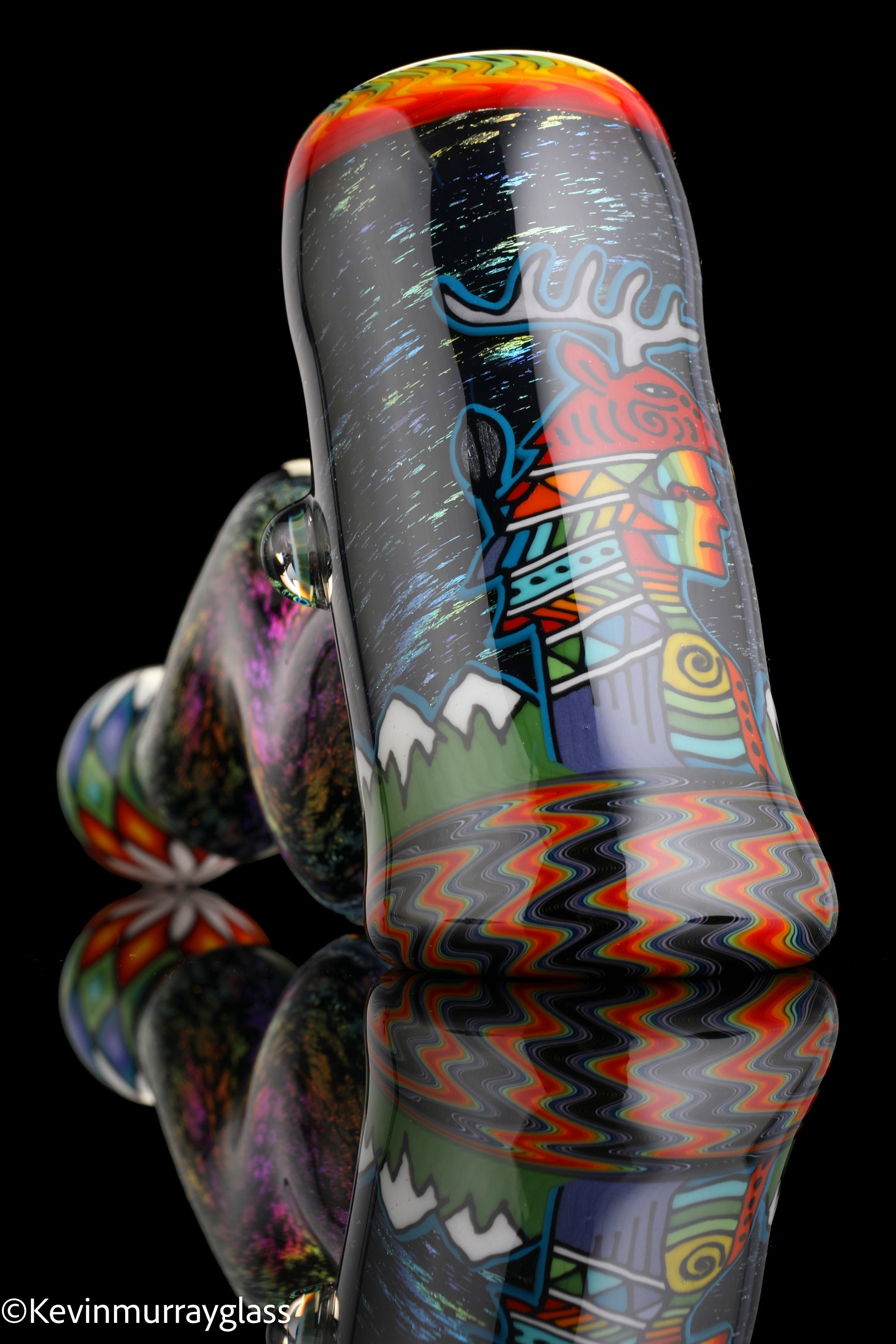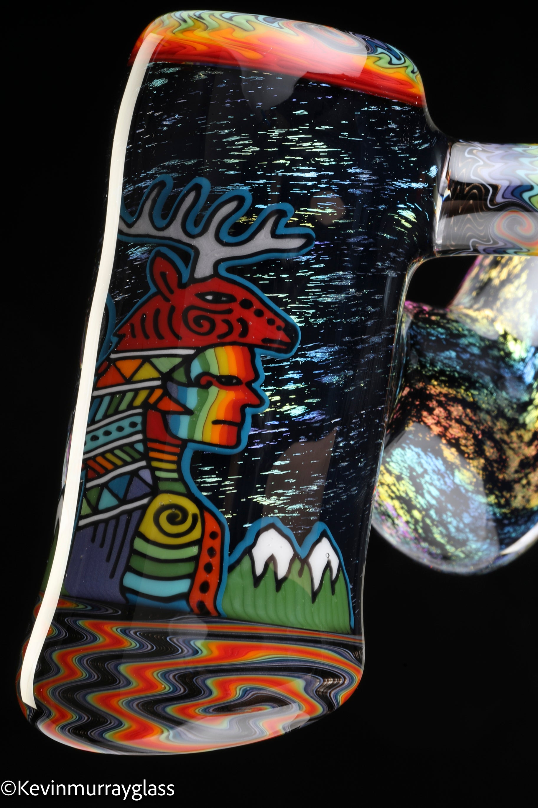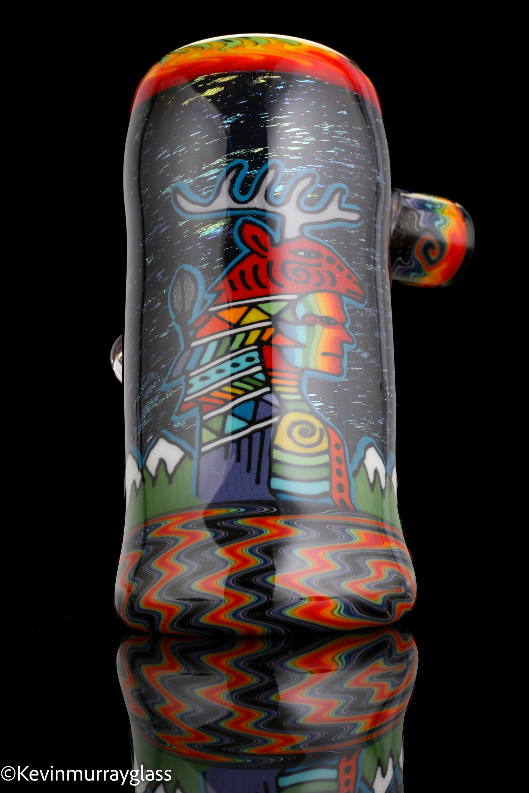 Hammer style dry pipe fully worked with dichro, wig wags, and hand drawn fillacello work. The hunter with deerskin headdress, looks over the mountain backgound with a dichro starry night sky. Signed with the signature/year murrine.