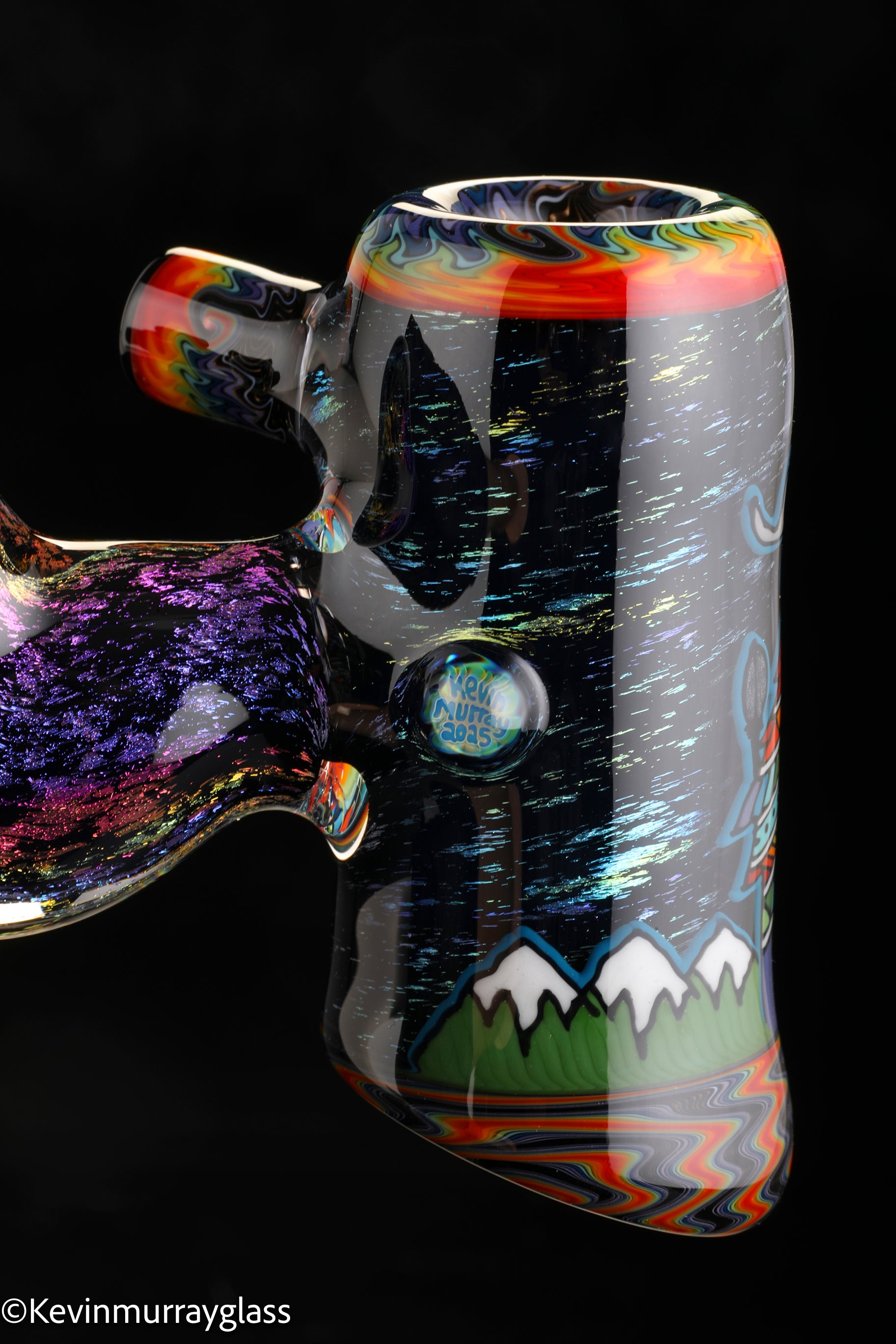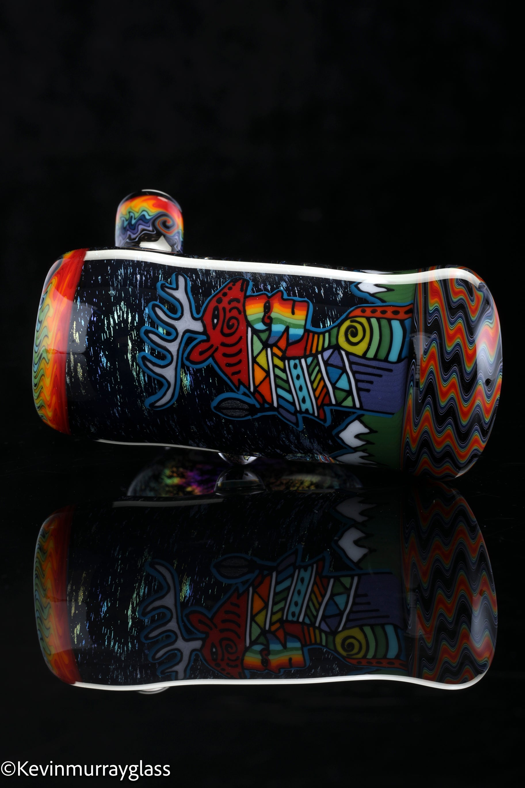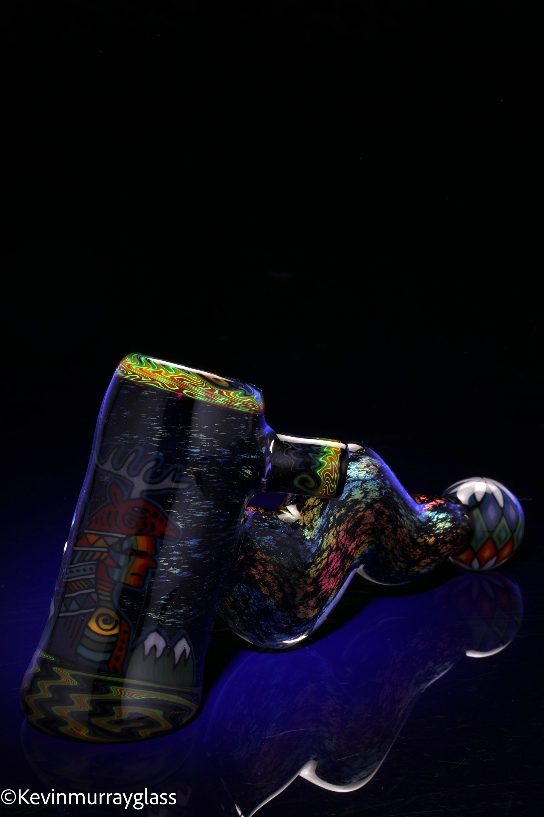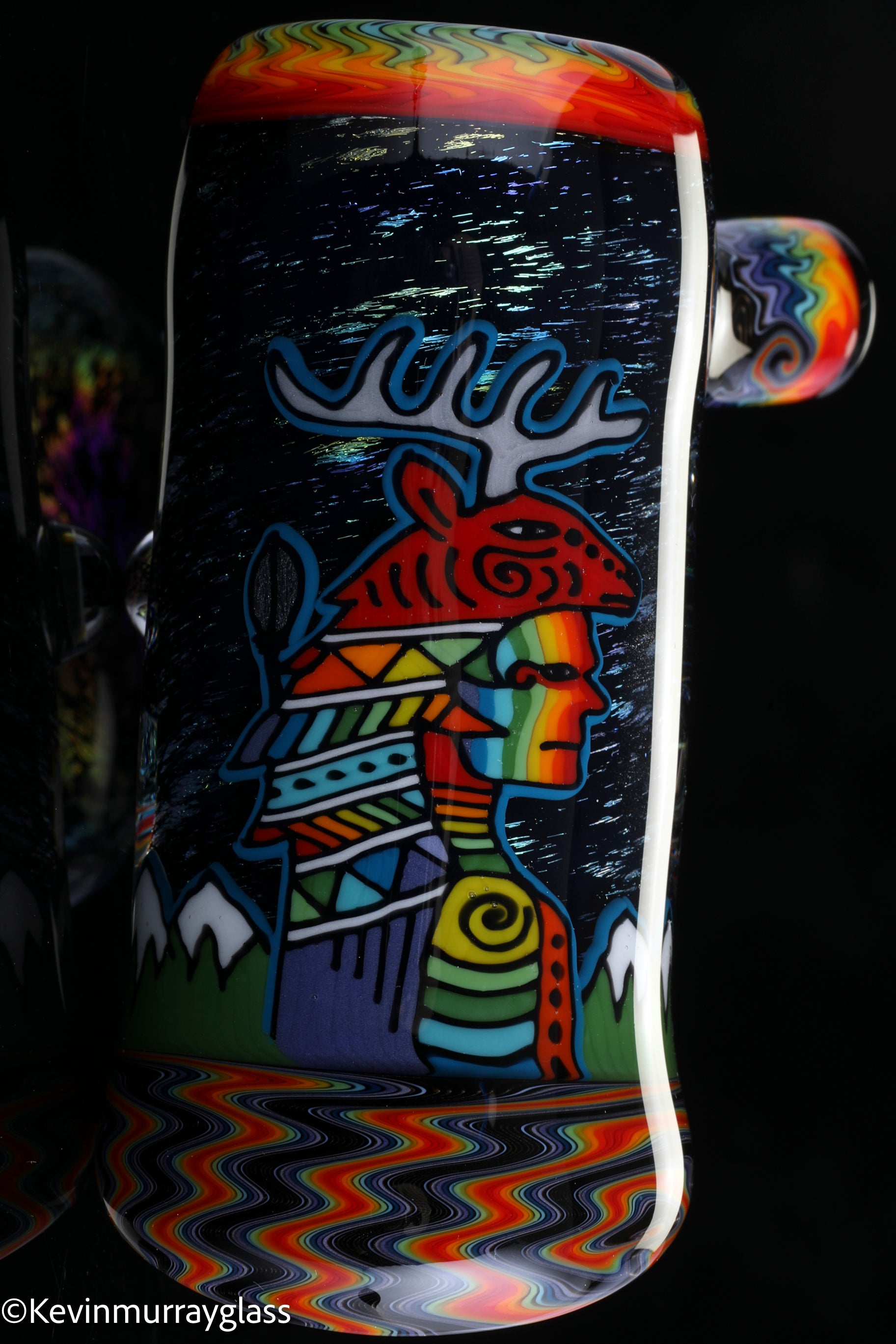 Hammer style dry pipe fully worked with dichro, wig wags, and hand drawn fillacello work. The hunter with deerskin headdress, looks over the mountain backgound with a dichro starry night sky. Signed with the signature/year murrine.