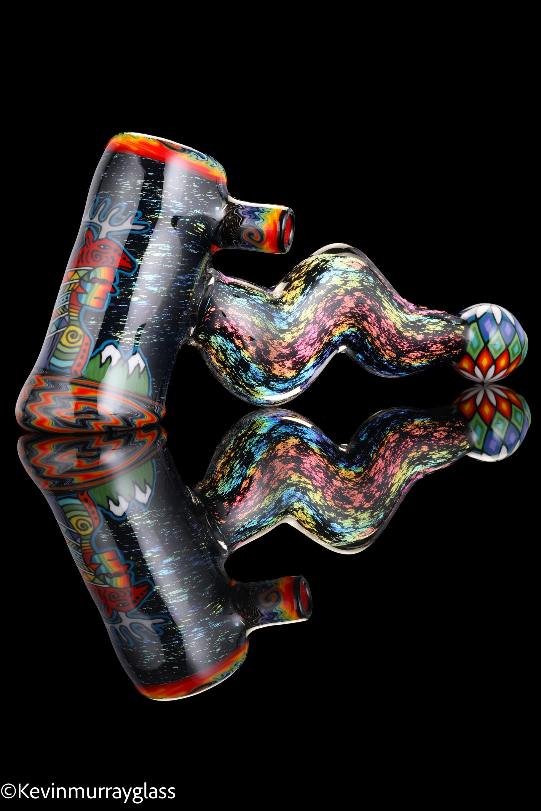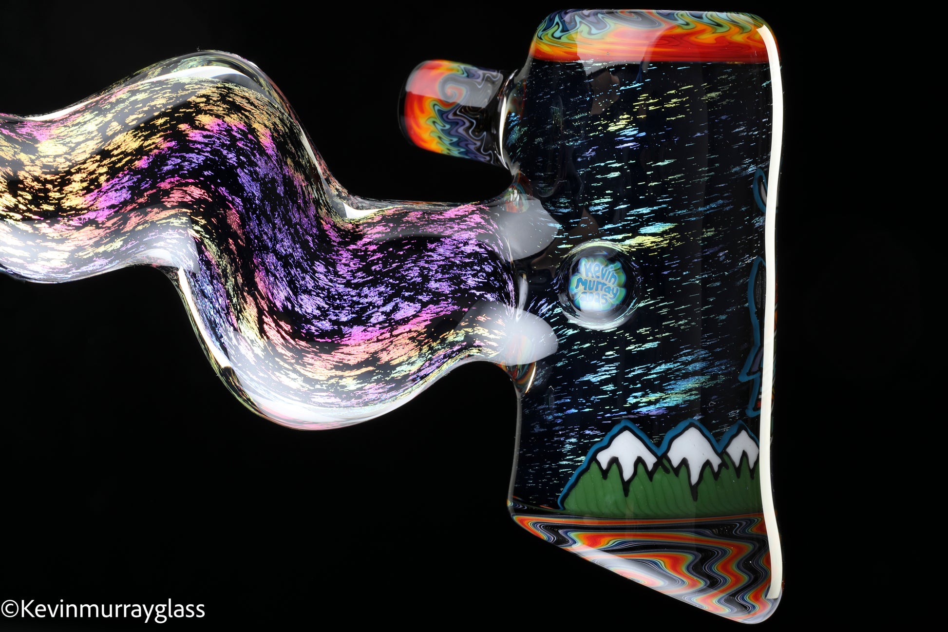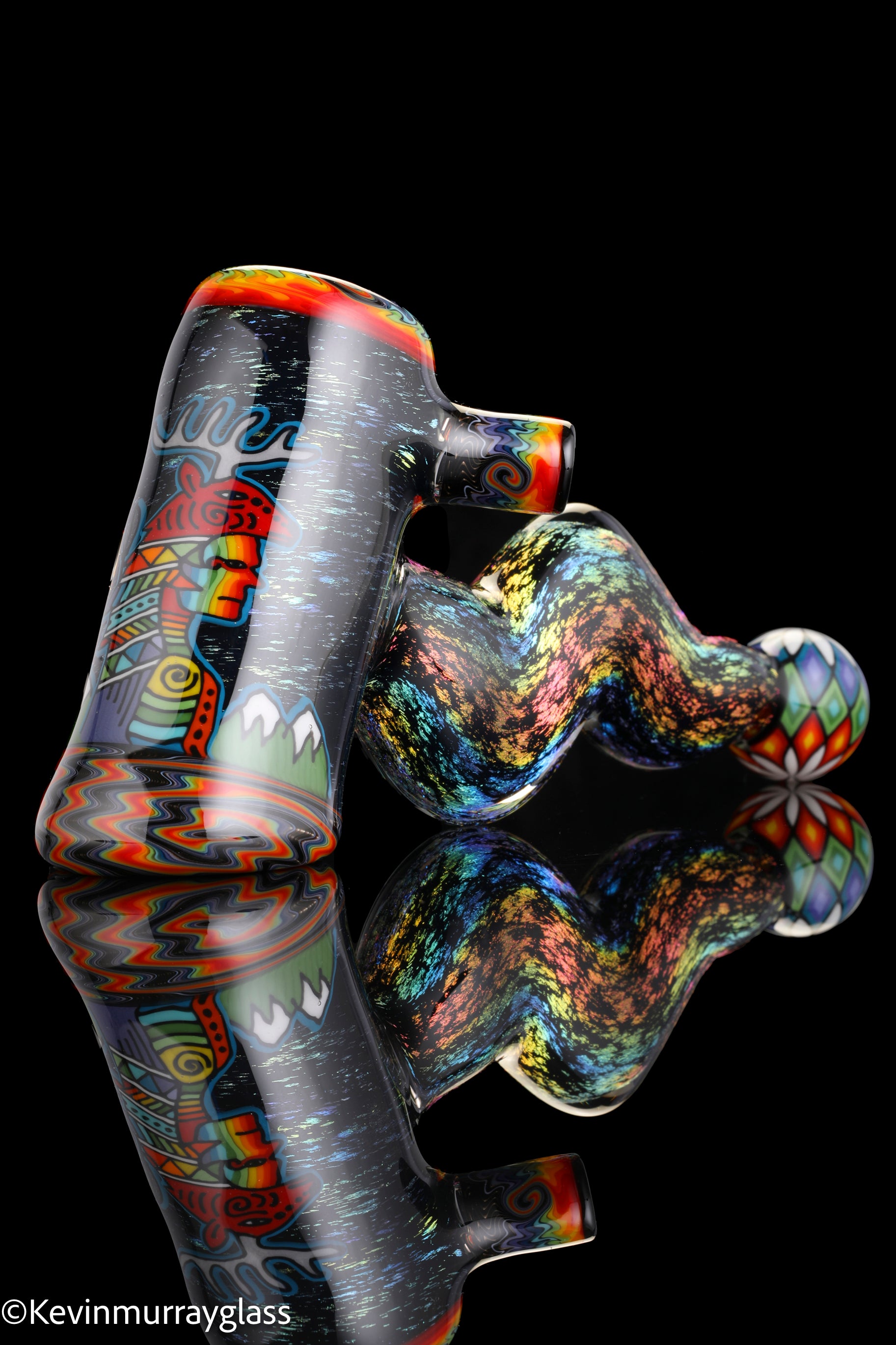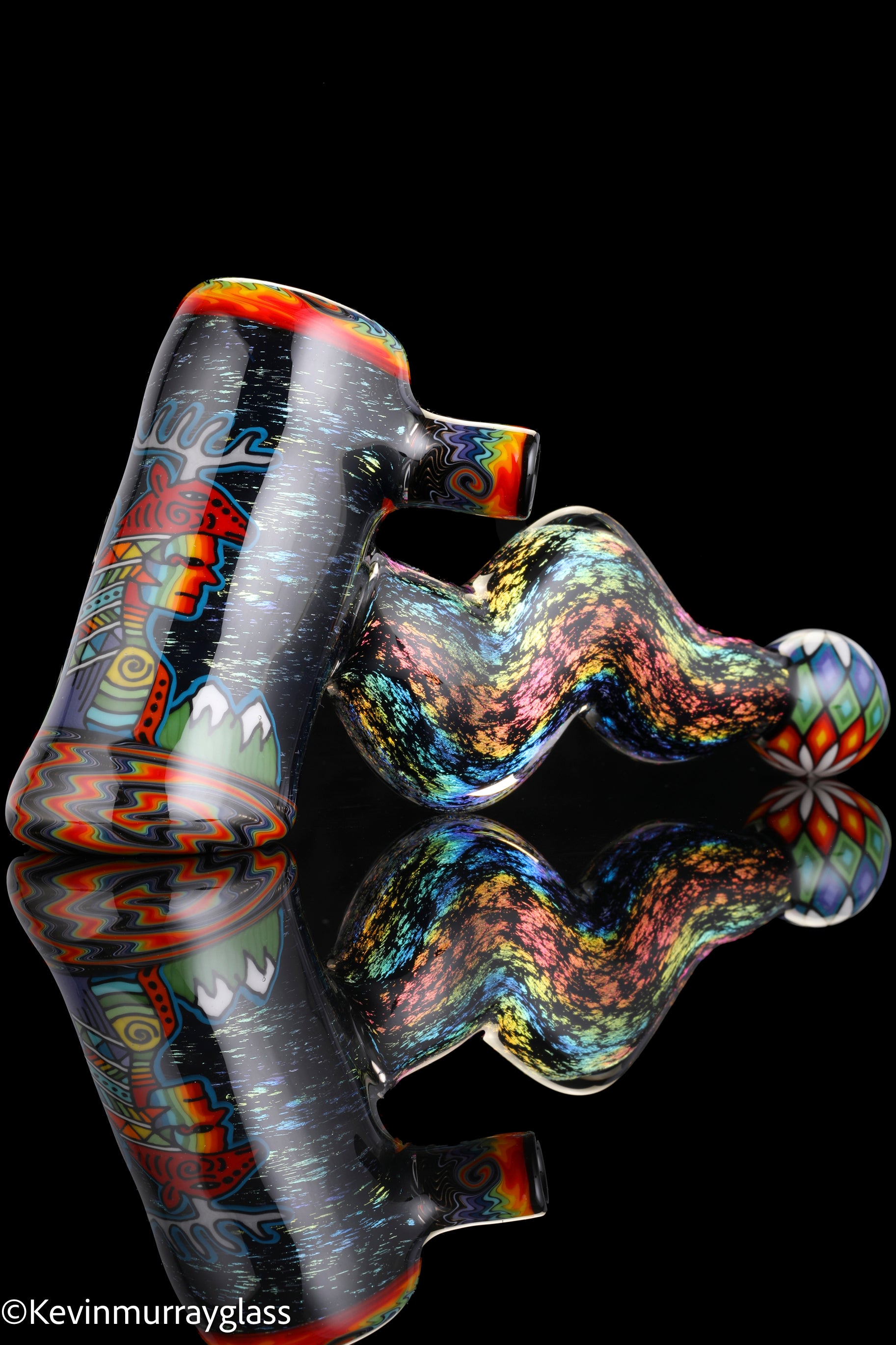 Hammer style dry pipe fully worked with dichro, wig wags, and hand drawn fillacello work. The hunter with deerskin headdress, looks over the mountain backgound with a dichro starry night sky. Signed with the signature/year murrine.