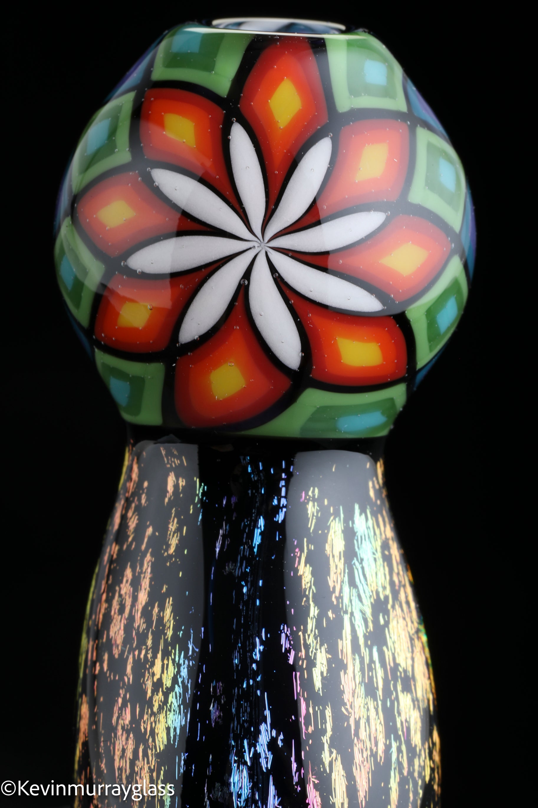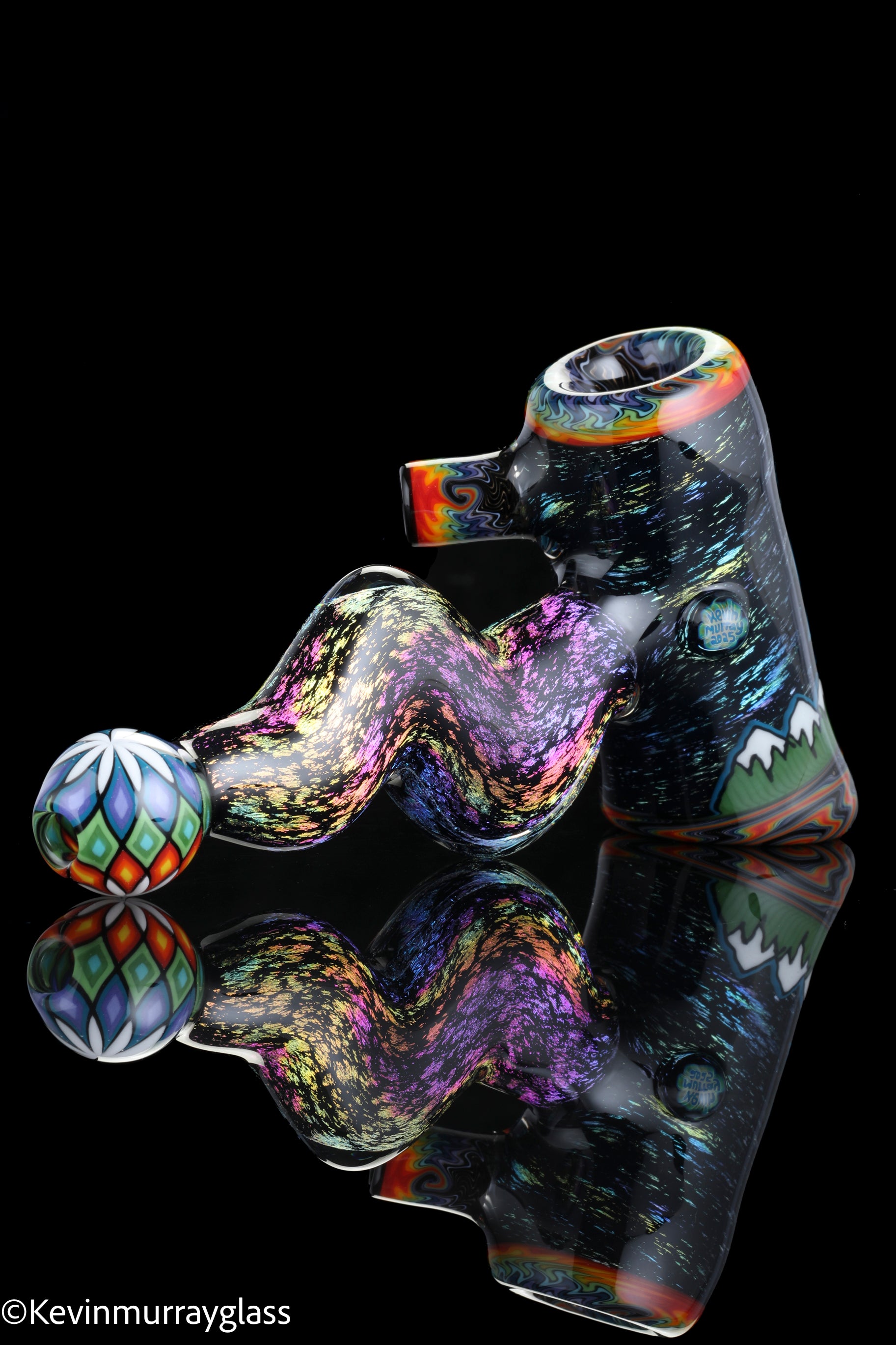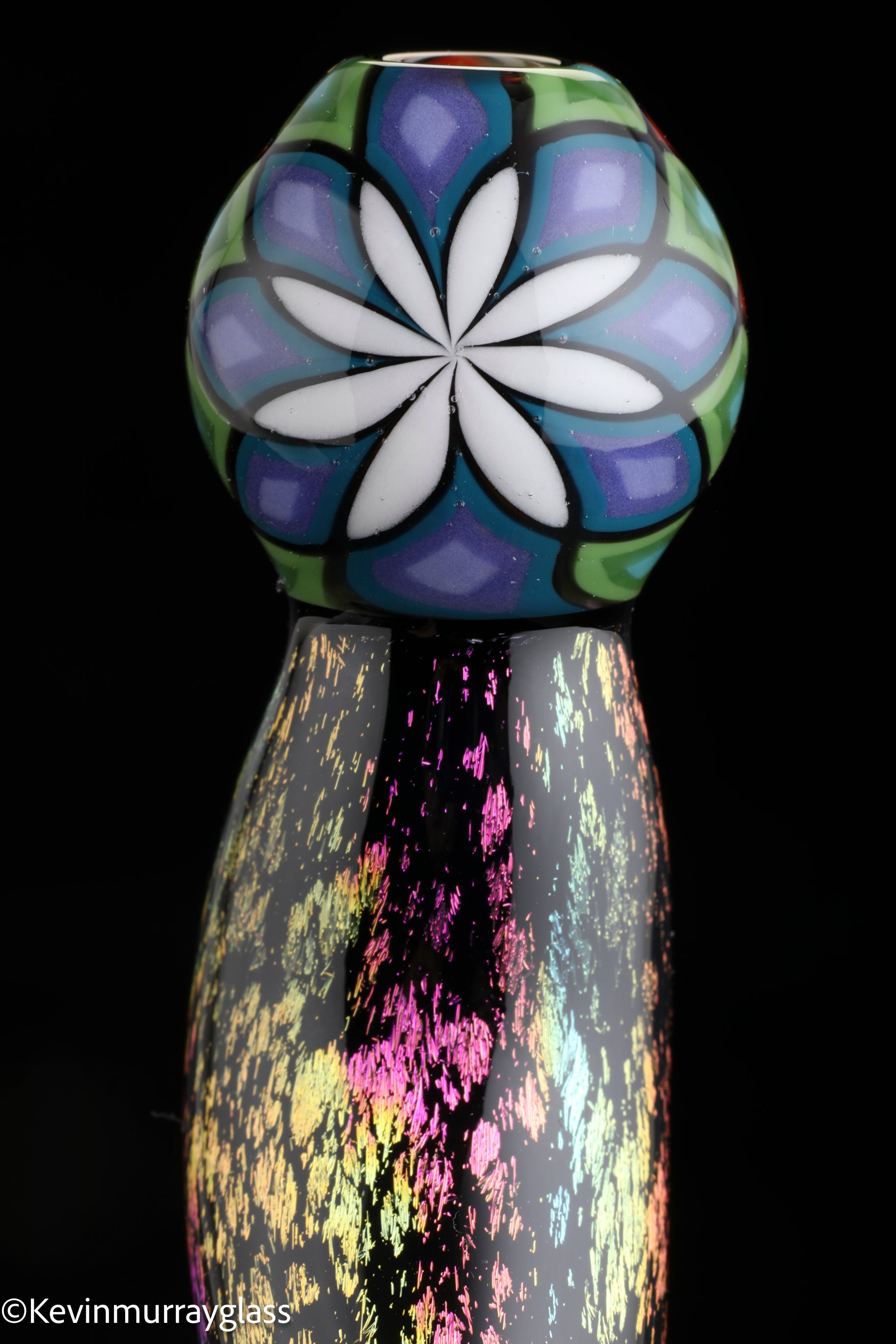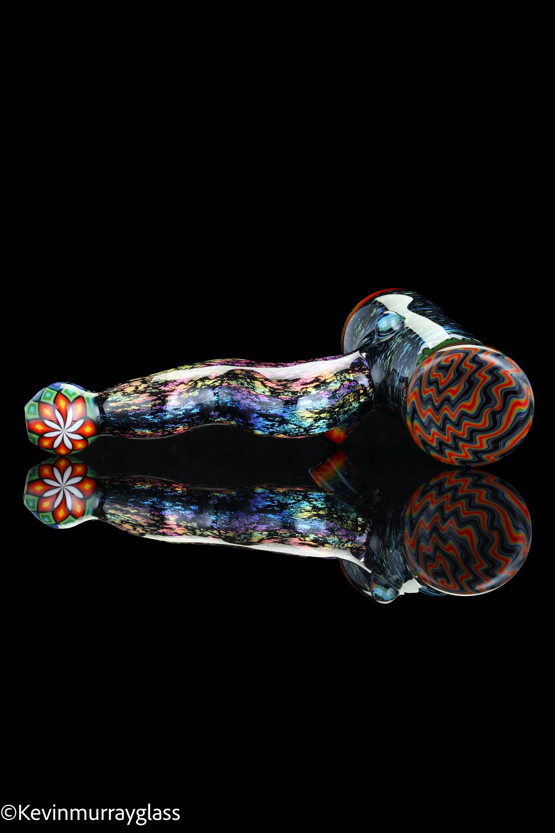 Hammer style dry pipe fully worked with dichro, wig wags, and hand drawn fillacello work. The hunter with deerskin headdress, looks over the mountain backgound with a dichro starry night sky. Signed with the signature/year murrine.