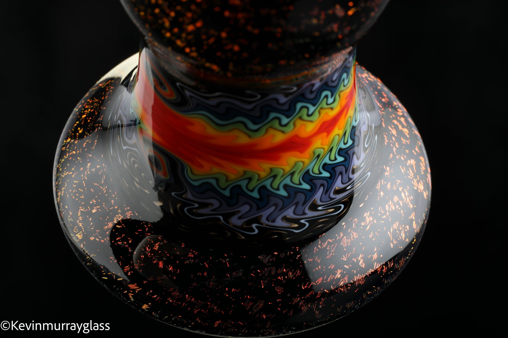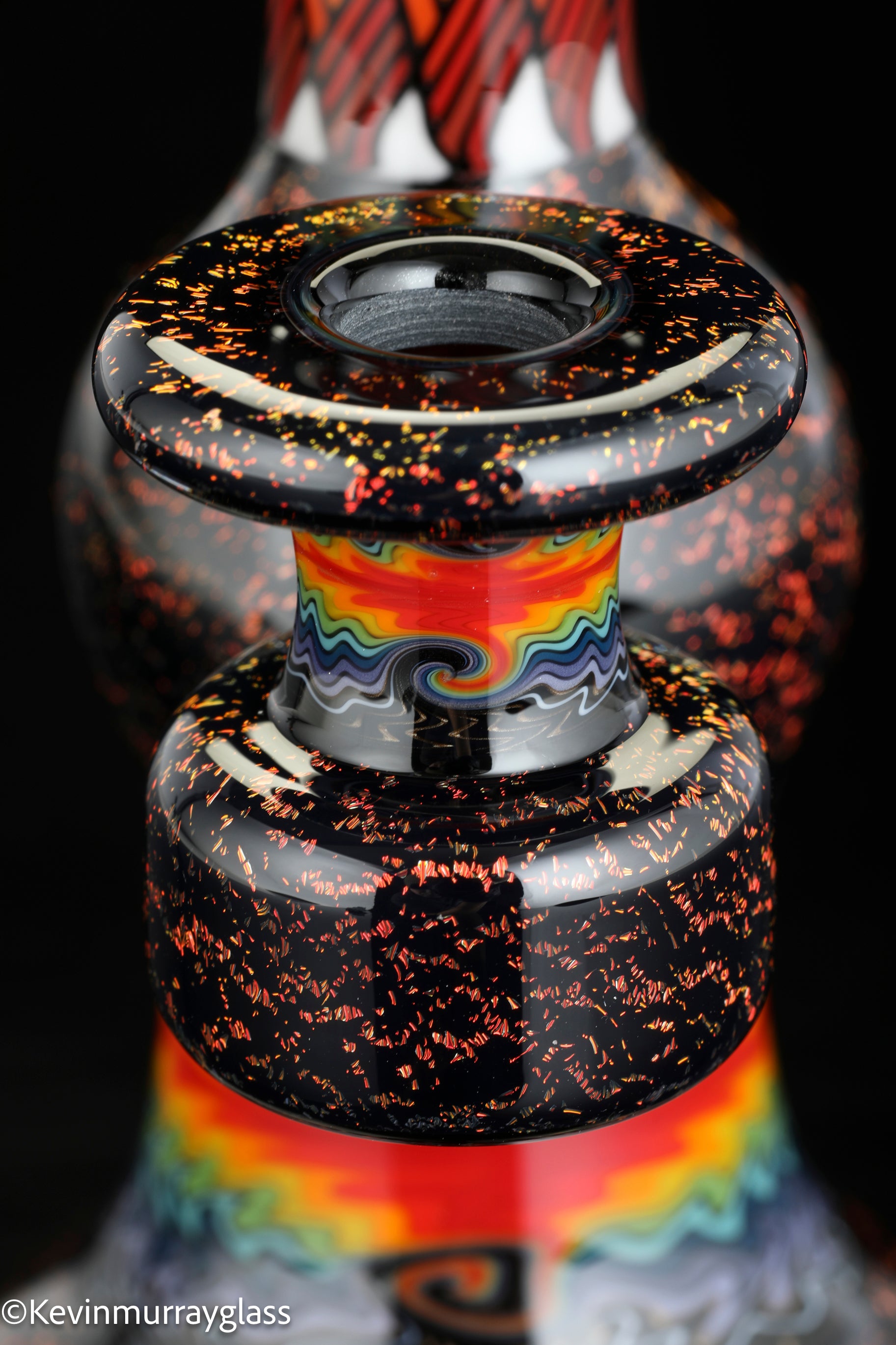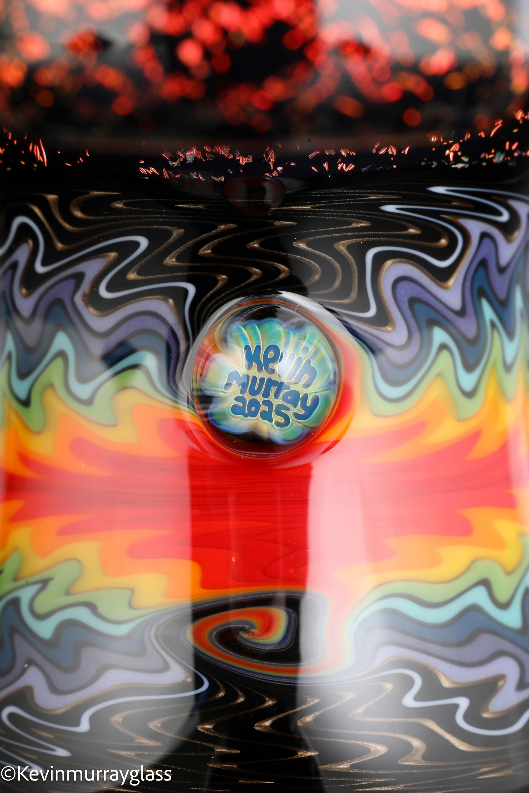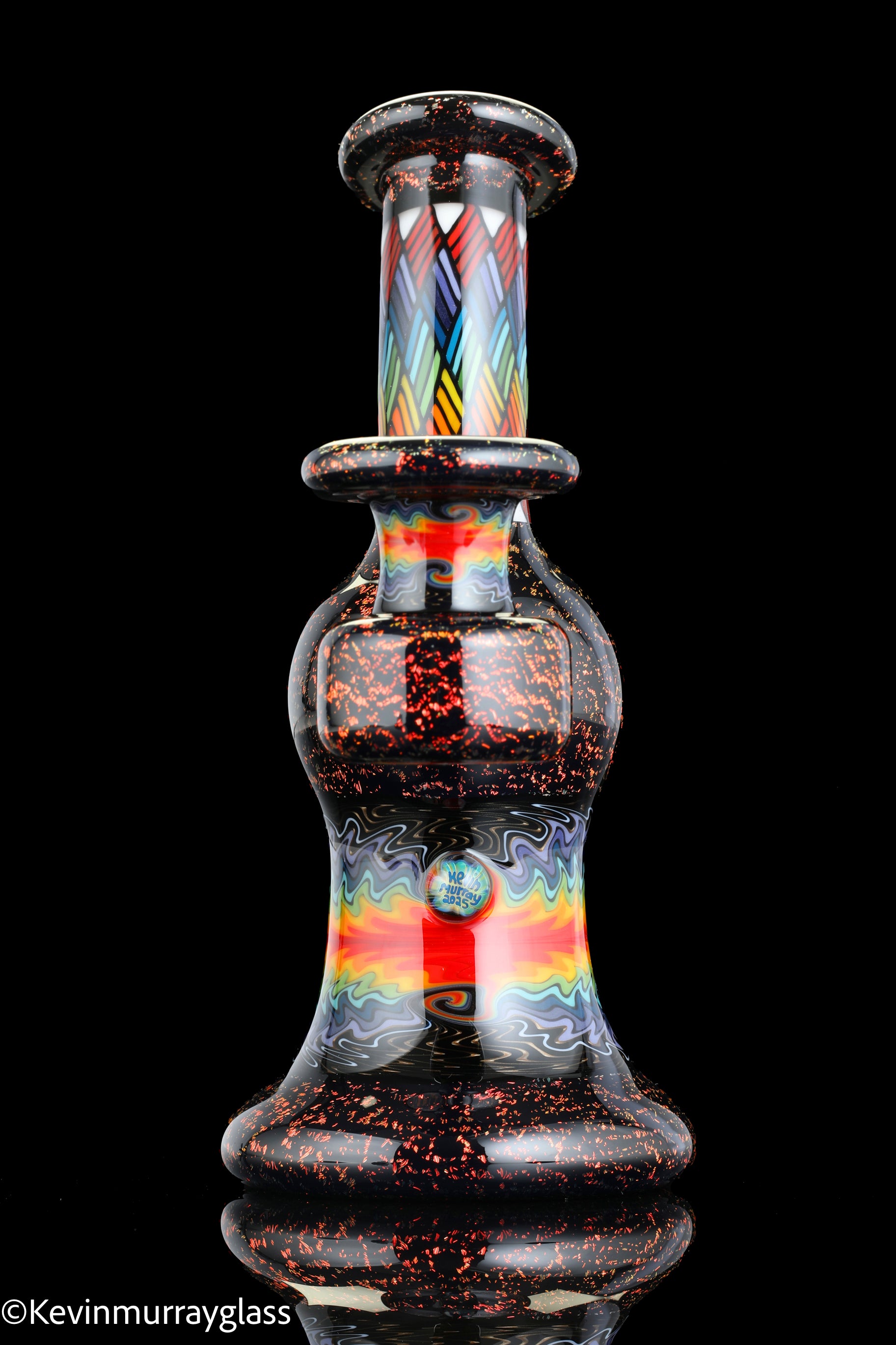 Tiny rig, big flavor. Red dichro over black tubing with wig wags and hand drawn fillacello work. Four hole perk with a 90 degree hand ground 10mm joint. Signed with the signature/year murrine. Includes a signed pelican 1120 hard case.