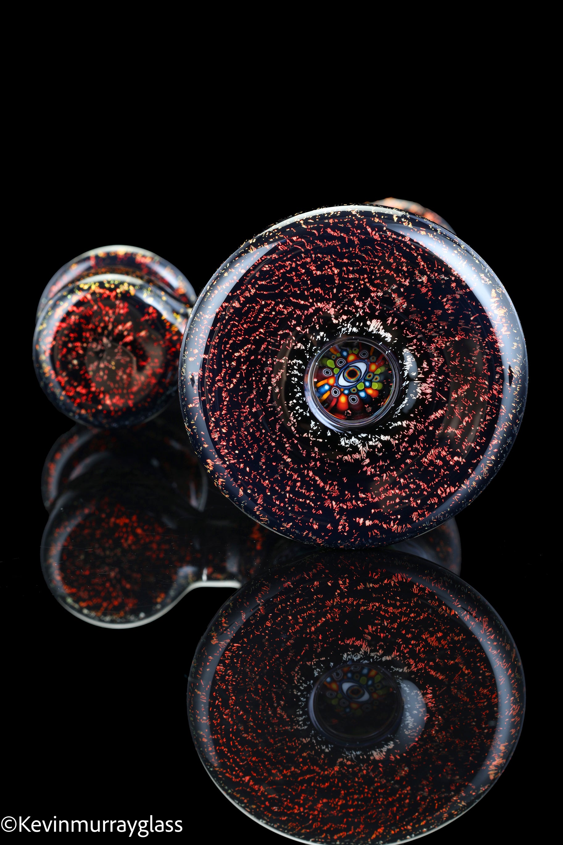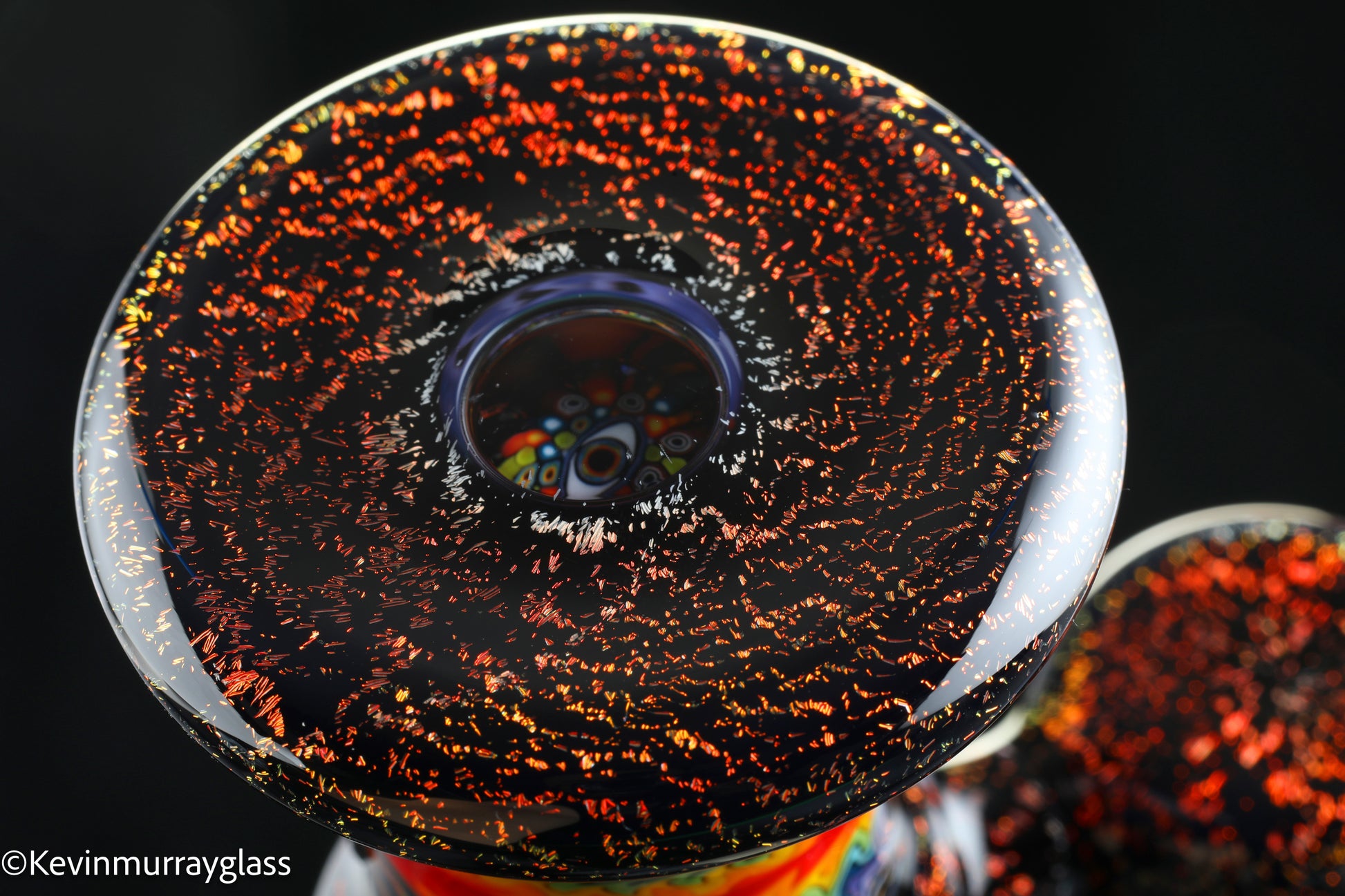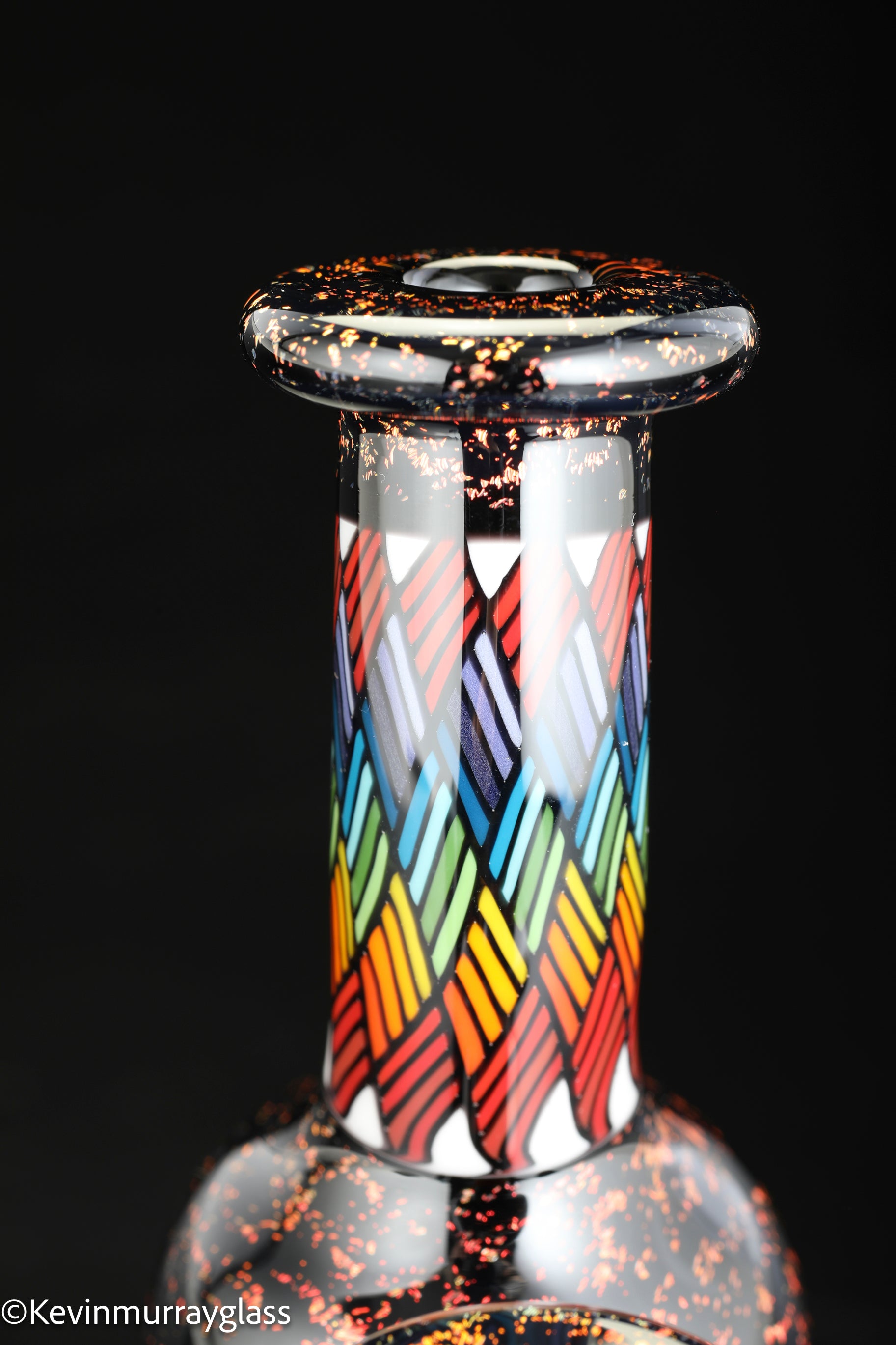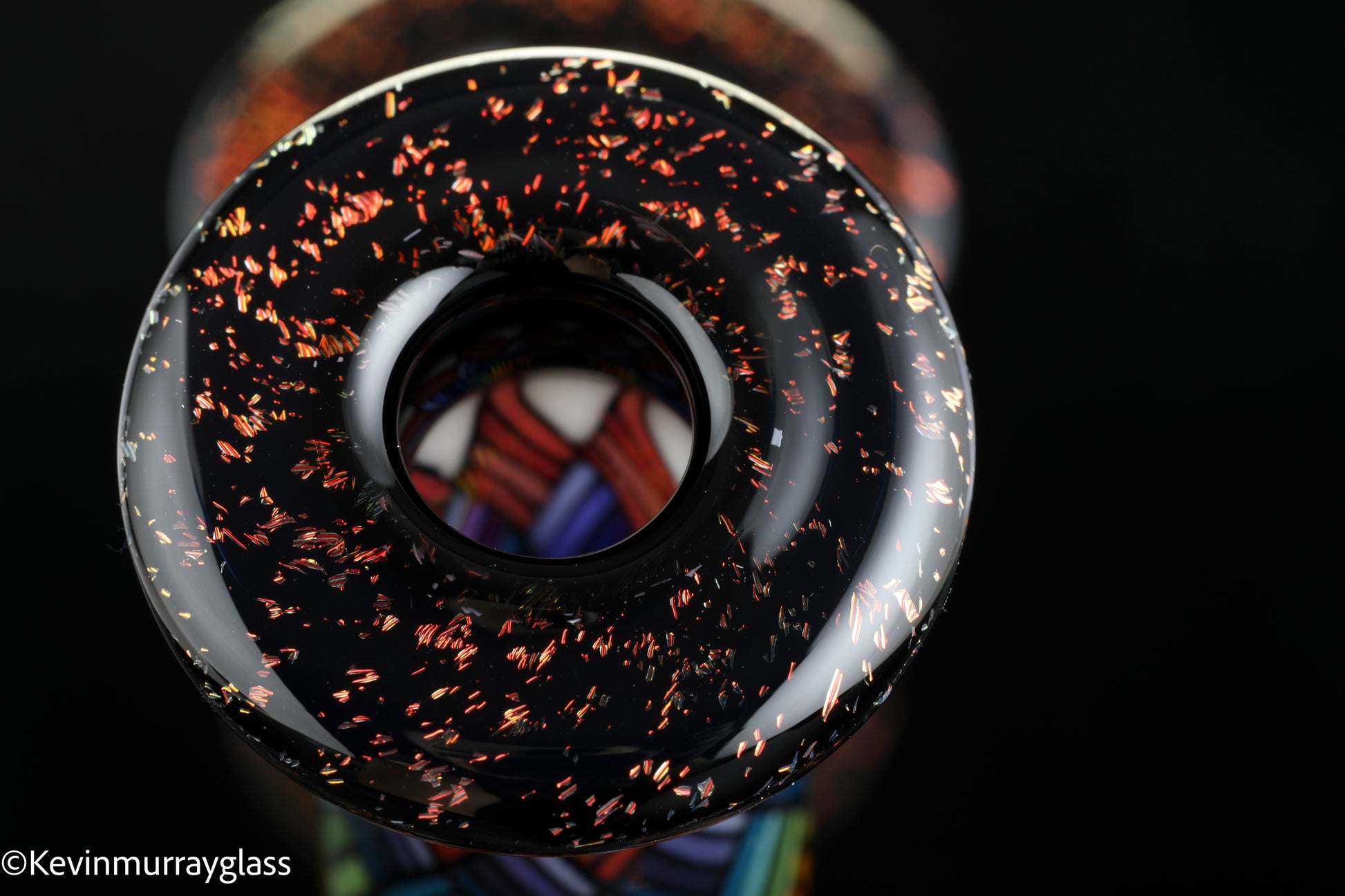 Tiny rig, big flavor. Red dichro over black tubing with wig wags and hand drawn fillacello work. Four hole perk with a 90 degree hand ground 10mm joint. Signed with the signature/year murrine. Includes a signed pelican 1120 hard case.
