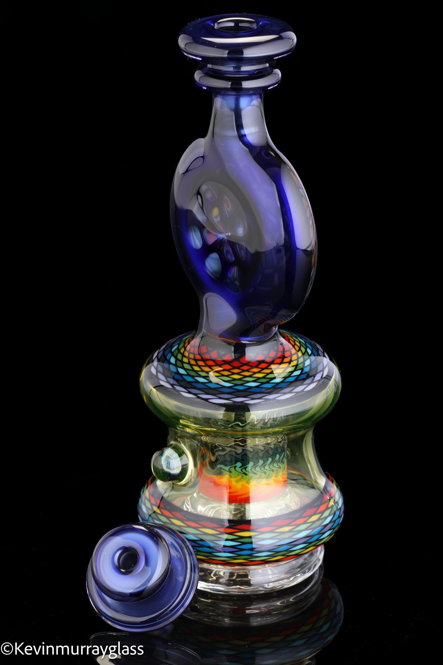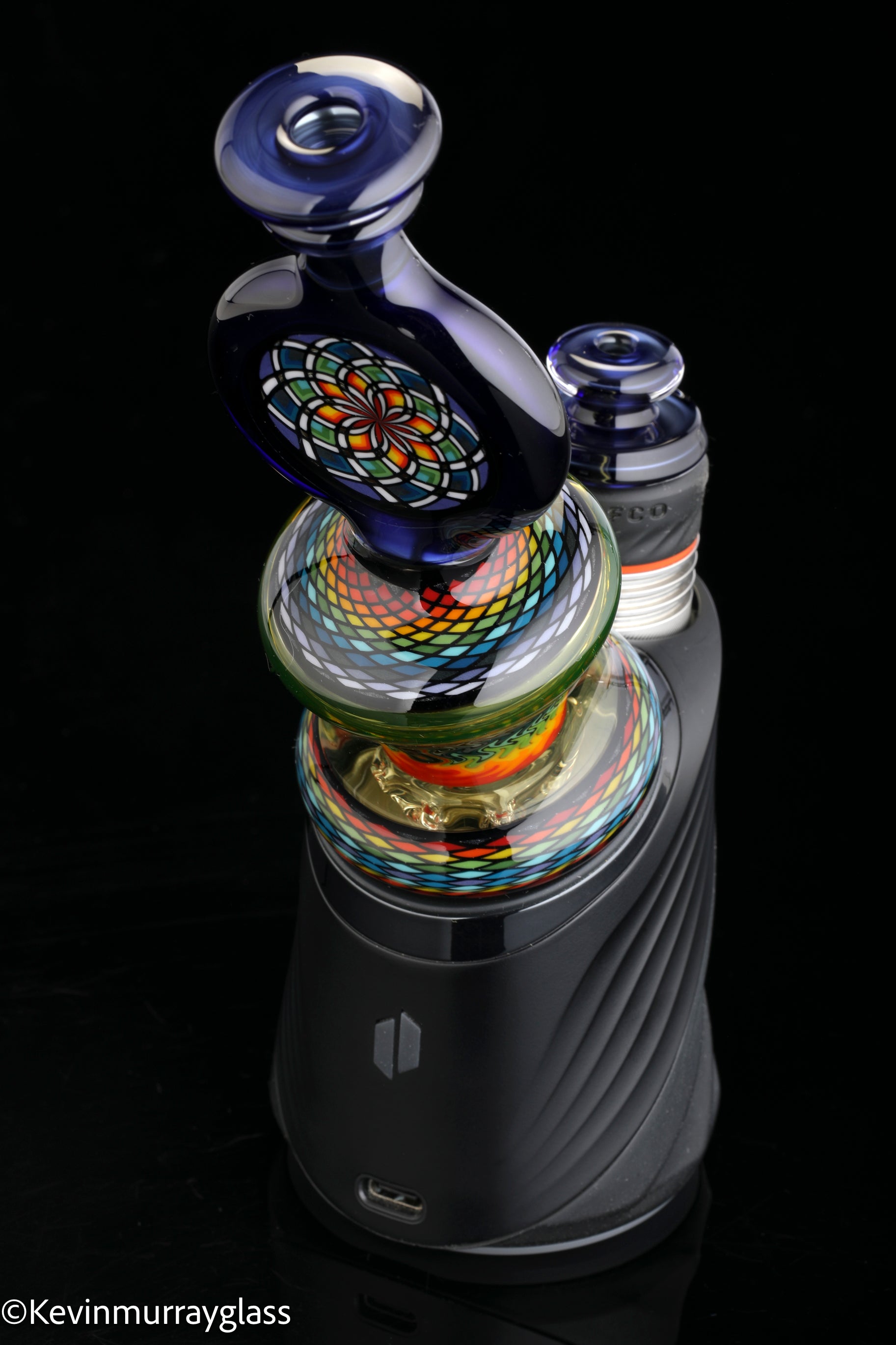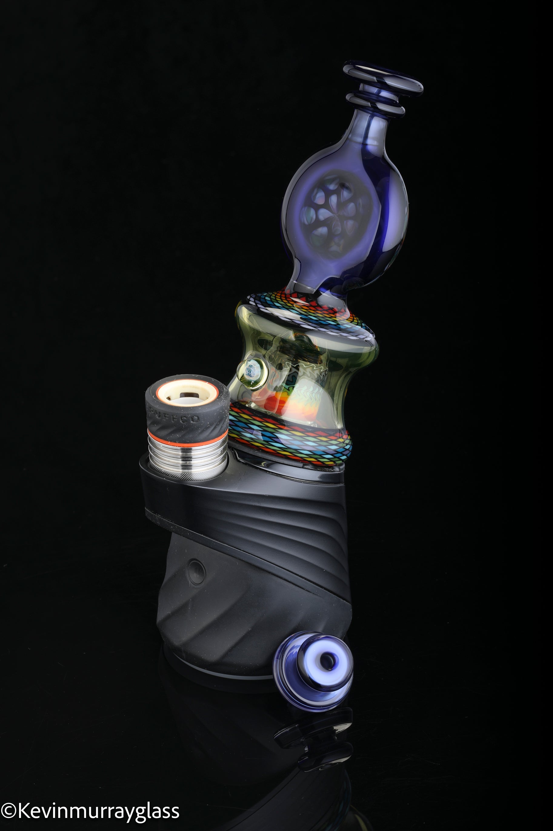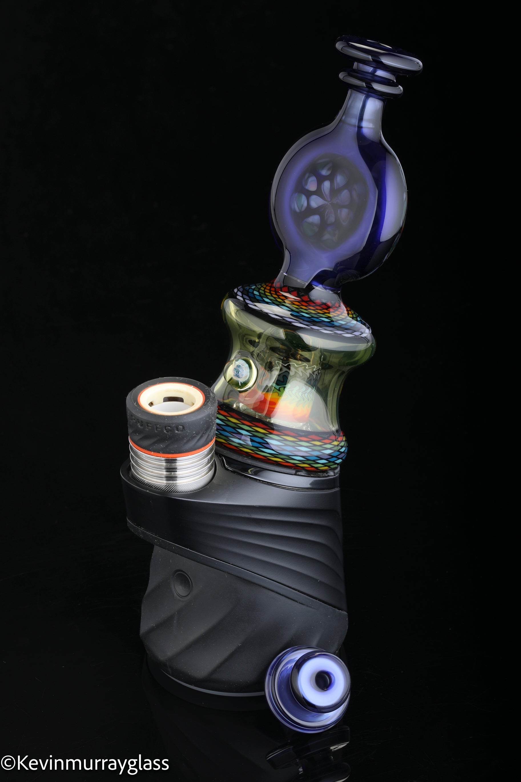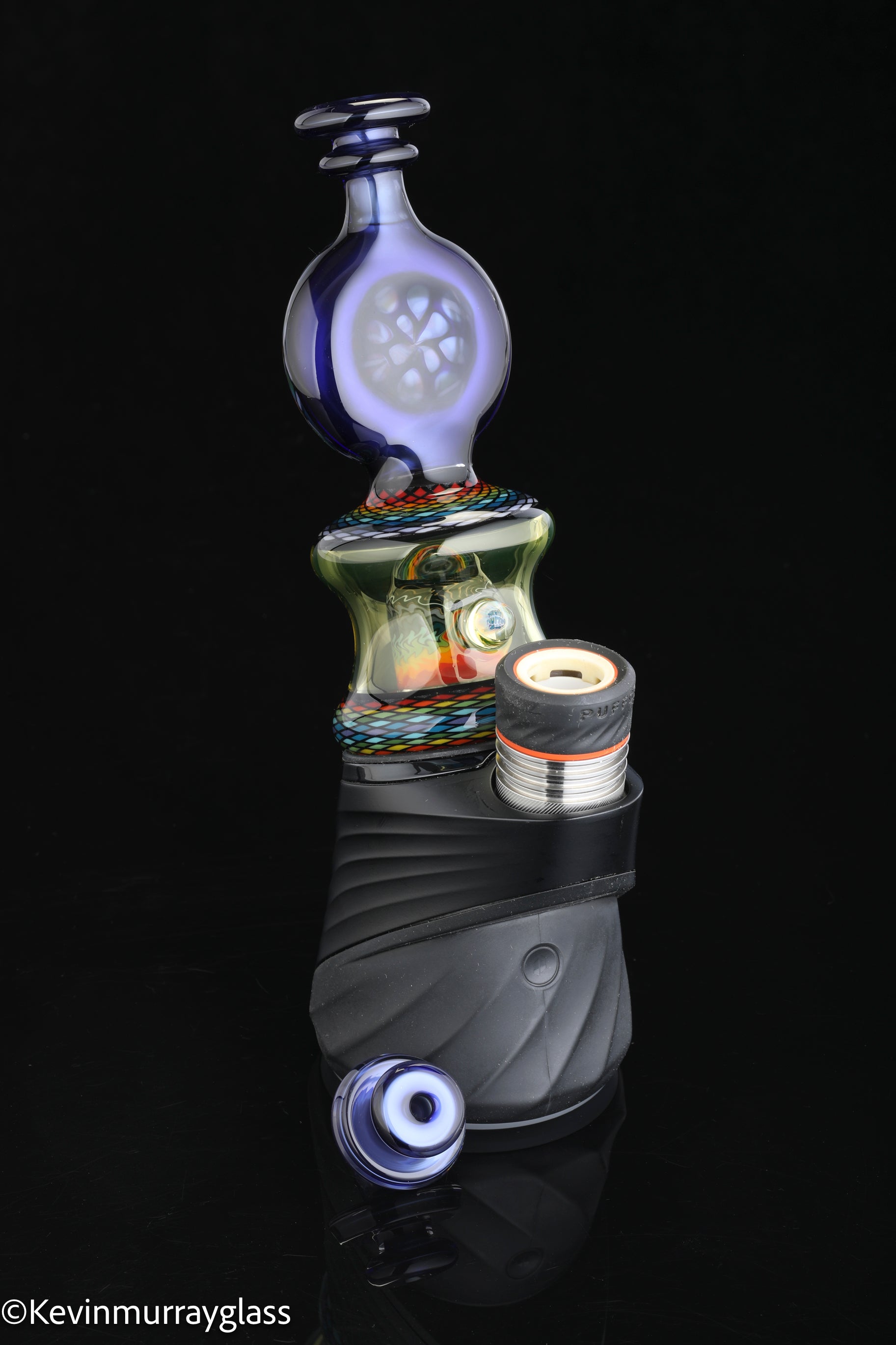 Hand made glass top for your puffco peak. Hand drawn fillacello sections with "candy cobalt blue" and uv reactive citrine sections. Three hole perk and a clear bottom to let the puffco led lights shine through. Includes matching spinner cap and apache 1800 hard case.