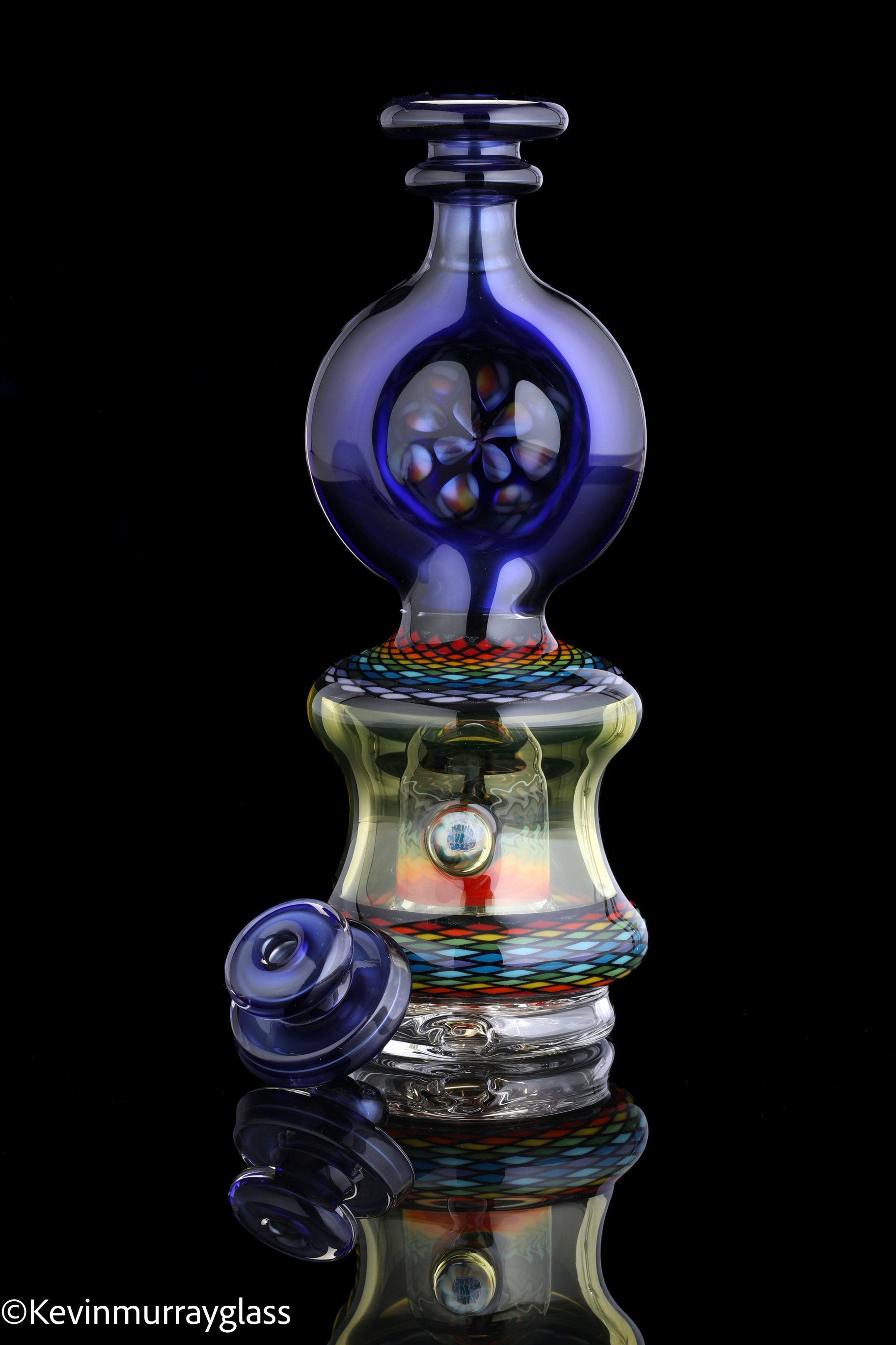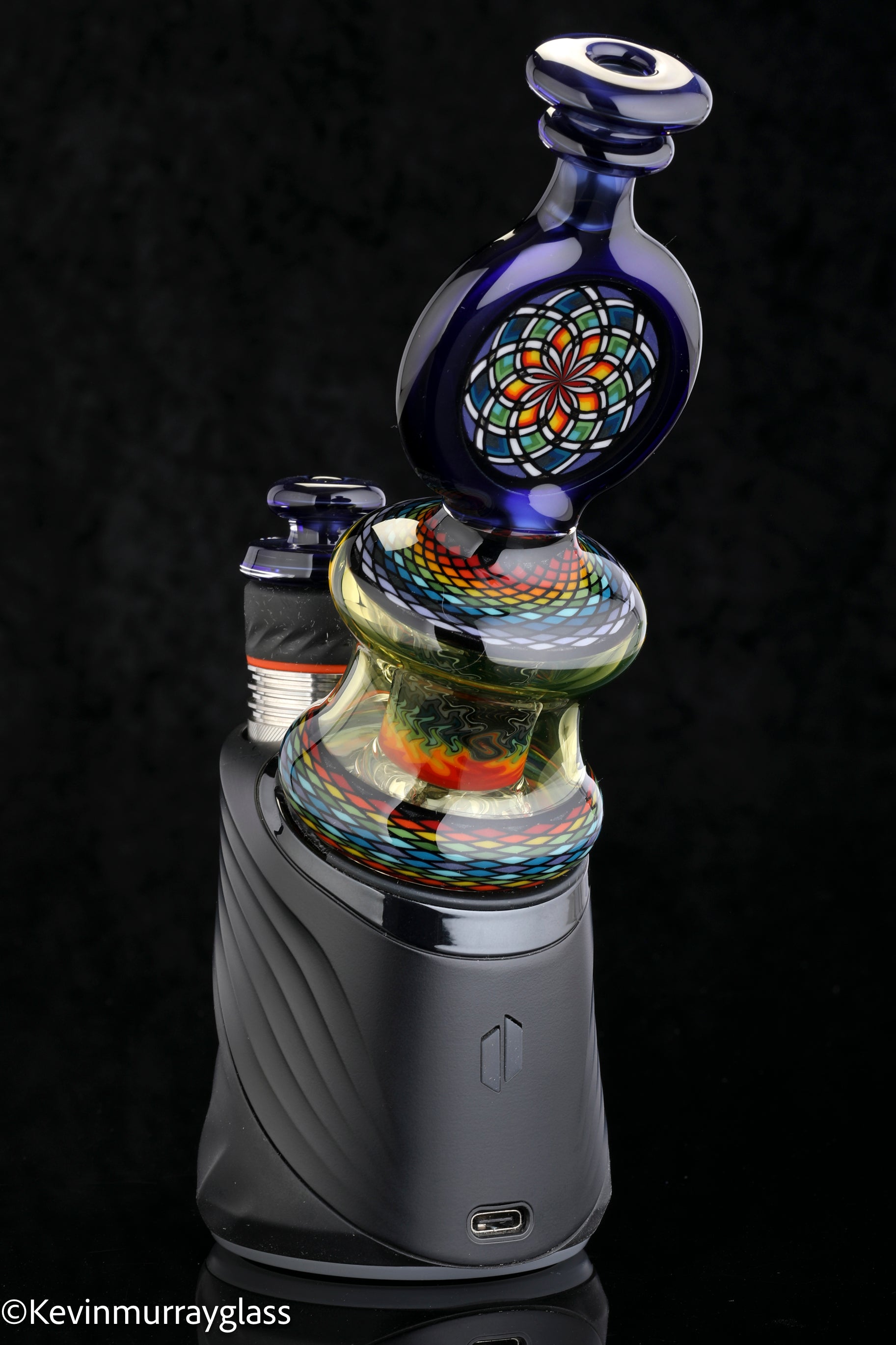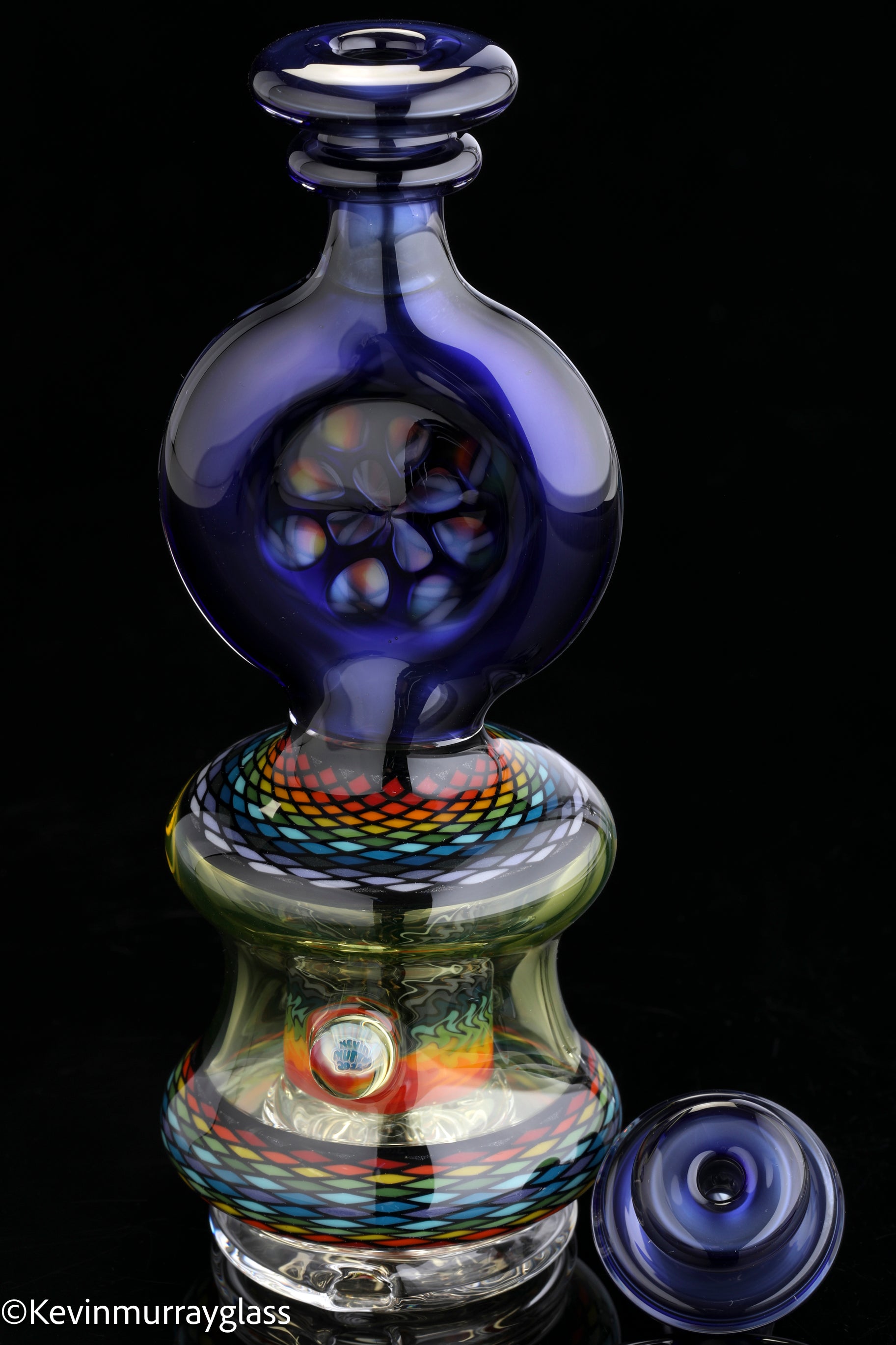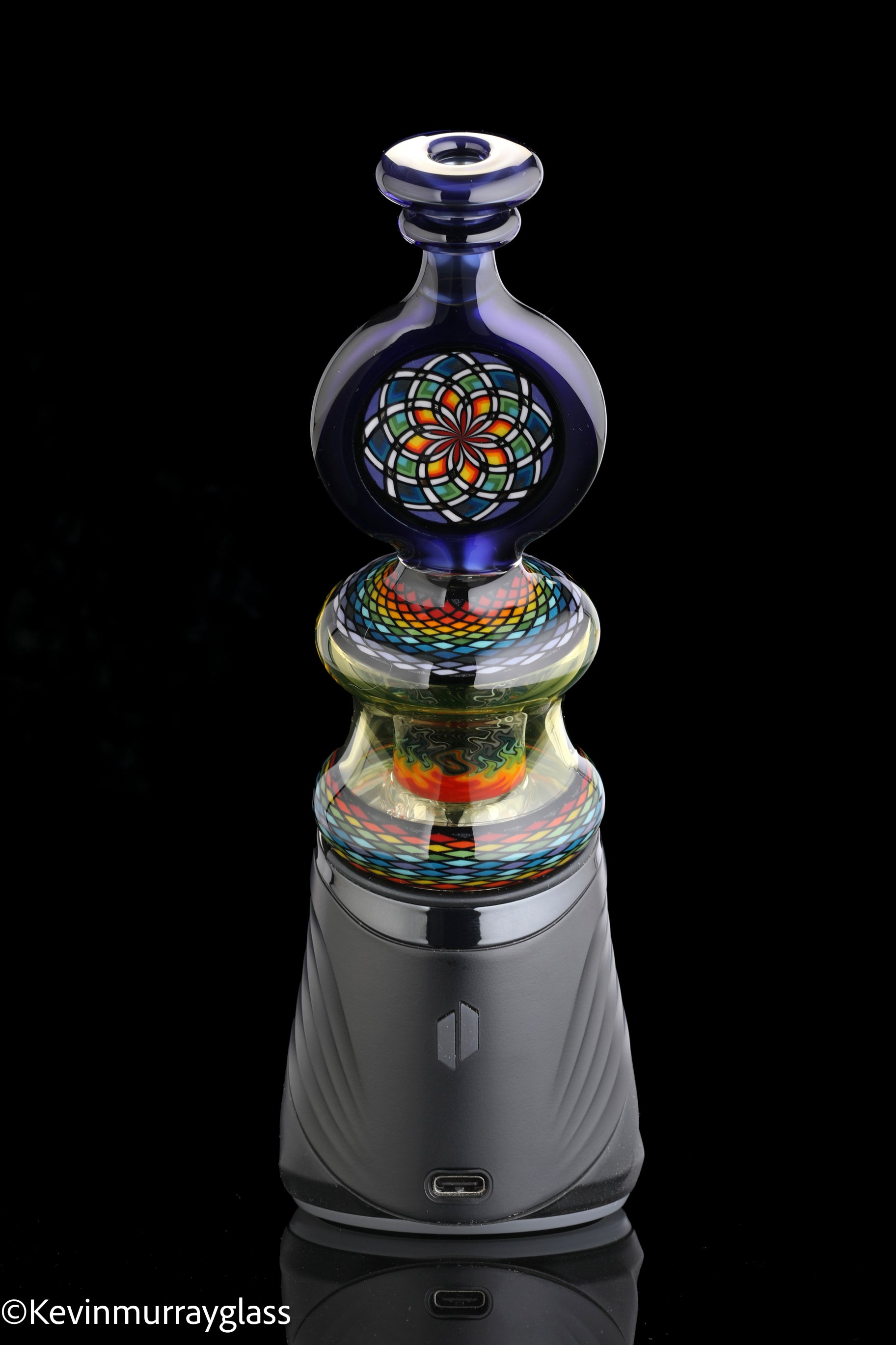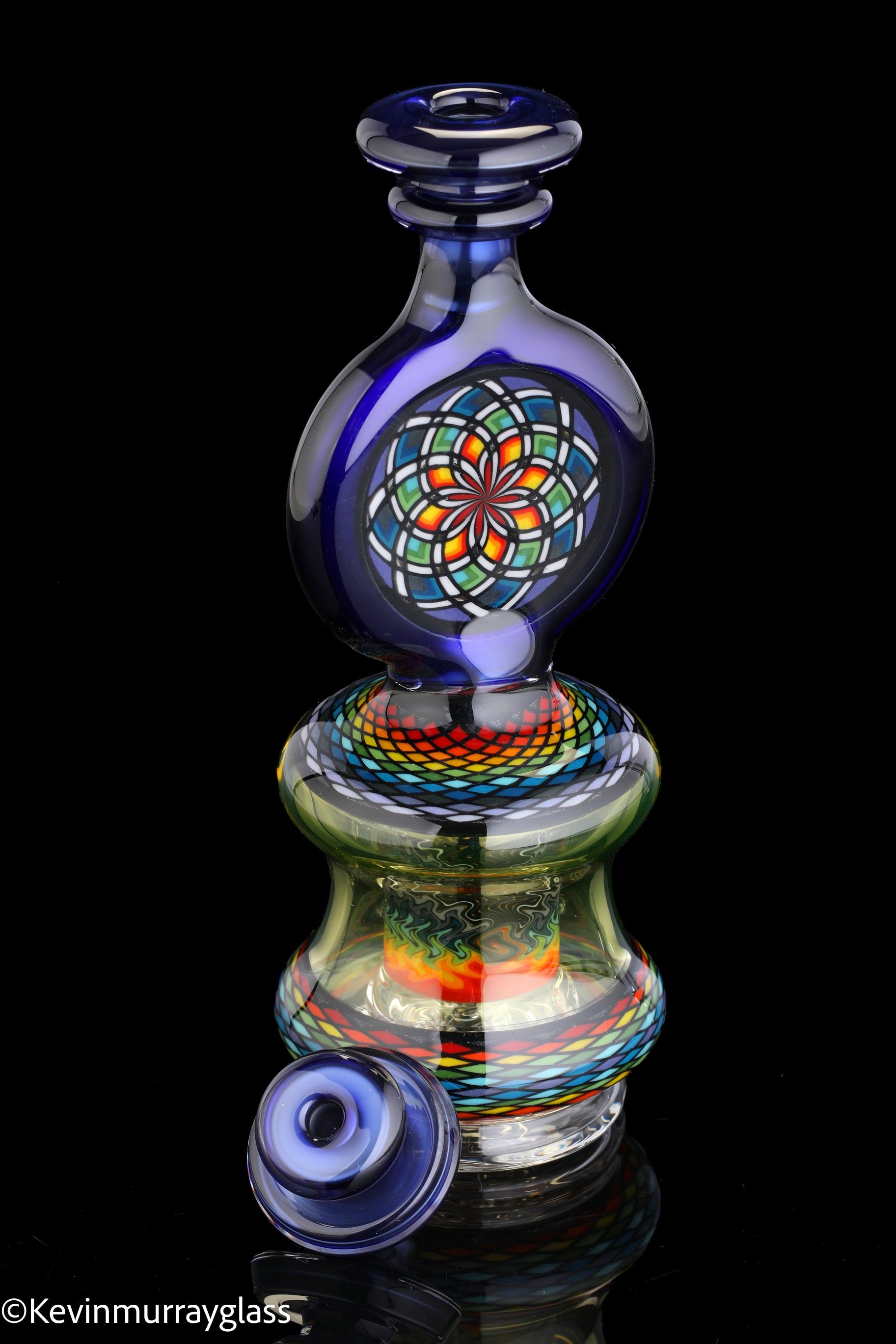 Hand made glass top for your puffco peak. Hand drawn fillacello sections with "candy cobalt blue" and uv reactive citrine sections. Three hole perk and a clear bottom to let the puffco led lights shine through. Includes matching spinner cap and apache 1800 hard case.