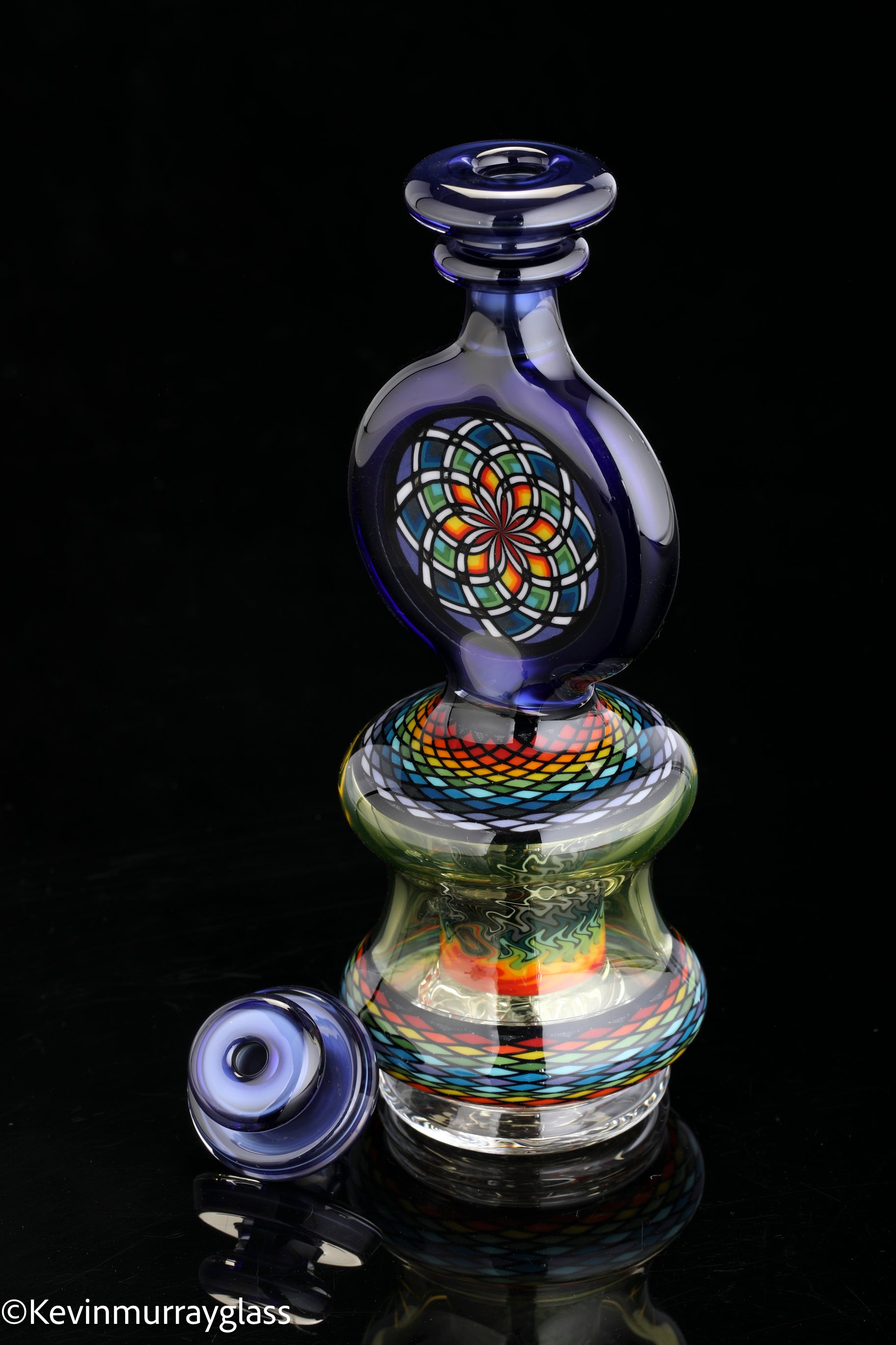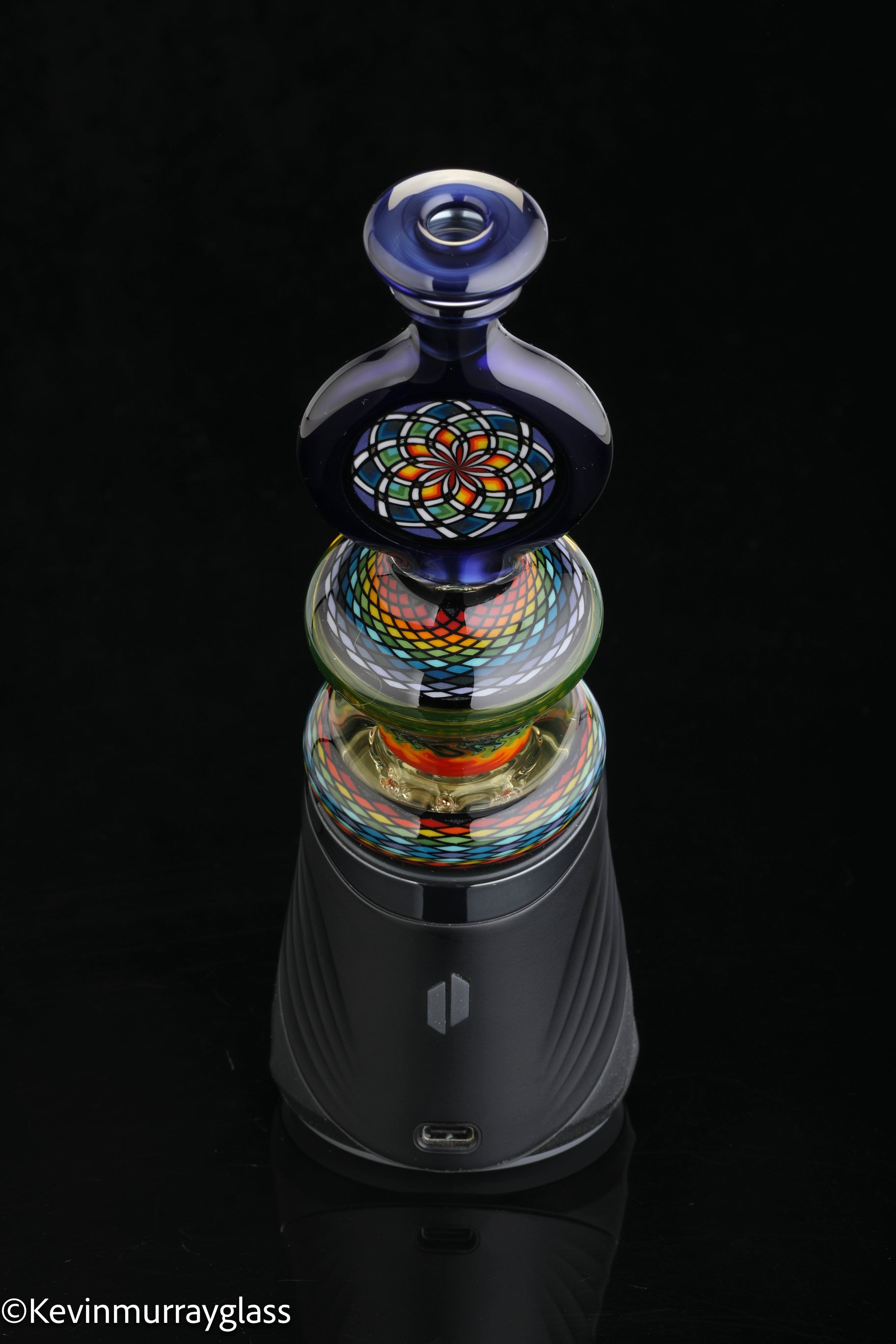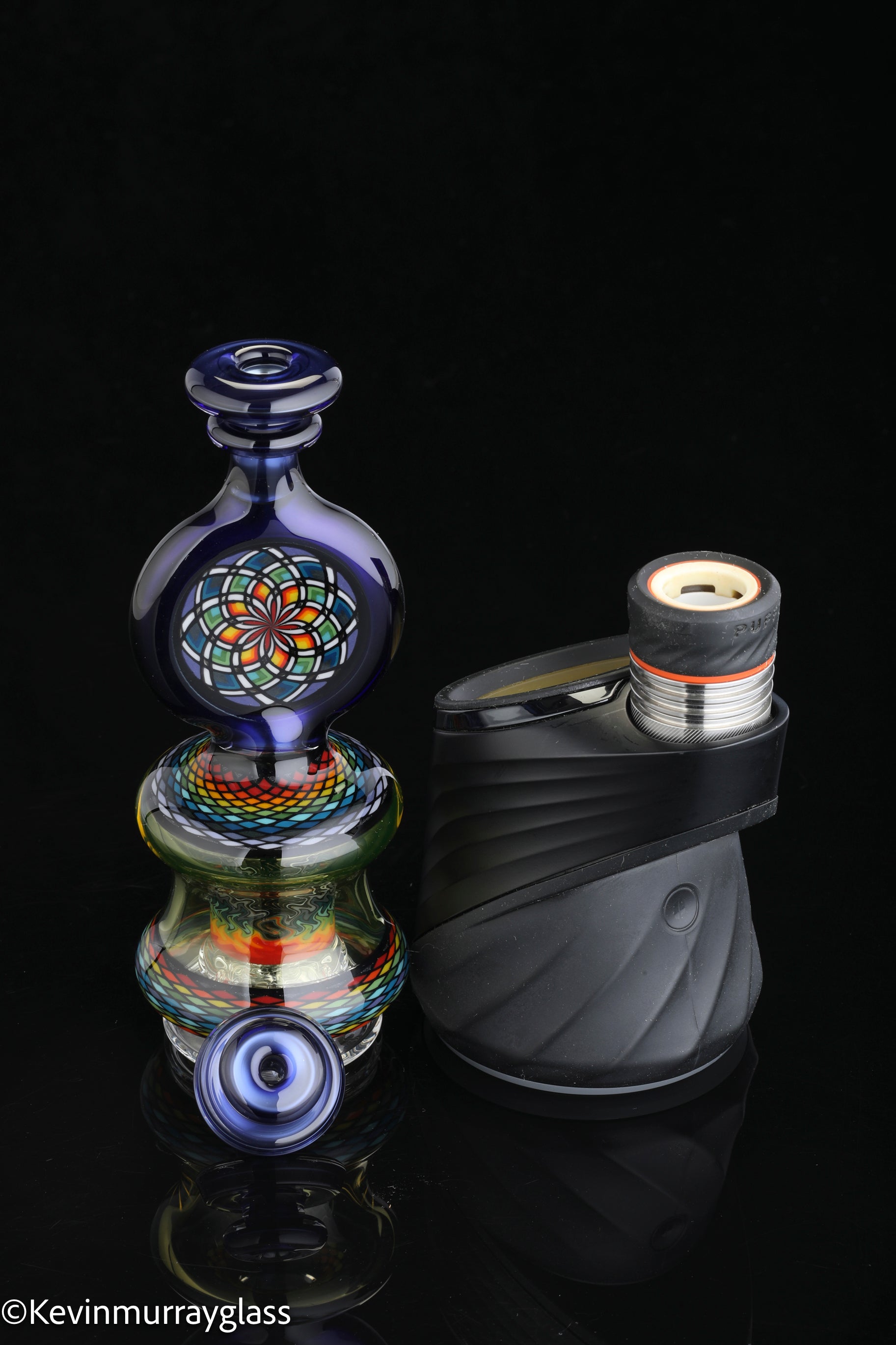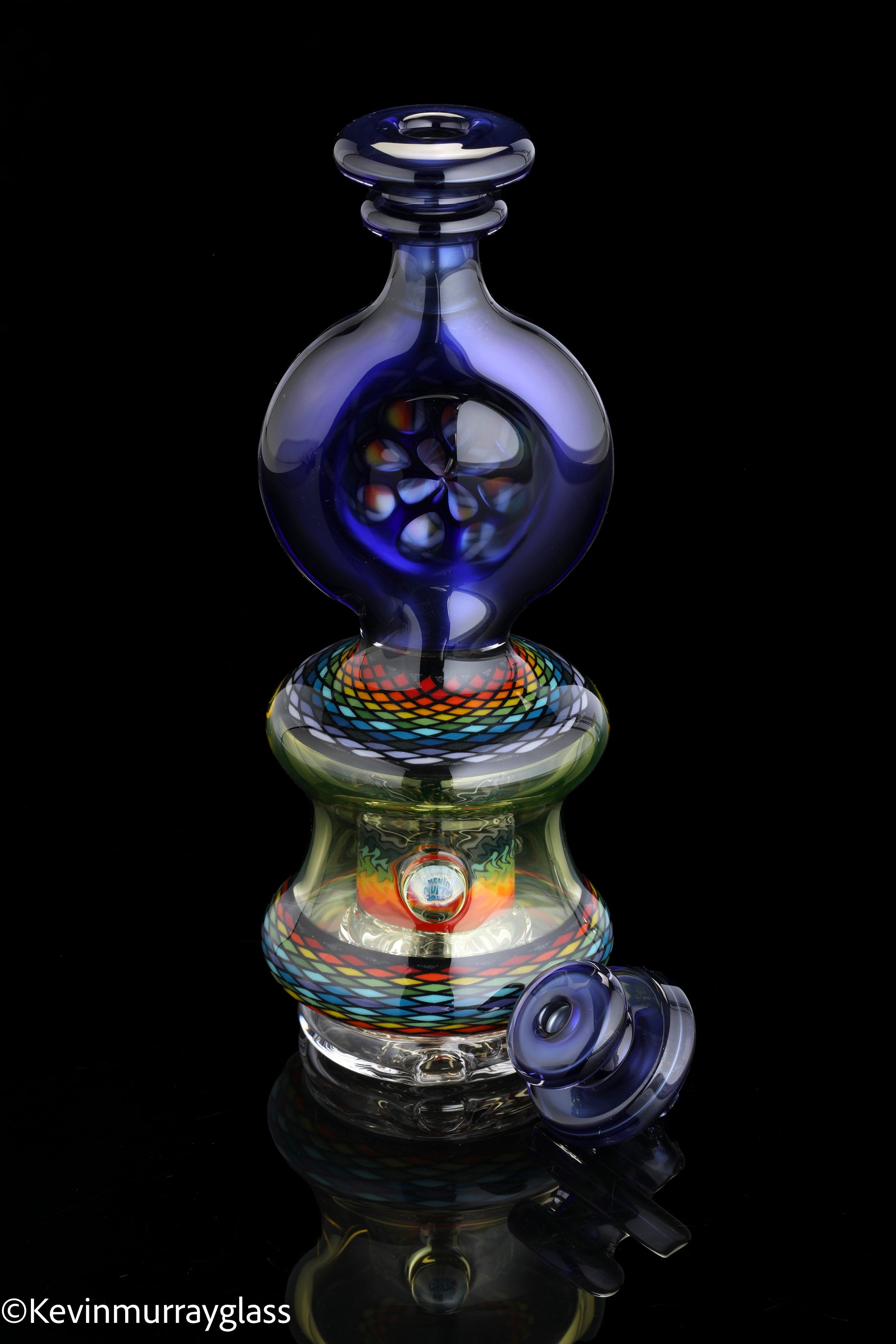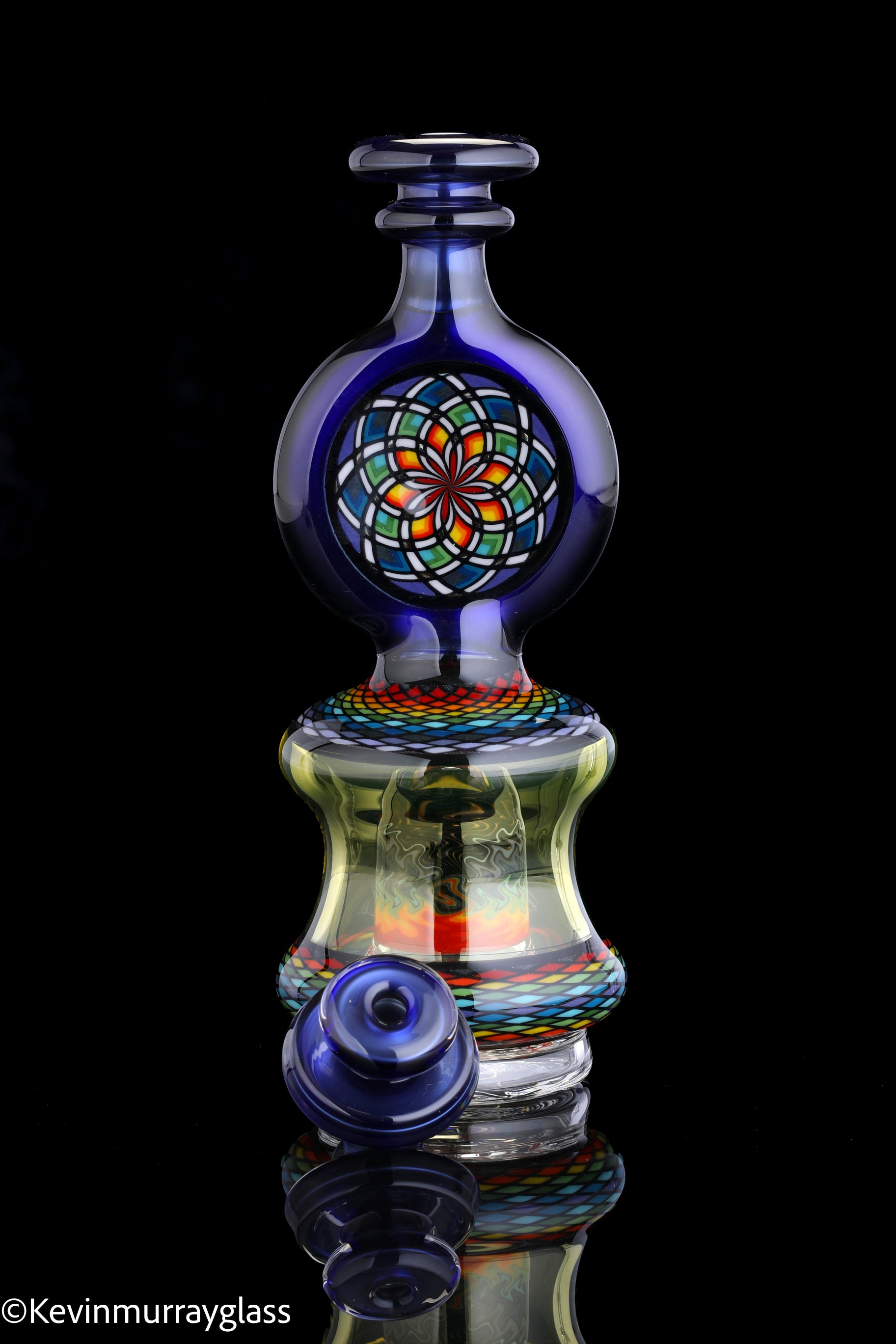 Hand made glass top for your puffco peak. Hand drawn fillacello sections with "candy cobalt blue" and uv reactive citrine sections. Three hole perk and a clear bottom to let the puffco led lights shine through. Includes matching spinner cap and apache 1800 hard case.