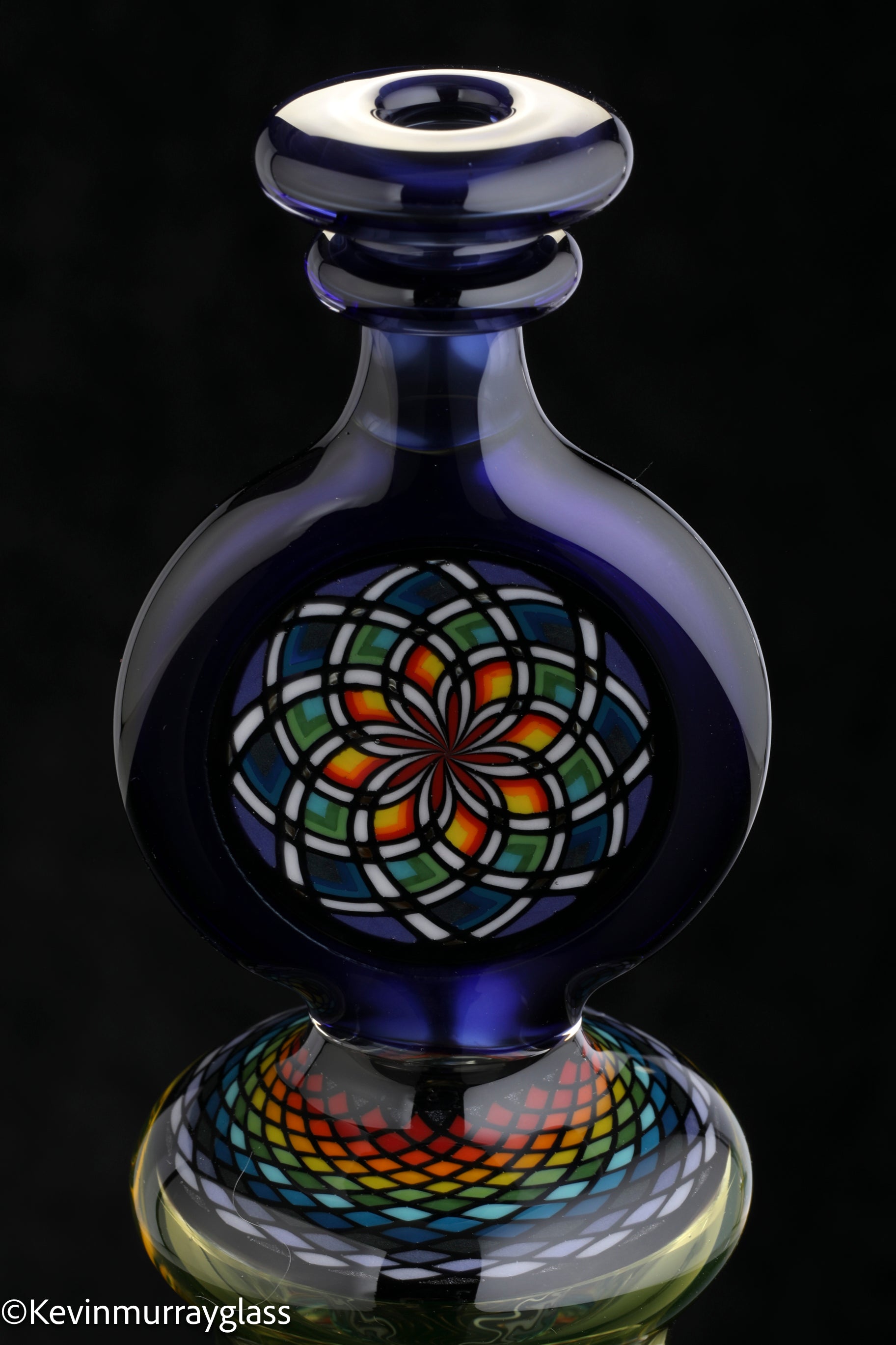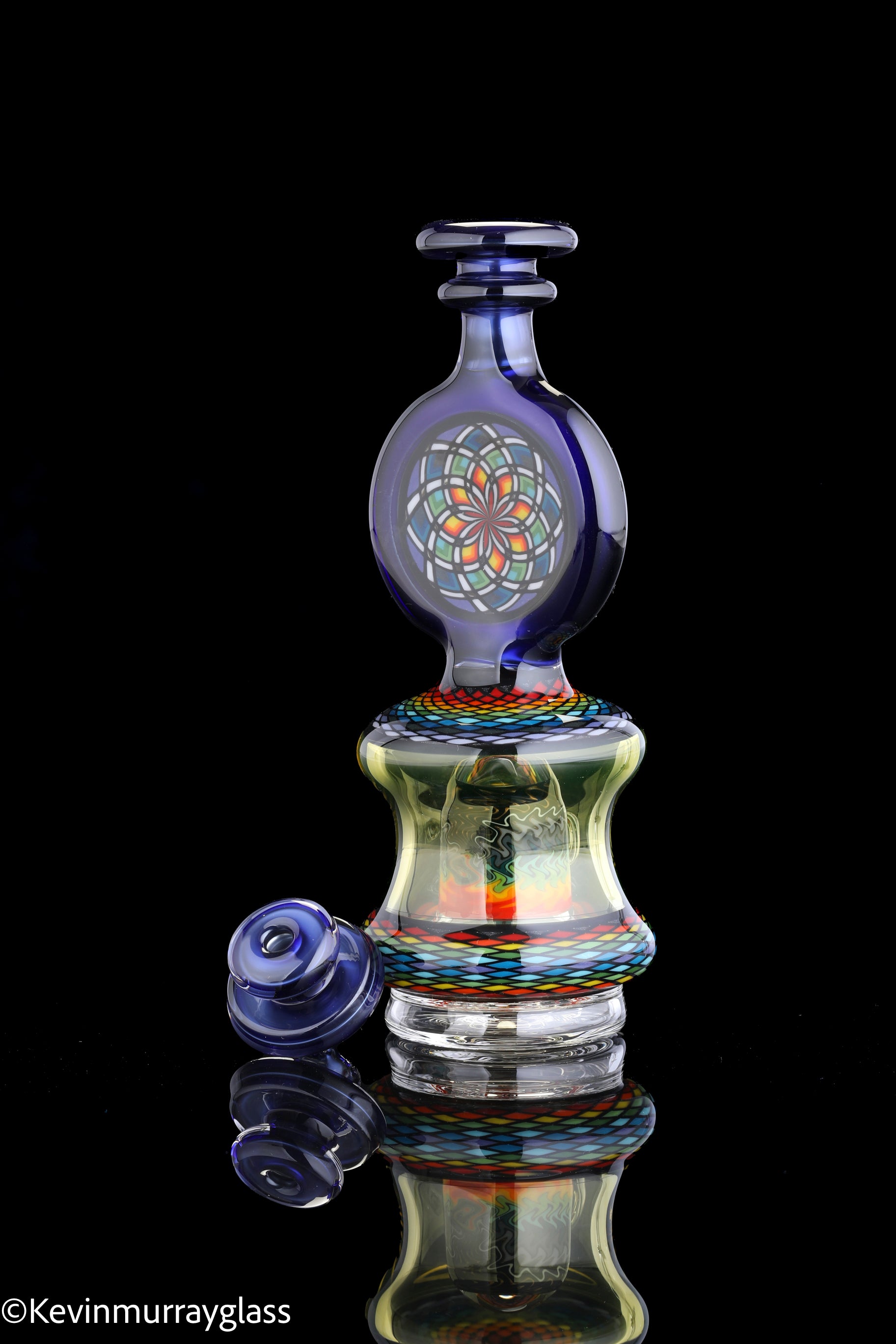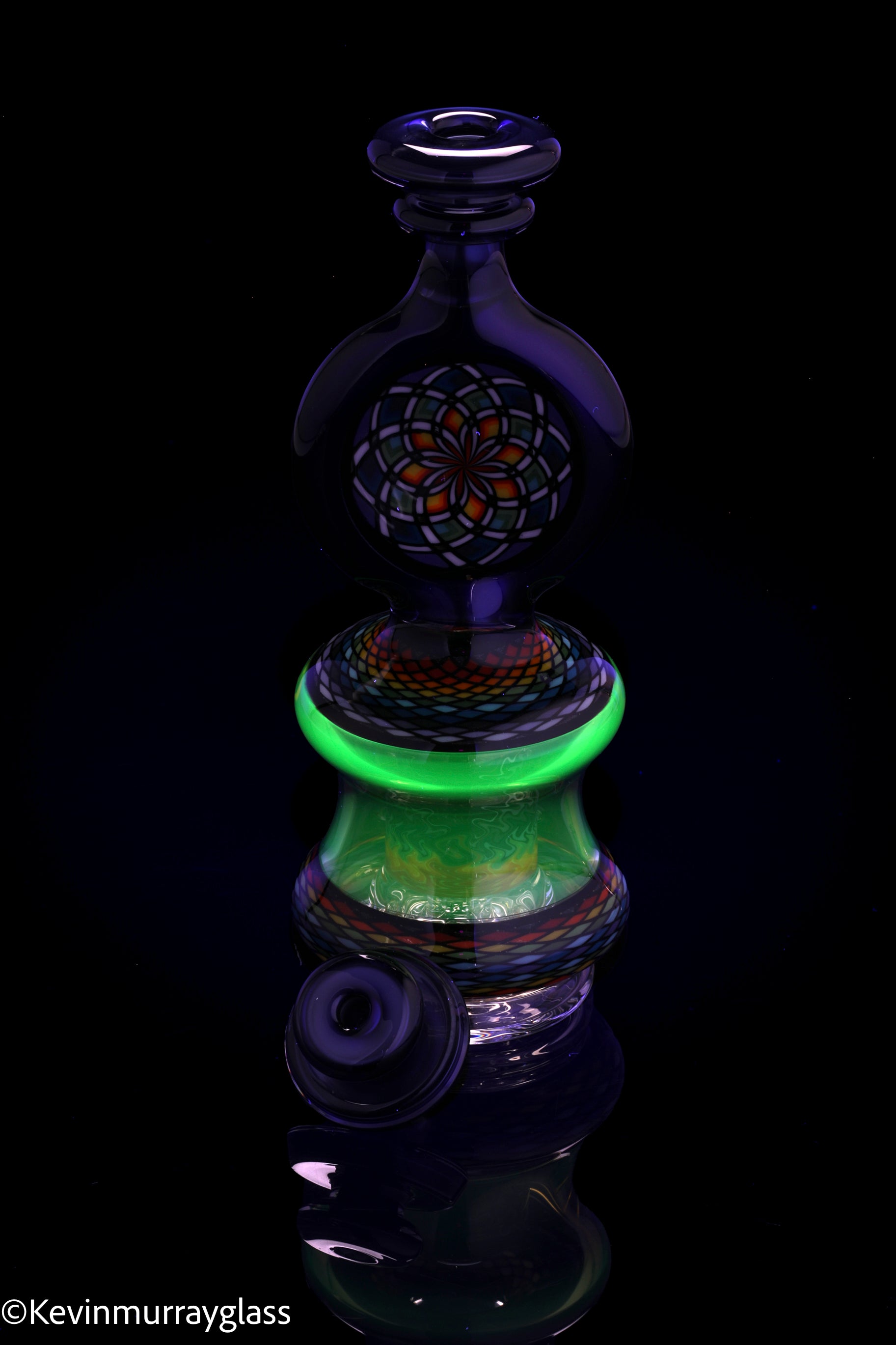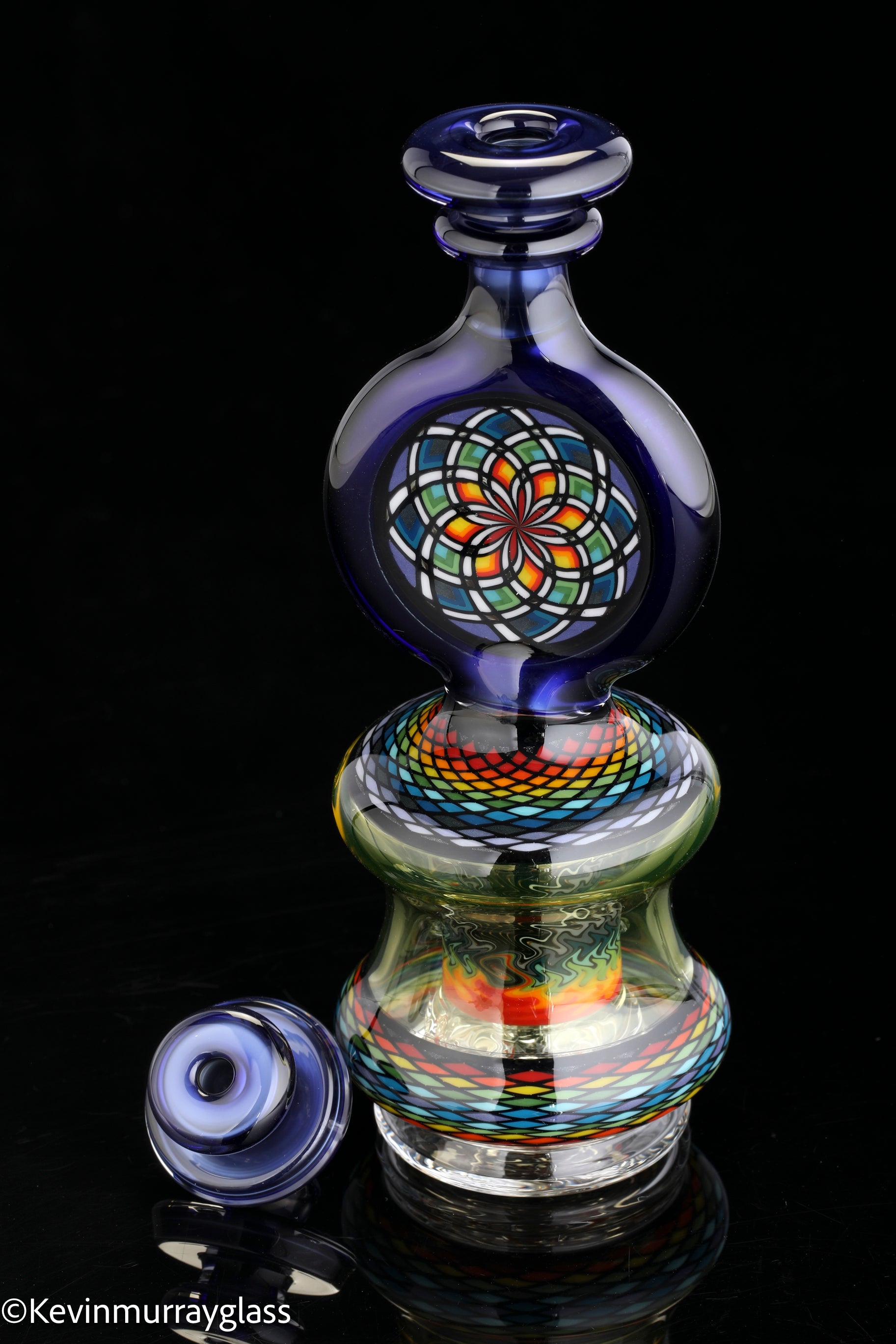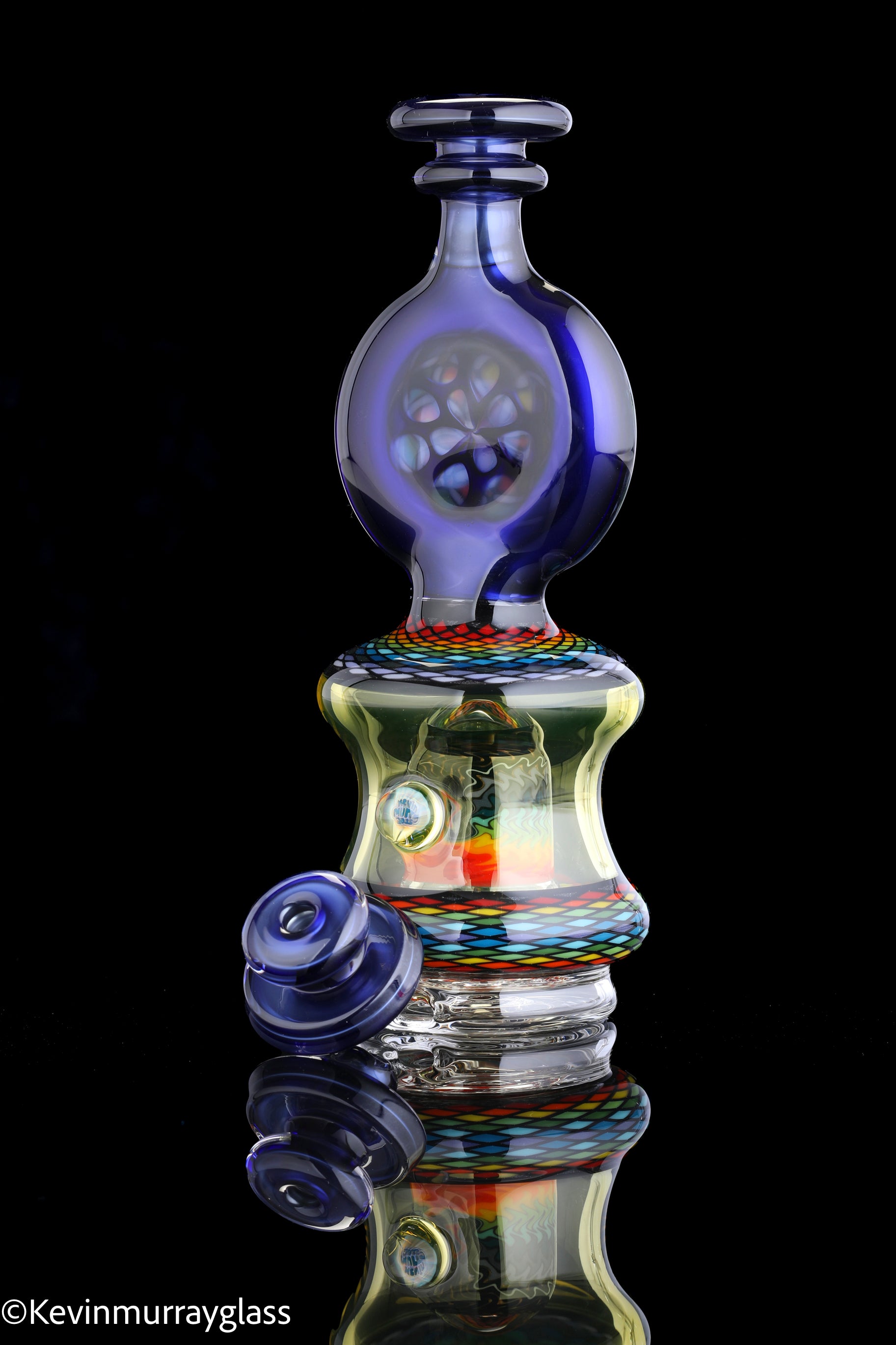 Hand made glass top for your puffco peak. Hand drawn fillacello sections with "candy cobalt blue" and uv reactive citrine sections. Three hole perk and a clear bottom to let the puffco led lights shine through. Includes matching spinner cap and apache 1800 hard case.