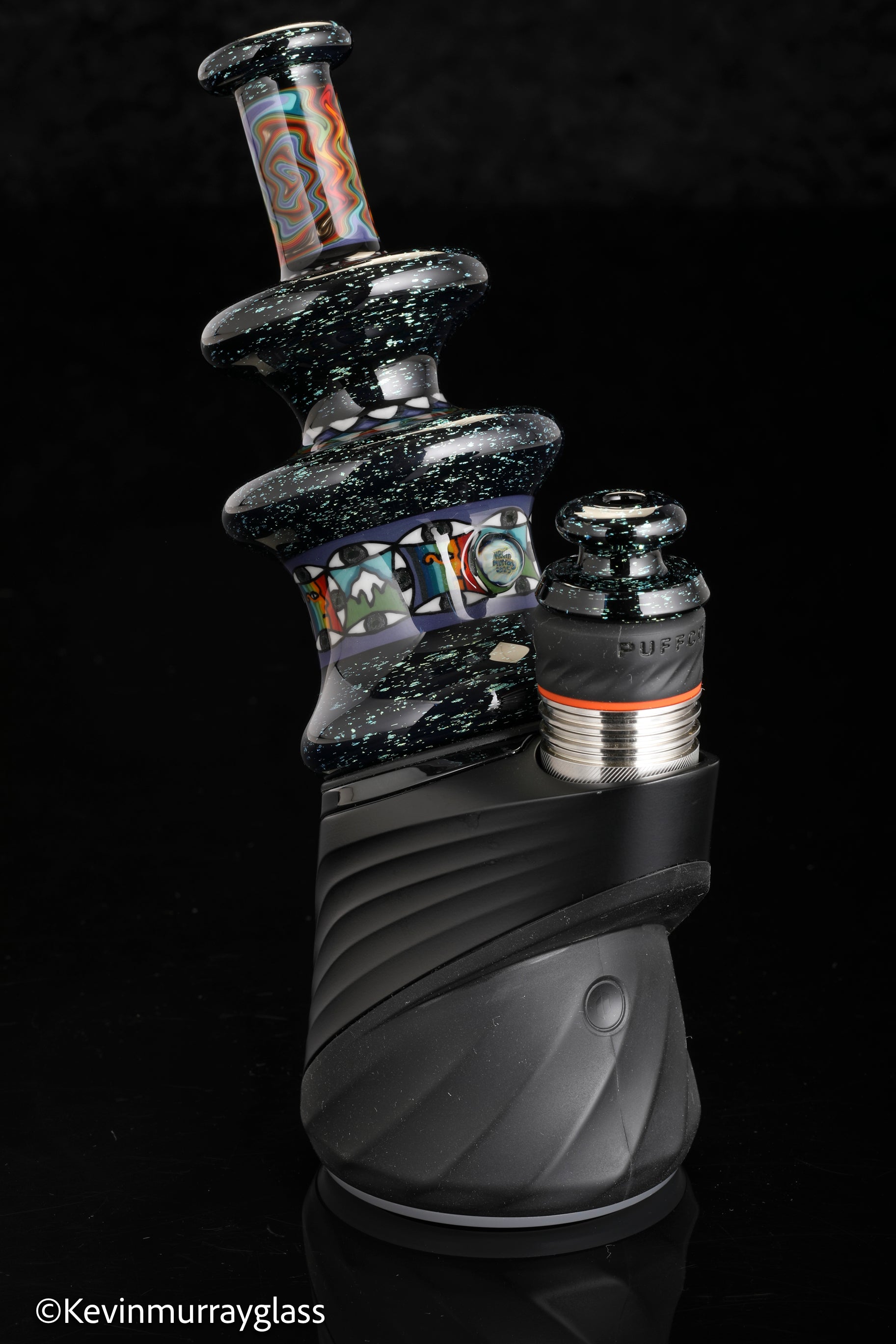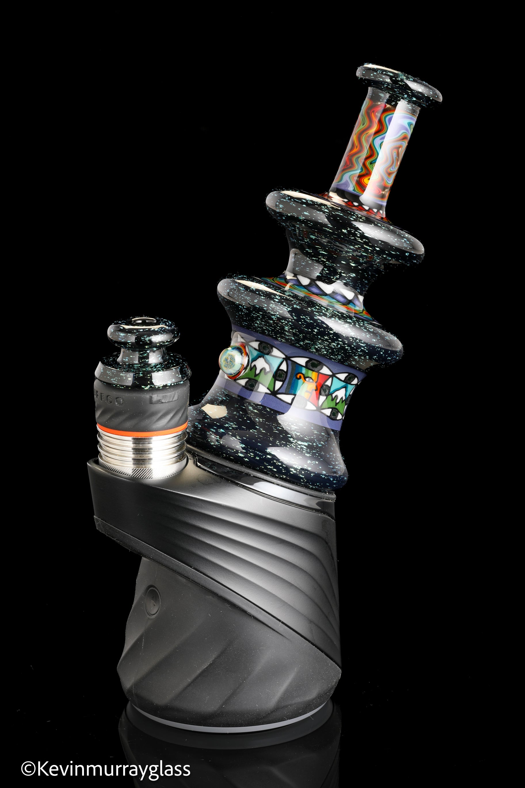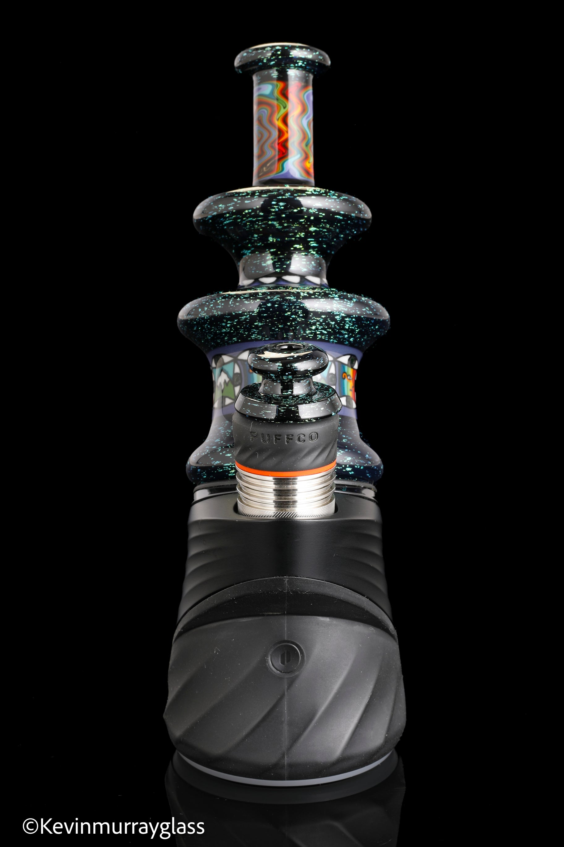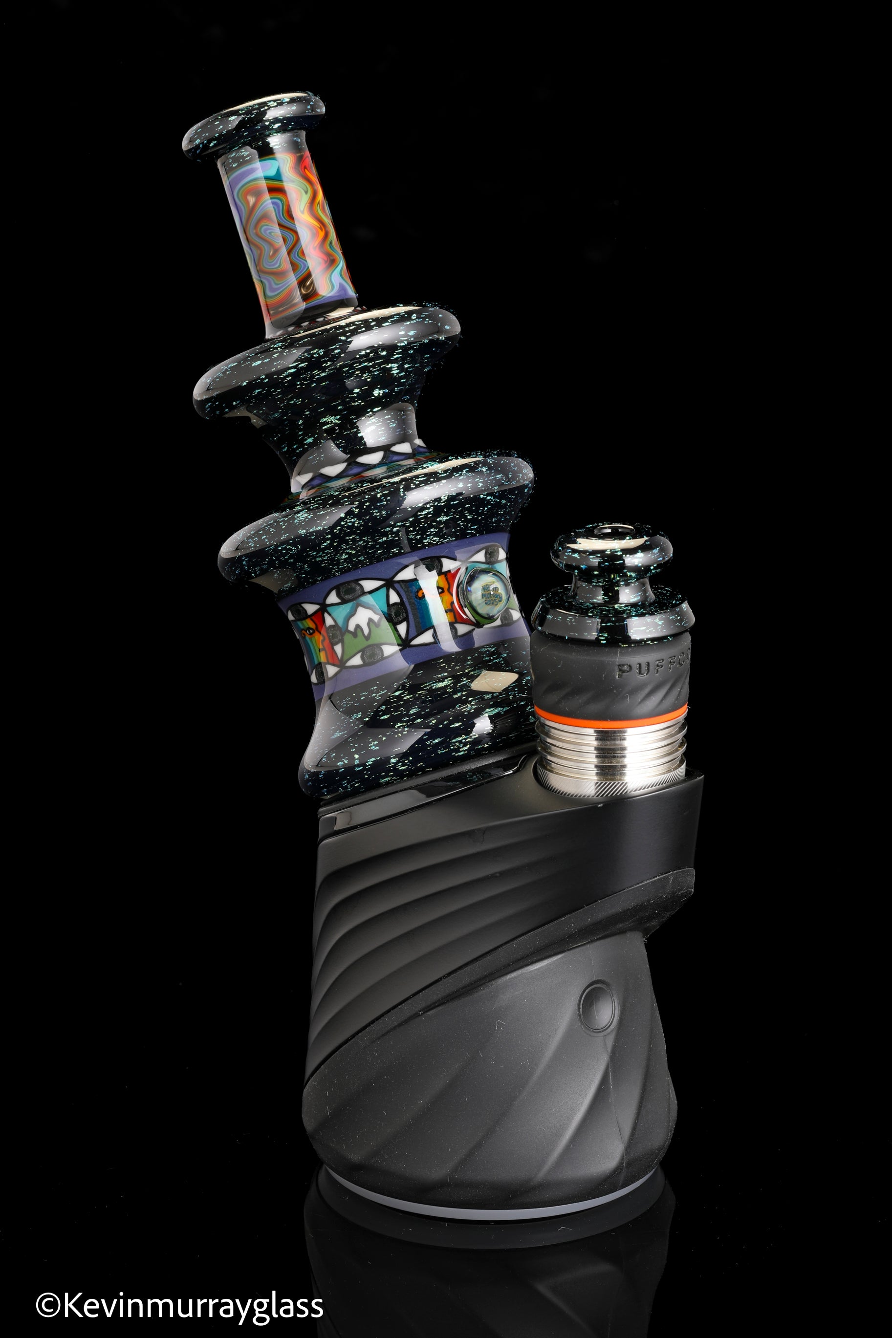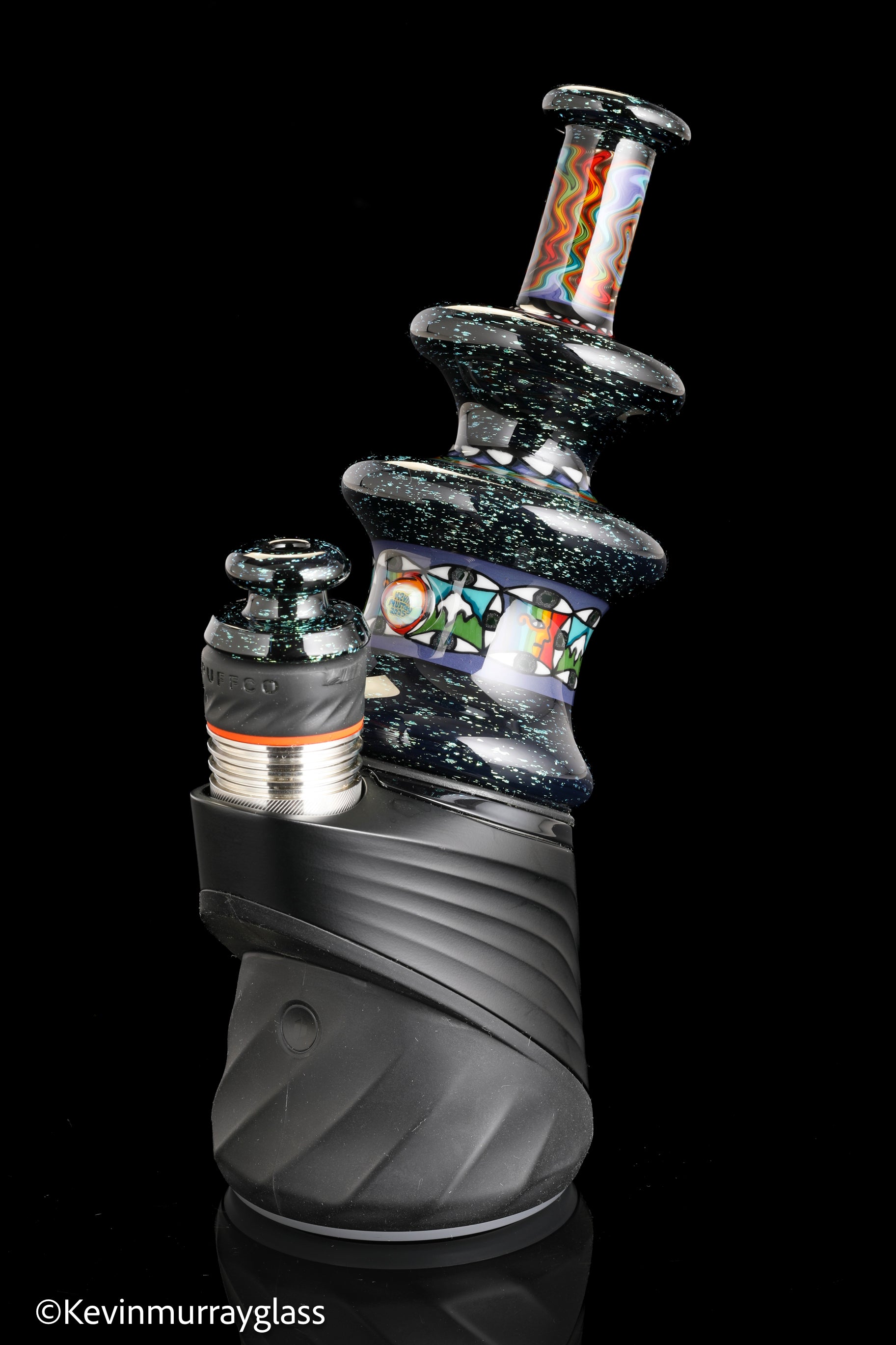 Hand made glass top for your puffco peak. Blue/gold dichro over black with three hand drawn fillacello sections and some uv reactive wig wag work. Signed with the signature/year murrine. Clear bottom to let the puffco light show though. Include an apache 1800 hard case.