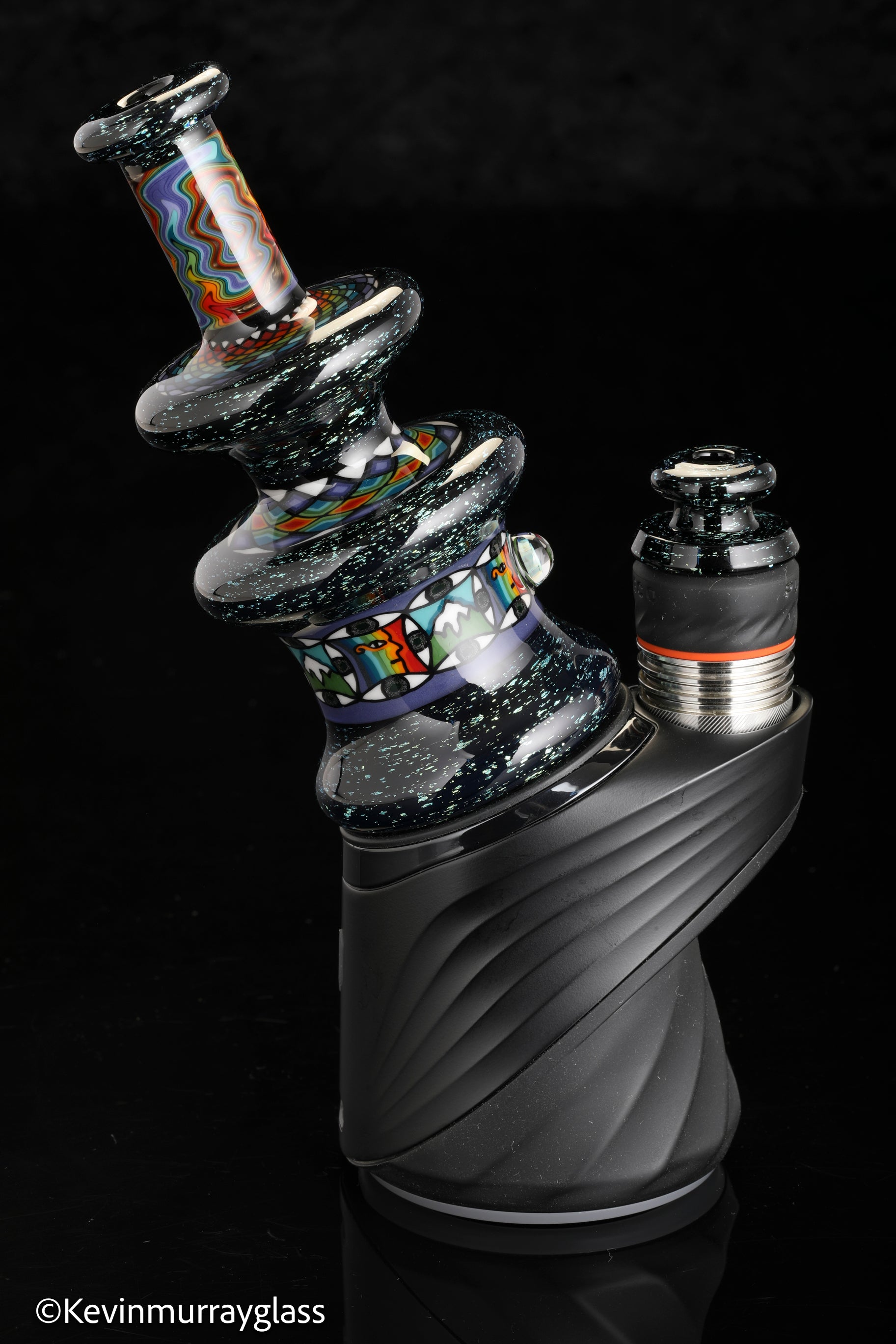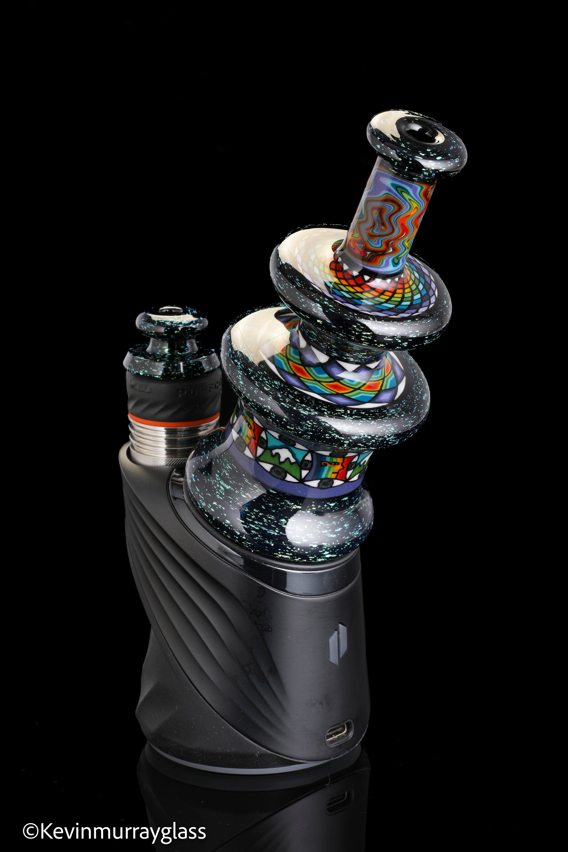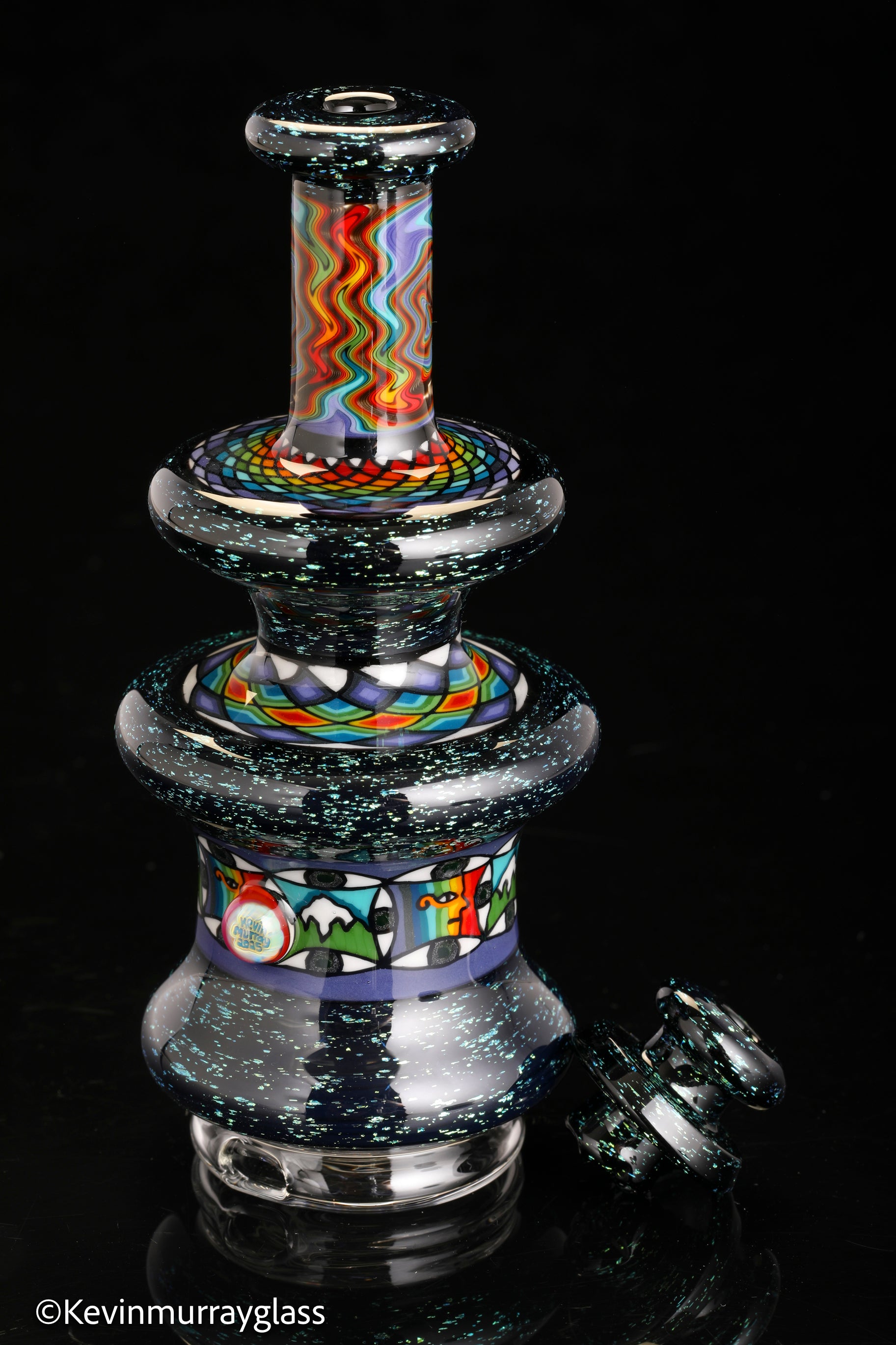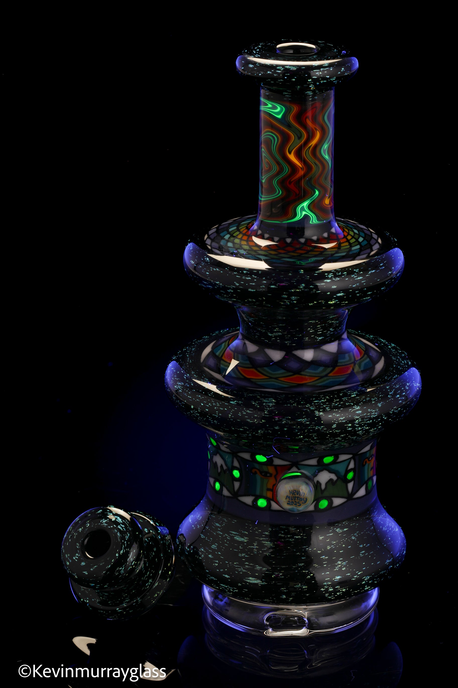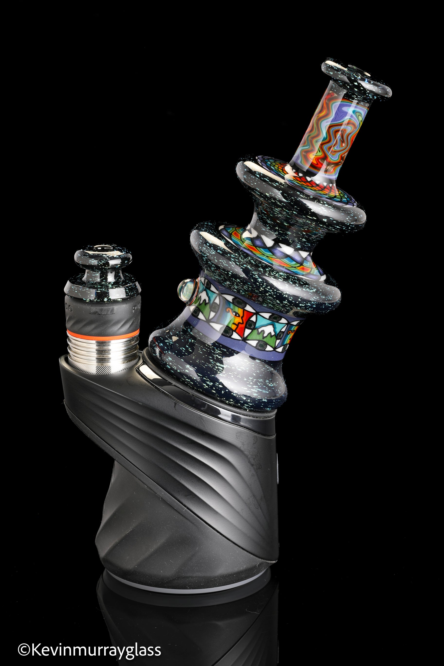 Hand made glass top for your puffco peak. Blue/gold dichro over black with three hand drawn fillacello sections and some uv reactive wig wag work. Signed with the signature/year murrine. Clear bottom to let the puffco light show though. Include an apache 1800 hard case.