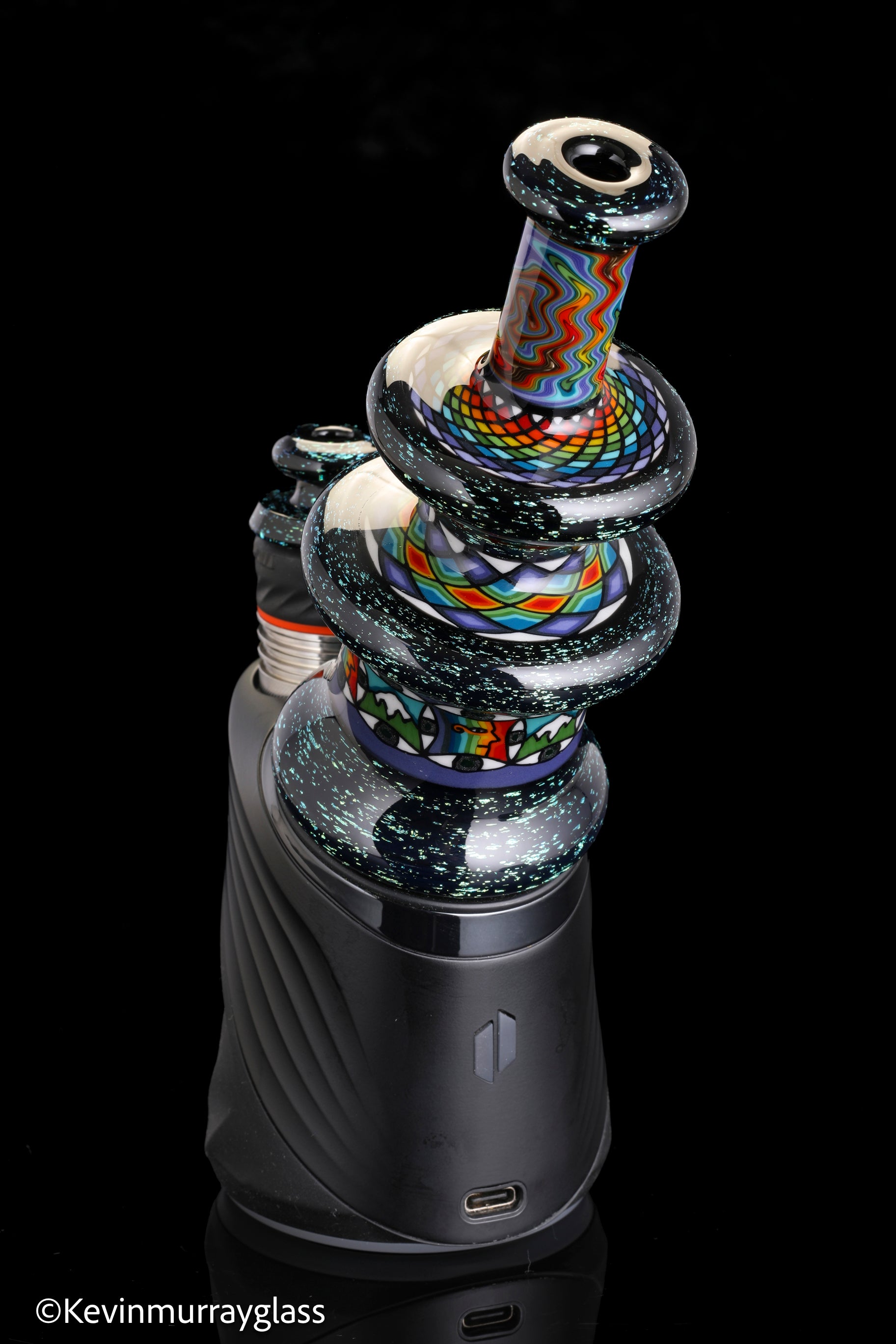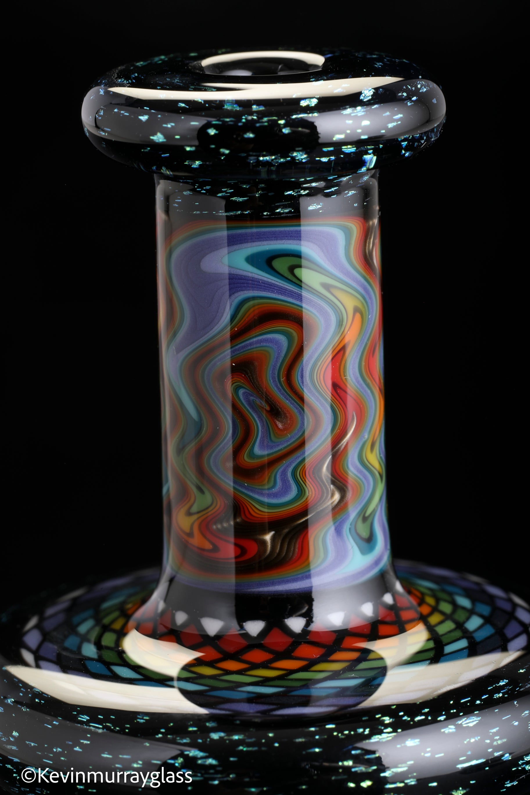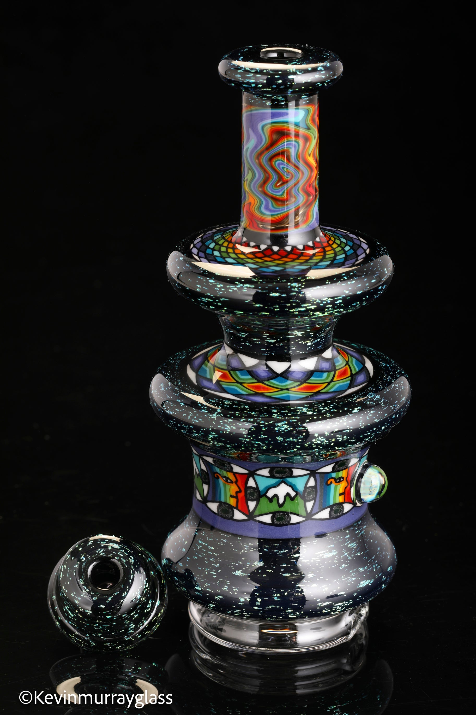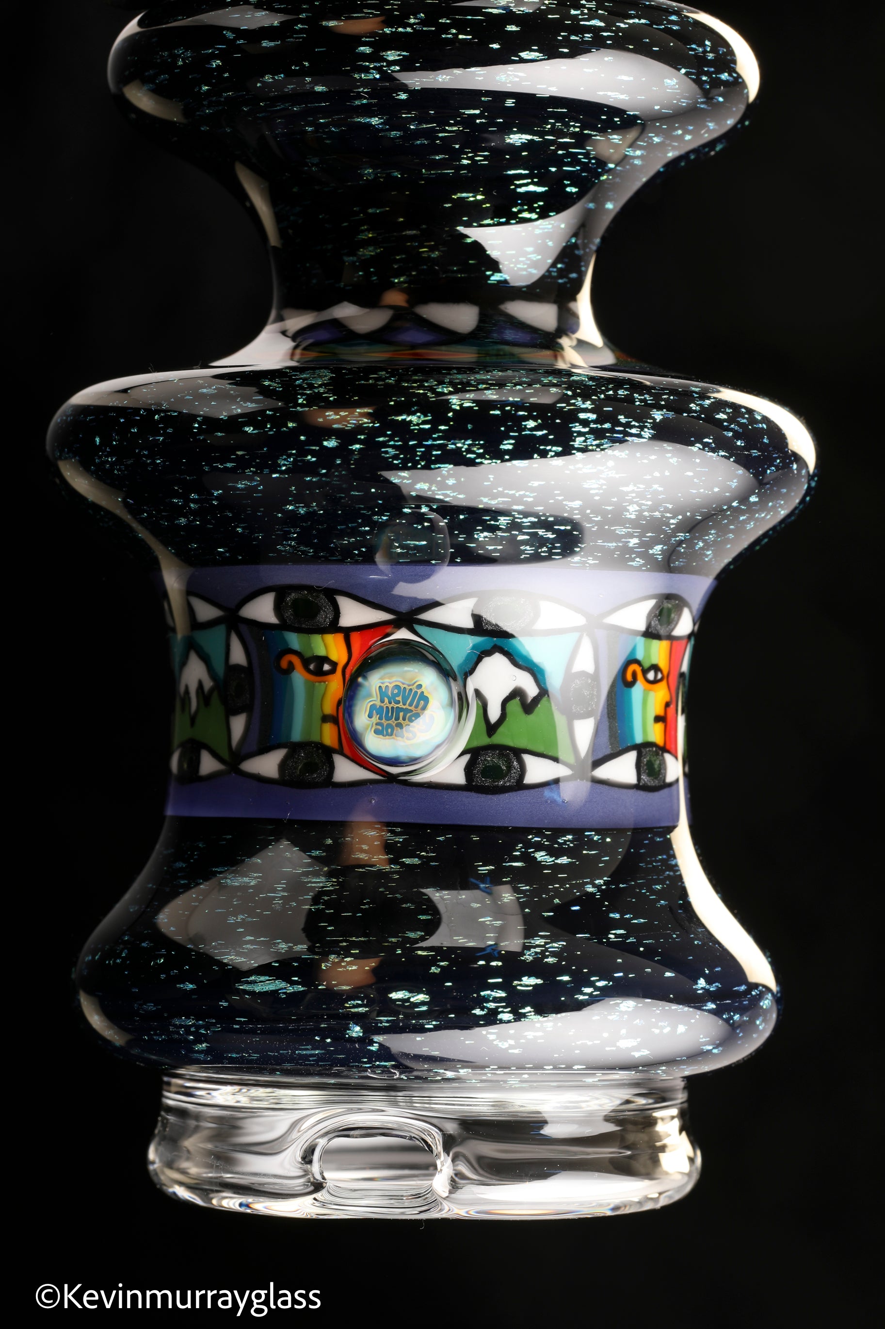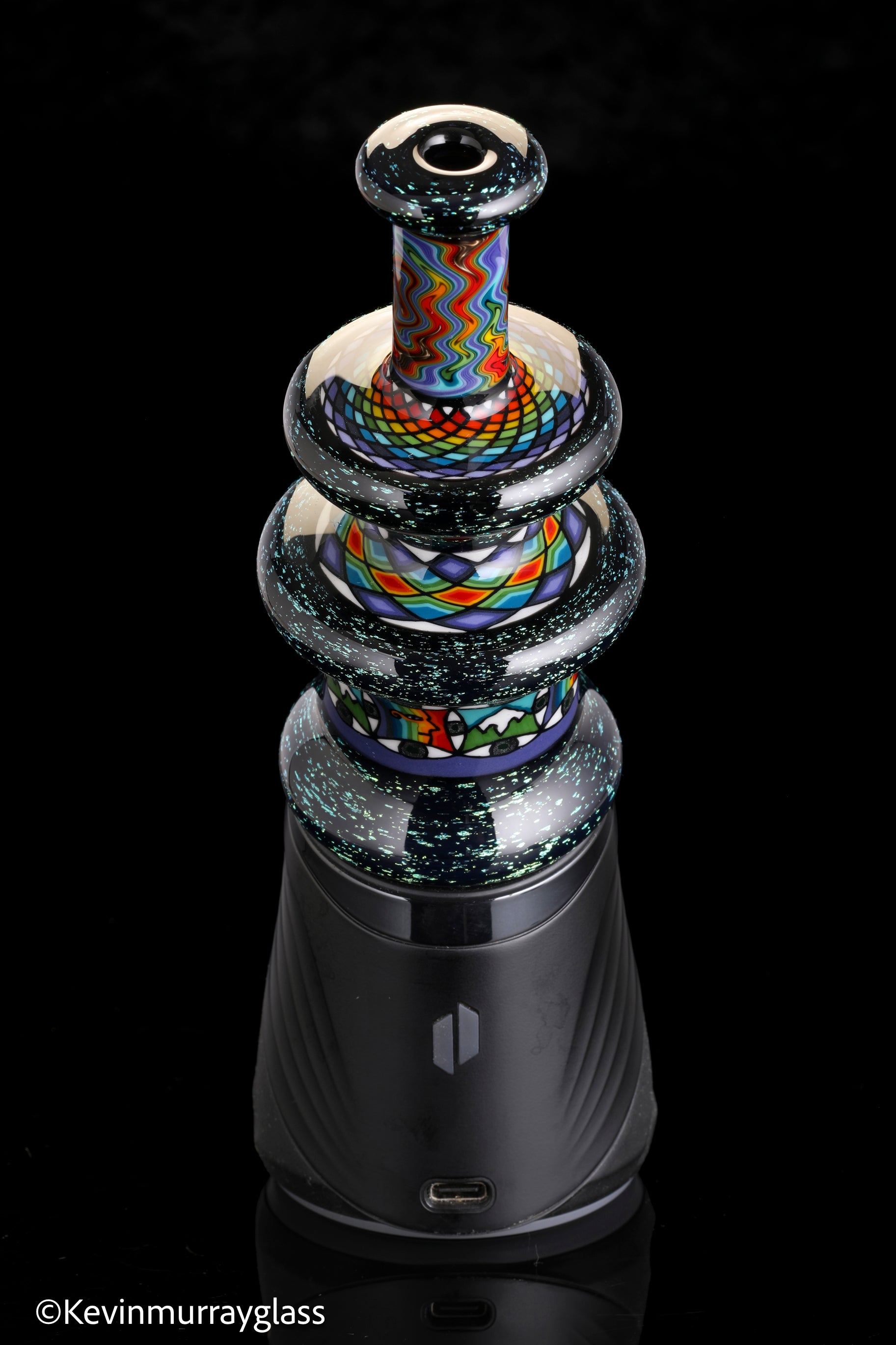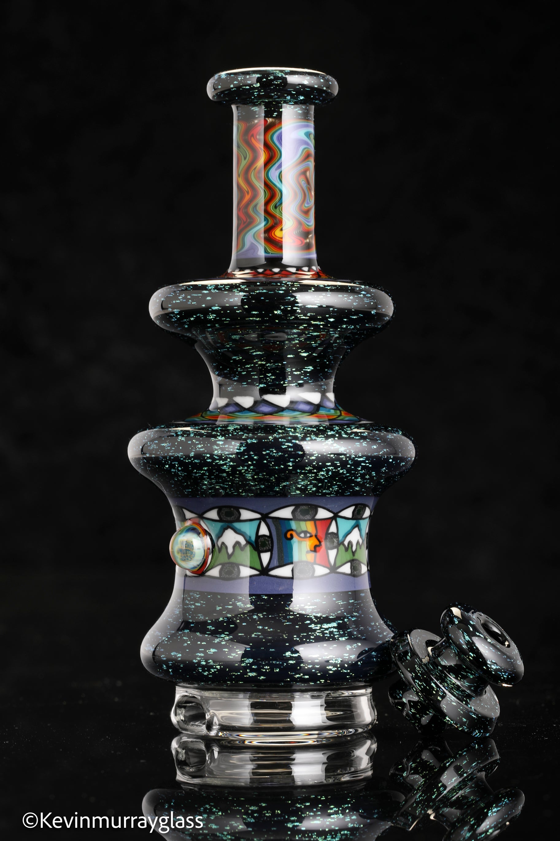 Hand made glass top for your puffco peak. Blue/gold dichro over black with three hand drawn fillacello sections and some uv reactive wig wag work. Signed with the signature/year murrine. Clear bottom to let the puffco light show though. Include an apache 1800 hard case.