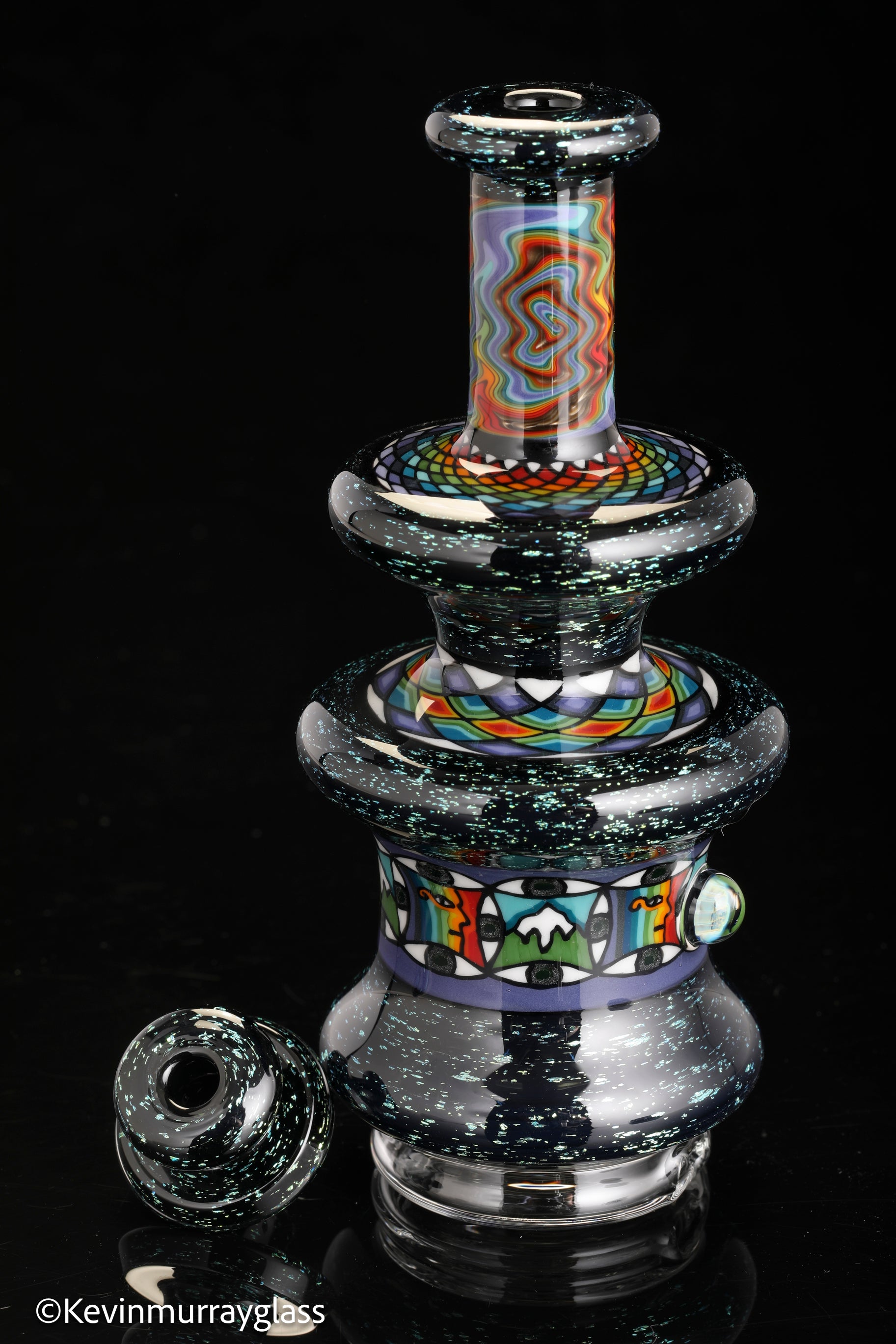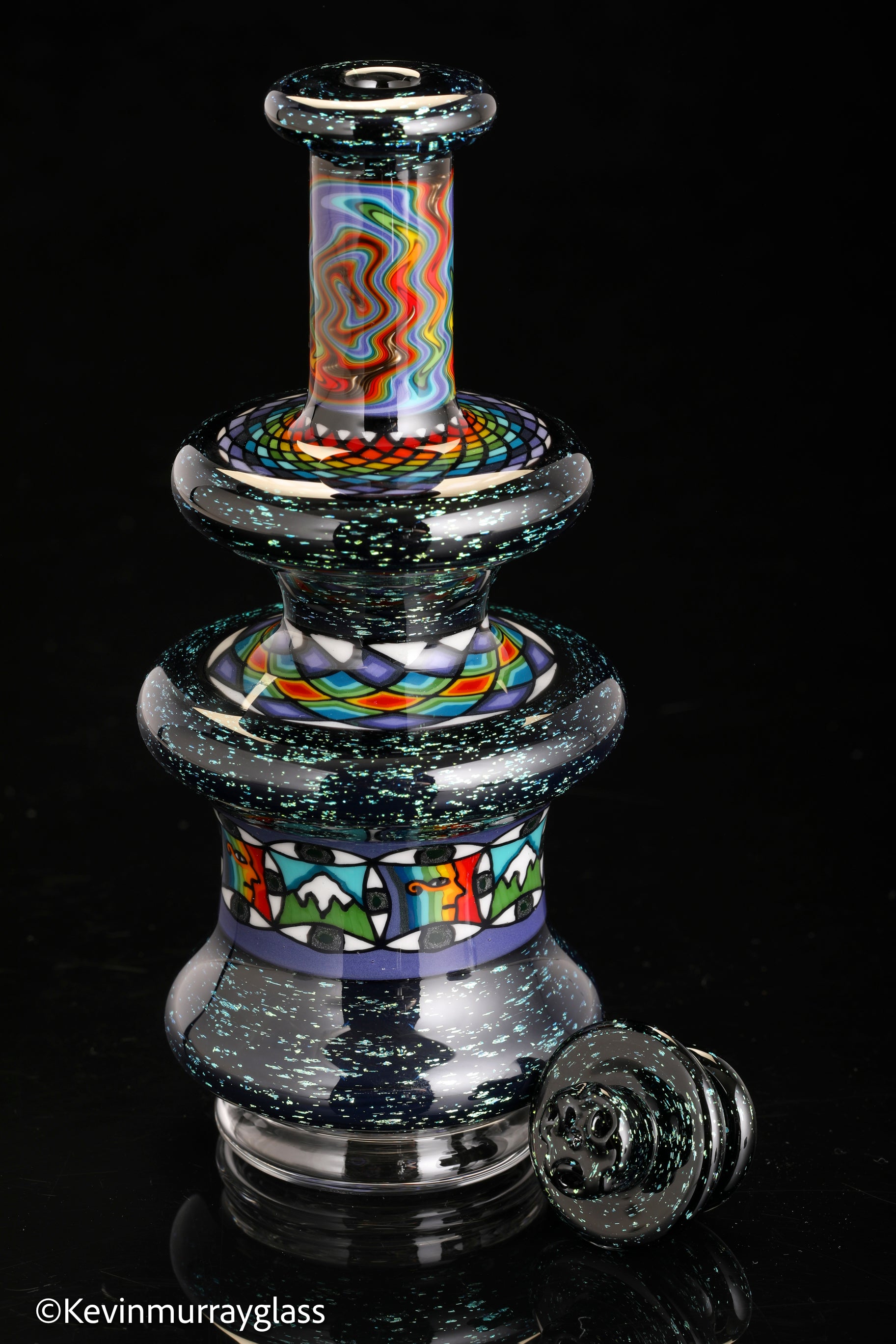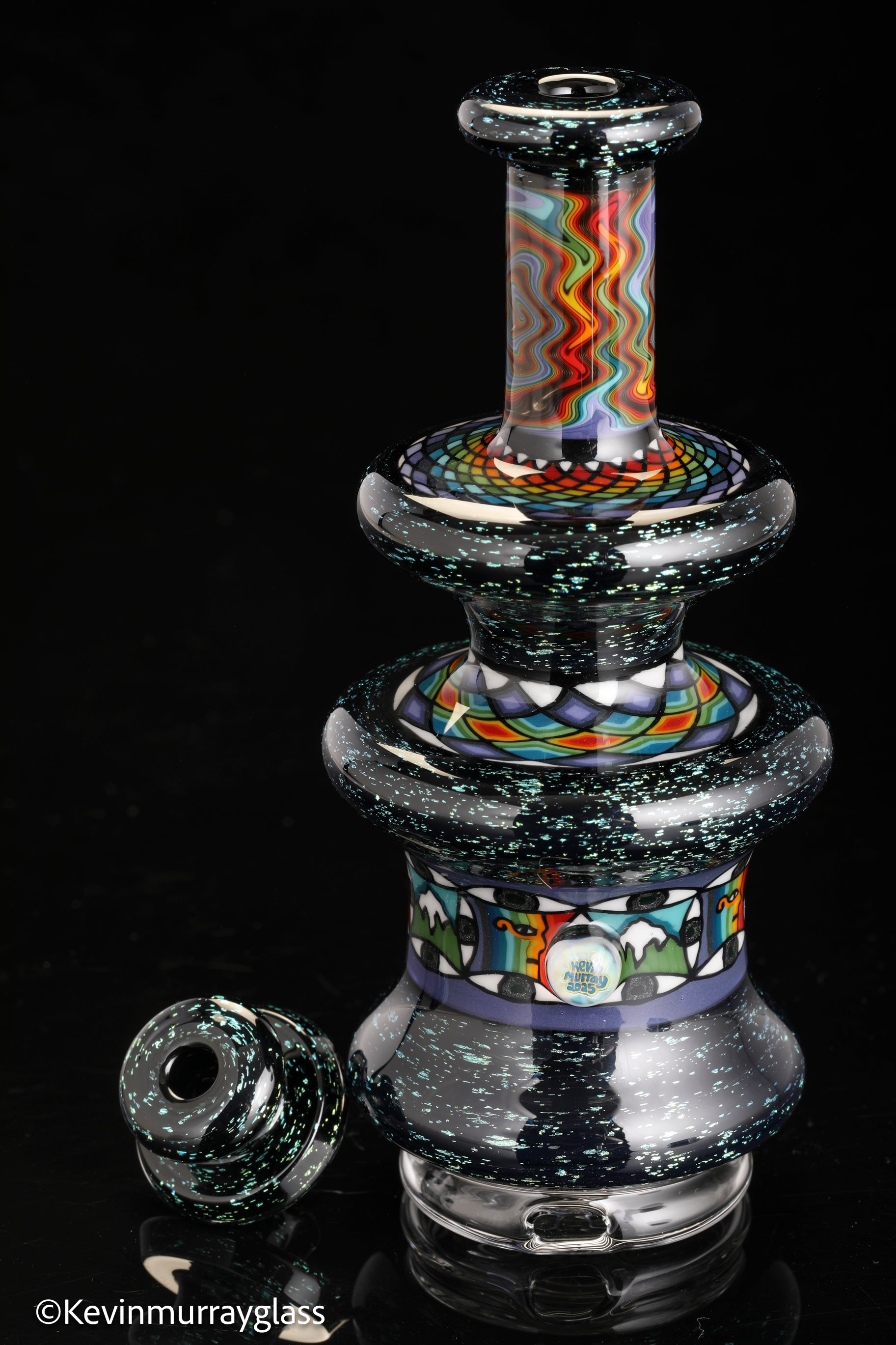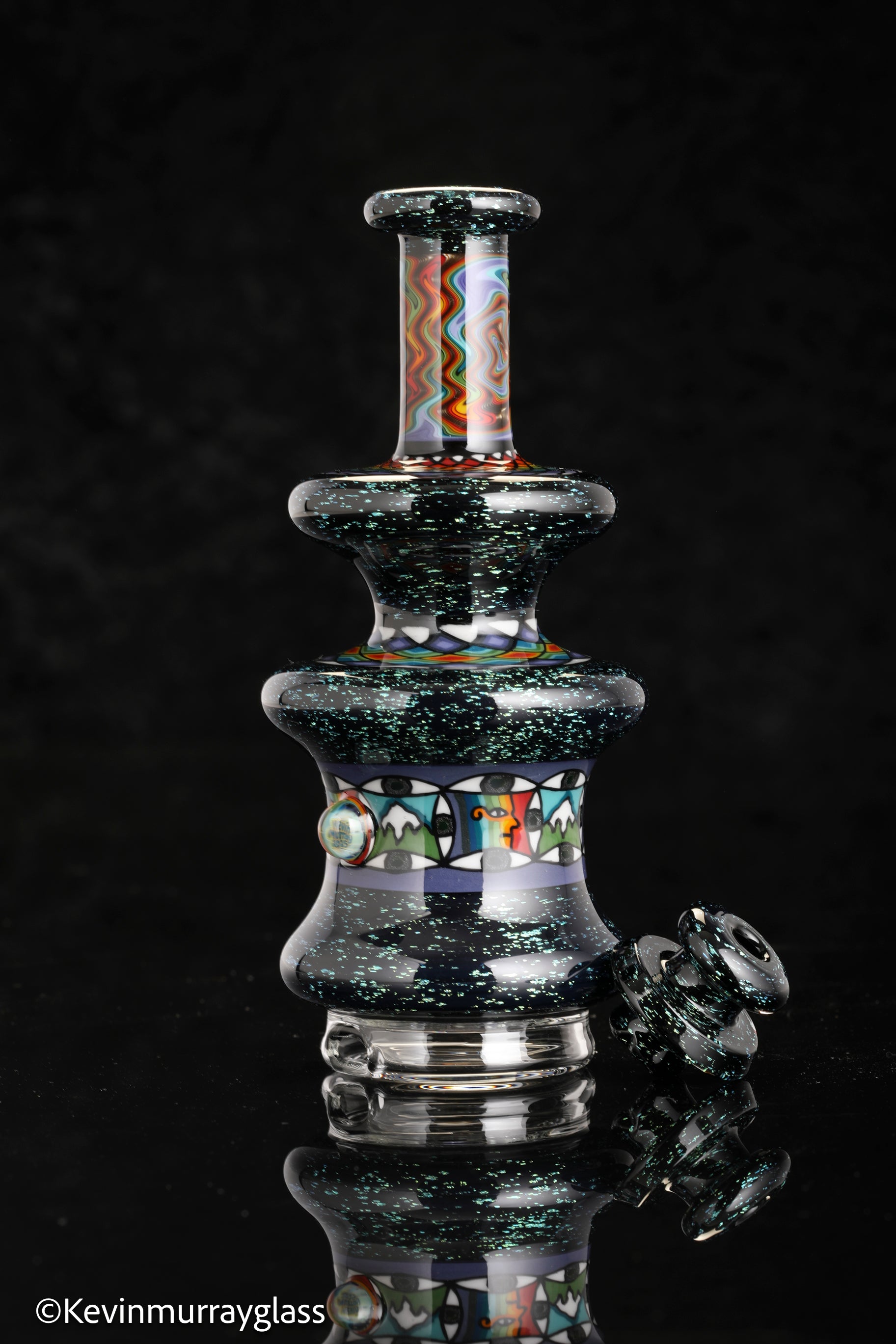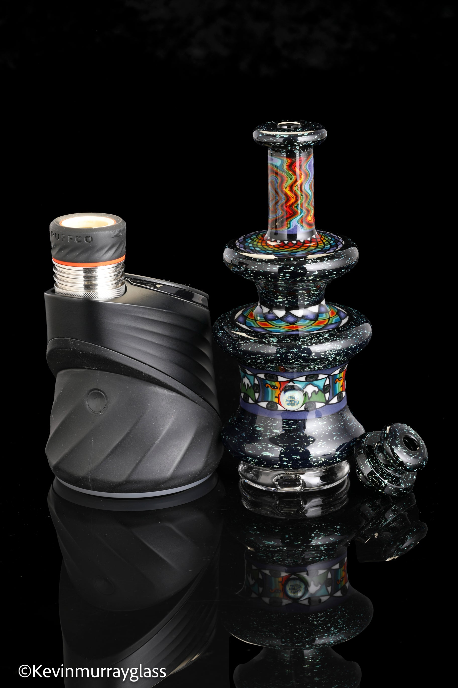 Hand made glass top for your puffco peak. Blue/gold dichro over black with three hand drawn fillacello sections and some uv reactive wig wag work. Signed with the signature/year murrine. Clear bottom to let the puffco light show though. Include an apache 1800 hard case.