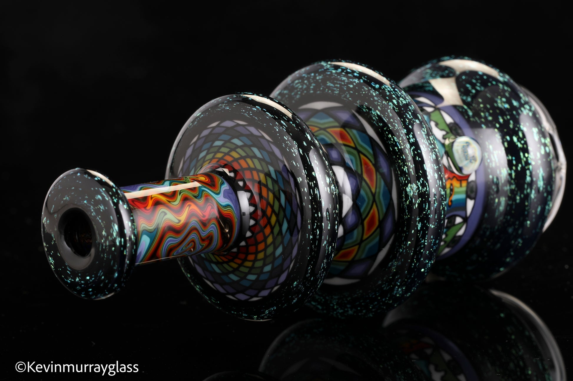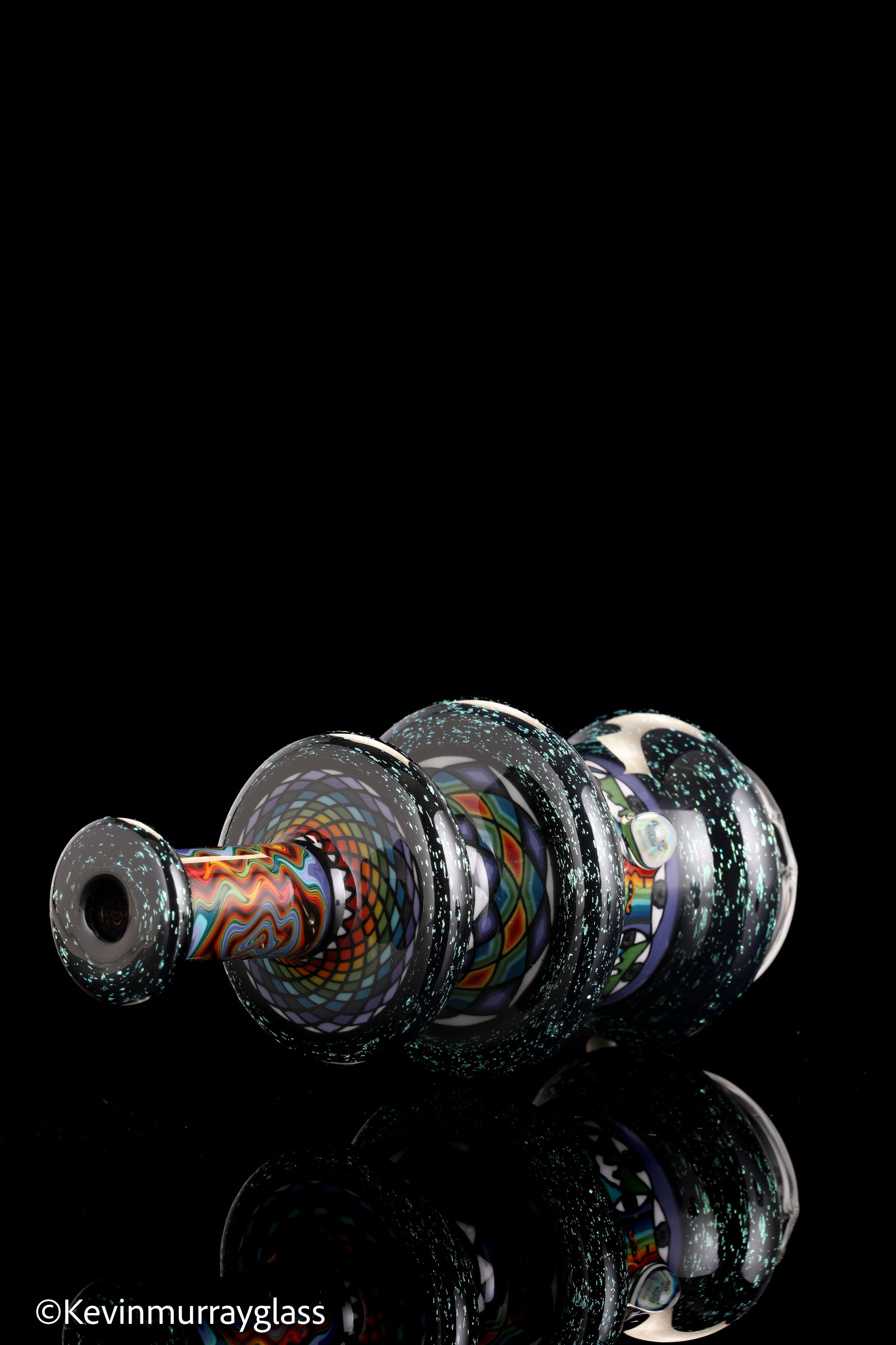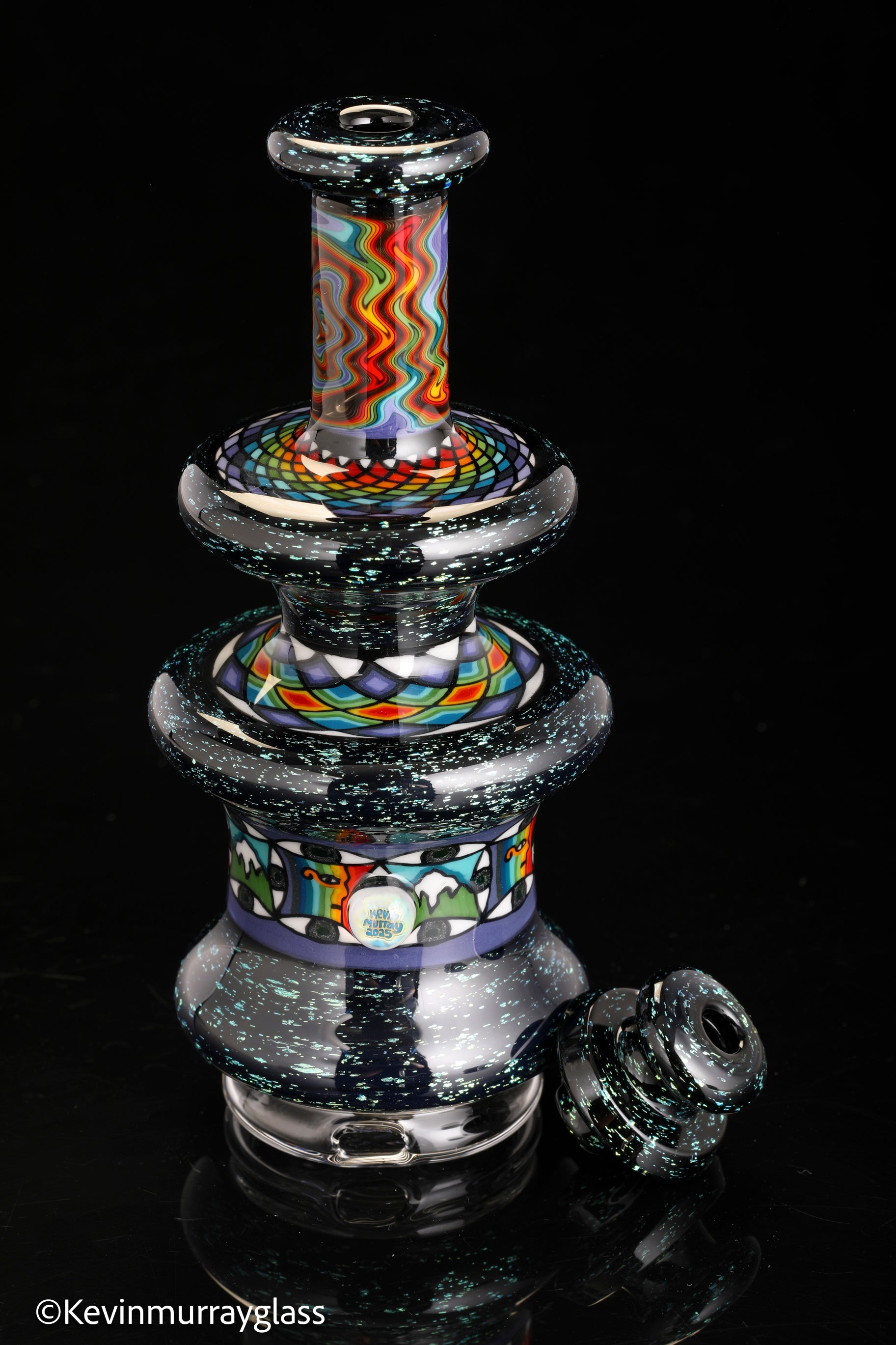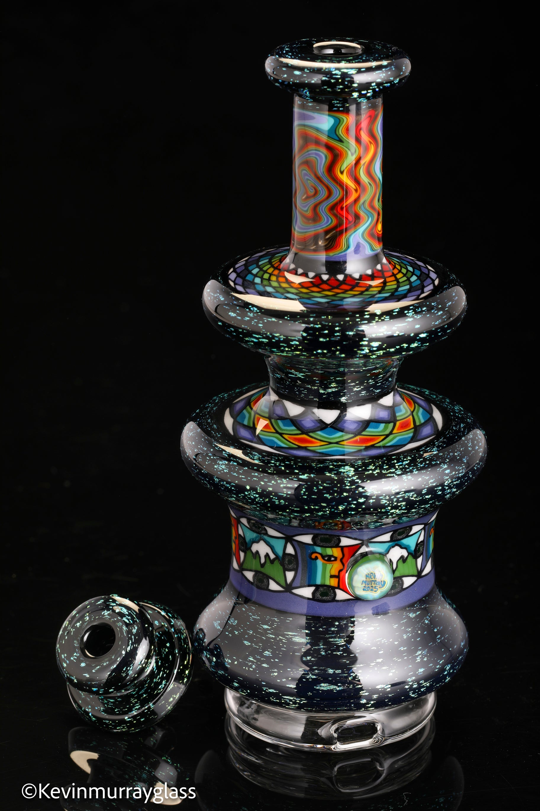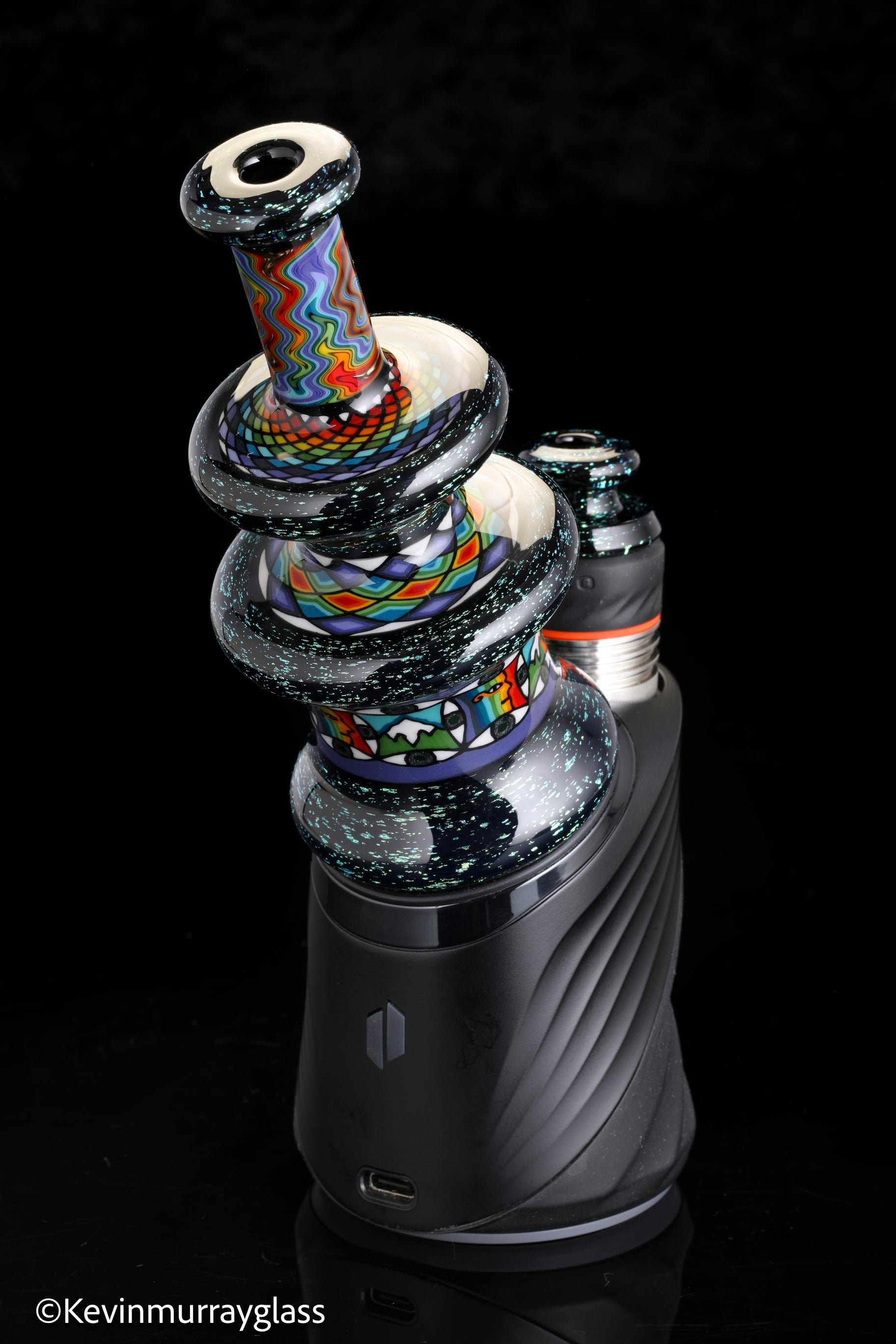 Hand made glass top for your puffco peak. Blue/gold dichro over black with three hand drawn fillacello sections and some uv reactive wig wag work. Signed with the signature/year murrine. Clear bottom to let the puffco light show though. Include an apache 1800 hard case.
