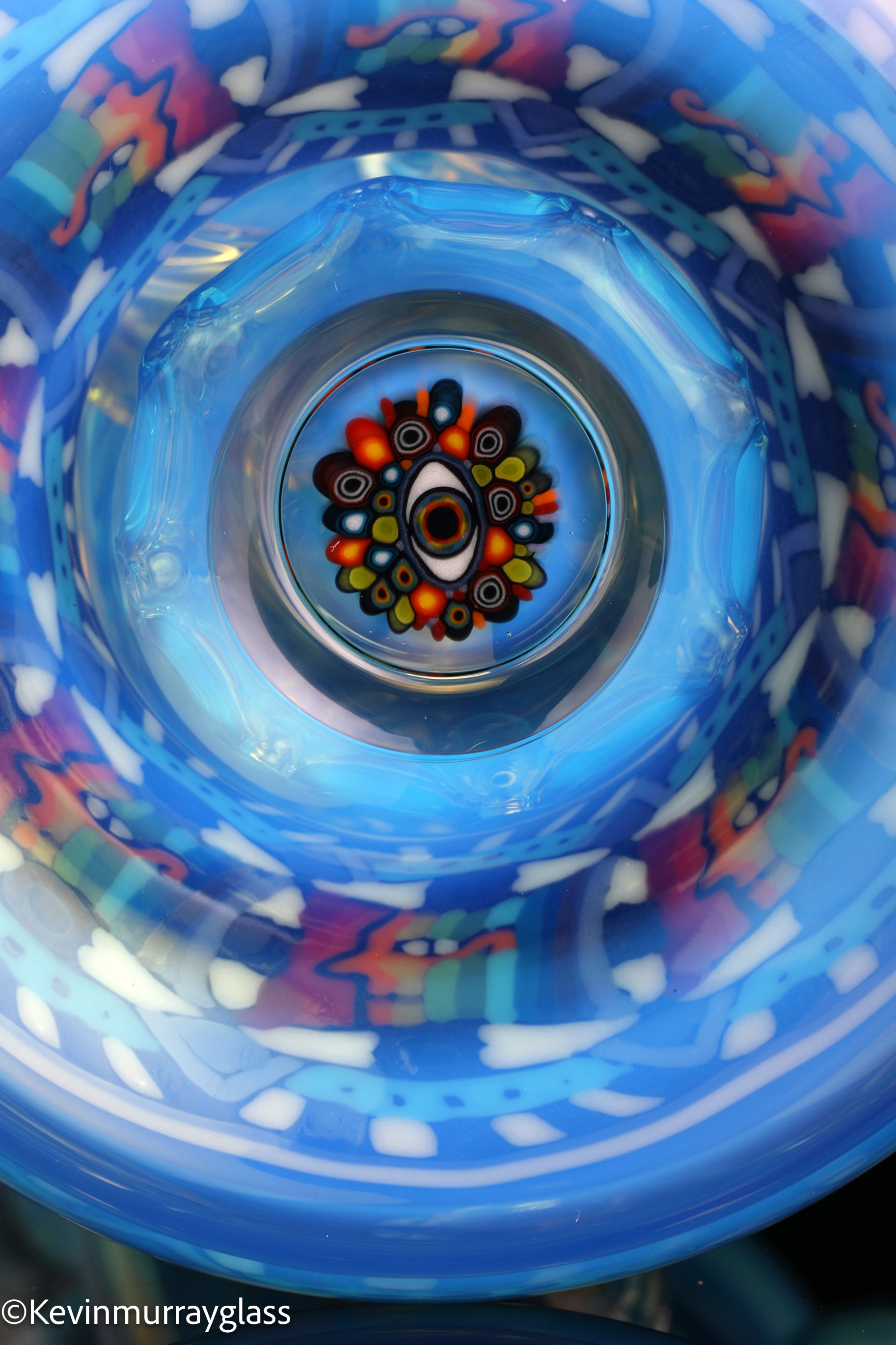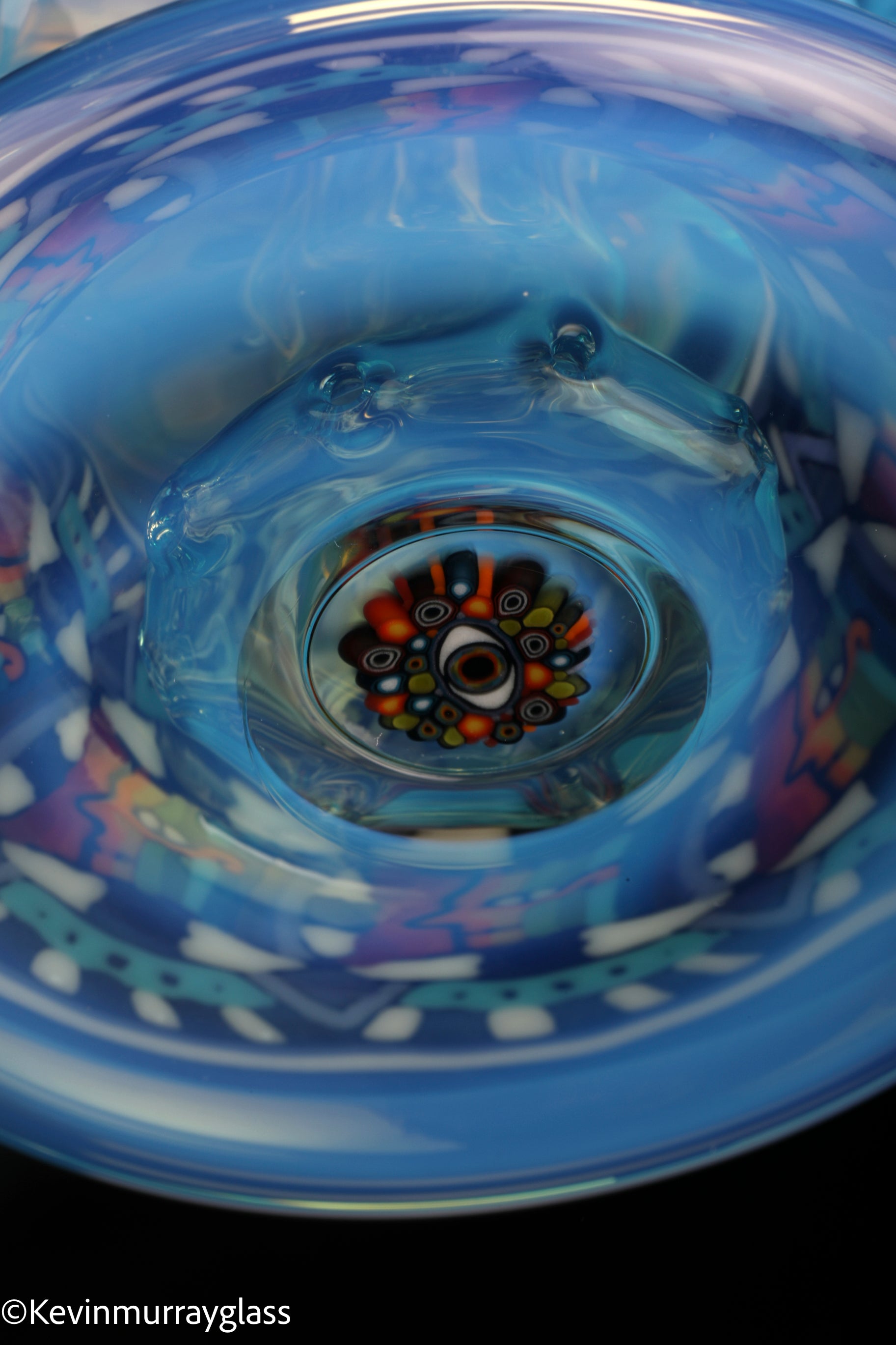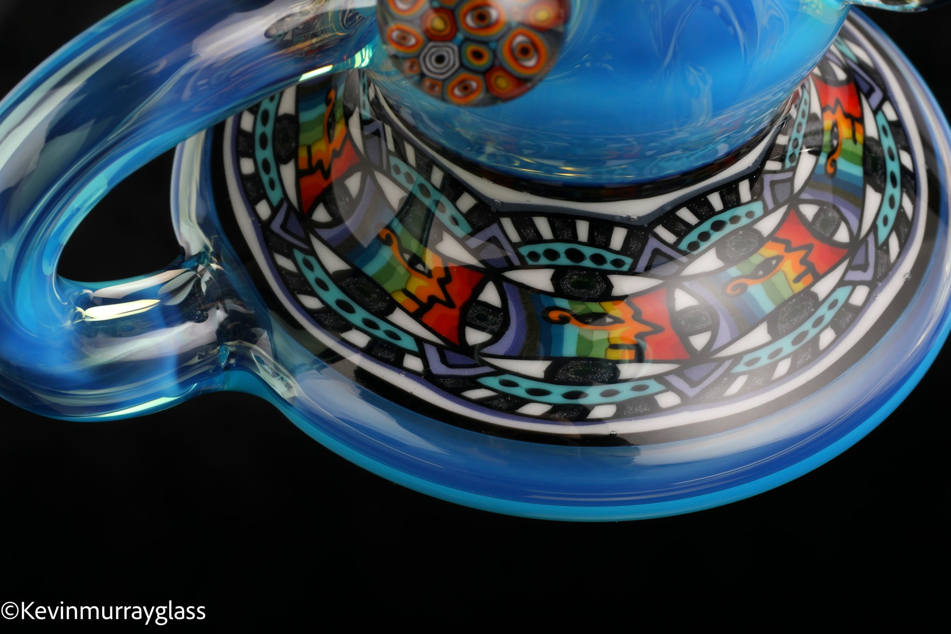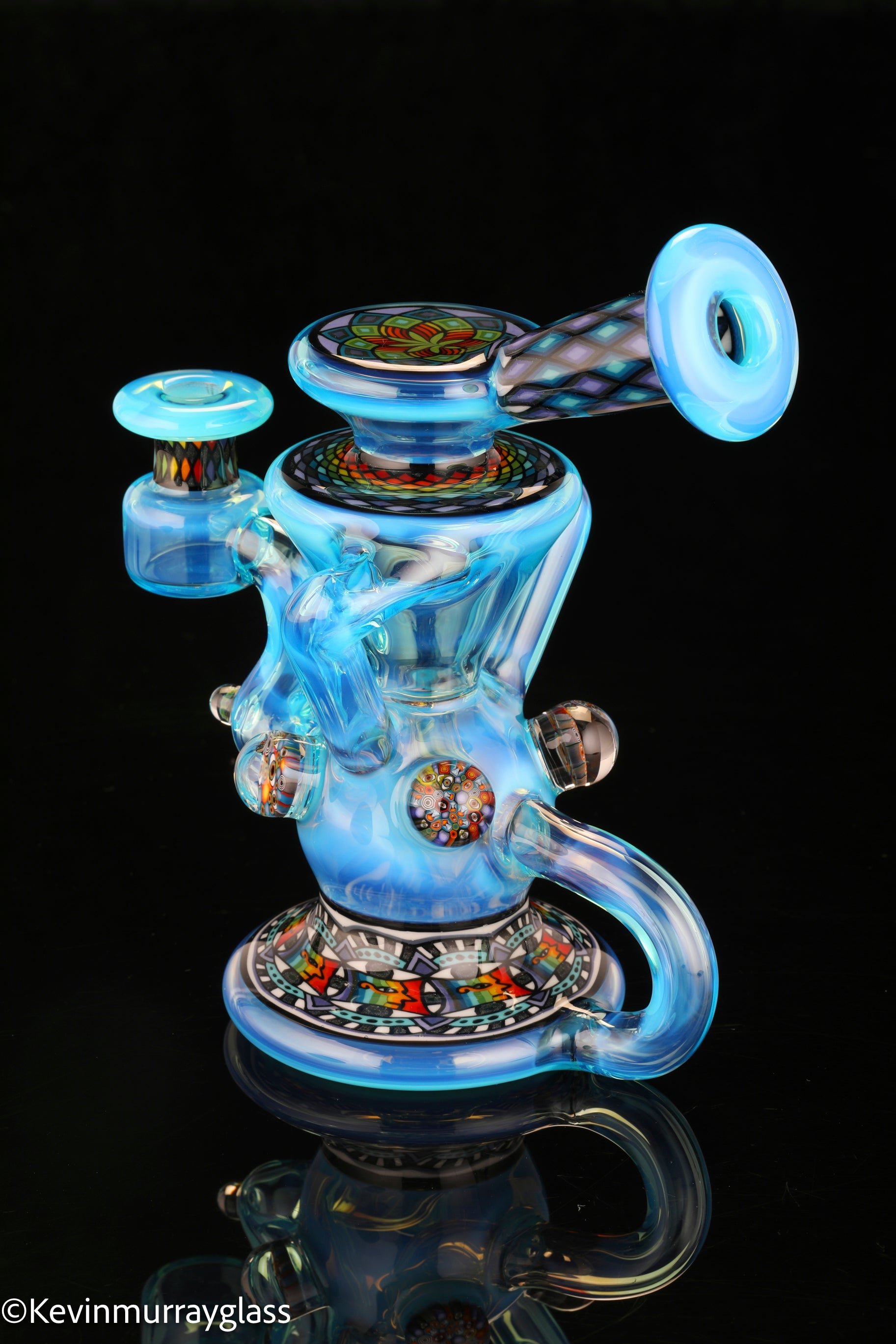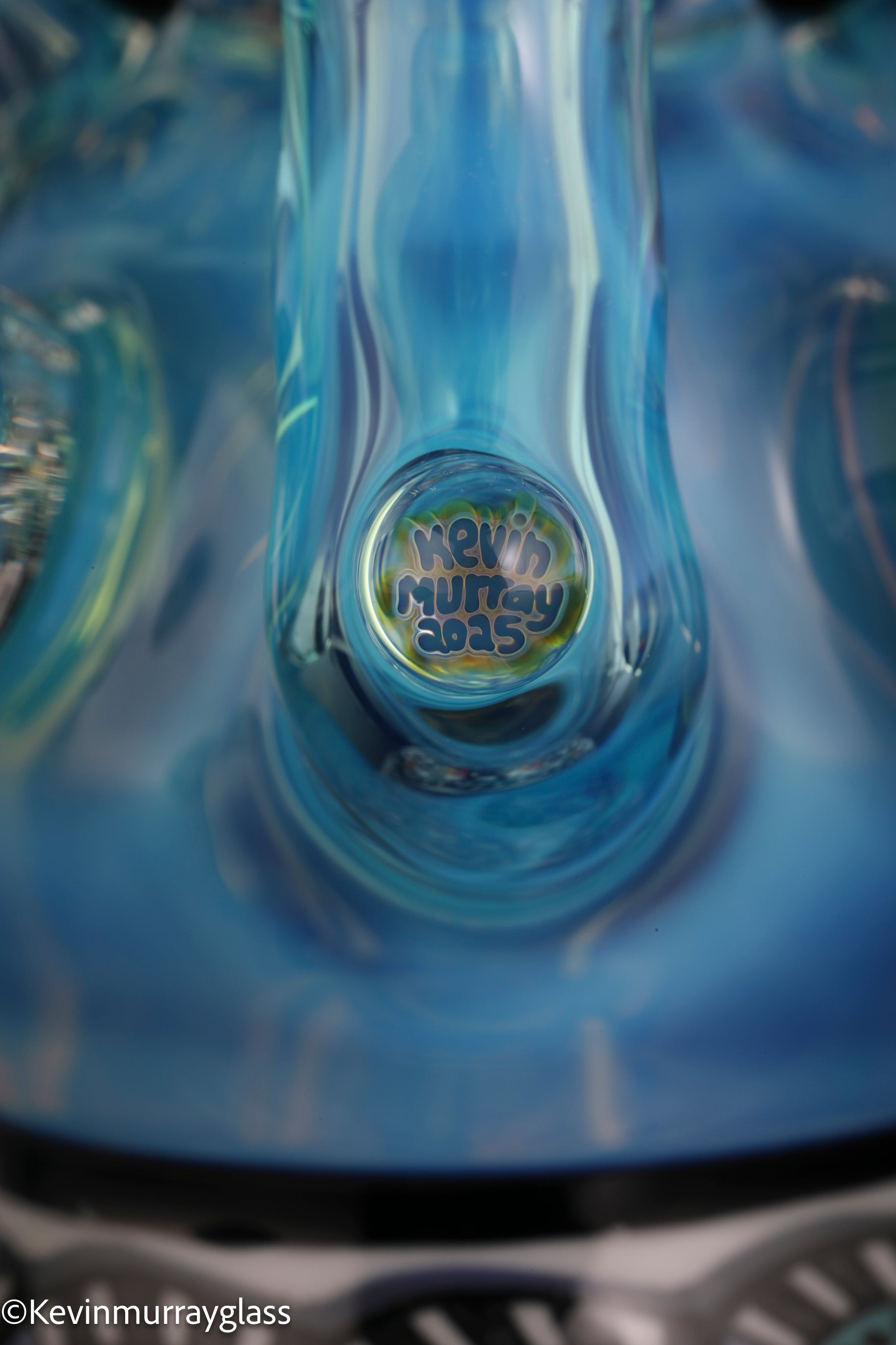 Fully work klein style recycler with double uptakes, 10m 90 degree hand ground joint and 8 hole perk. Super detailed "face melter' fillacello section on the base and "chip weave" filla with leaf termination point on the top disc. Metaterania teal blue tubing. Signed with the signature/year murrine. Includes a signed pelican 1150 hard case.