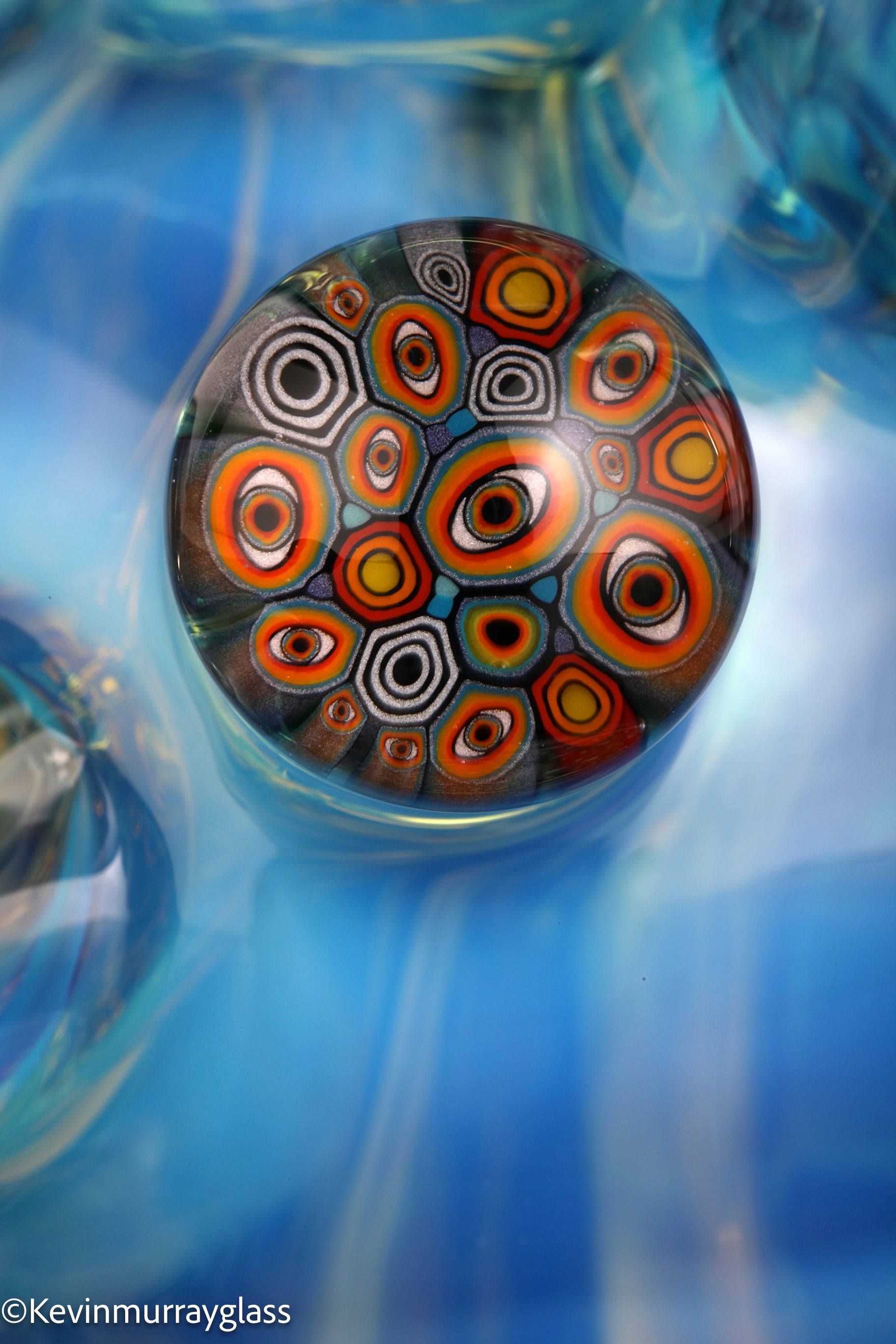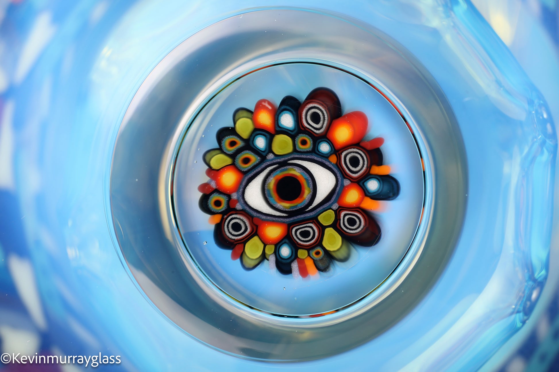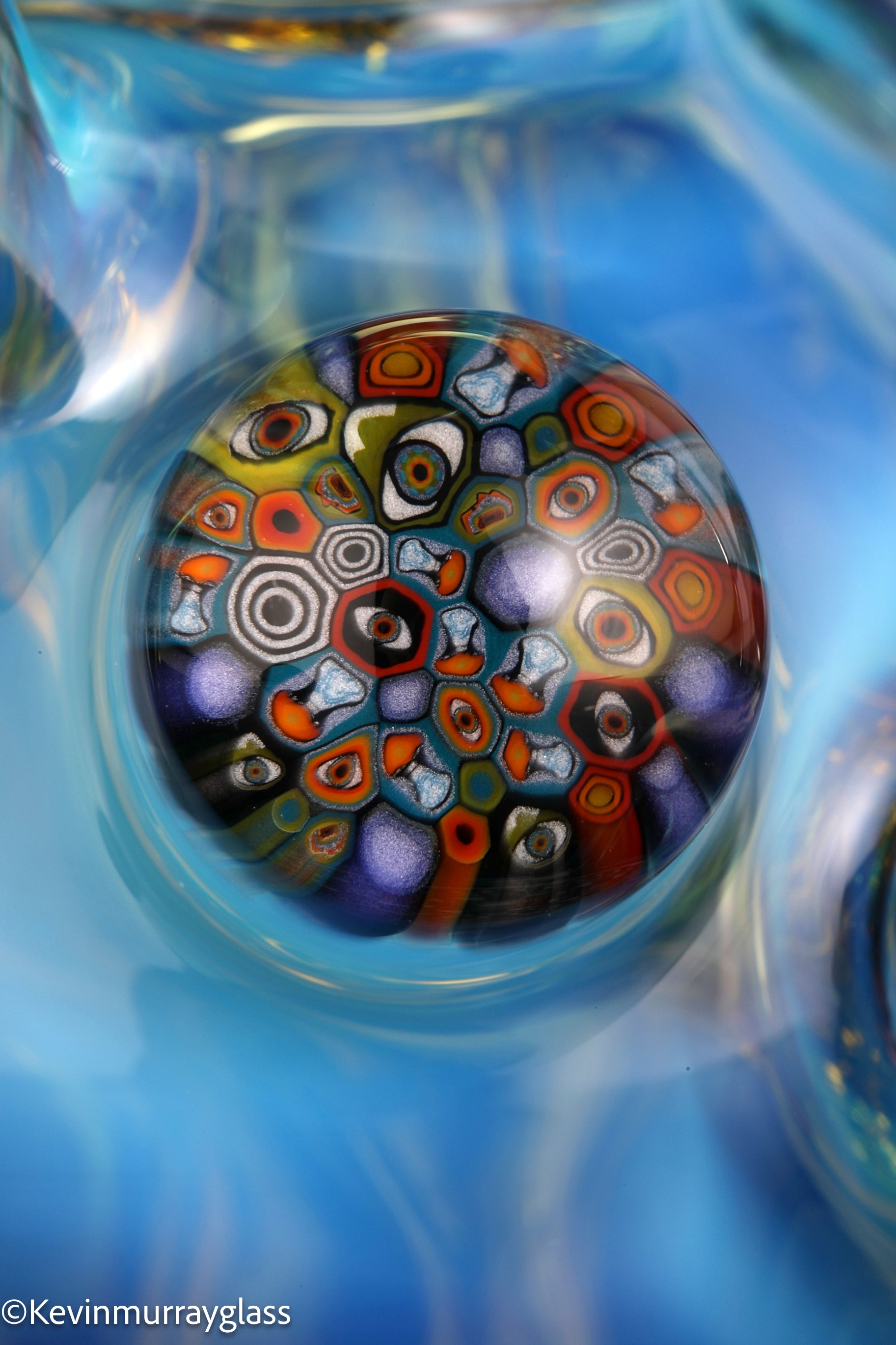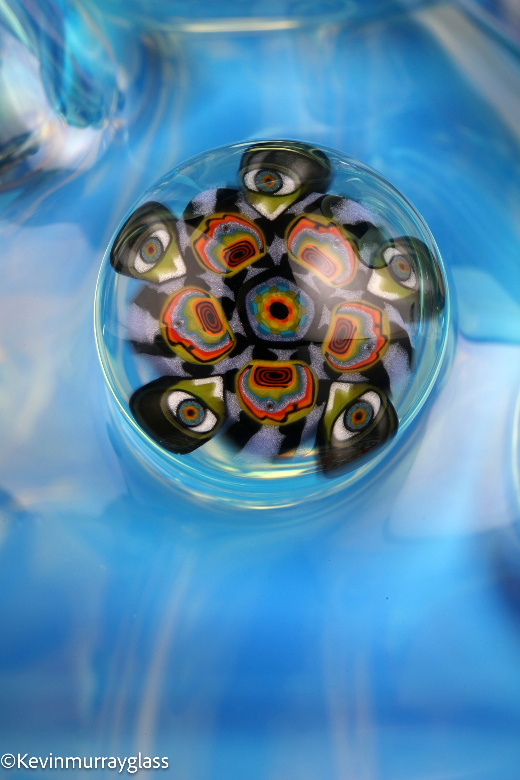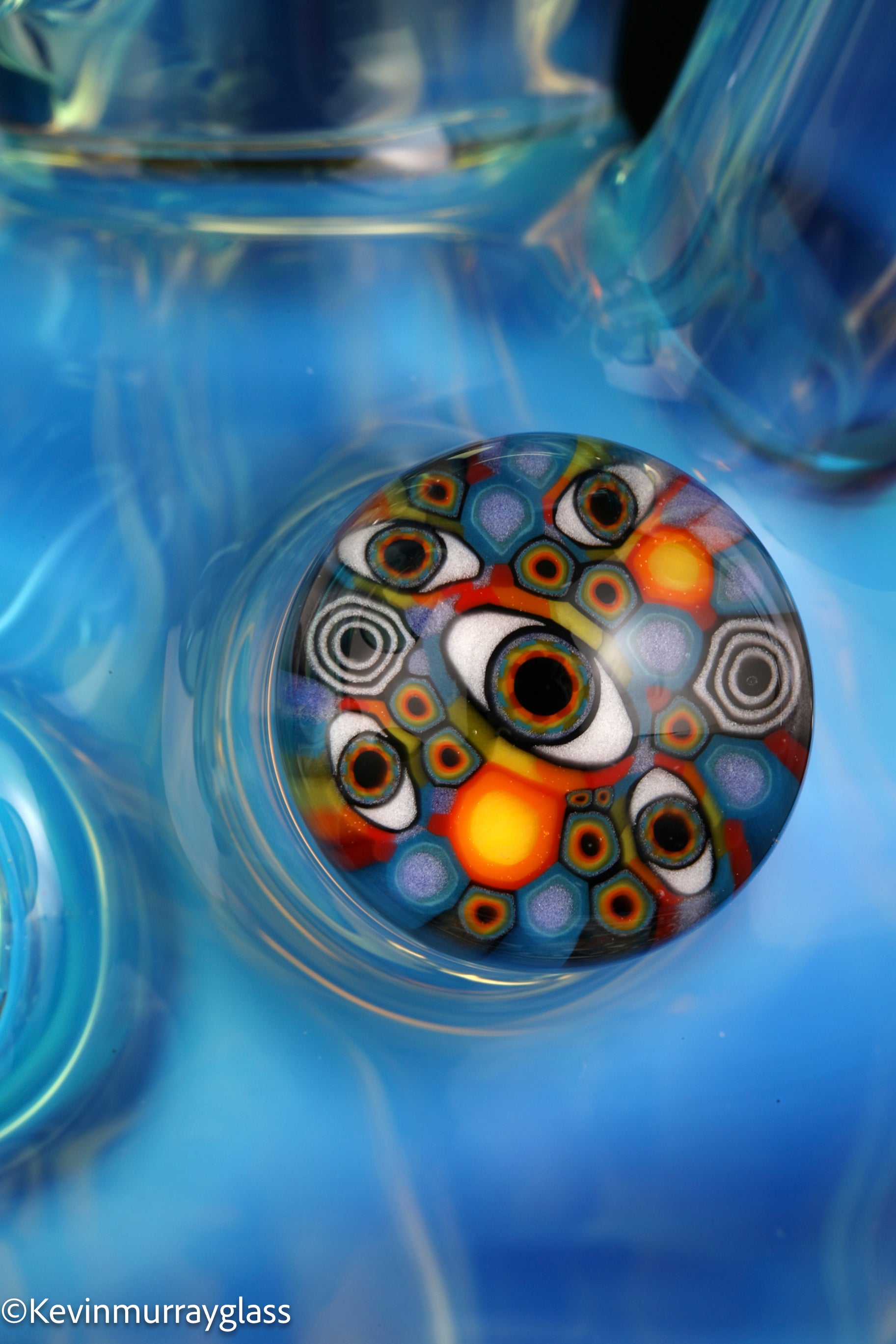 Fully work klein style recycler with double uptakes, 10m 90 degree hand ground joint and 8 hole perk. Super detailed "face melter' fillacello section on the base and "chip weave" filla with leaf termination point on the top disc. Metaterania teal blue tubing. Signed with the signature/year murrine. Includes a signed pelican 1150 hard case.