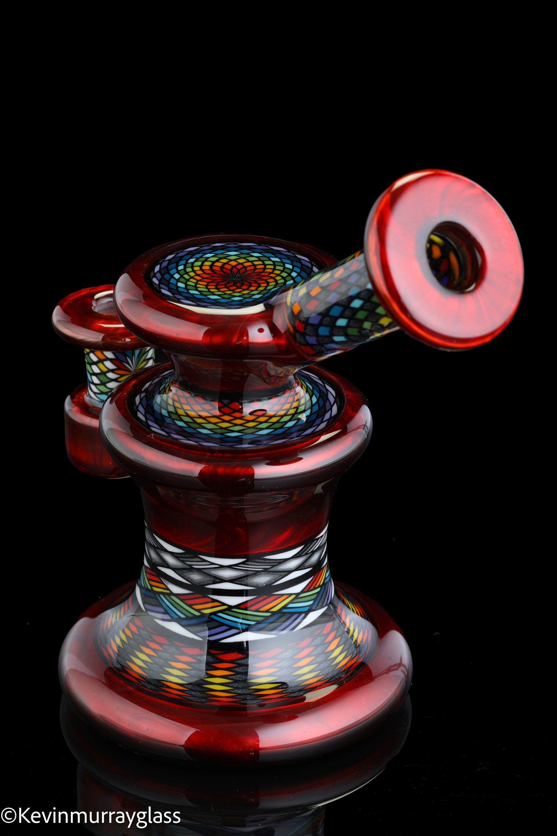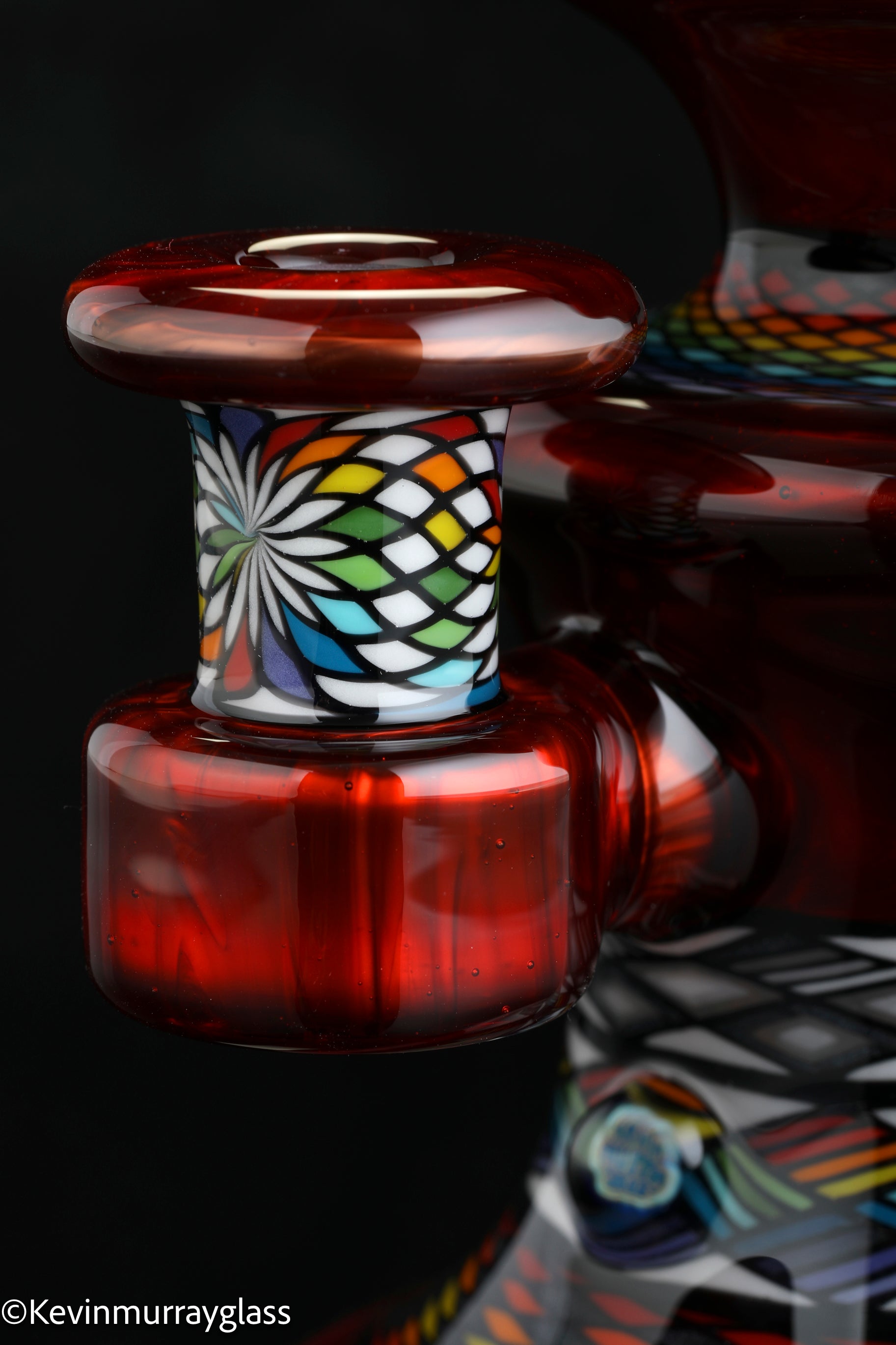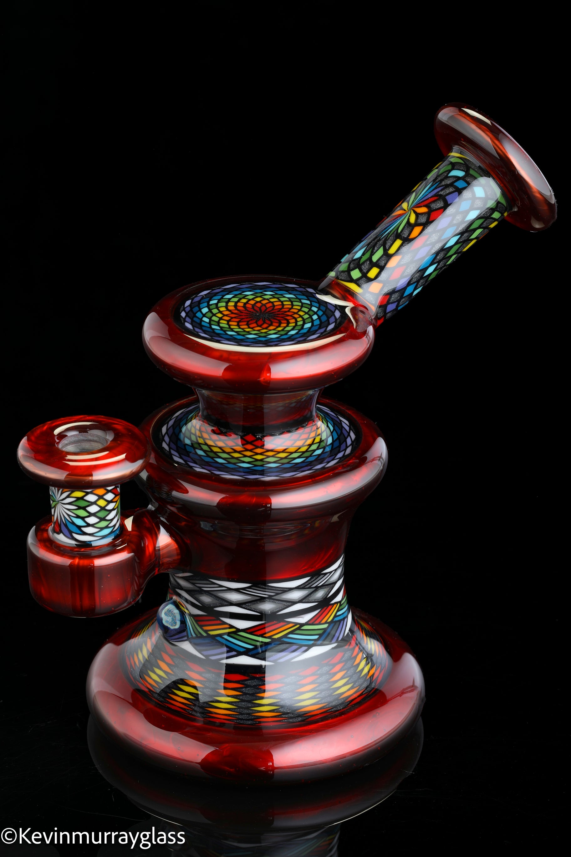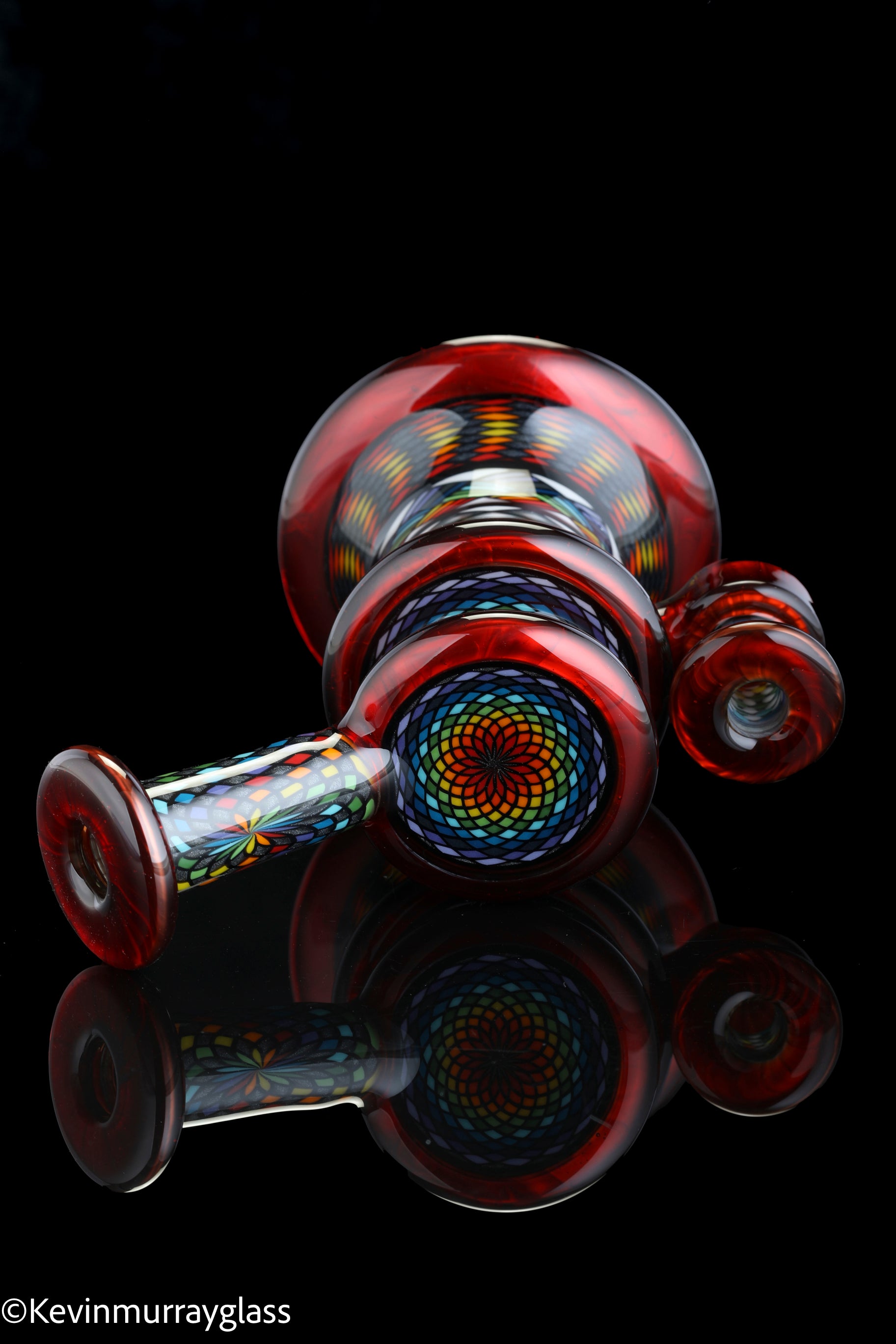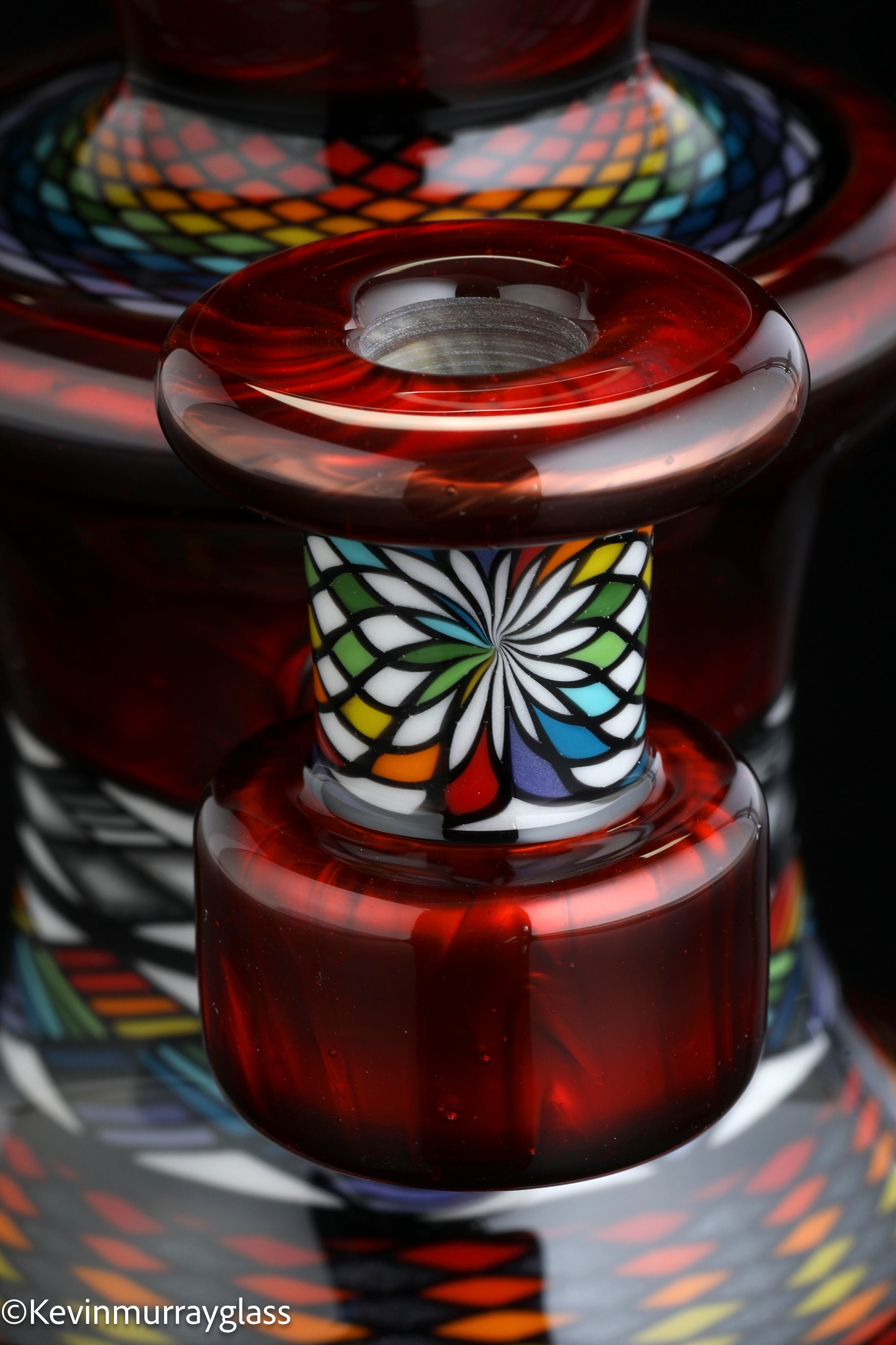 Kickback style rig In "candy apple red" with 7 hand drawn fillacello sections. 10mm hand ground 90 degree joint with a 4 hole perk. Signed with the signature/year murrine. Includes pelican 1150 hard case.