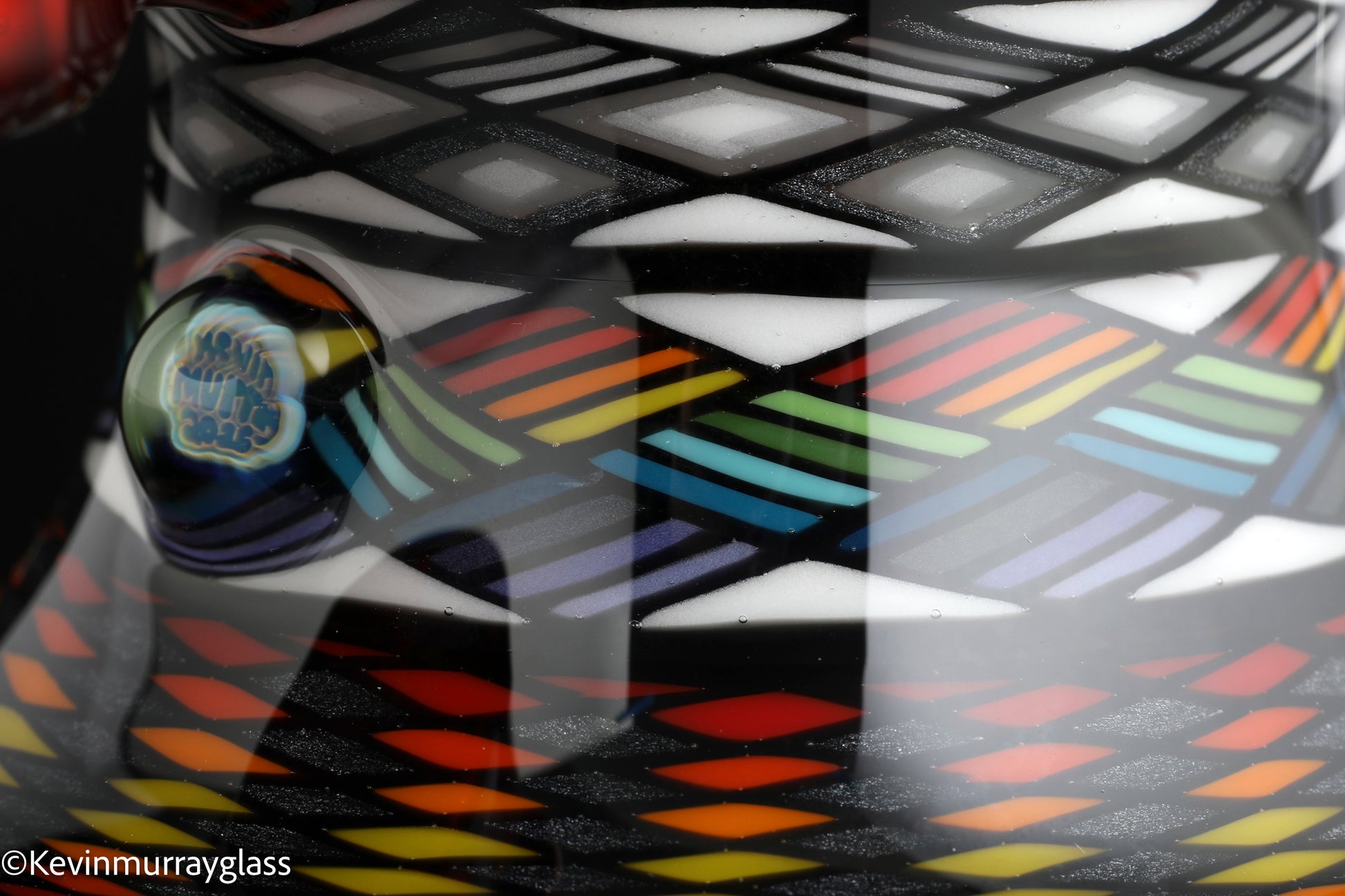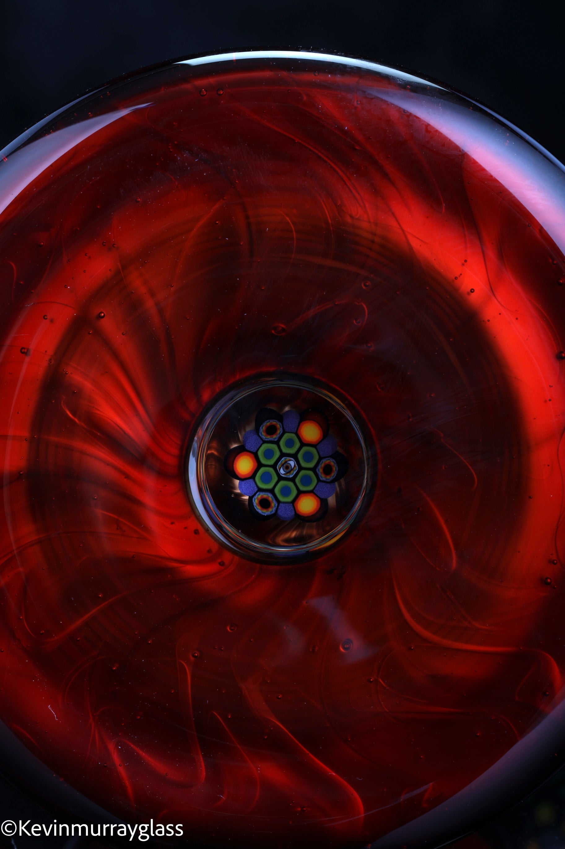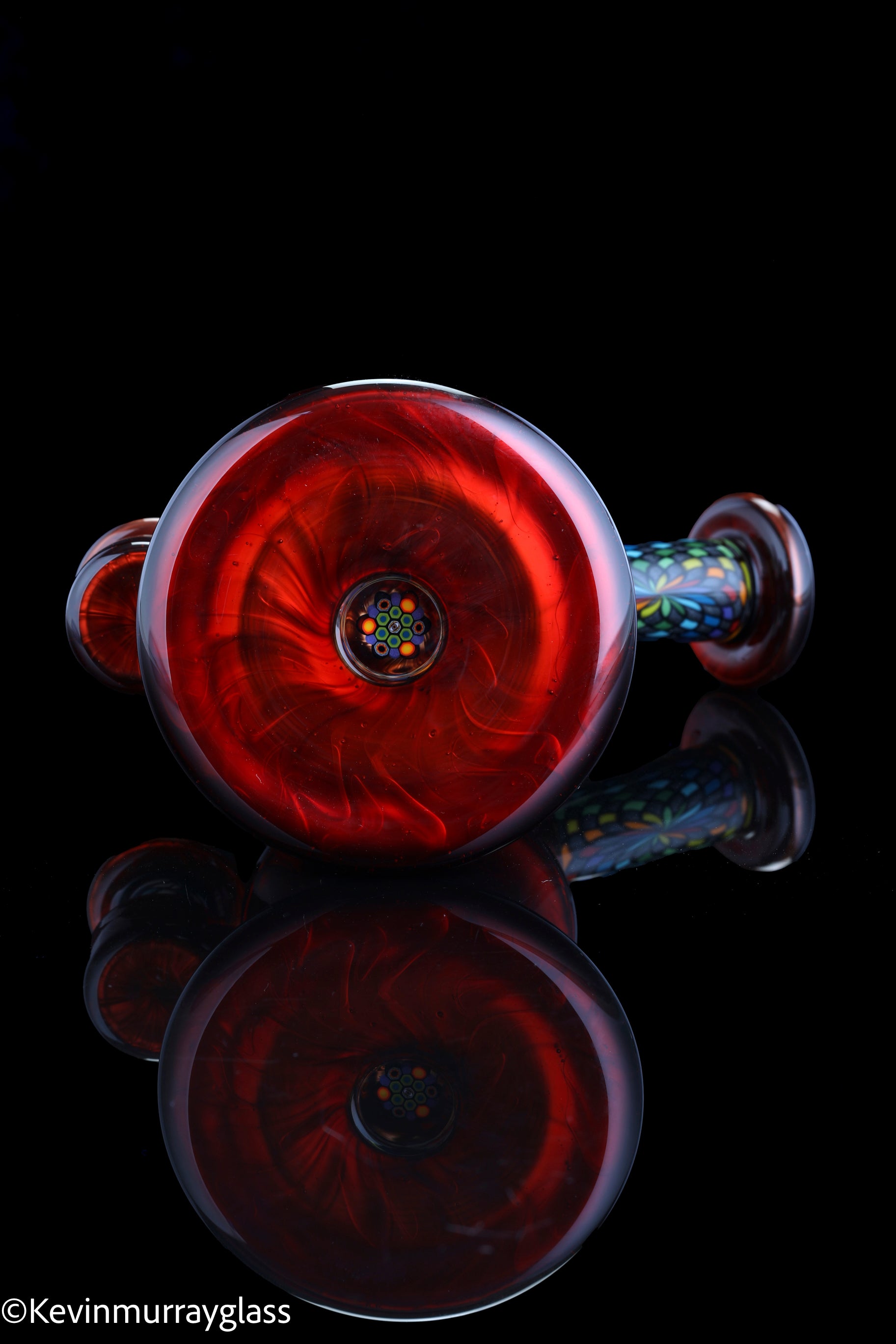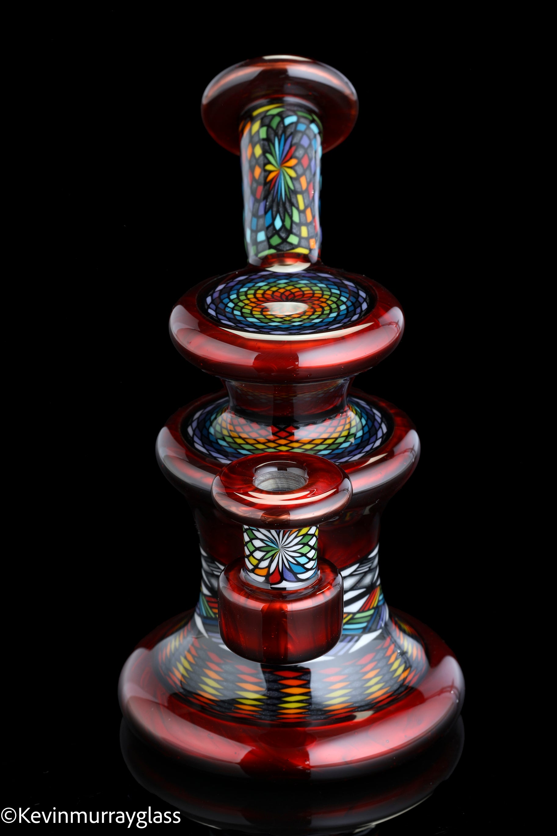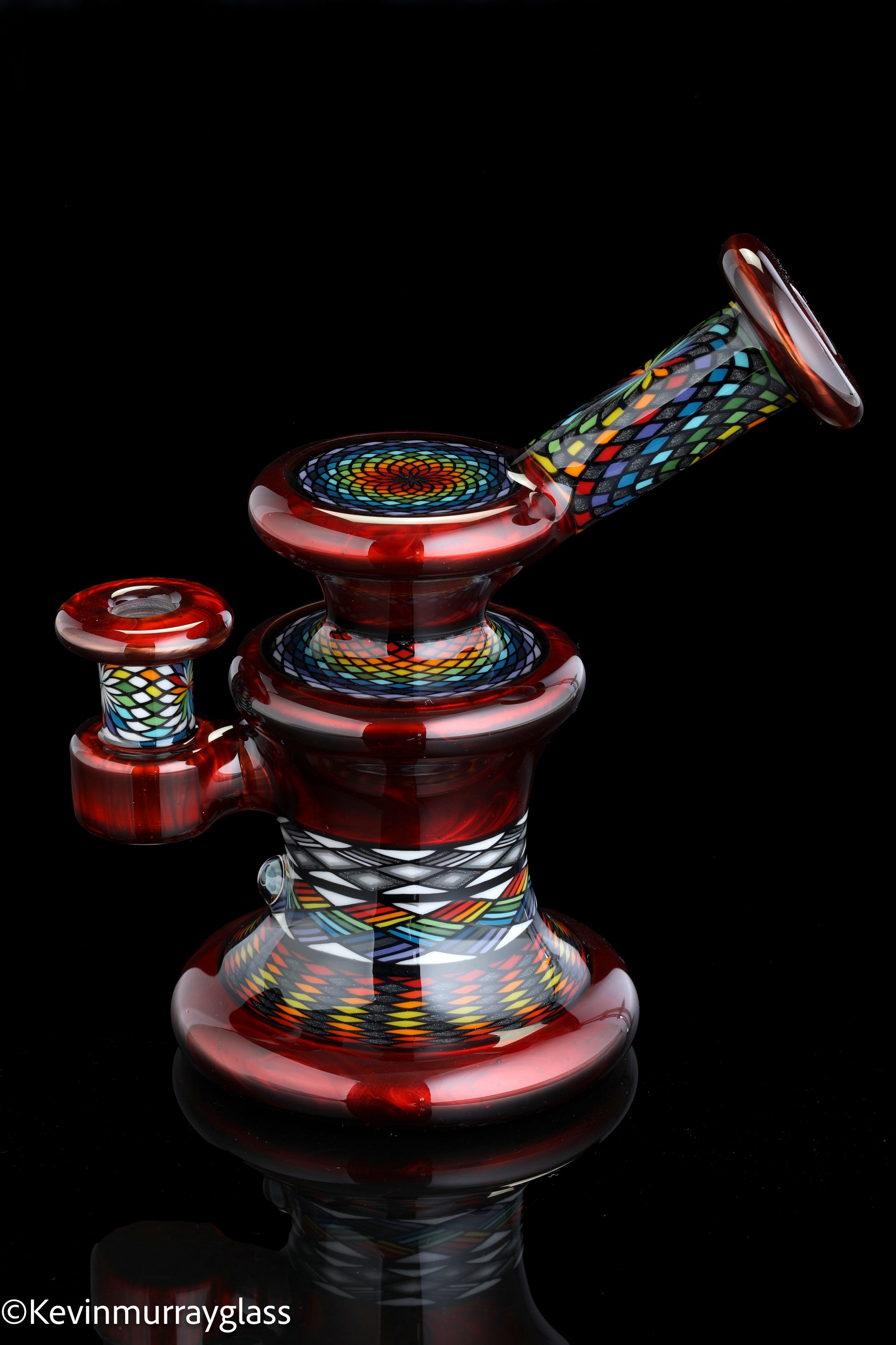 Kickback style rig In "candy apple red" with 7 hand drawn fillacello sections. 10mm hand ground 90 degree joint with a 4 hole perk. Signed with the signature/year murrine. Includes pelican 1150 hard case.
