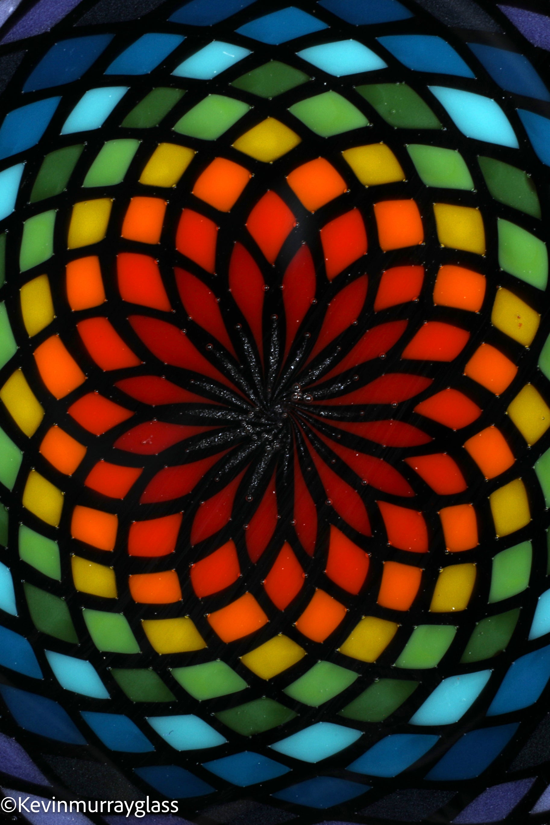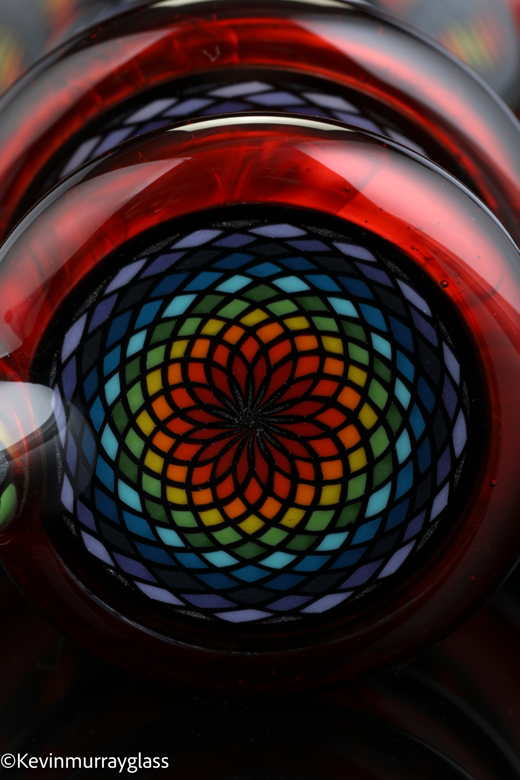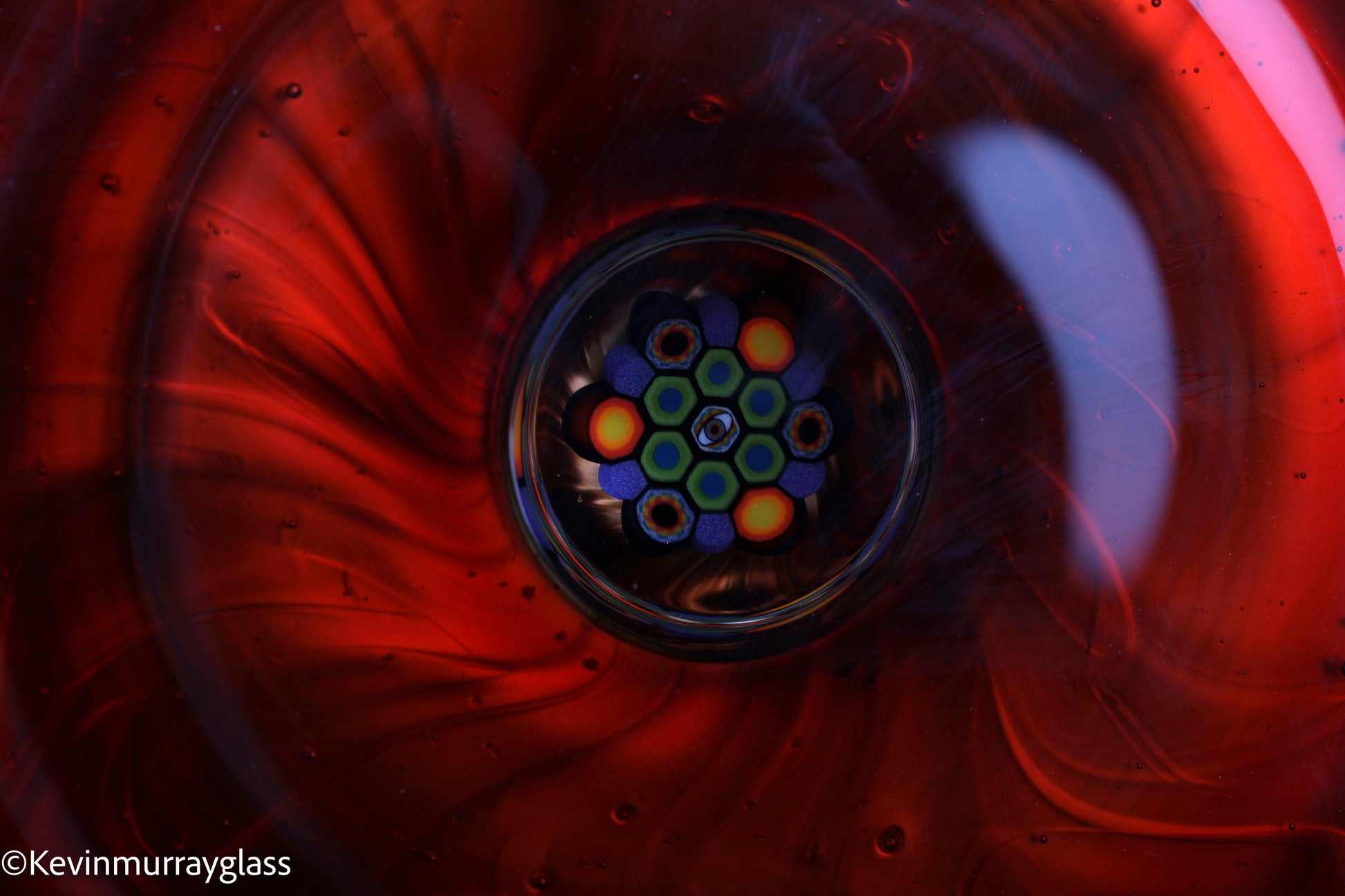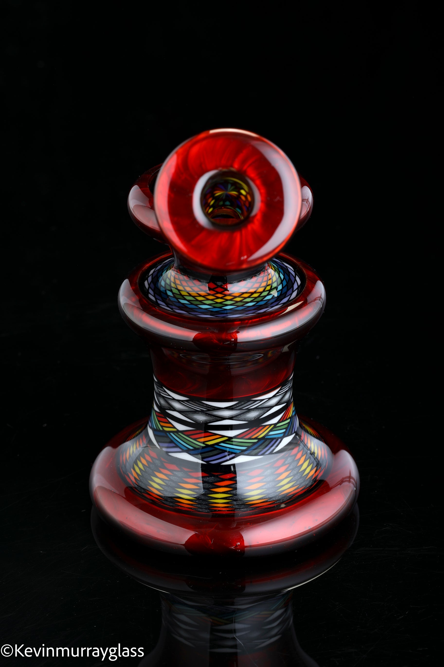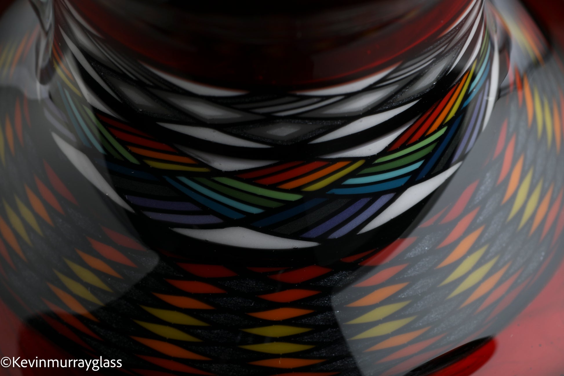 Kickback style rig In "candy apple red" with 7 hand drawn fillacello sections. 10mm hand ground 90 degree joint with a 4 hole perk. Signed with the signature/year murrine. Includes pelican 1150 hard case.