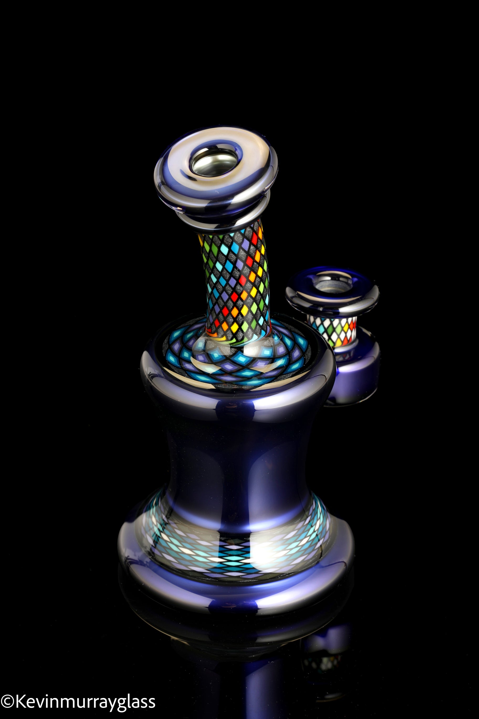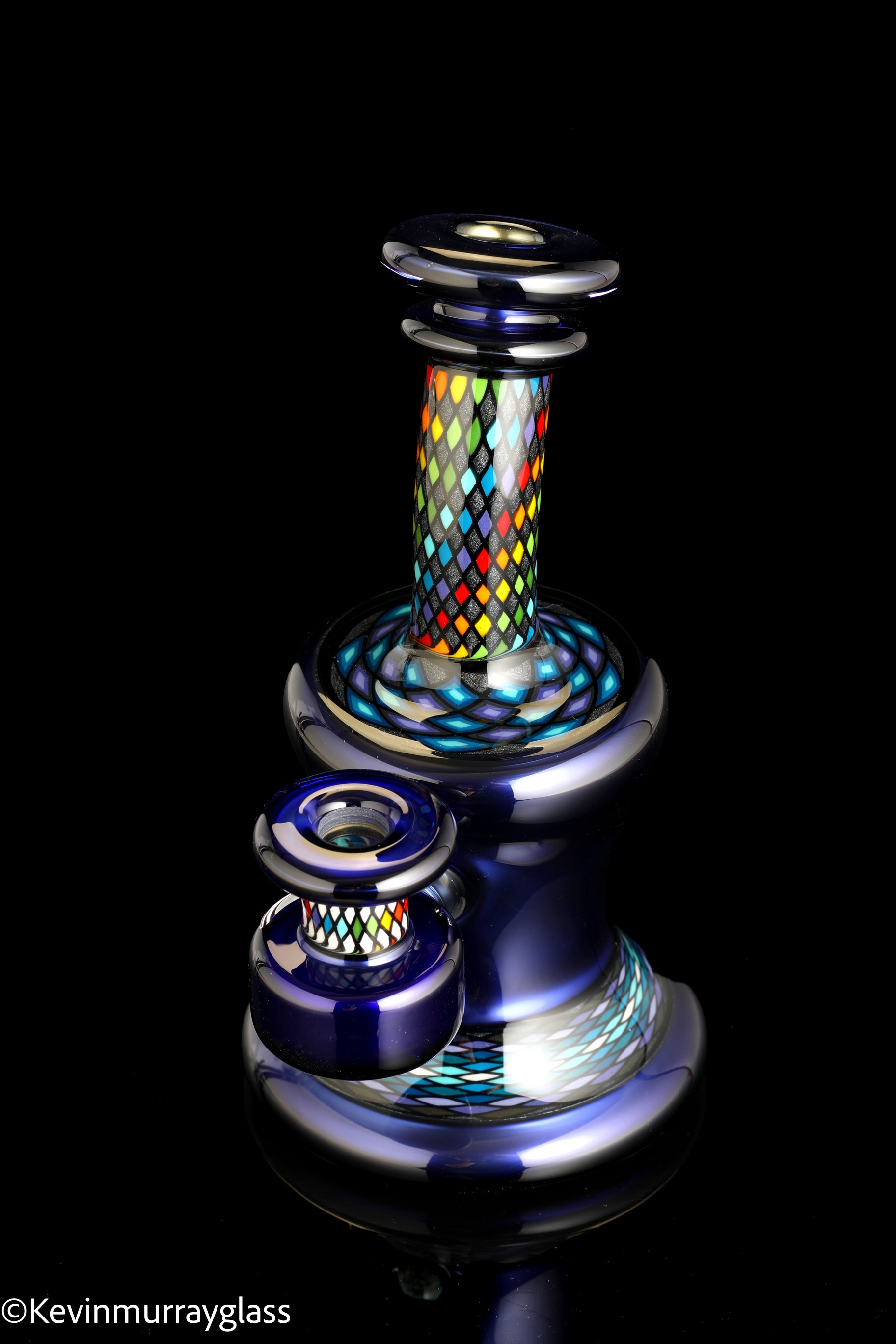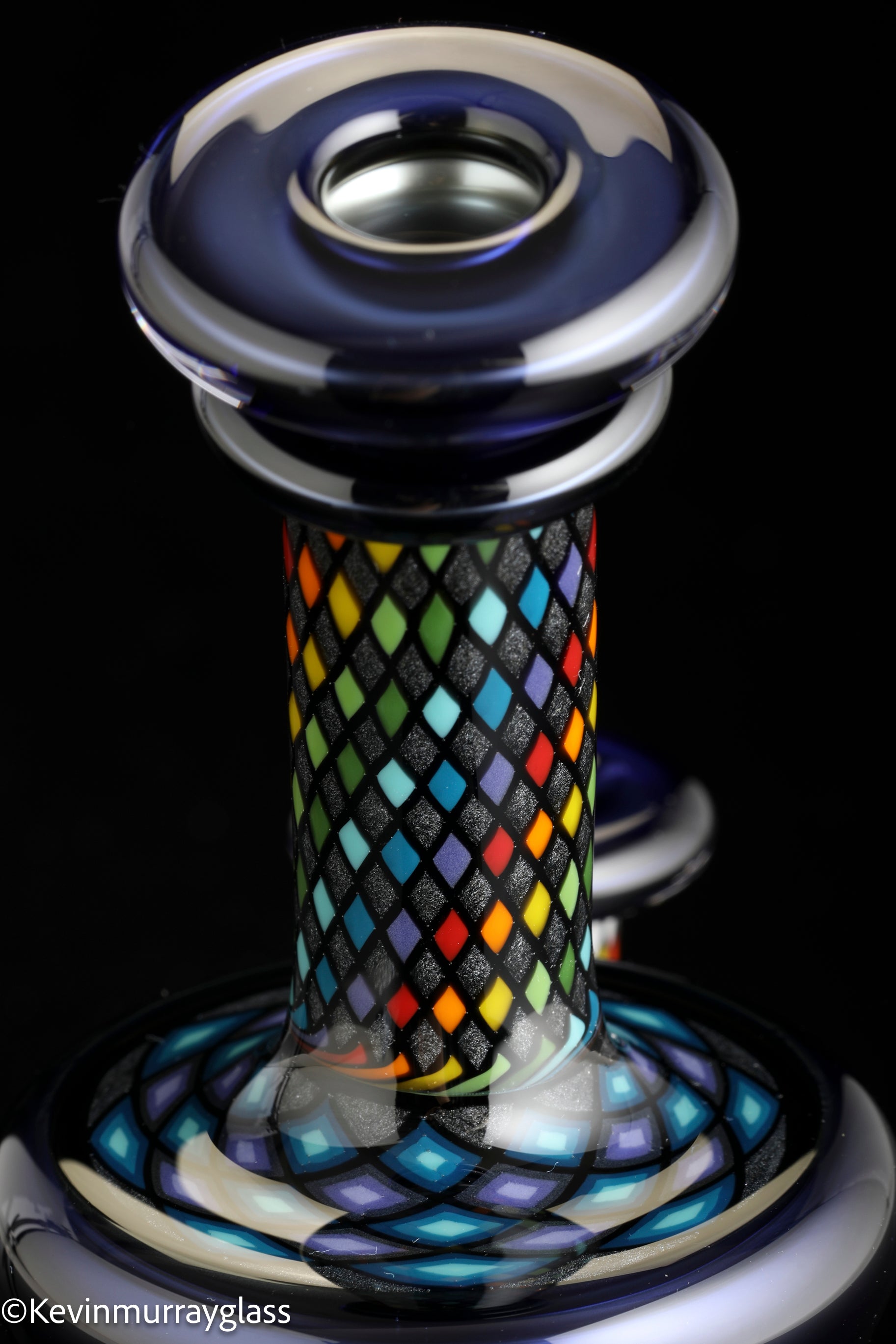 Classic style 10mm bent neck rig with "candy cobalt blue" and four hand drawn fillacello sections. Four hole perk and 90 degree 14mm hand ground joint. Signed with the signature/year murrine. Inlcudes signed pelican 1120 hard case.