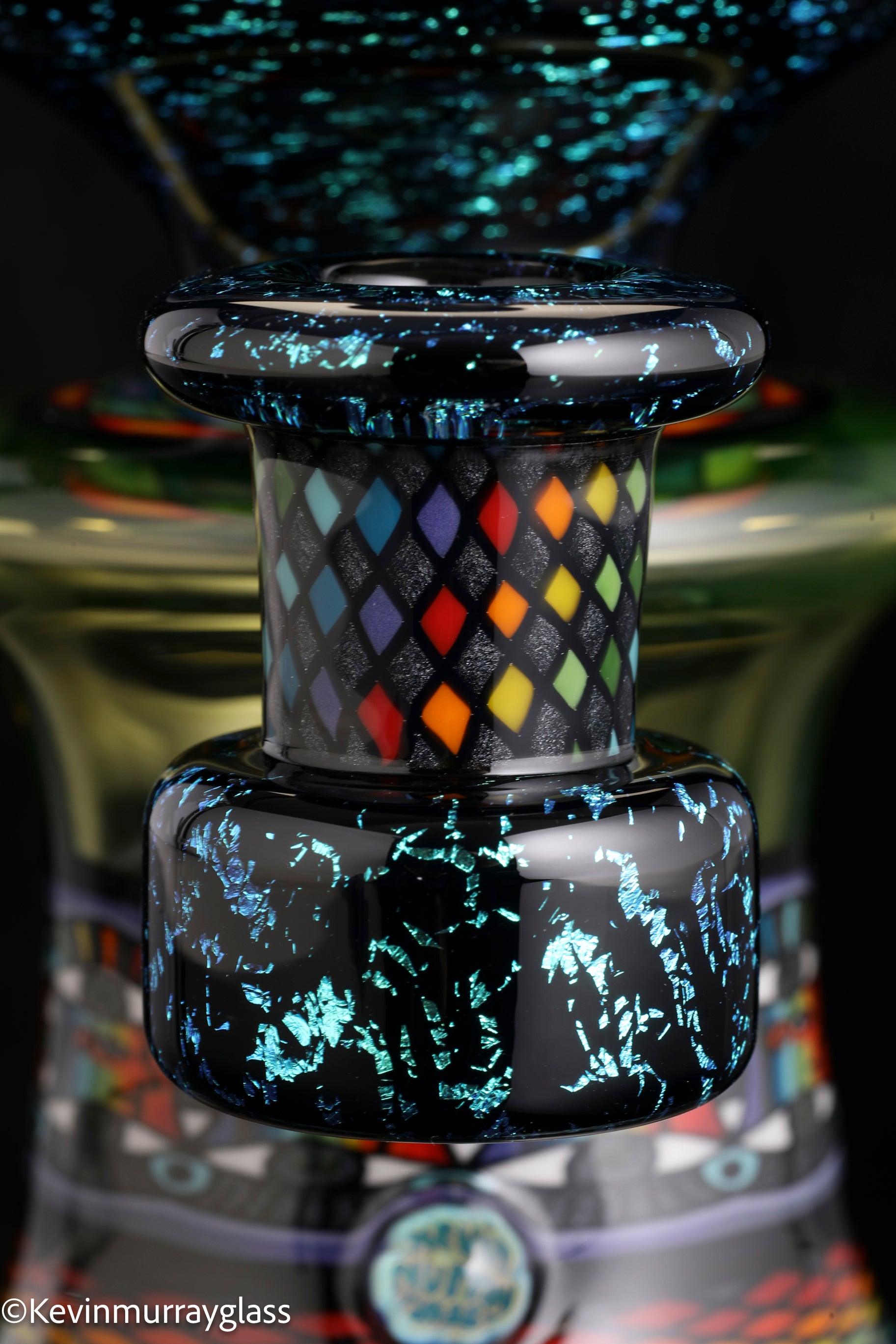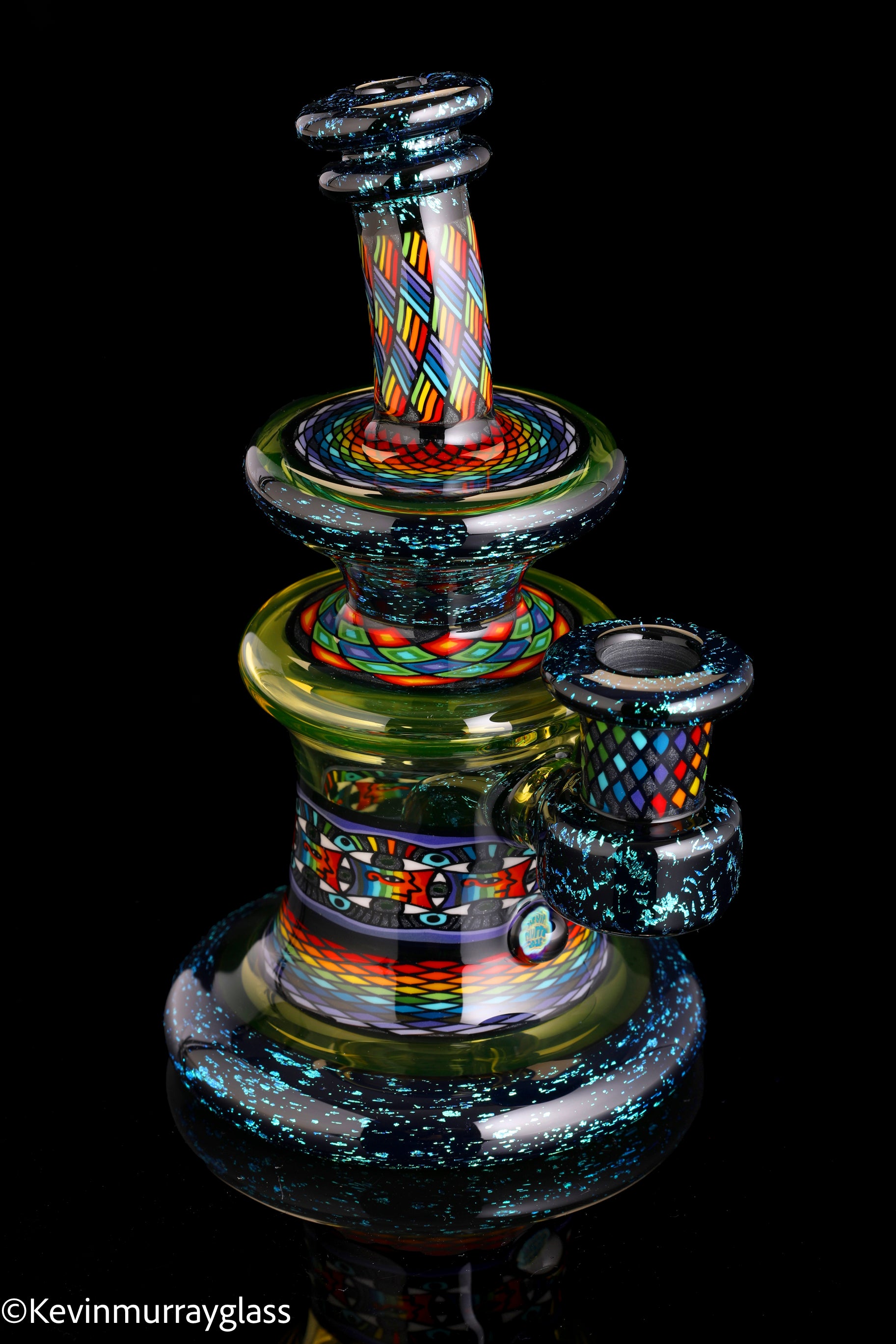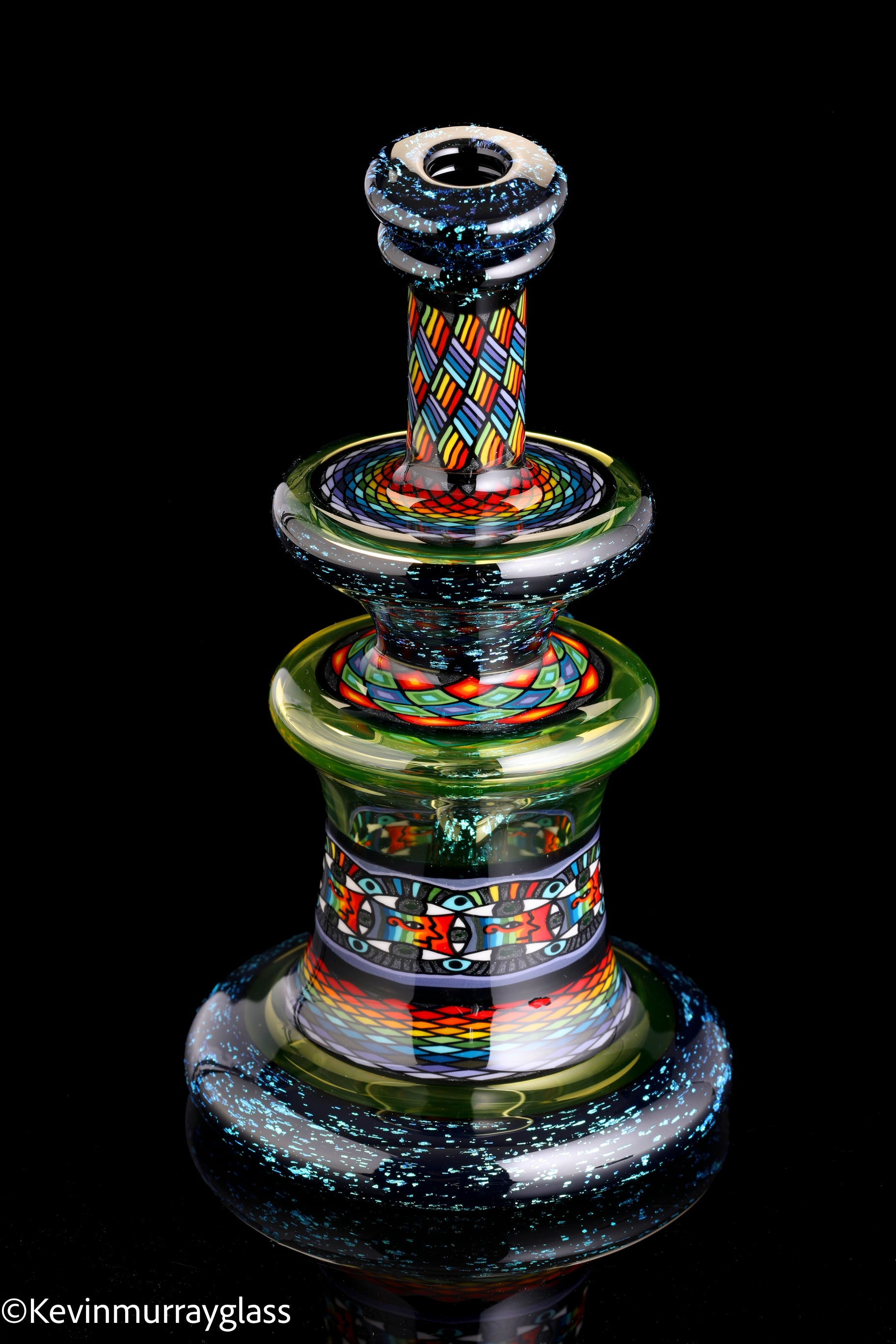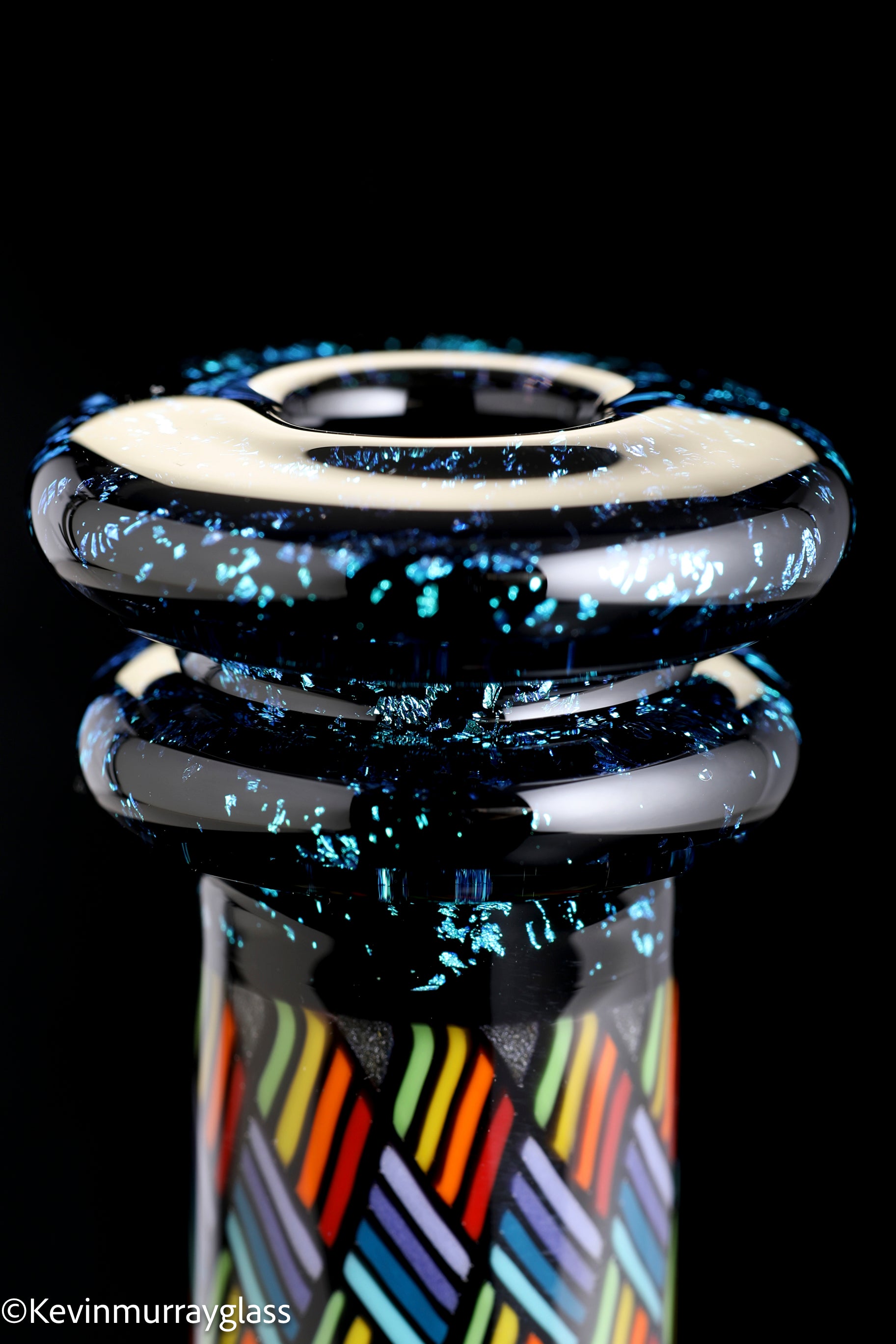 Classic style 14mm bent neck rig with lots of UV reactive citrine, dichro over jet black, and five hand drawn fillacello sections. Four hole perk and 90 degree 14mm hand ground joint. Signed with the signature/year murrine. Inlcudes signed pelican 1300 hard case.