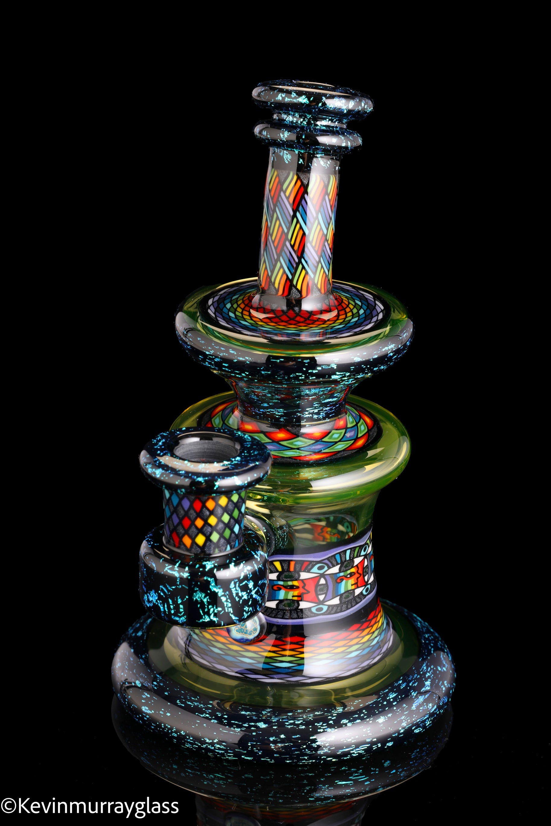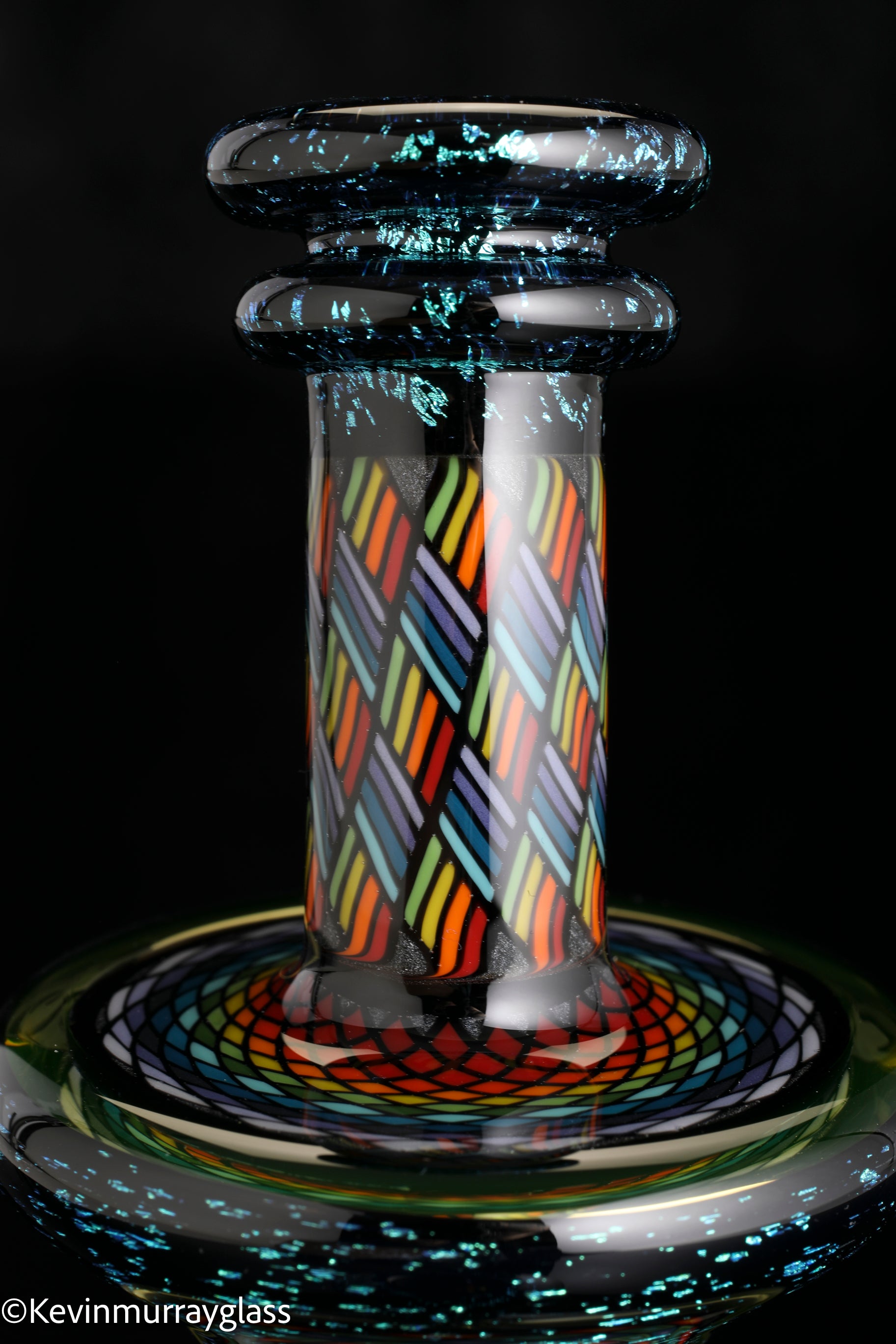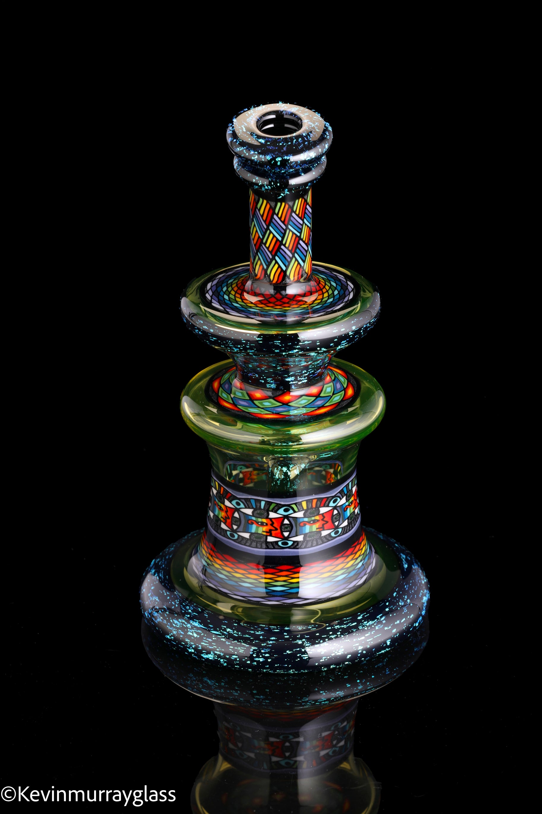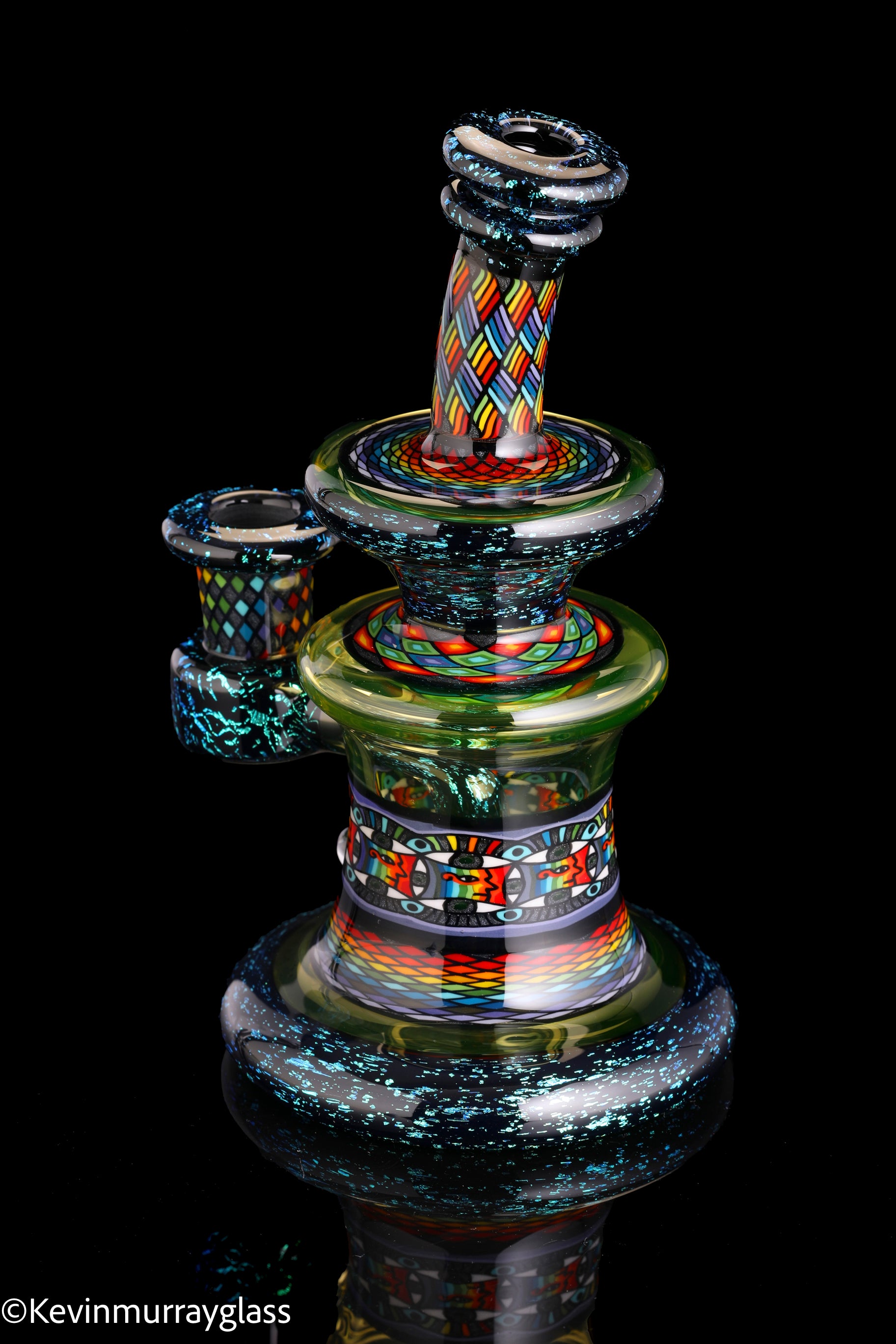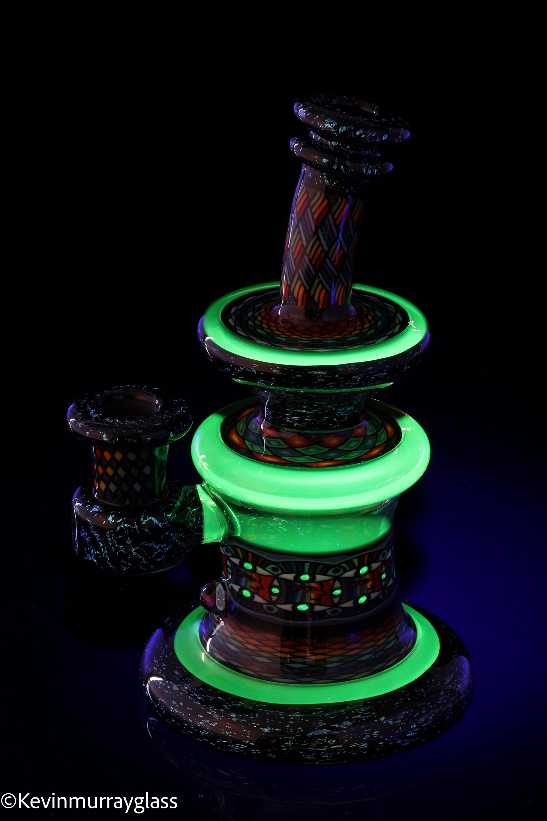 Classic style 14mm bent neck rig with lots of UV reactive citrine, dichro over jet black, and five hand drawn fillacello sections. Four hole perk and 90 degree 14mm hand ground joint. Signed with the signature/year murrine. Inlcudes signed pelican 1300 hard case.