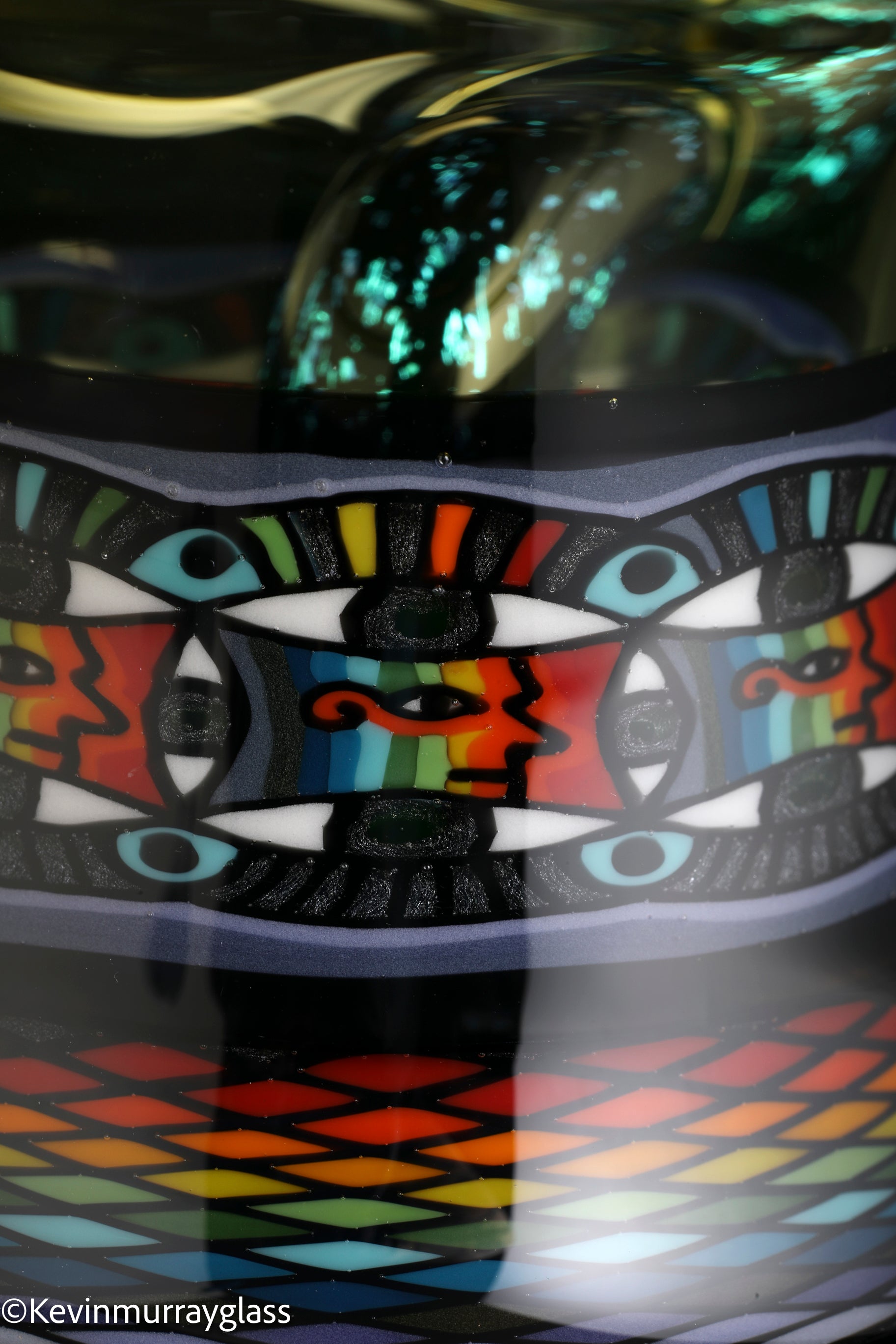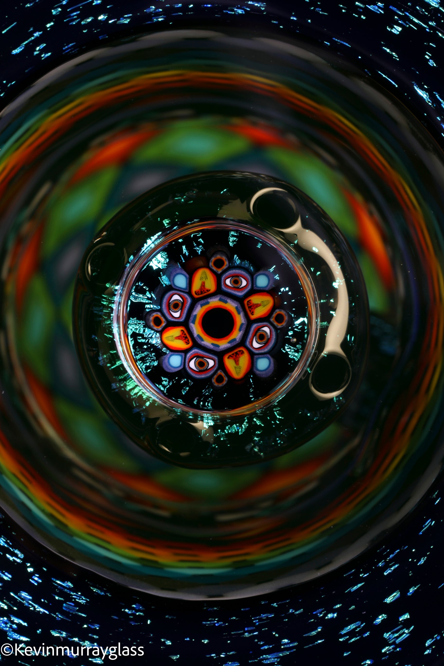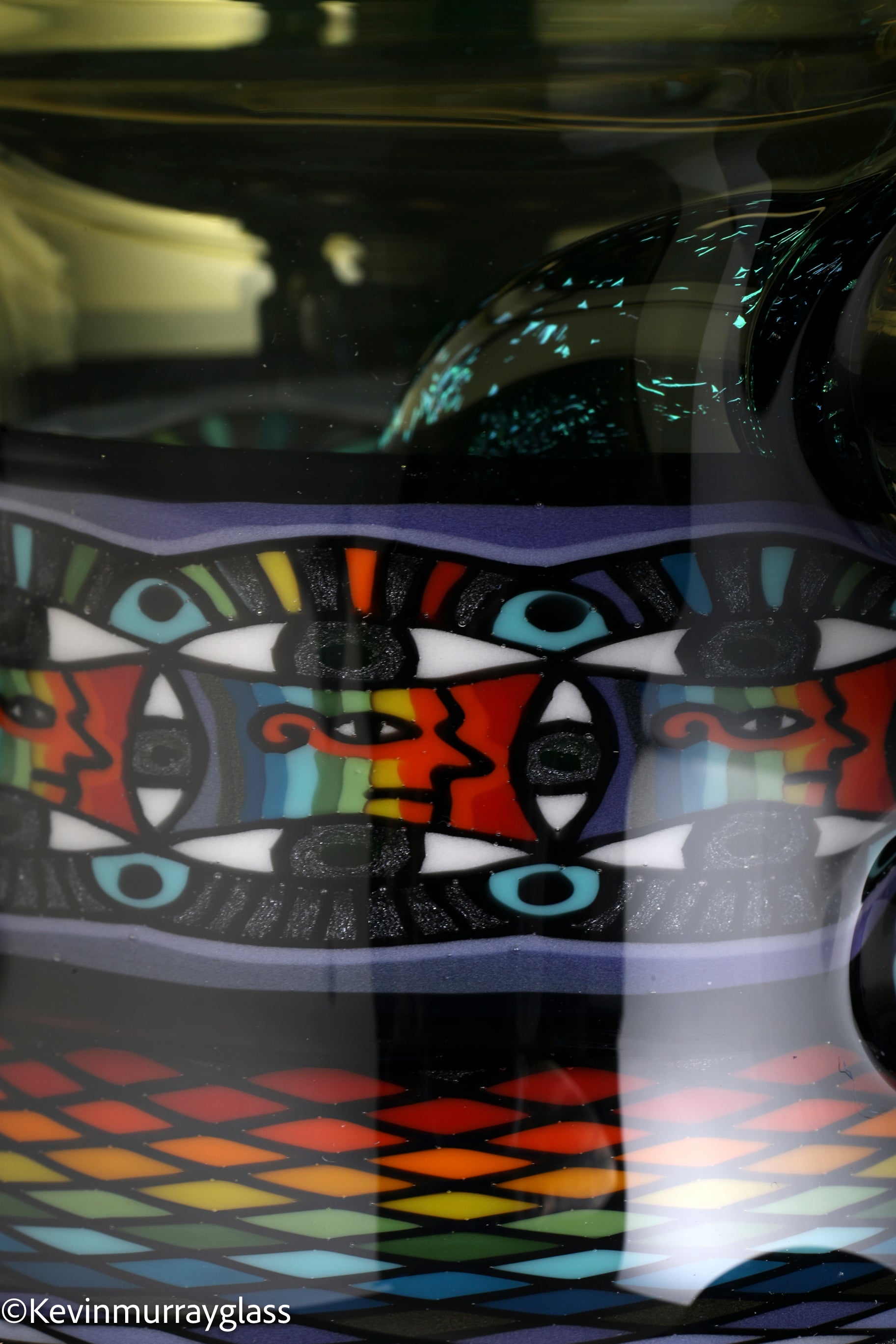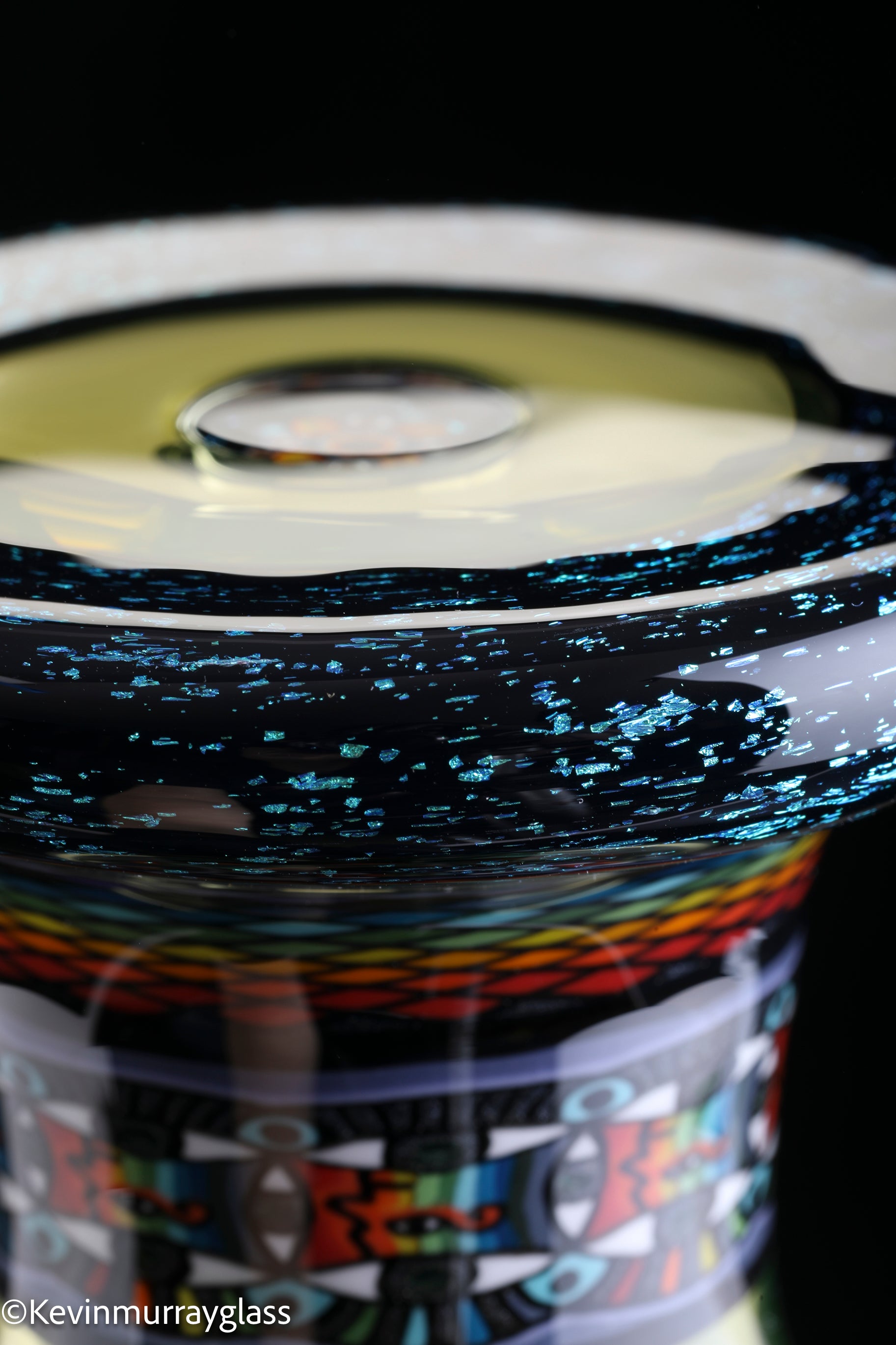 Classic style 14mm bent neck rig with lots of UV reactive citrine, dichro over jet black, and five hand drawn fillacello sections. Four hole perk and 90 degree 14mm hand ground joint. Signed with the signature/year murrine. Inlcudes signed pelican 1300 hard case.