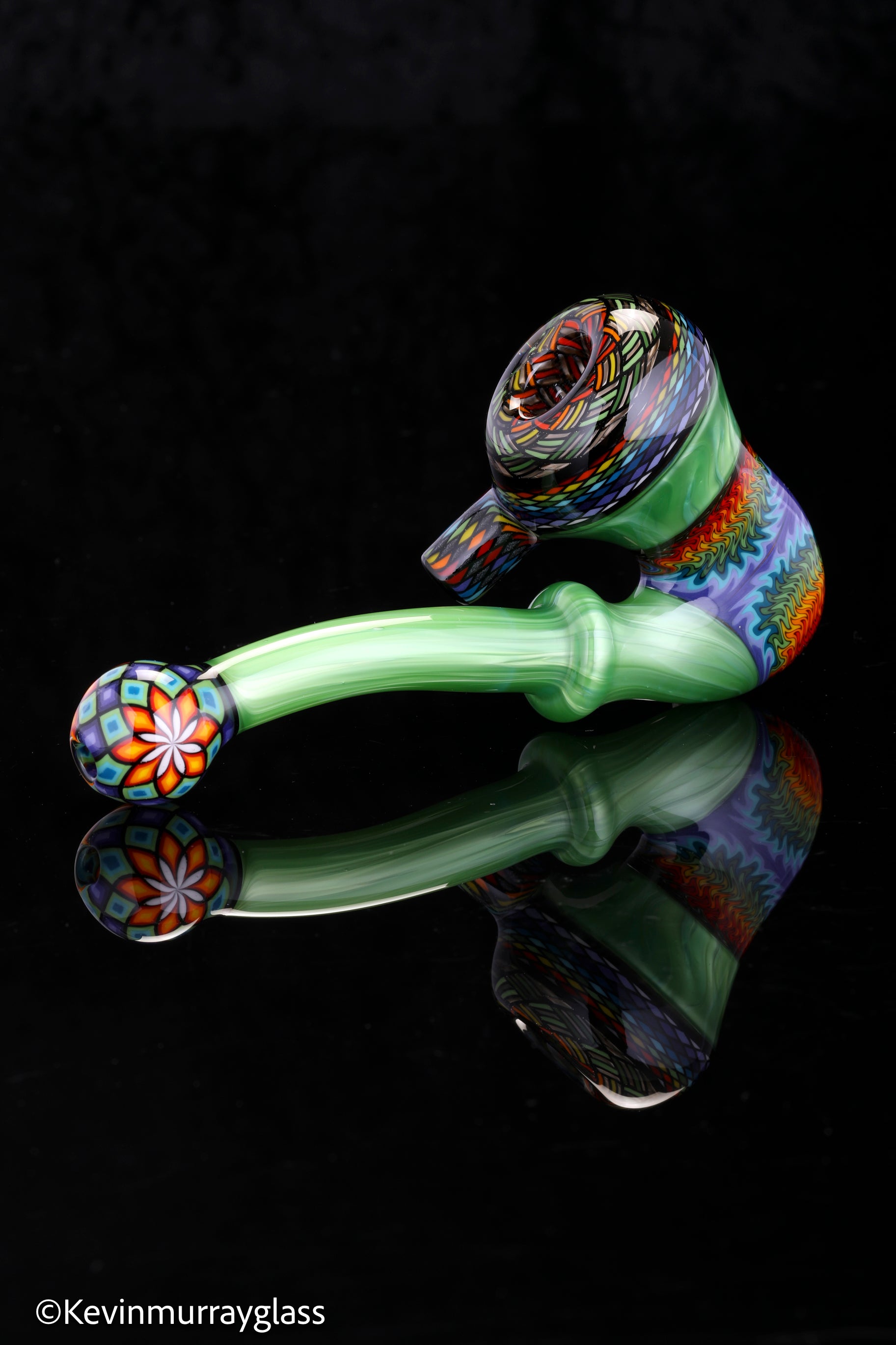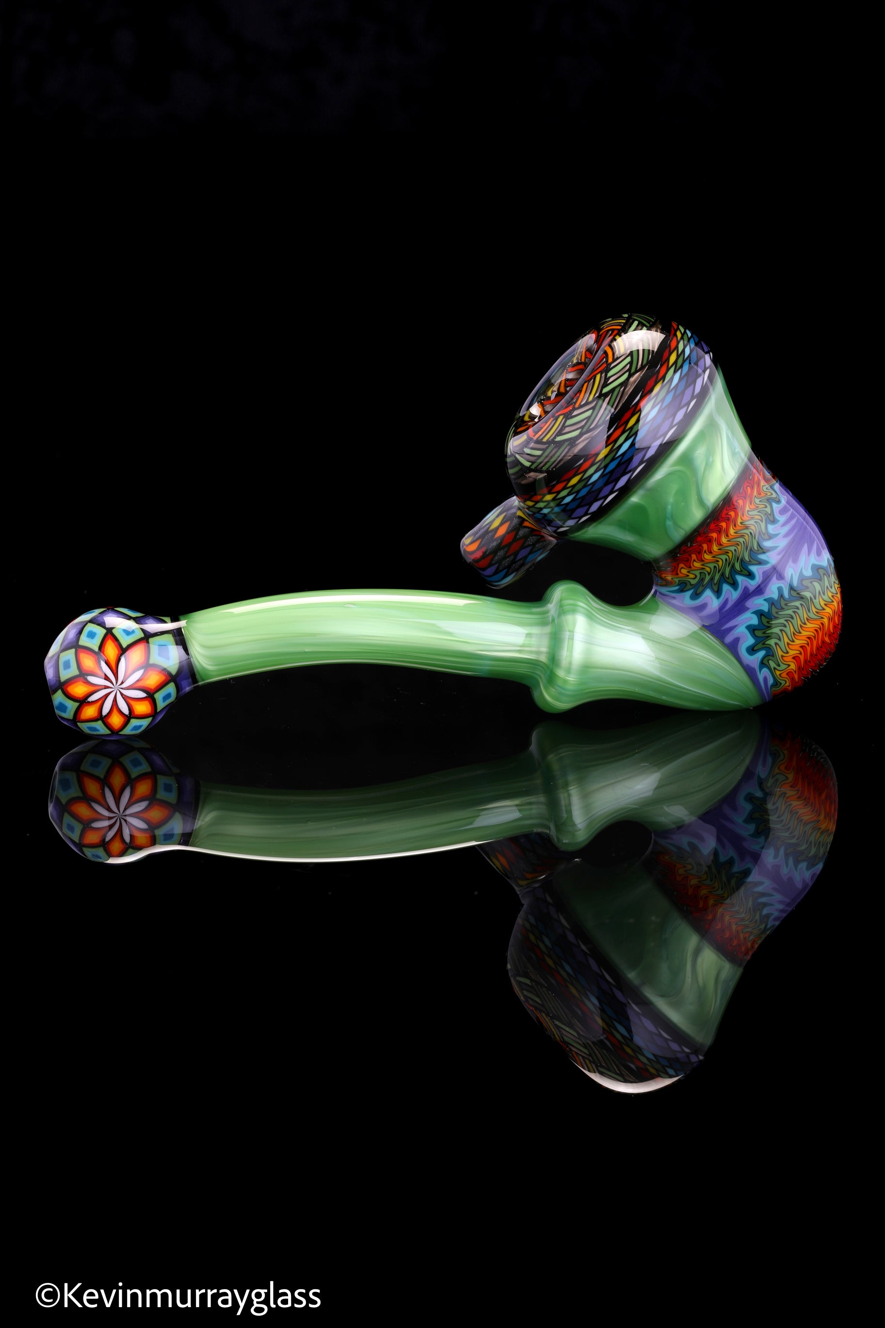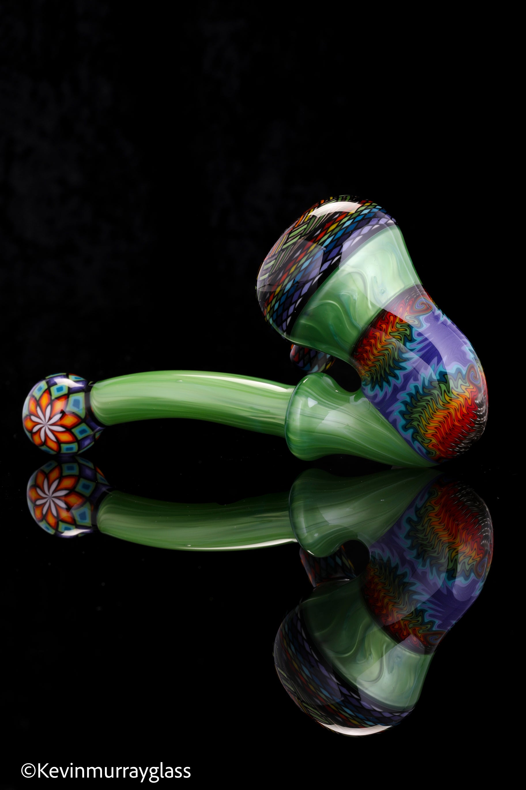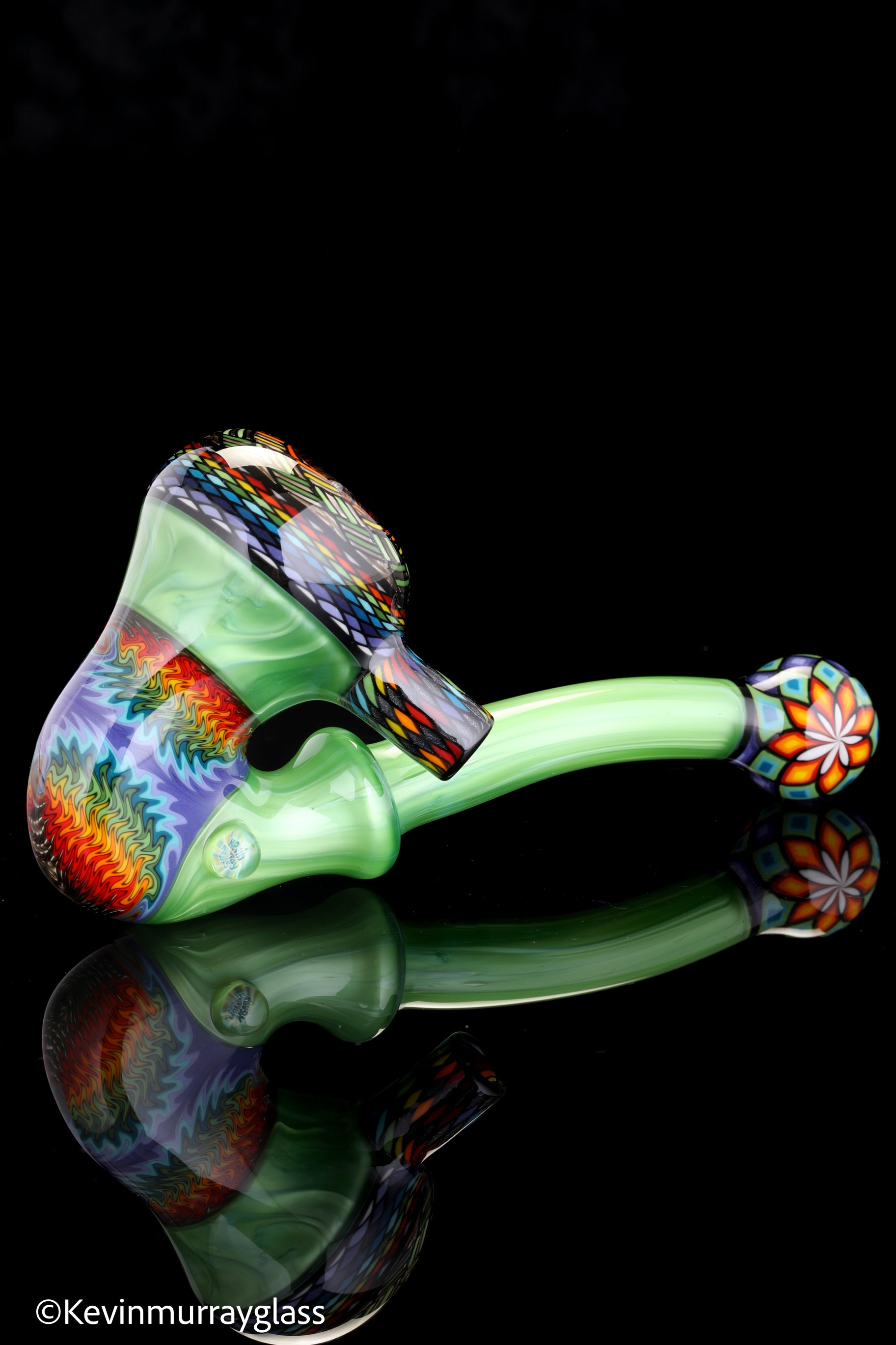 Classic style sherlock in plantphibion over chromium greens with hand drawn fillacellos and UV reactive wig wags. Siged with the signature/year murrine.