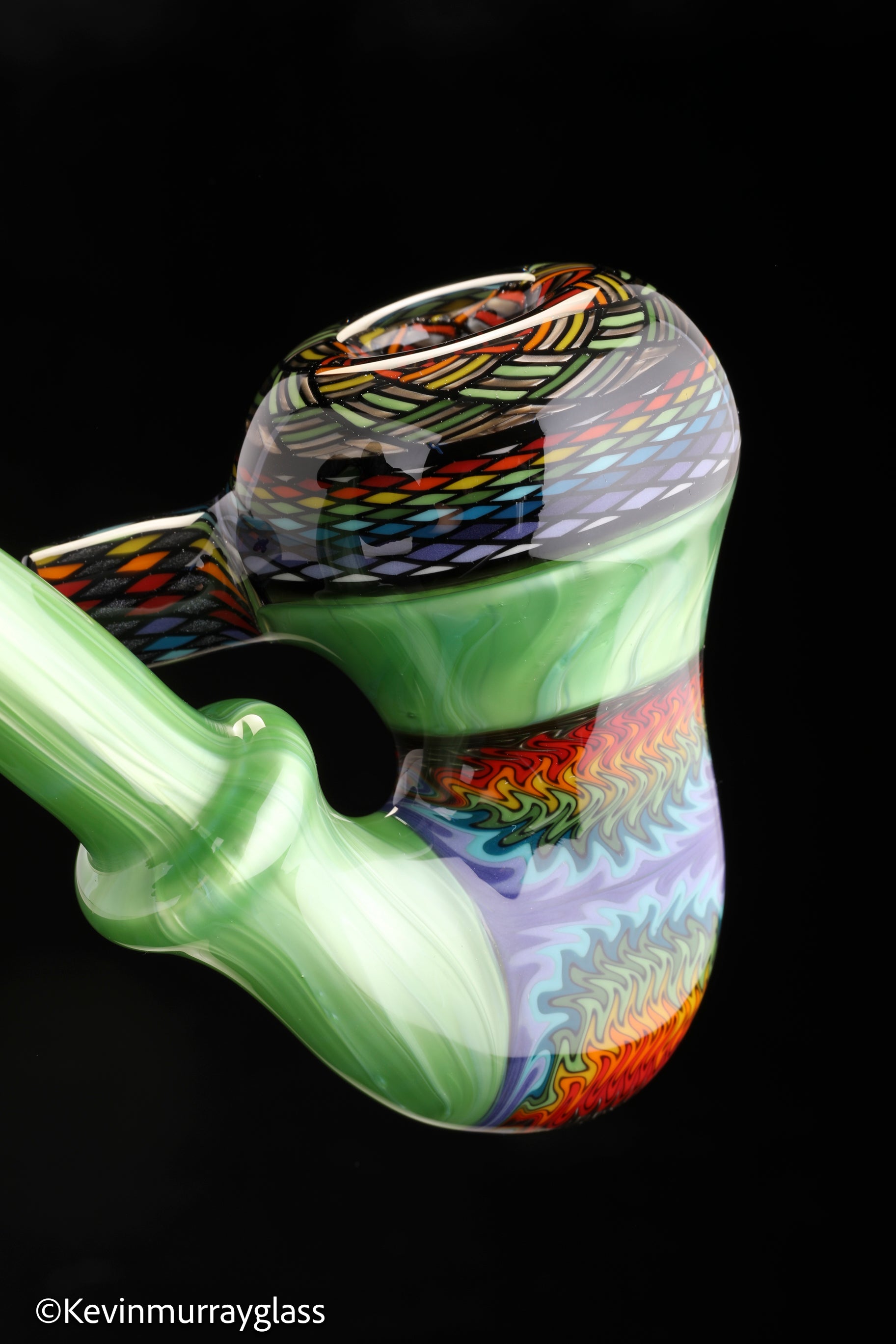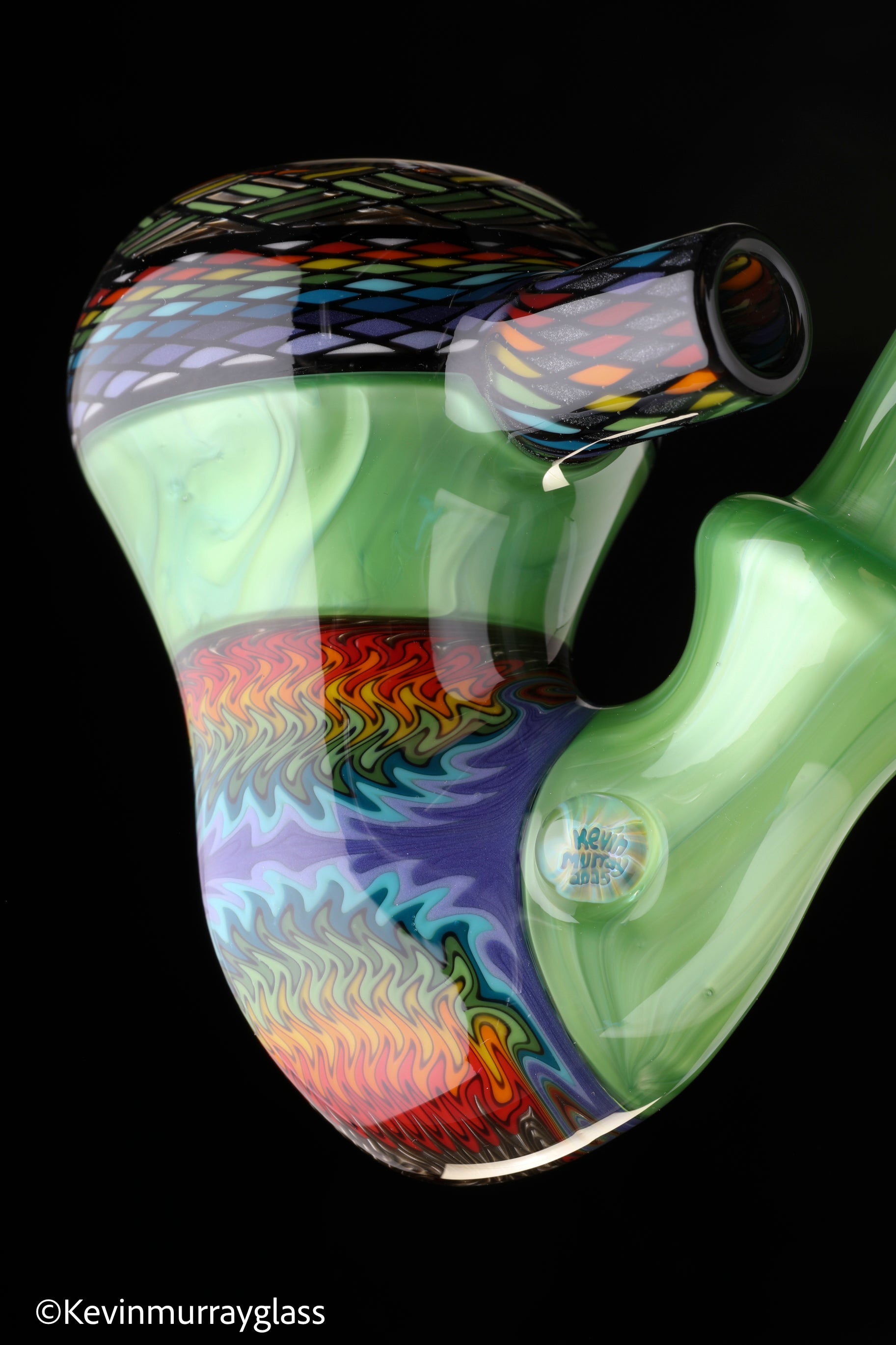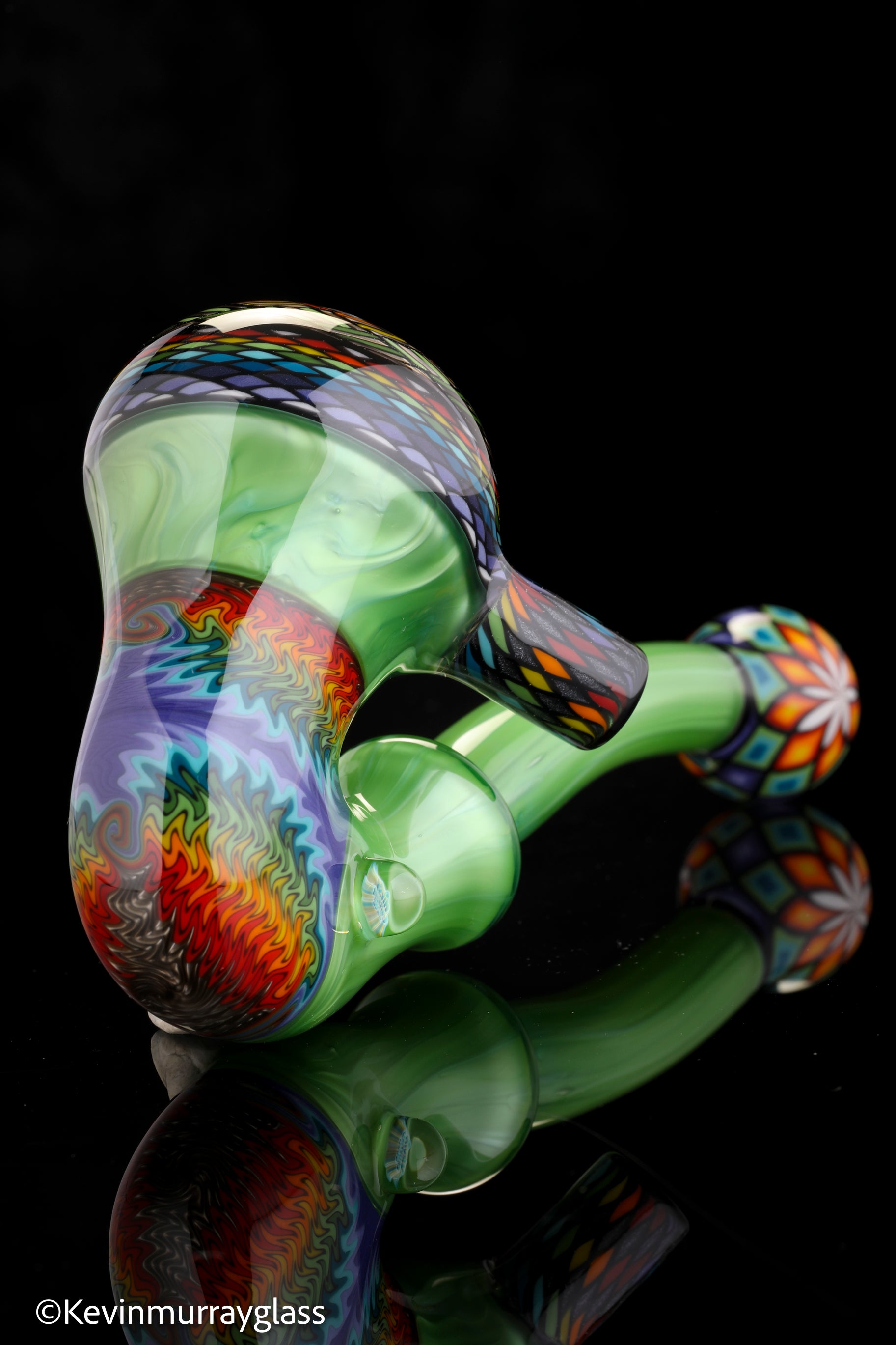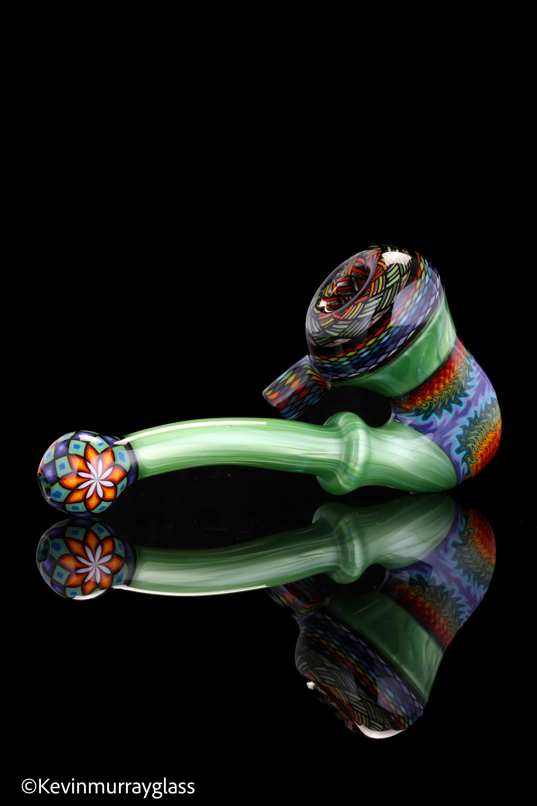 Classic style sherlock in plantphibion over chromium greens with hand drawn fillacellos and UV reactive wig wags. Siged with the signature/year murrine.